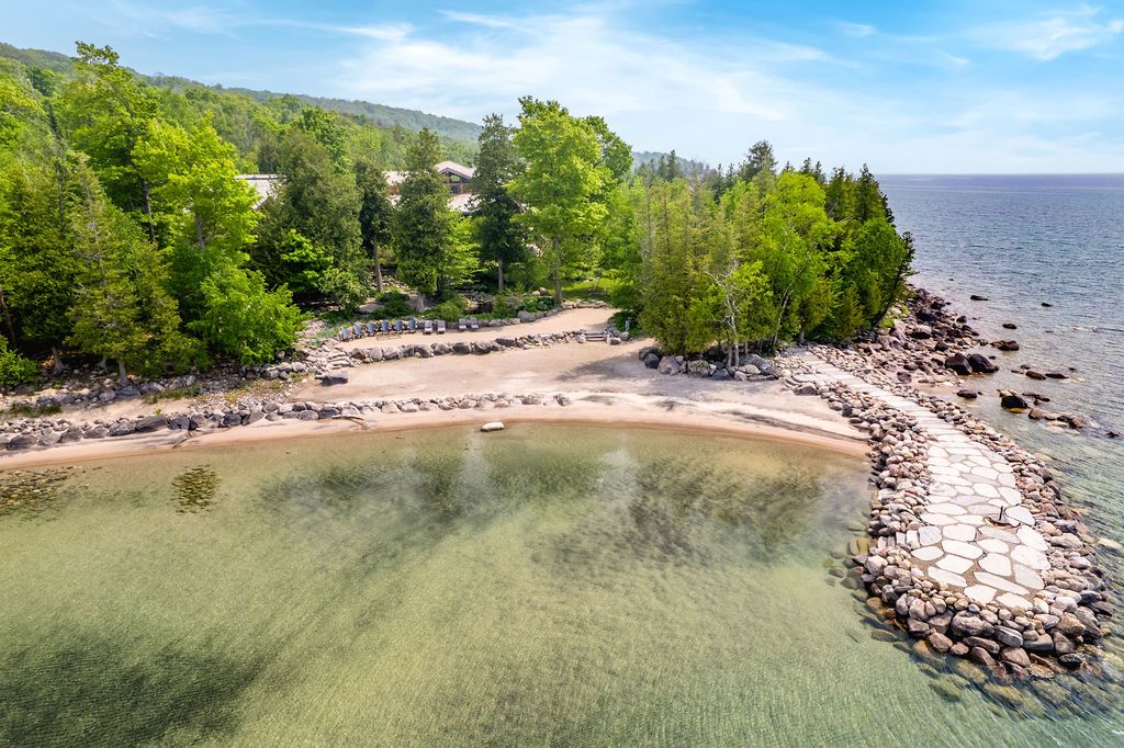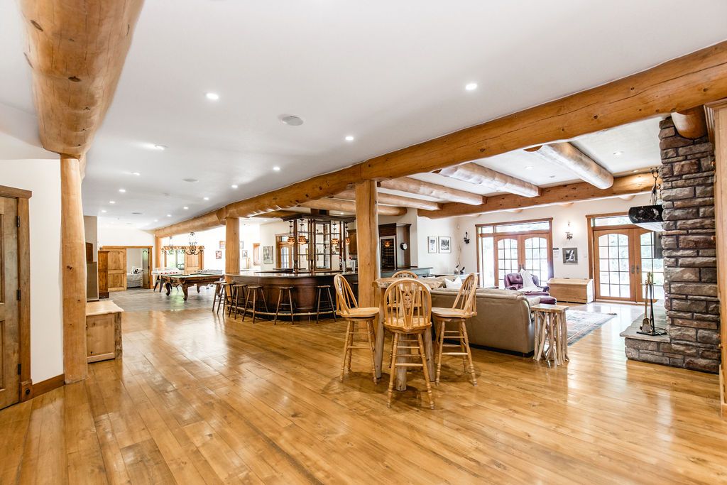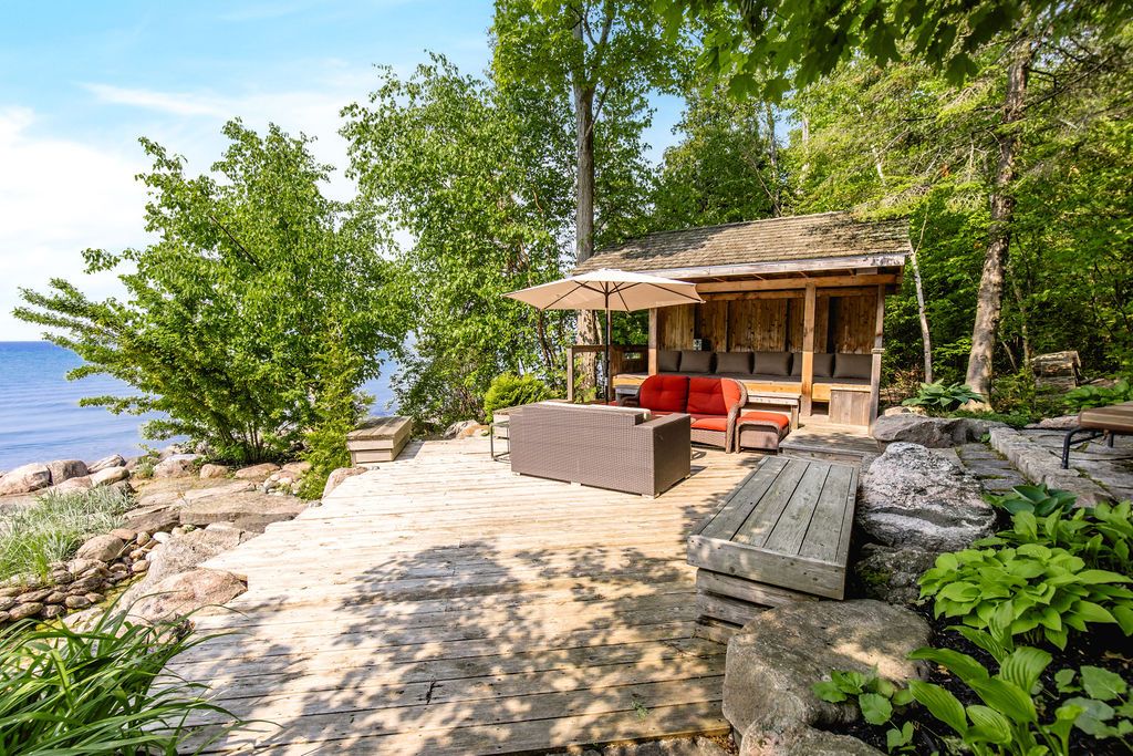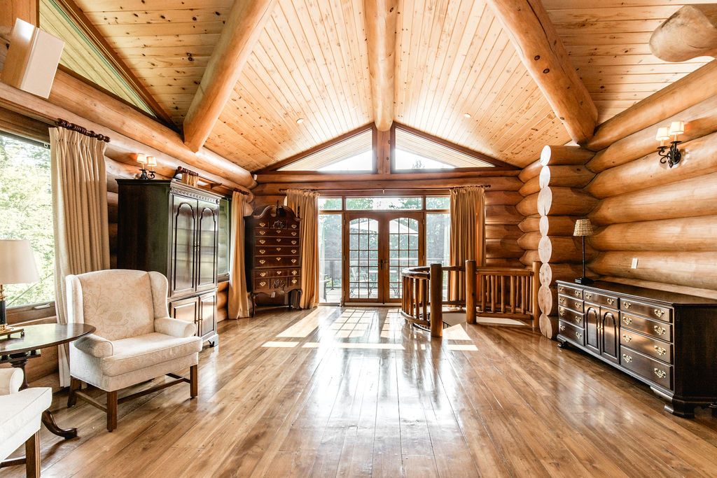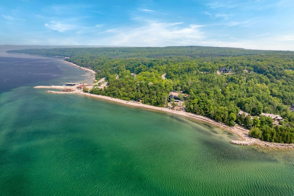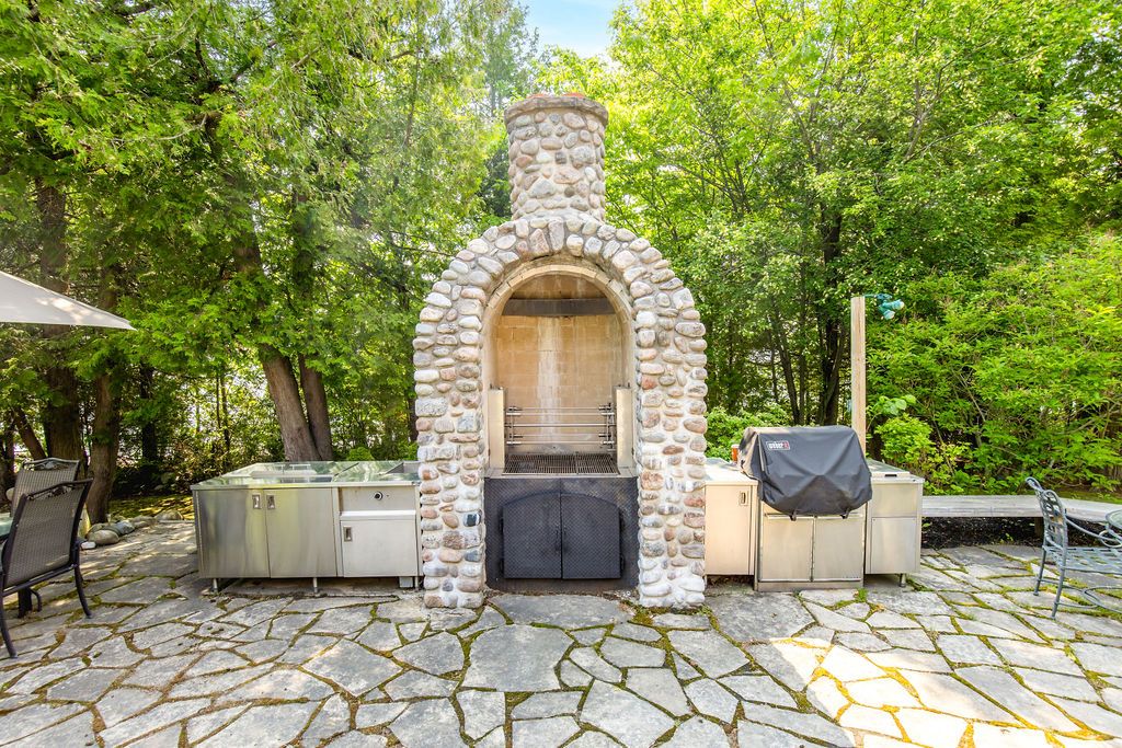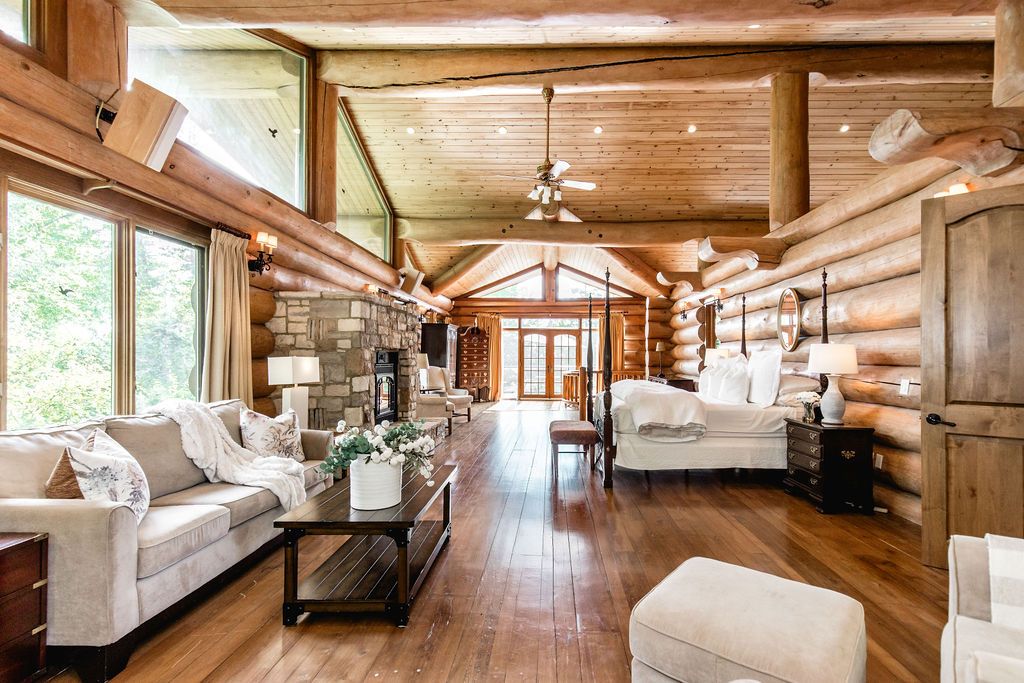 Welcome to one of Canada's most iconic luxury log homes, a rare Georgian Bay waterfront estate often described as the "Yellowstone of the North." Located at the very tip of Cedar Point on Georgian Bay, this one-of-a-kind waterfront mansion offers exceptional privacy, panoramic bay views & an irreplaceable point-of-land setting.Built in 2002 as a private resort-style retreat, this custom log estate sits on 4.37 acres with 412+ ft of shoreline, featuring both sandy & pebble beaches, a 90ft stone pier & an 80ft seasonal dock - ideal for boating, swimming & luxury waterfront living. With approximately 14,000 sq ft of living space, the home showcases master craftsmanship, soaring vaulted ceilings, exposed timber construction & uninterrupted water views from nearly every room.The main residence offers 8 bedrooms & 8 bathrooms, plus separate guest or staff quarters w/ 2 additional bedrooms & 2 bathrooms, making it ideal for multi-generational living, executive retreats or luxury hosting. A striking 20-ft grand foyer w/ hand-carved log doors & a rare carved centerpiece sets the tone for this architectural masterpiece.Designed for entertaining, the home features formal & casual living areas, a chef's kitchen with premium Dacor, Thermador & Sub-Zero appliances, butler's pantry, stone fireplaces, wet bar, private office & a spectacular main-floor primary suite with vaulted ceilings, spa-style ensuite & private waterfront deck. The walk-out lower level includes a newly constructed accessible bedroom w/ ensuite, games room, gym, home theatre & an unforgettable 20-seat English-style pub.Outdoors, enjoy landscaped grounds, gentle streams, cabana, private beach & an 8-person in-ground hot tub. Additional features include in-floor radiant heating, heated 4-car garage, cedar shingle roof, irrigation system, cobblestone driveway, Starlink high-speed internet & reliable cell service. A true Georgian Bay luxury estate, offering rare frontage, resort-level amenities & legacy-level value.