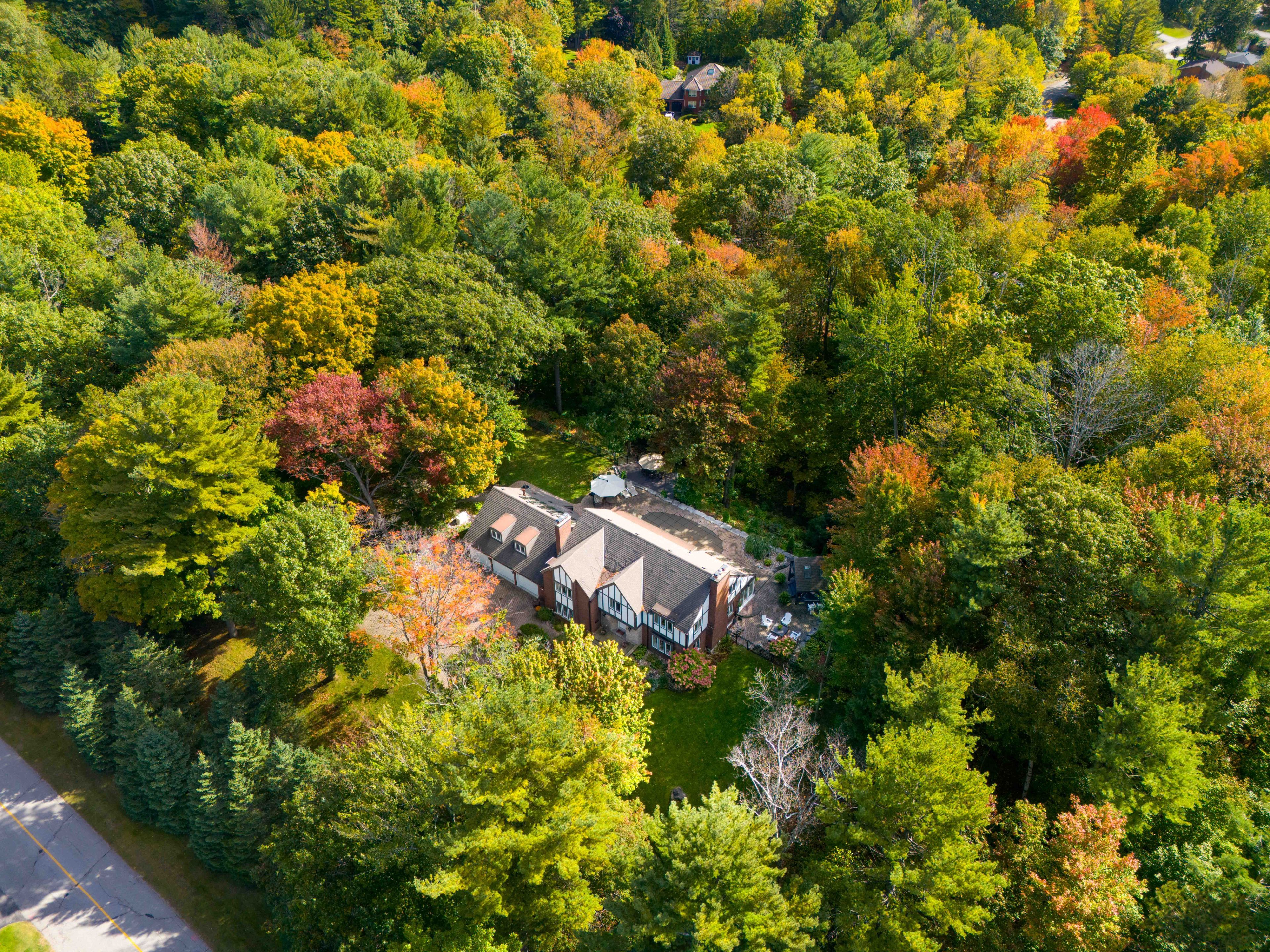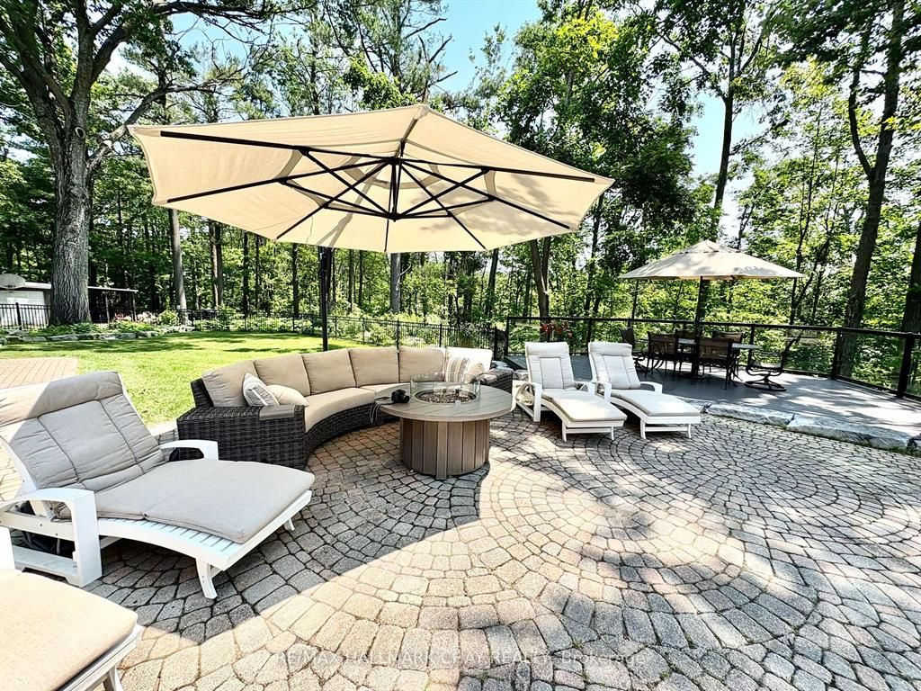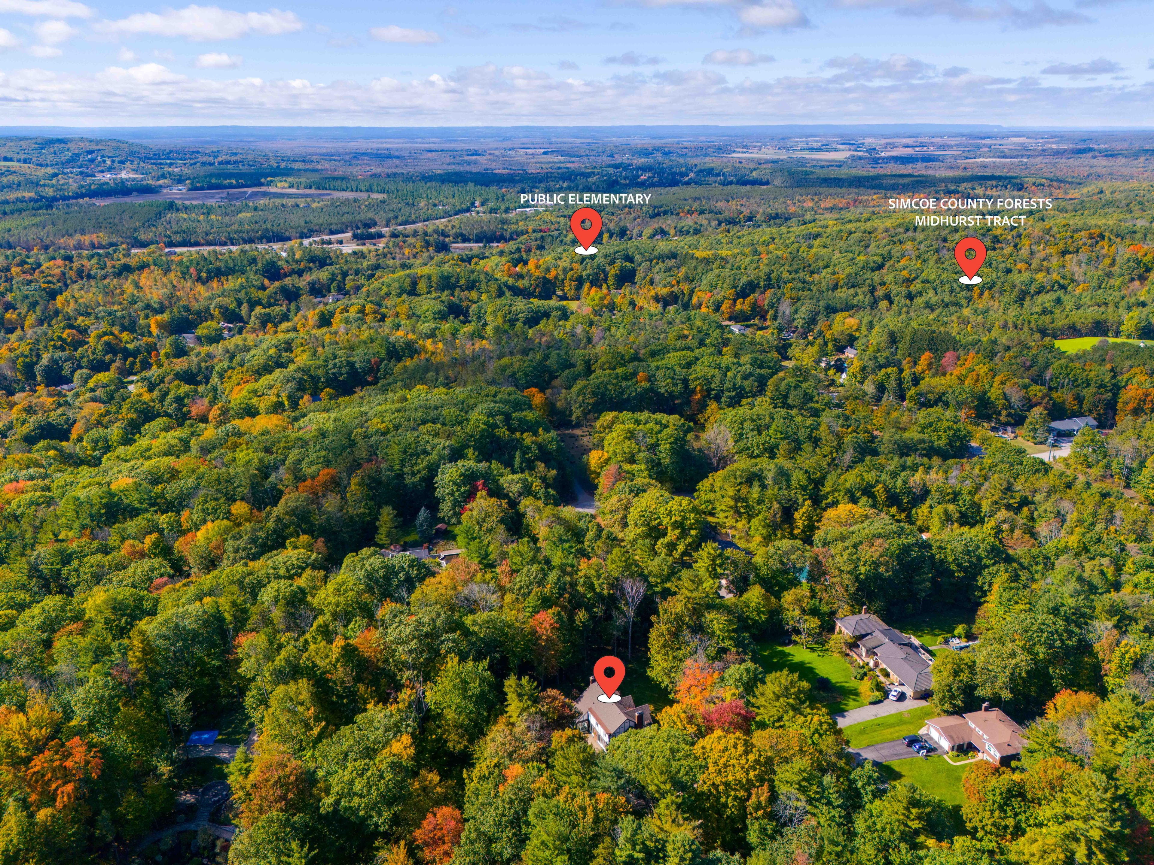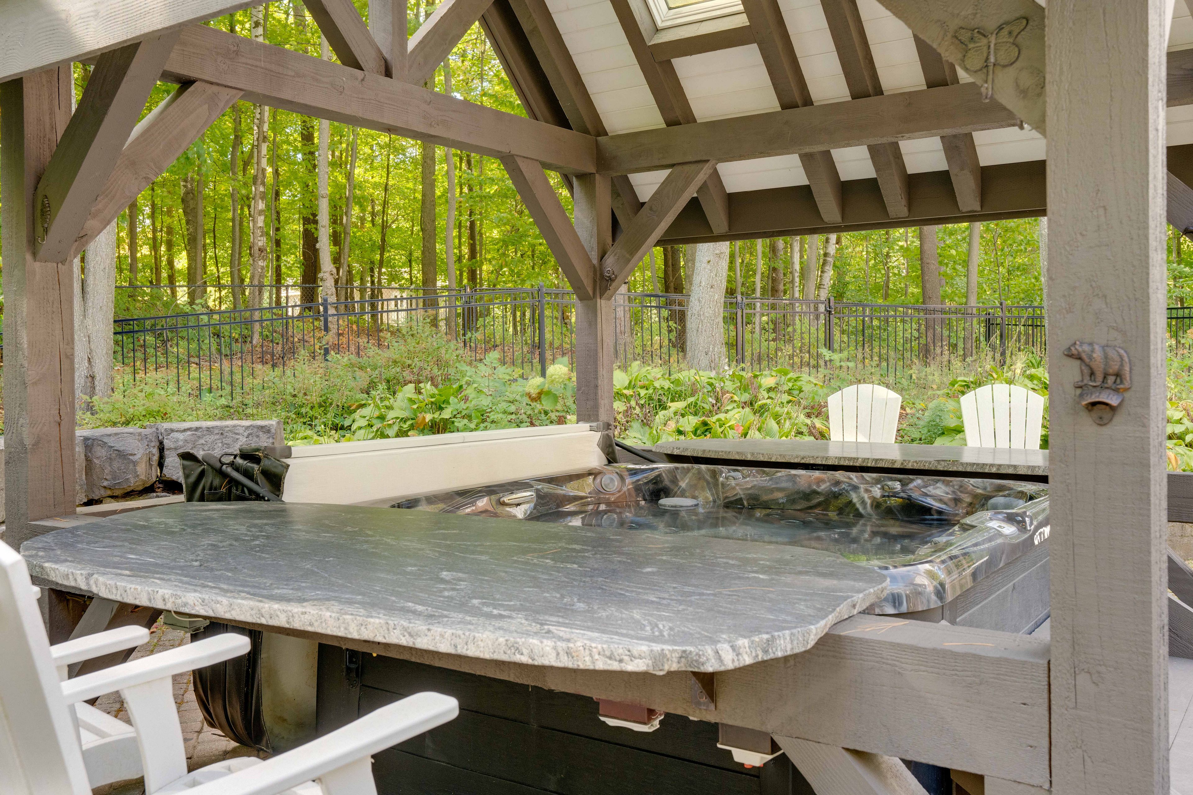 Discover timeless elegance in this stunning English Tudor estate, perched on a private 2.2 acre lot in prestigious Midhurst. Thoughtfully positioned atop a hill, this 5-bedroom, 5-bathroom residence offers over 5,000 sq ft of luxurious living space with sweeping views from every window and unmatched privacy at every turn.Step into the heart of the home - a brand new chef's kitchen that seamlessly blends high design with premium function. Featuring top-of-the-line JennAir built-ins, a striking AGA Mercury range, Cambria quartz counters, and an oversized island perfect for hosting, all flowing into a sunlit dining area and a walkout to the poolside patio.Entertain in every season with a spacious living room, complete with gas fireplace and walkouts to a heated glass sunroom, or retreat to the gracious formal dining room with wood-burning fireplace. The welcoming foyer features heated floors, a 2-piece bath, and walk-in coat closet.Upstairs, the primary suite offers a peaceful escape with heated floors, two large closets, and a spa-style ensuite. A unique bedroom-loft combo with separate entrance, gas stove, and full bath makes for an ideal in-law suite or guest retreat.Outside is where the lifestyle truly shines: in-ground saltwater pool, hot tub under a gazebo, outdoor shower, firepit, and even a cantilevered deck overlooking the ravine. The heated 3-car garage is a dream workshop or man cave, while a separate detached heated outbuilding offers additional flexibility.Ask for the full list of upgrades and features - this home offers far more than meets the eye.