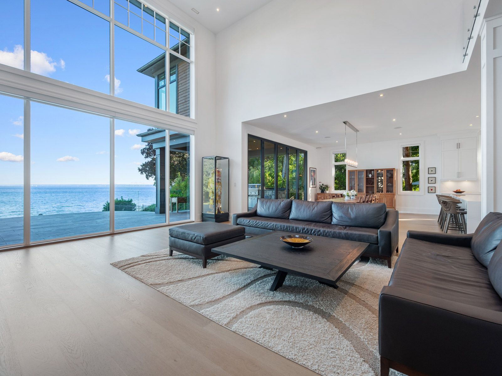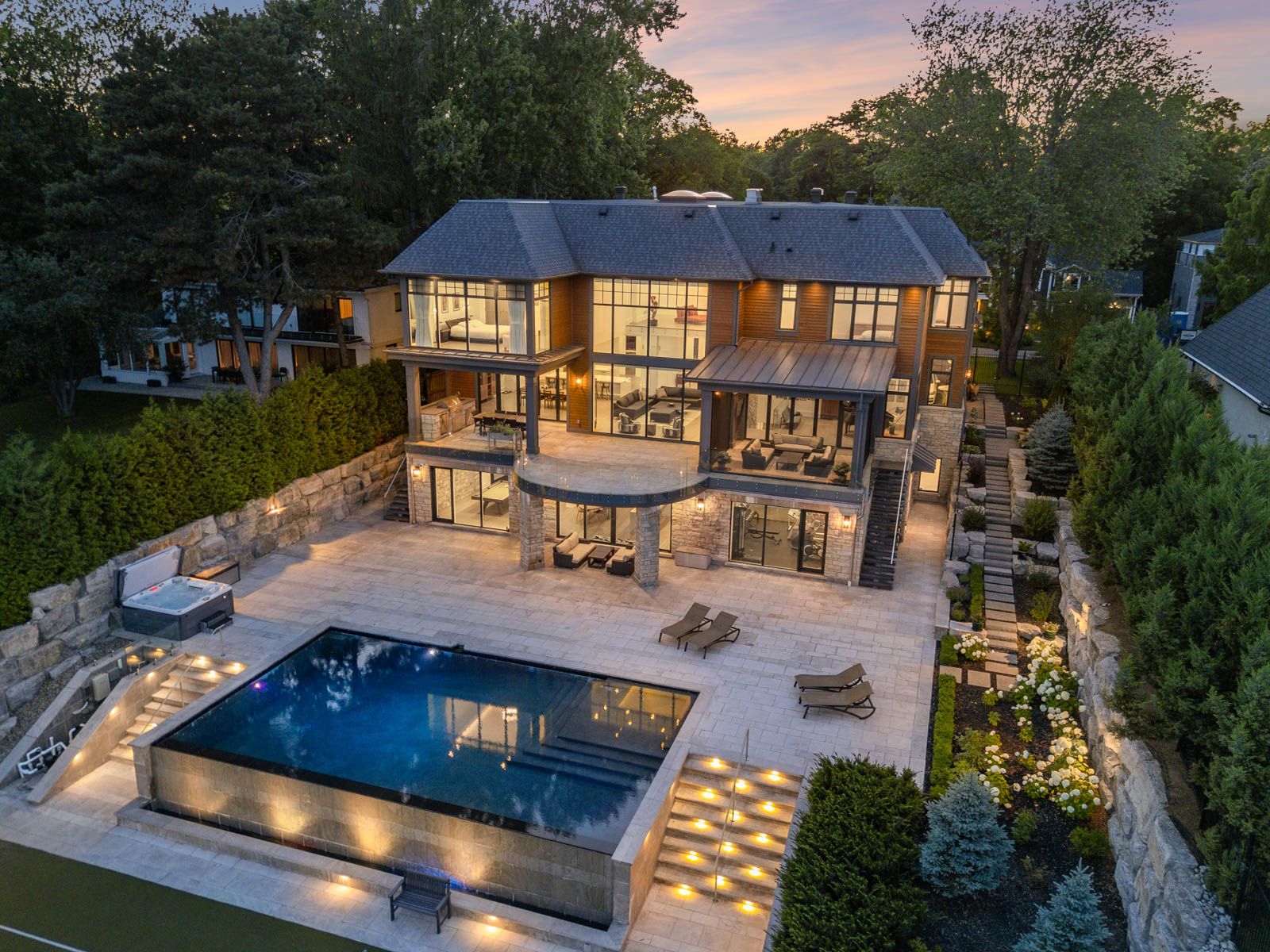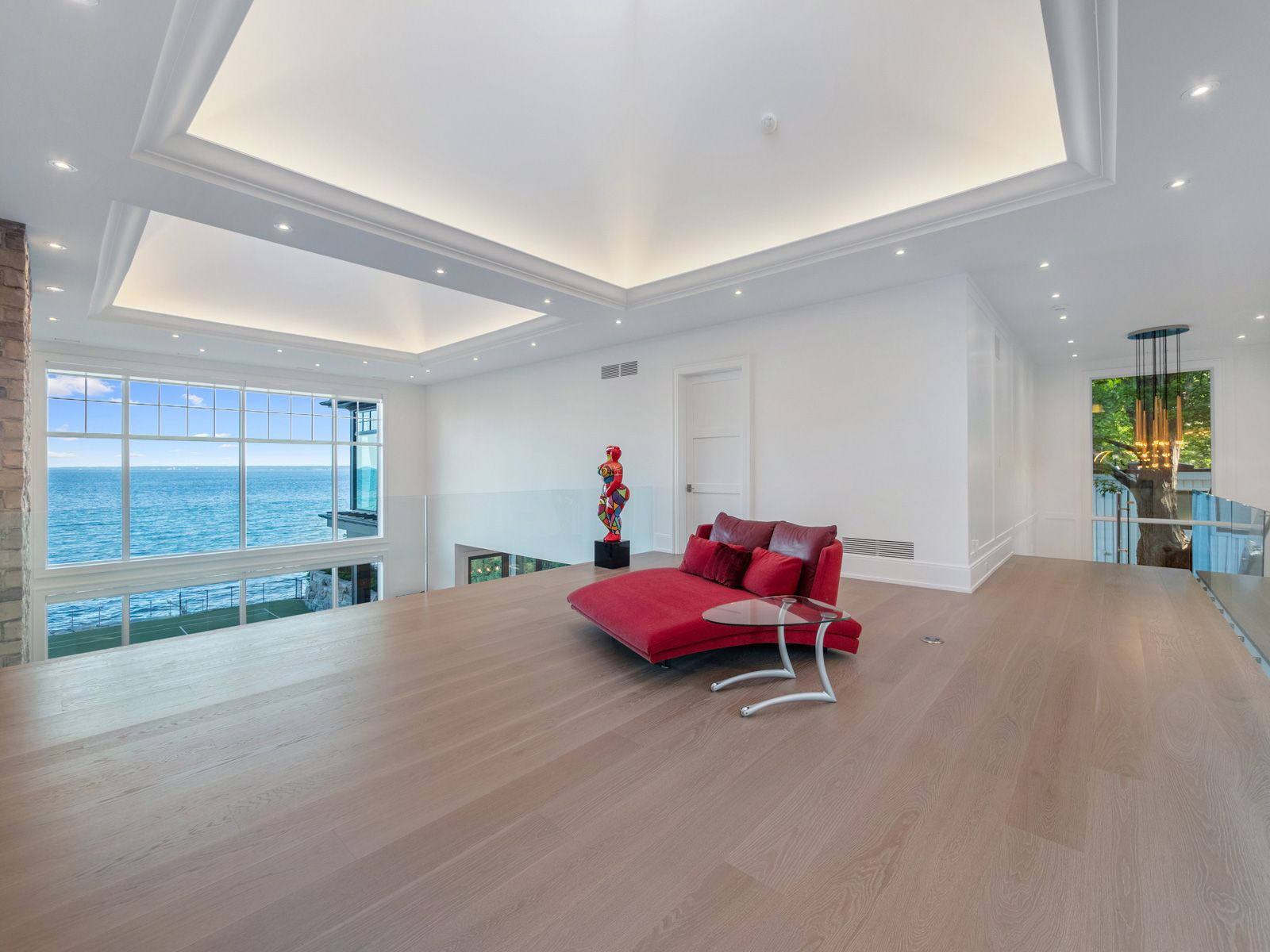 The Haven. A rare waterfront estate on a private laneway in South Burlington. Set on nearly of an acre with 103 ft of shoreline and full riparian rights, this property offers privacy, direct lake access, 11,417 Sq ft of living space and a lifestyle that feels like a luxury resort without leaving home. Inside, the lake takes centre stage. Floor to ceiling windows in the great room frame the view, anchored by 22-foot ceilings, a dramatic full-height stone fireplace, and a skylight that floods the space with light. A second living room provides another place to unwind, while a private office with 18-foot beamed ceilings and a stone feature wall inspires focus. Designed by architect David Small and built by Rock Cliff Custom Homes, this home is a masterclass in craftsmanship and elegance.Details like radiant heated floors throughout and a heated driveway ensure year-round comfort.Three outdoor terraces extend the living space.One includes a full outdoor kitchen with built-in BBQ, fridge, and bar sink; another is heated and screened for cooler nights.An additional custom stone patio sits at the waters edge.The backyard is a showstopper.An infinity edge pool appears to spill into the lake, while a private tennis court adds to the resort feel.Inside the kitchen features a large quartz island, Sub- Zero, Miele, and Wolf appliances, and custom cabinetry.A generous mudroom and main-floor laundry offer everyday function.Upstairs are four bedrooms, each with its own ensuite.The primary suite enjoys panoramic lake views, a spa-like ensuite, and a custom dressing room with center island.A second laundry room is also on this level.The walk-out lower level includes a lounge and bar, wine cellar, golf simulator, gym with lake views, sauna, tiered theatre, guest suite, and 3 additional bathrooms.An oversized 4-car tandem garage completes the home.Just minutes to downtown Burlington and a short drive to Toronto and Niagara, this is lakeside living without compromise. Luxury Certified