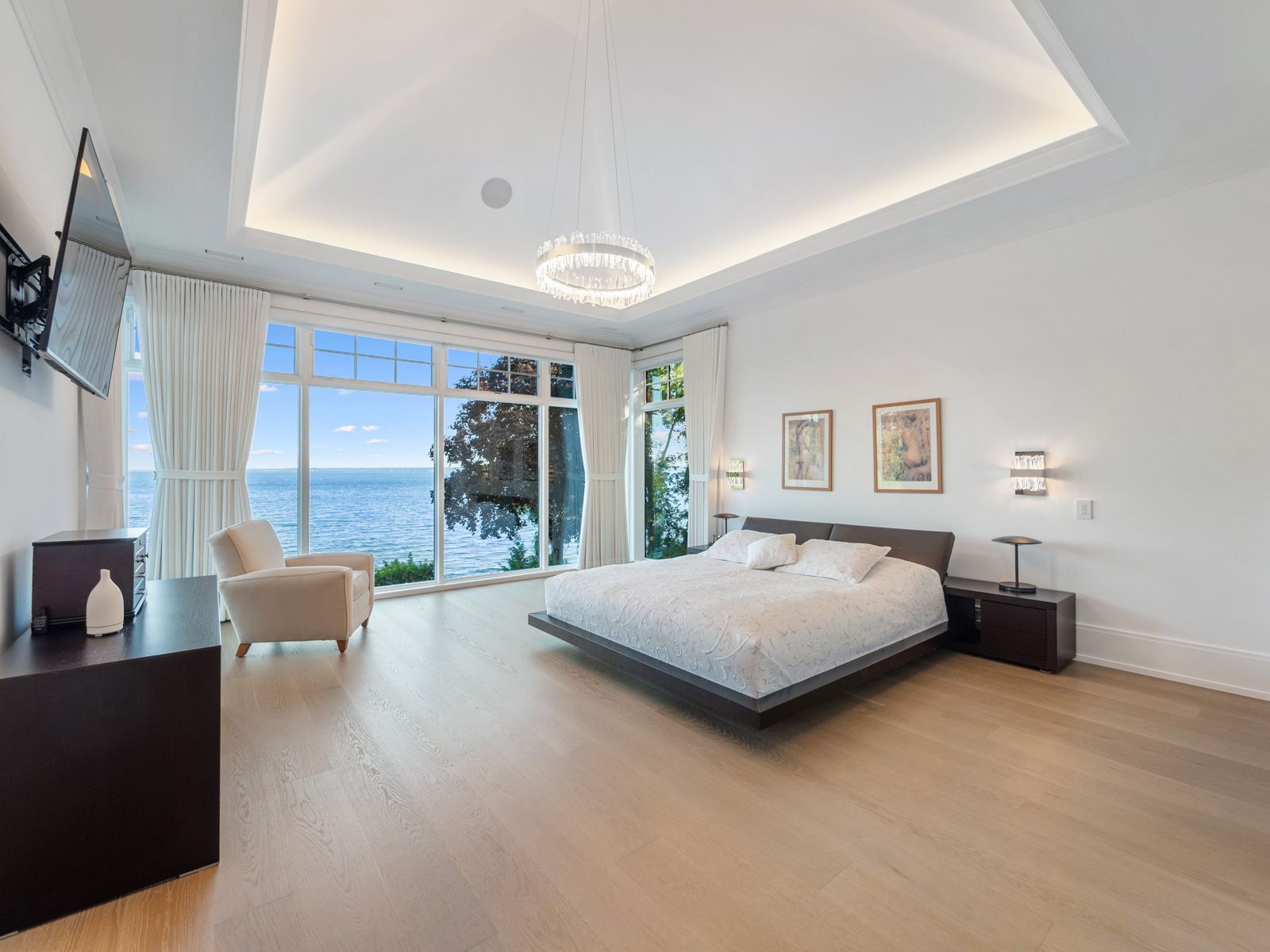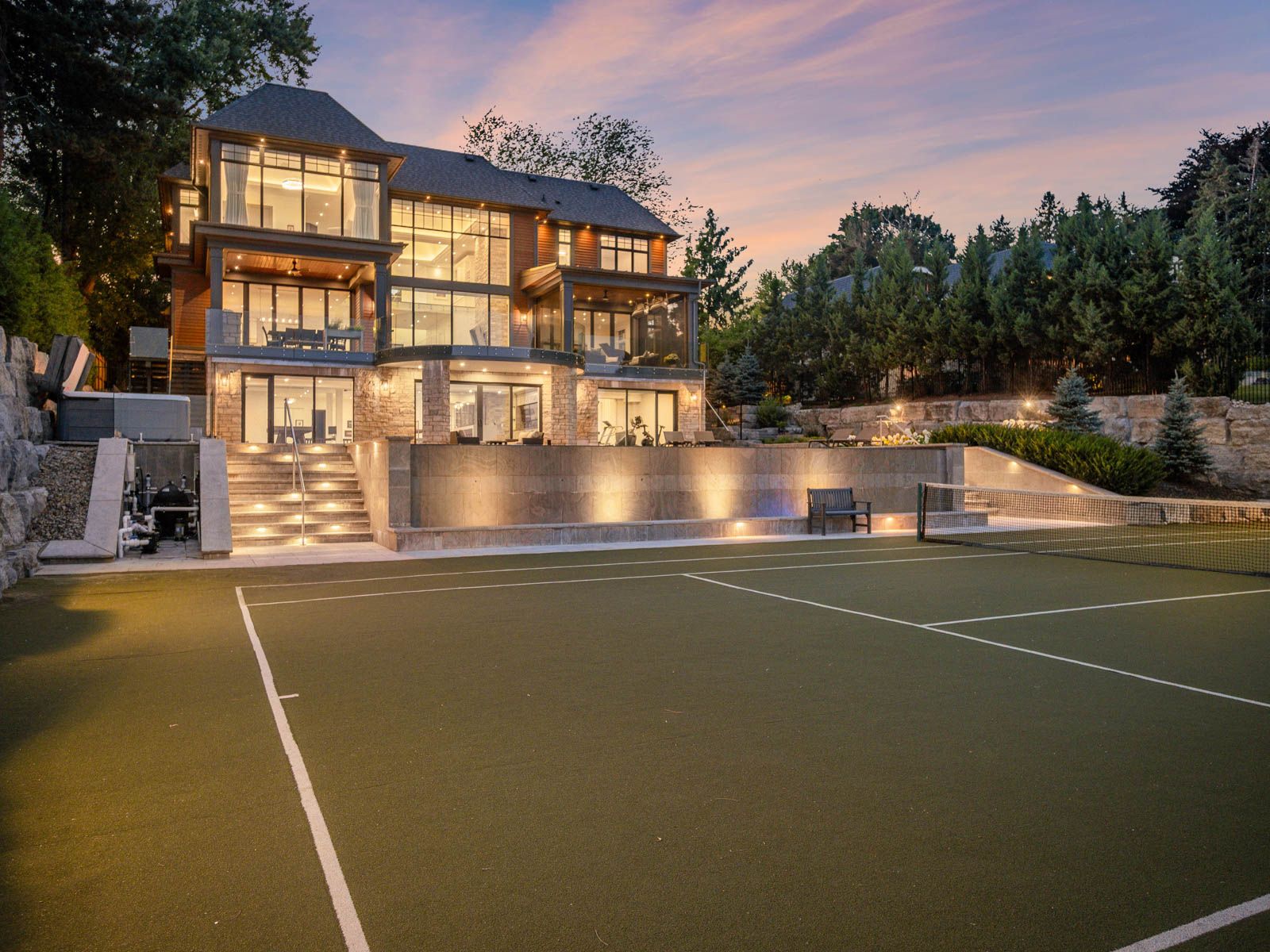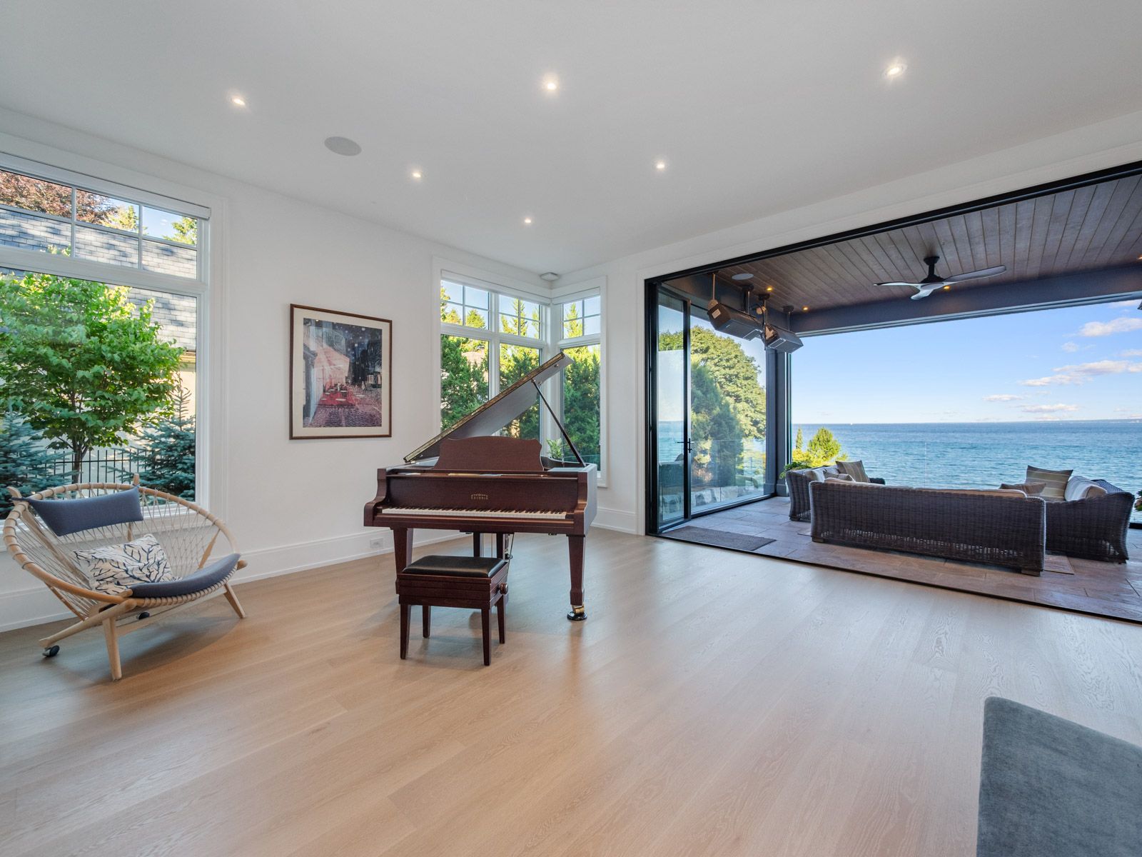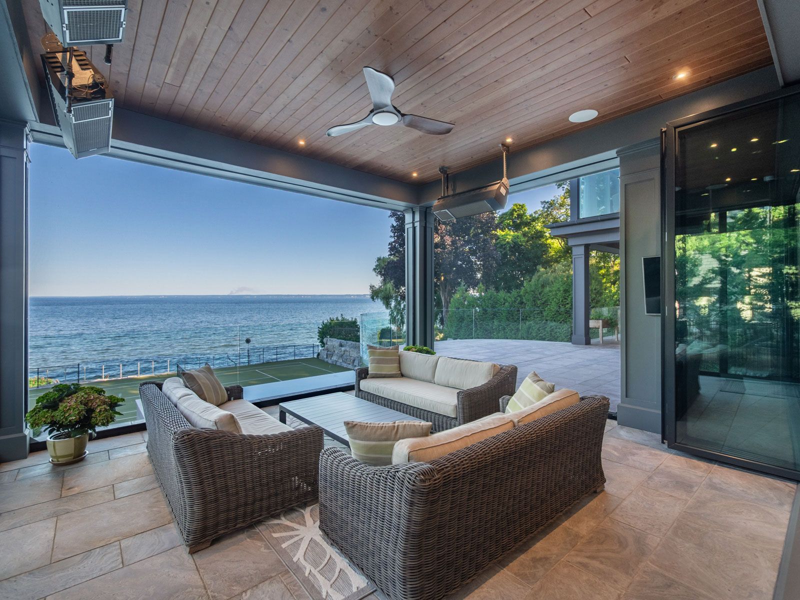 The Haven. A rare waterfront estate on a private laneway in South Burlington. Set on nearly of an acre with 103 ft of shoreline and full riparian rights, this property offers privacy, direct lake access, 11,417 Sq ft of living space and a lifestyle that feels like a luxury resort without leaving home. Inside, the lake takes centre stage. Floor to ceiling windows in the great room frame the view, anchored by 22-foot ceilings, a dramatic full-height stone fireplace, and a skylight that floods the space with light. A second living room provides another place to unwind, while a private office with 18-foot beamed ceilings and a stone feature wall inspires focus. Designed by architect David Small and built by Rock Cliff Custom Homes, this home is a masterclass in craftsmanship and elegance.Details like radiant heated floors throughout and a heated driveway ensure year-round comfort.Three outdoor terraces extend the living space.One includes a full outdoor kitchen with built-in BBQ, fridge, and bar sink; another is heated and screened for cooler nights.An additional custom stone patio sits at the waters edge.The backyard is a showstopper.An infinity edge pool appears to spill into the lake, while a private tennis court adds to the resort feel.Inside the kitchen features a large quartz island, Sub- Zero, Miele, and Wolf appliances, and custom cabinetry.A generous mudroom and main-floor laundry offer everyday function.Upstairs are four bedrooms, each with its own ensuite.The primary suite enjoys panoramic lake views, a spa-like ensuite, and a custom dressing room with center island.A second laundry room is also on this level.The walk-out lower level includes a lounge and bar, wine cellar, golf simulator, gym with lake views, sauna, tiered theatre, guest suite, and 3 additional bathrooms.An oversized 4-car tandem garage completes the home.Just minutes to downtown Burlington and a short drive to Toronto and Niagara, this is lakeside living without compromise. Luxury Certified