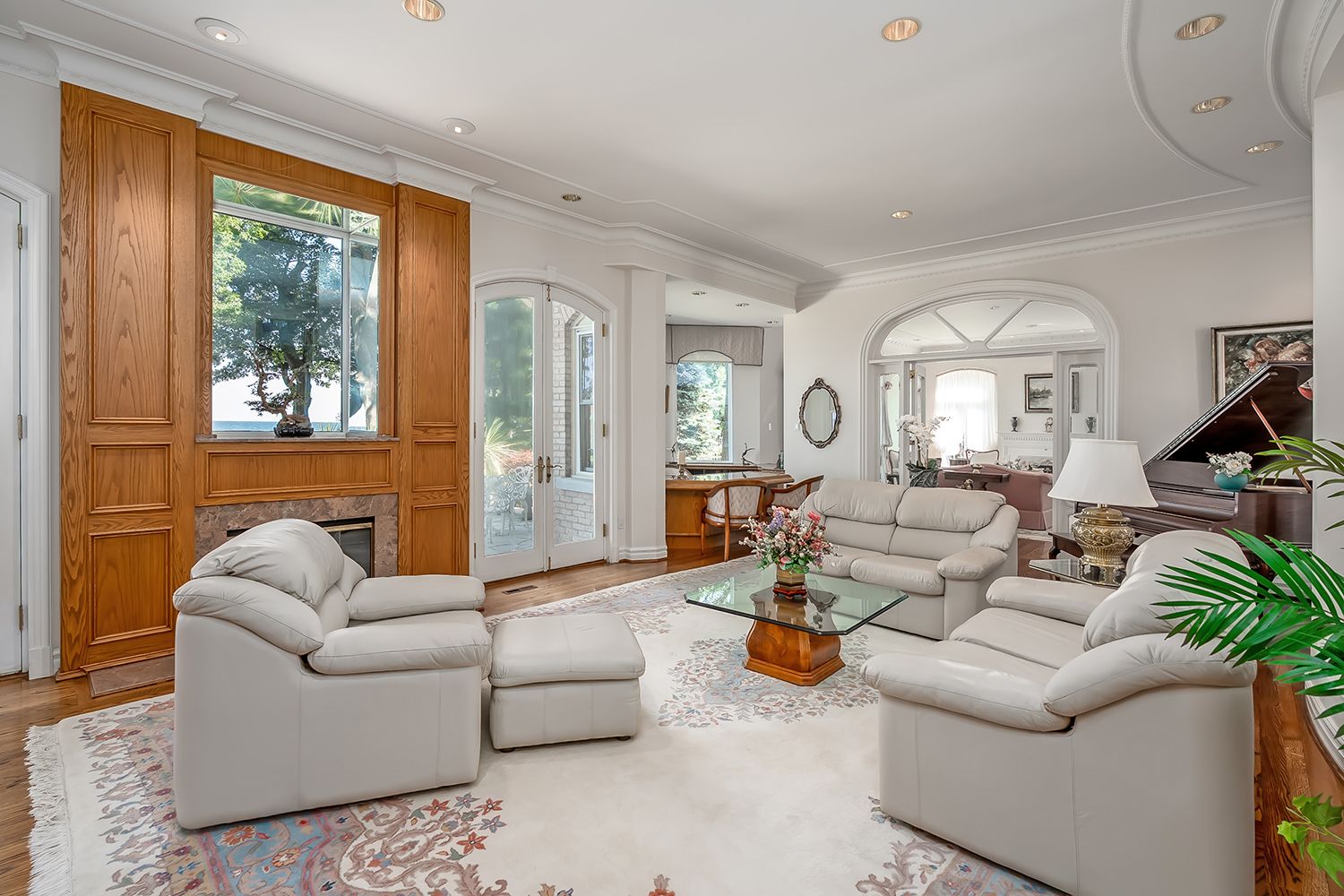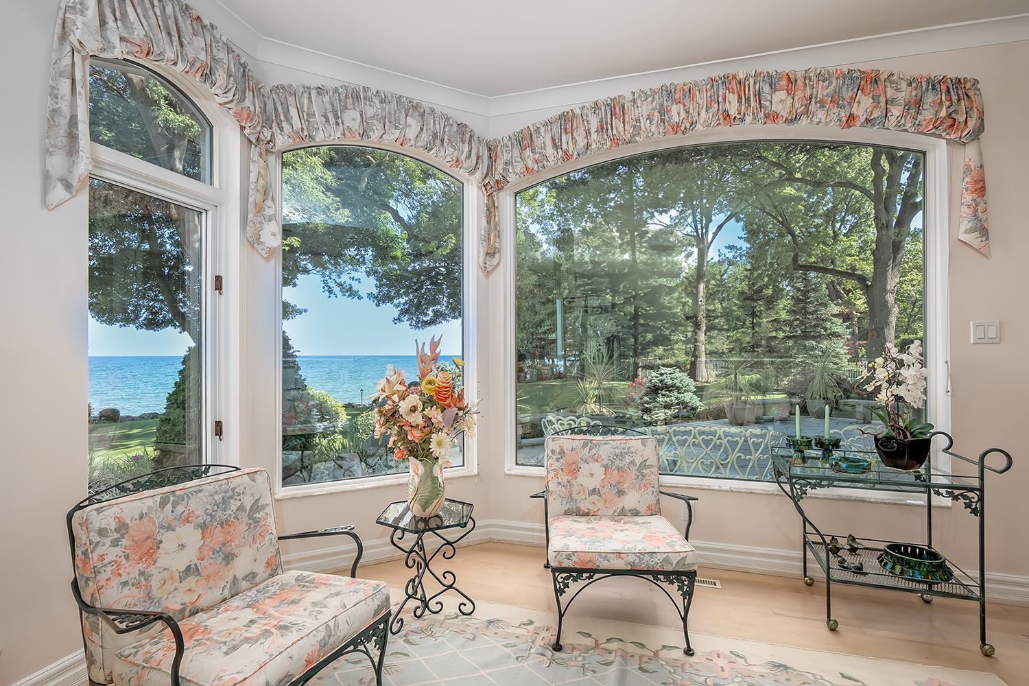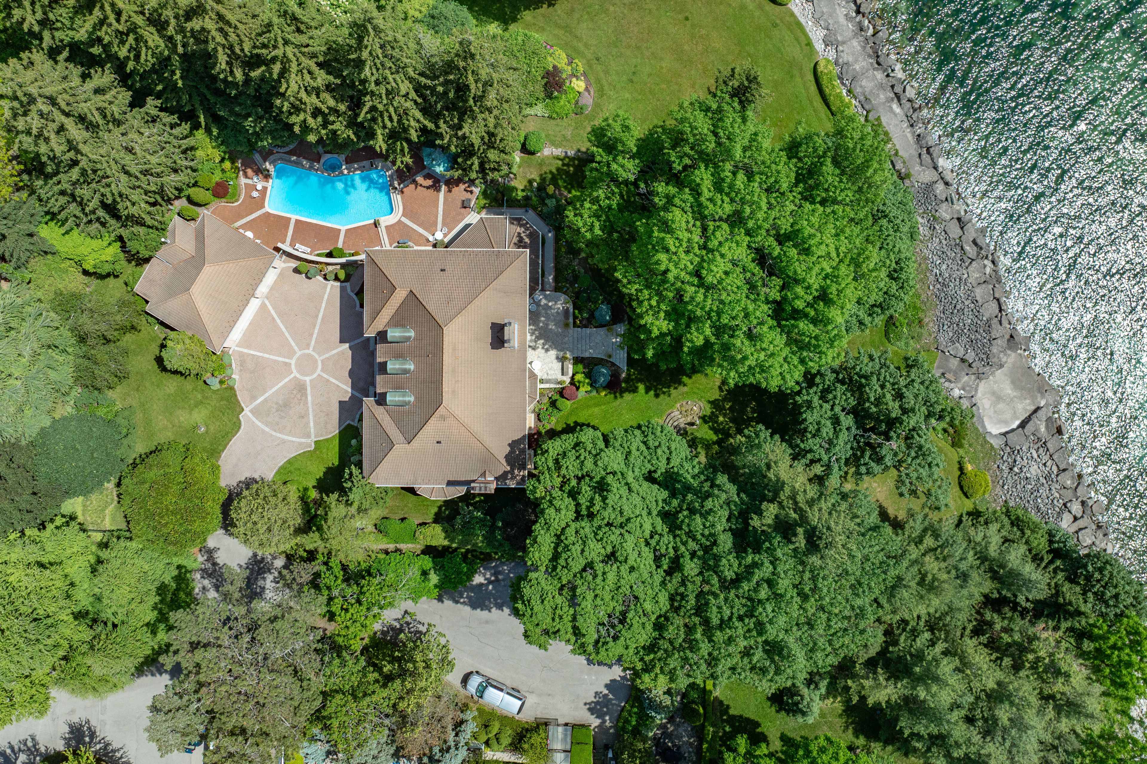 Welcome to an exceptional waterfront residence on one of South East Oakville's most private and prestigious streets. Set on a quiet cul-de-sac with full riparian rights, this landmark estate offers nearly 9,300 square feet of finished living space and stunning lake views from almost every room. A long, gated drive leads to manicured grounds, mature trees and a sun-filled backyard with pool, multiple terraces and direct access to the lake. Designed for both everyday living and elegant entertaining, the main level features a grand foyer, formal living and dining rooms, a lake-facing great room with fireplace and a bright kitchen and breakfast area that open to the terrace. The upper level is highlighted by a private primary suite with balcony, sitting area, walk-in closet and spa-like ensuite overlooking the water. Three additional bedrooms on this level offer ensuite or semi-ensuite access and either lake or garden views. A main floor bedroom provides ideal guest or in-law accommodation. The fully finished lower level includes a spacious recreation room, games area, wine cellar, sauna, full bathroom and a walk-out to the backyard and pool. A lower-level guest suite with ensuite offers additional privacy for extended family or visitors. This rare property combines lakefront living with proximity to the best of Oakville. Walking distance to top-rated public and private schools, close to downtown shops, restaurants, marinas, parks and highways. A unique opportunity to own on the water in Eastlake-where privacy, scale and views come together in one of Oakville's finest settings.