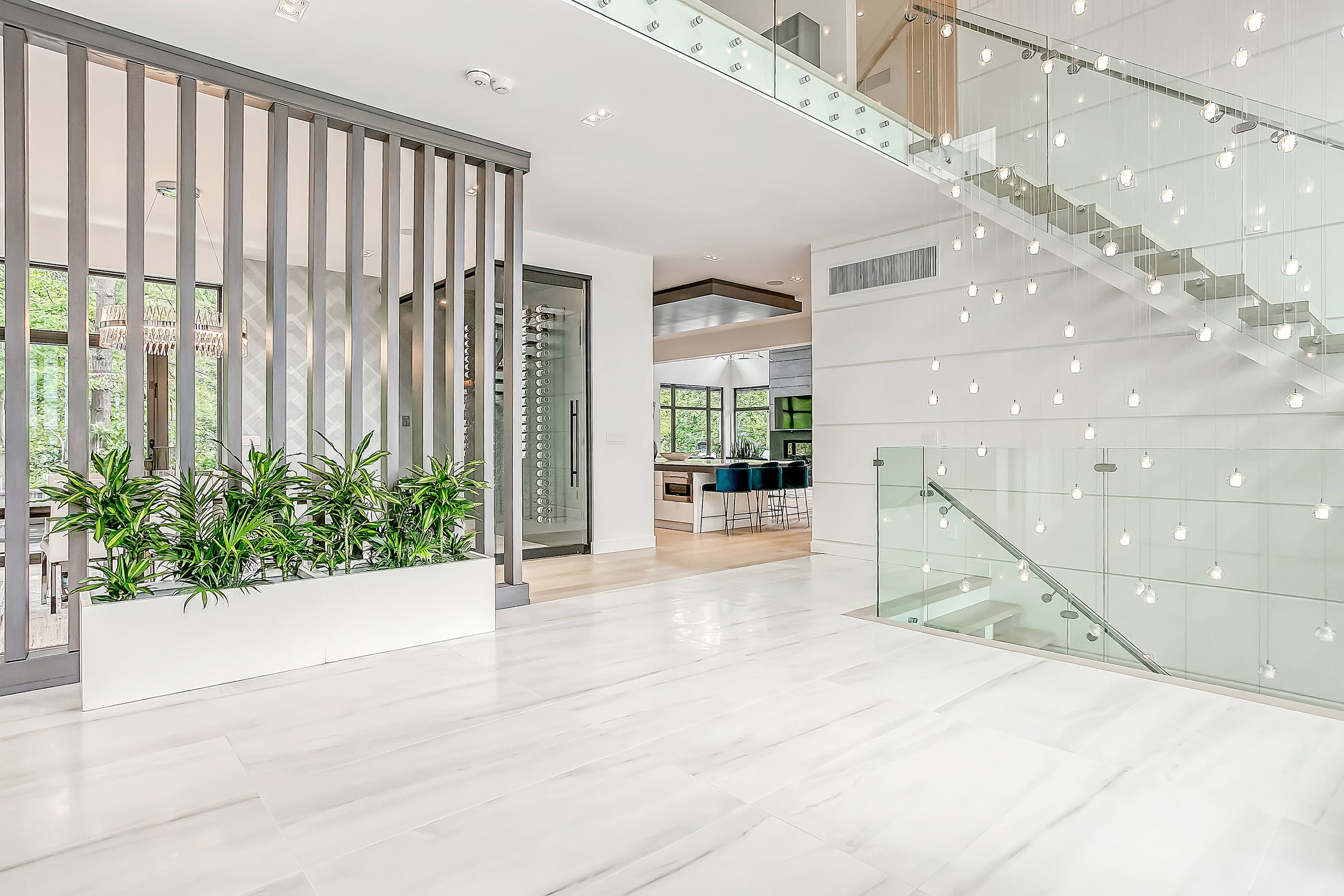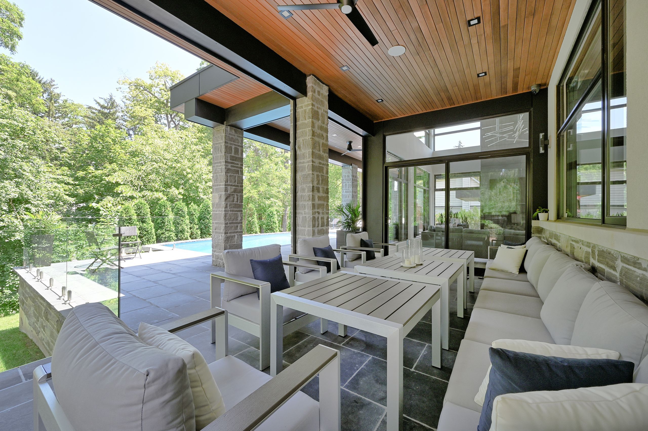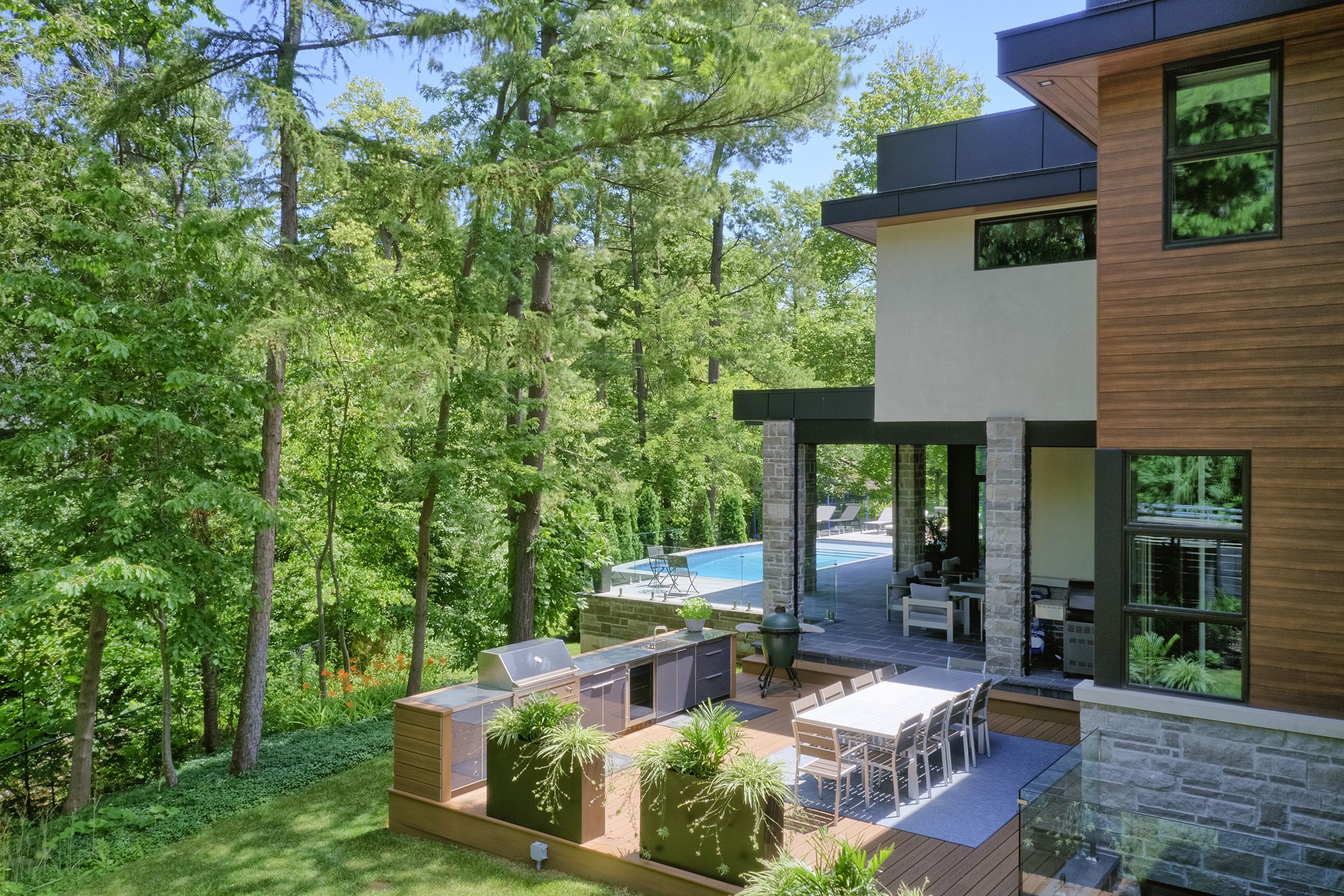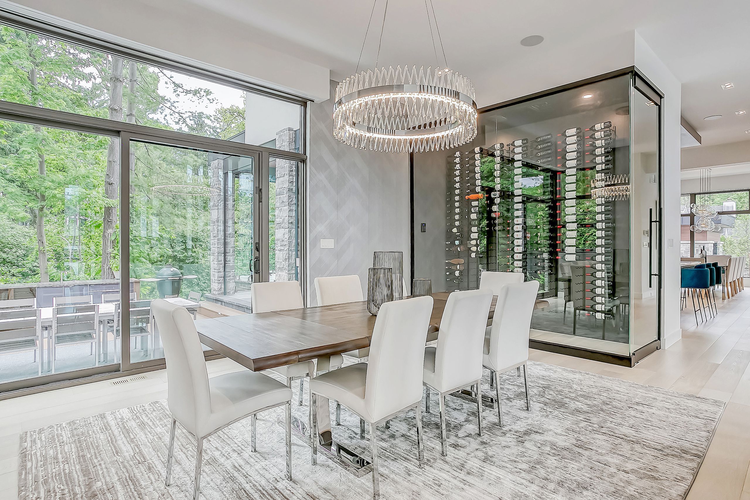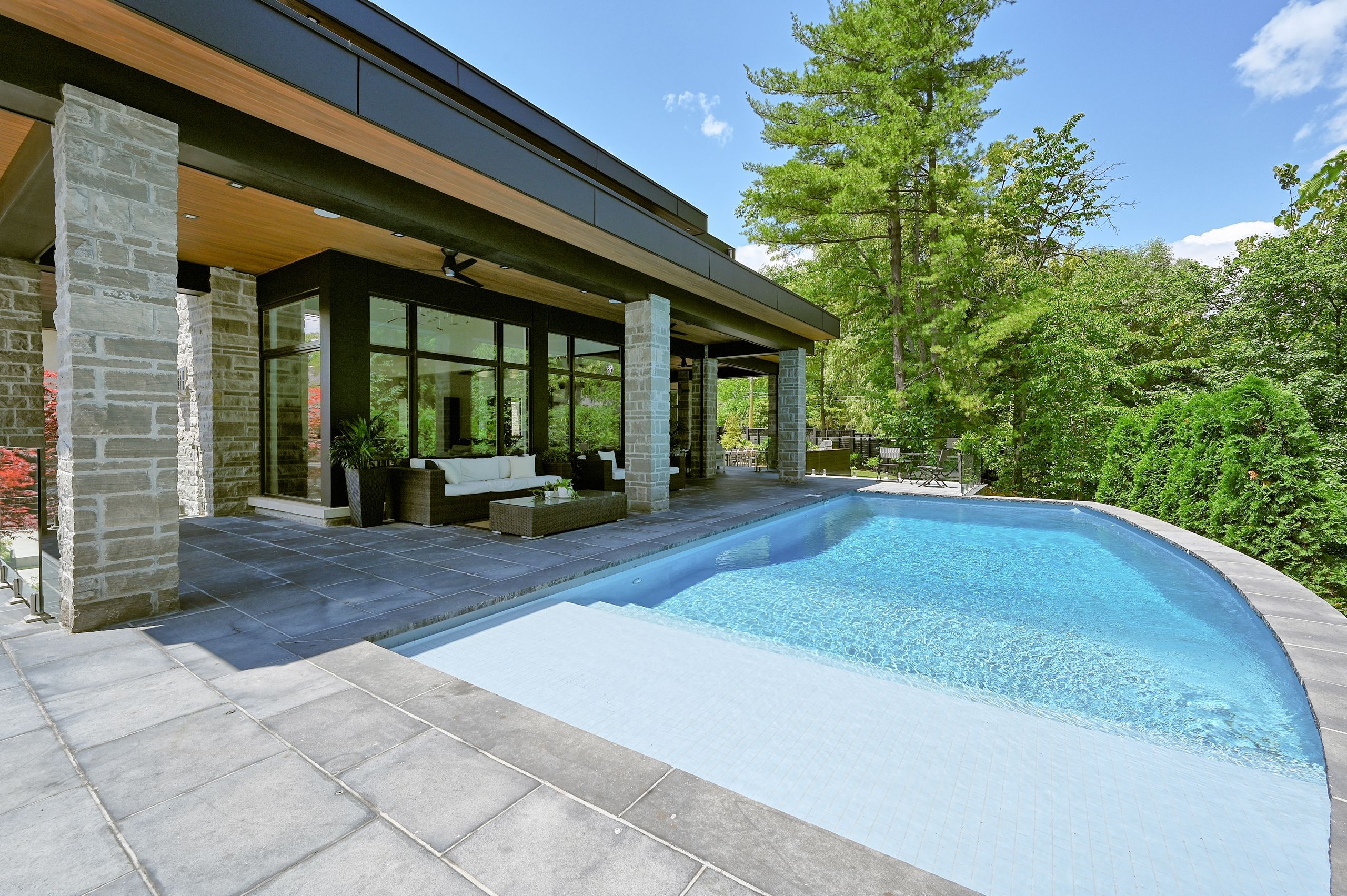 With a stunning backyard, 5,196 sq ft of above ground living, and quality construction built by Gatestone Homes, this home is truly the total package. Stone, wood, and striking Anderson windows have been eloquently incorporated on the exterior of the home, lending to the superb curb appeal. The thoughtful design fuses modern style with timeless elegance. The foyer of the home feels as though you are entering a luxury hotel, with a stunning floating staircase and a custom hanging light feature that is a piece of art in itself! The soaring two-storey foyer is flooded with natural light from oversized windows, creating a bright and welcoming space. A custom wooden piece subtly divides the foyer from the traditional dining room that is complete with a temperature-controlled wine room and glass doors that invite you to enjoy the expansive rear deck. The heart of the home is the open concept kitchen-family-dining space that is surrounded by windows and grounded by a beautiful gas fireplace. With an oversized island there is no shortage of space for you and your guests. Adjacent to the kitchen is a conveniently located powder room as well as a laundry/mudroom that can be concealed by a pocket door. The primary suite is a true oasis. With double door entry, a gas fireplace, and five-piece ensuite, no detail was overlooked. The three additional bedrooms all have ensuite access and walk-in closets. Completing this level is a laundry room and study area with built-in desk space. The 2,712 sq ft lower-level walk-up will not disappoint. The large recreation space features a built-in projector, billiards space, and wet bar. A home gym and two additional bedrooms as well as playroom/second home office finish off this space. Lush mature trees combined with meticulous landscaping will lure you to the rear yard. With approx. 1800 sq ft of outside living space, a gunite pool, and cabana, this backyard checks all the boxes! Enjoy the beautiful summer weather in this retreat-like home!