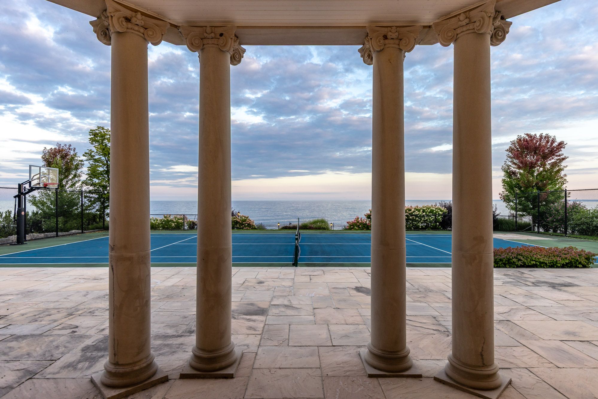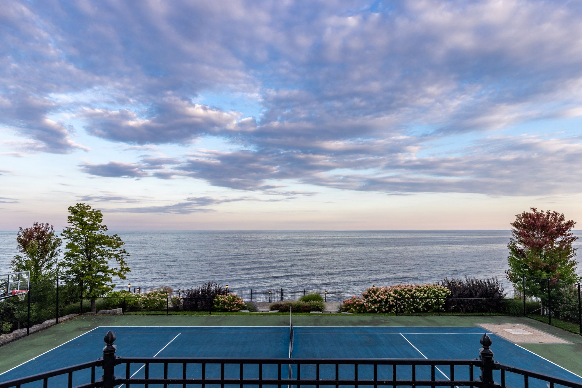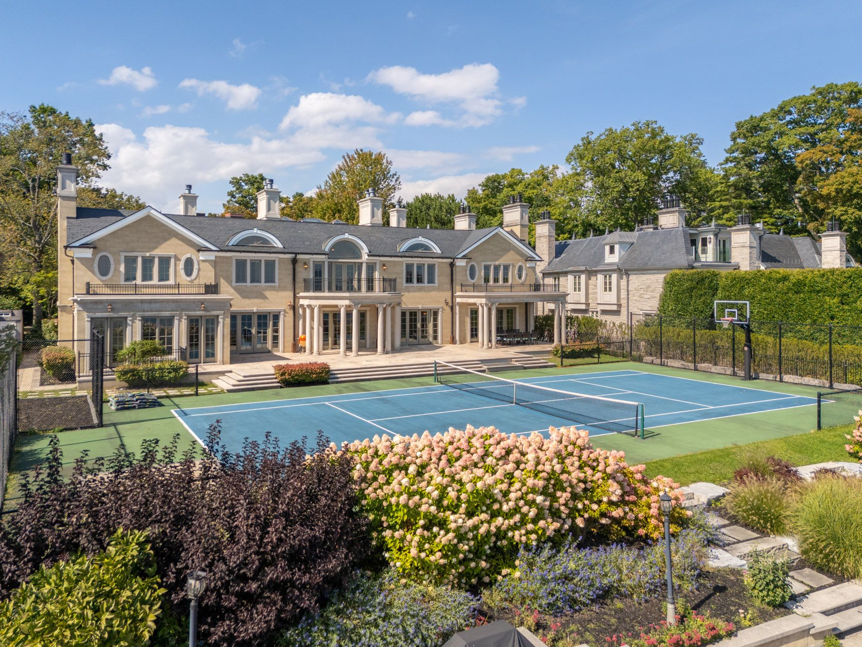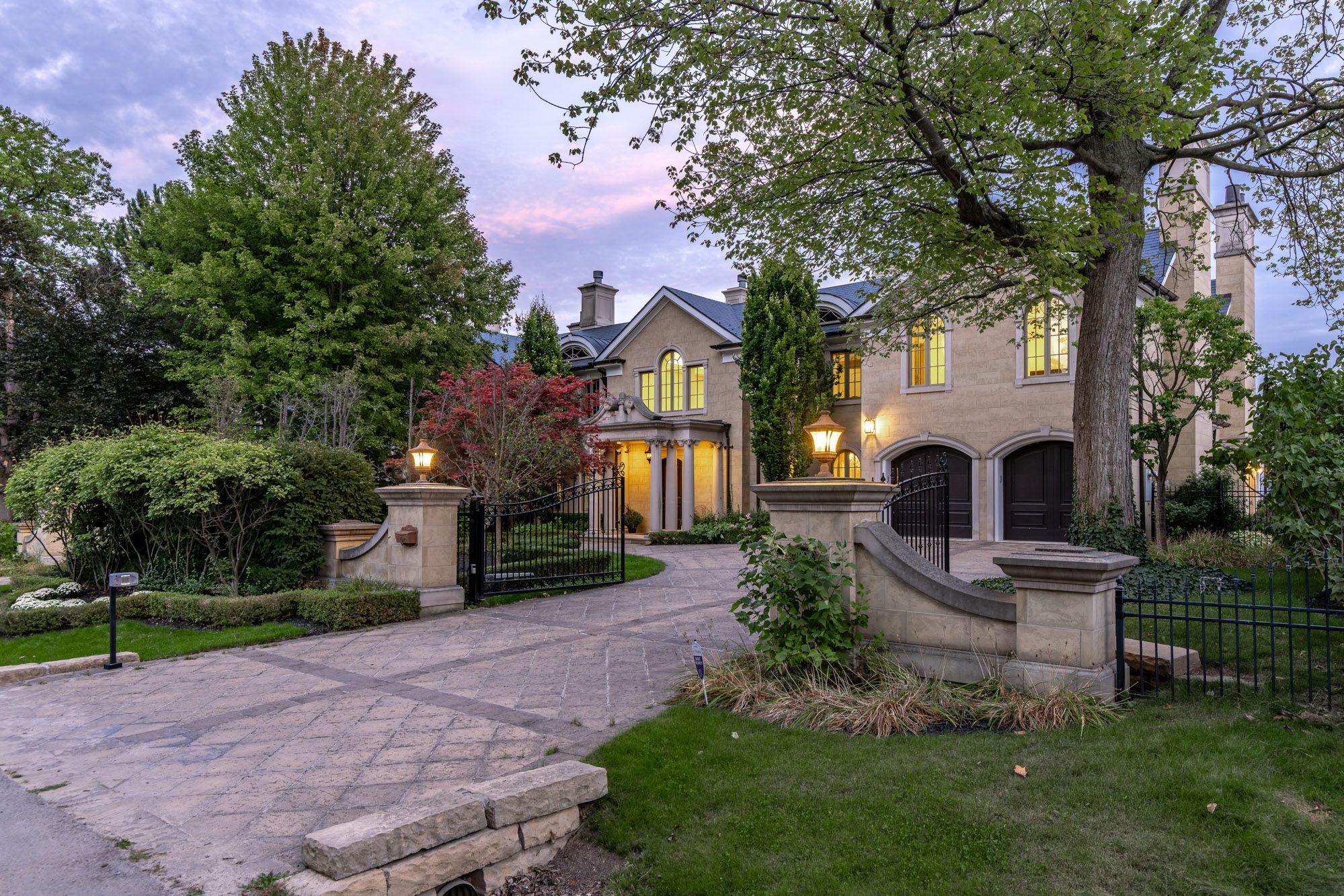 Commanding a prized stretch of Lake Ontario shoreline in prestigious South East Oakville, this Hicks-Pettes-designed estate defines European elegance and modern grandeur. A limestone façade with stone pillars, slate roof and copper detailing signal architectural pedigree of the highest order. Behind the gated, heated circular drive and stately covered porch, more than 14,000 sq. ft. of elevator-served luxury unfolds. From the moment you enter, panoramic lake vistas sweep across every principal room, creating an unforgettable backdrop for both intimate family life and grand entertaining. Radiant-heated marble floors and a soaring 22-foot illuminated barrel ceiling set a tone of sophisticated drama. Formal living and entertaining salons, each with hand-carved stone fireplaces, open to expansive lake-view terraces, while the sun-filled solarium captures year-round vistas of the tennis court and shimmering water beyond. A chefs kitchen with separate caterers prep area balances everyday ease with gala-scale hosting. Completing the main level, a richly paneled library provides a quiet, distinguished retreat for work or reflection. Five lavish bedroom suites each with private ensuite include a primary sanctuary with spa-inspired bath and private lake-view balcony. The lower level becomes a private club: temperature-controlled wine cellar and bar, theatre, banquet hall, gym, nanny suite and second laundry. Outdoors, French-inspired gardens, sound-equipped terraces and a full tennis court embrace the lakes breezes and golden sunsets. This is Oakvilles ultimate lakefront legacy residence - where unrivalled, world-class vistas from every principal room meet architectural mastery and resort-style amenities to create a property of true international calibre. Luxury Certified.