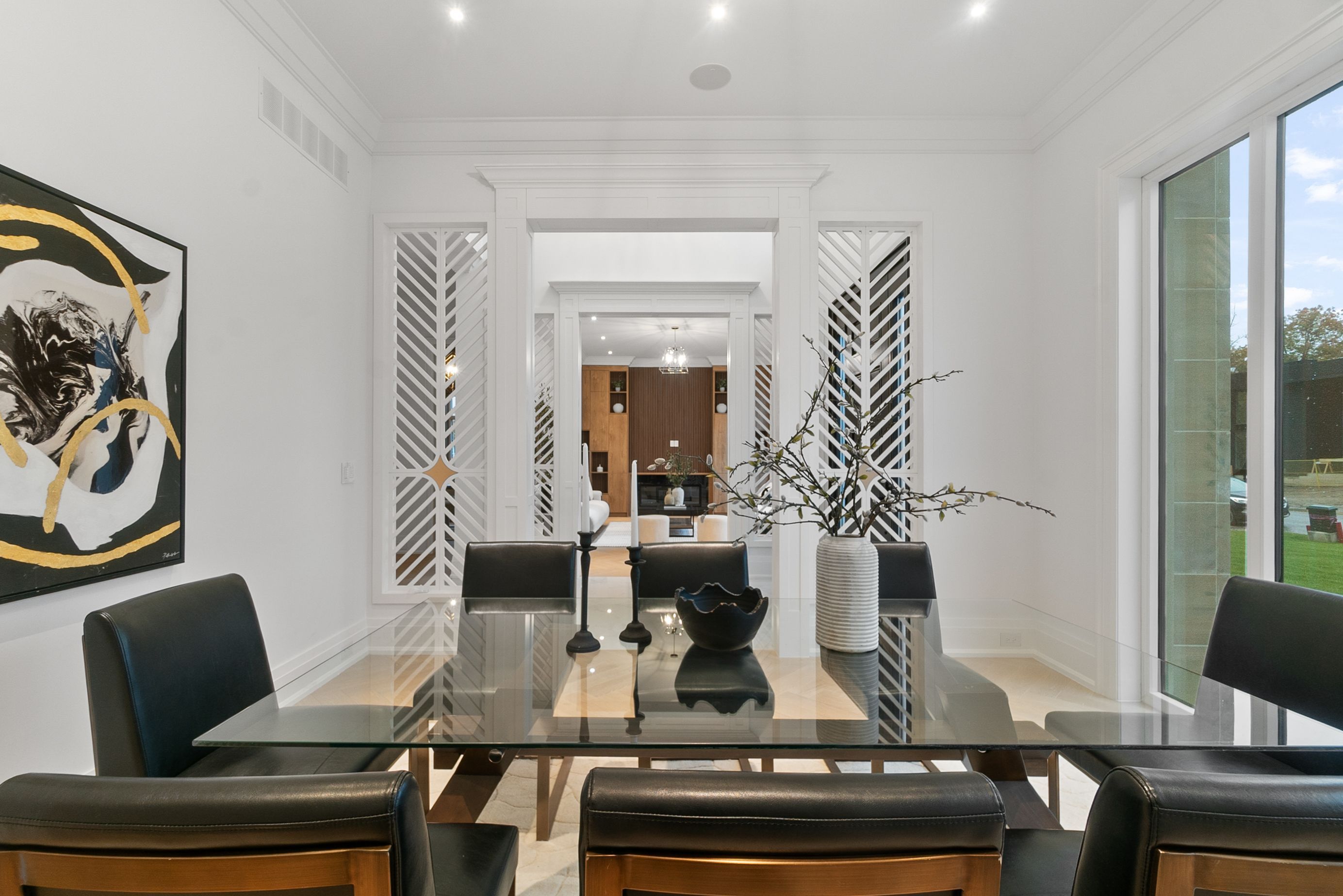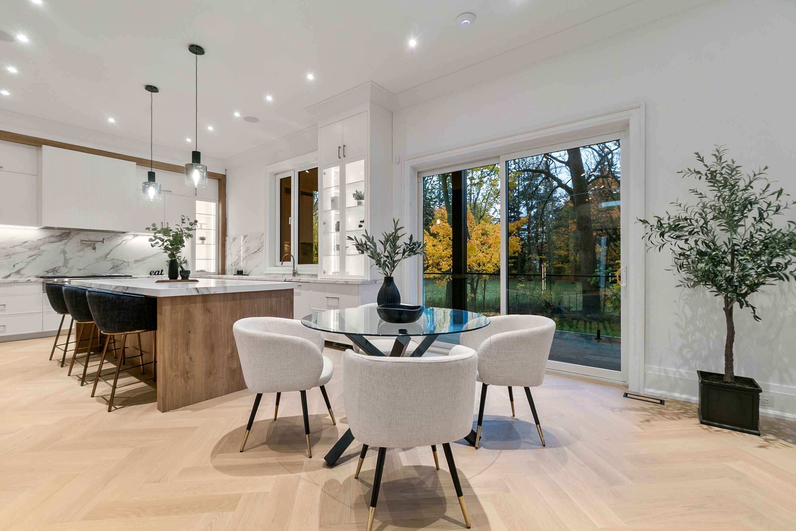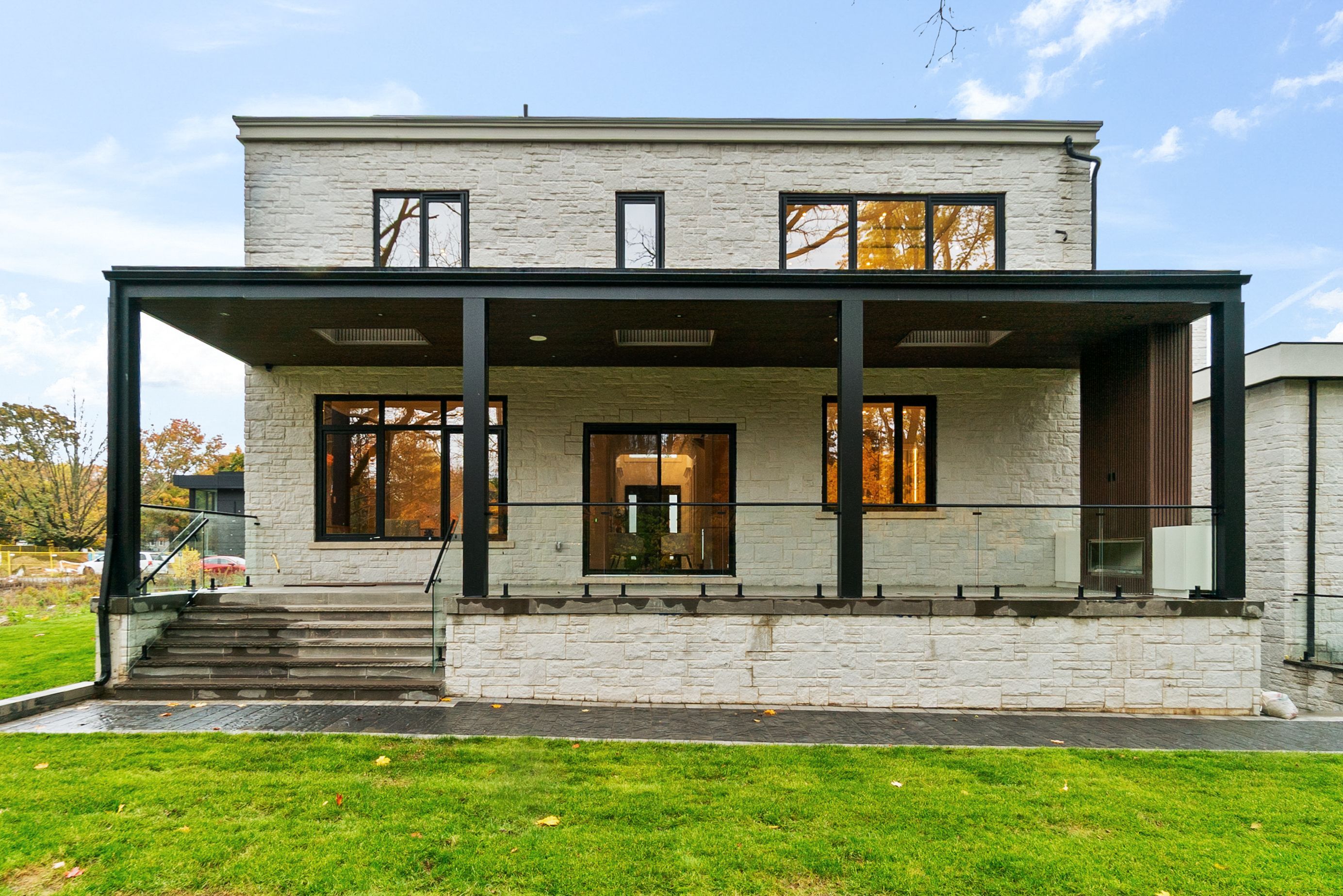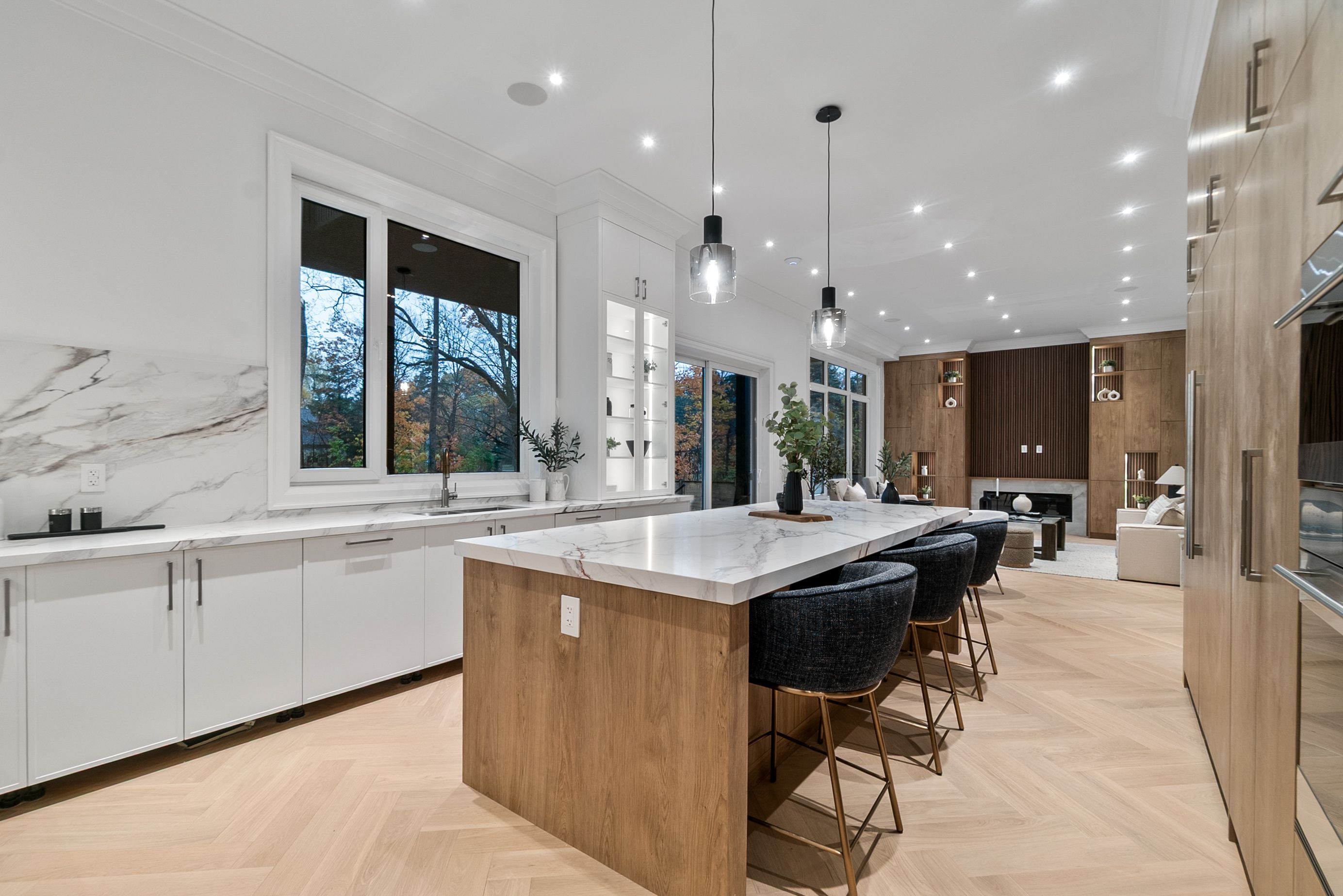 Set within one of Oakville's most distinguished enclaves, 84 Pebbleridge Place is a newly built modern estate that epitomizes architectural artistry and offers over 7,000 SF of refined living space. Poised on a private lot, this residence showcases a brick and limestone exterior, full-height glass walls a curated palette of luxurious finishes for the most discerning buyer. A grand double-height foyer introduces the home w/ polished marble-style porcelain and bespoke detailing. Beyond, herringbone hardwood floors flow through expansive principal rooms to a family room defined by a sleek wood feature wall, gas fireplace, and integrated Control4 automation for effortless entertaining. The designer kitchen is both statement and function, featuring an oversized island, full-height custom cabinetry, and Calacatta-style quartz counters w/ a custom backsplash. It opens directly to a covered deck w/ a gas fireplace, perfect for al fresco dining and evenings. An elevator and striking skylit staircase lead to the upper level, where four bedrooms each feature walk-in closets, tray ceilings, and private ensuites finished to spa-like standards. The primary suite is a serene retreat w/ a boutique-style dressing room and five-piece ensuite boasting a freestanding tub, oversized glass shower, full-height stone surrounds, and heated flooring. The lower level continues the theme of luxury and versatility, offering a heated basement w/ large-format porcelain slab flooring throughout. Designed for both relaxation and entertainment, this level includes a secondary kitchen, dining area, expansive living space, fitness room w/ cushioned flooring, an acoustically designed theatre, and three additional ensuite bedrooms, all enhanced by full-size windows and a separate entrance. Additional highlights incld: a rough-in sauna, built-in speakers, and recessed lighting elevate comfort and ambiance, while upper-level laundry & a tandem garage w/ epoxy flooring complete this modern masterpiece.