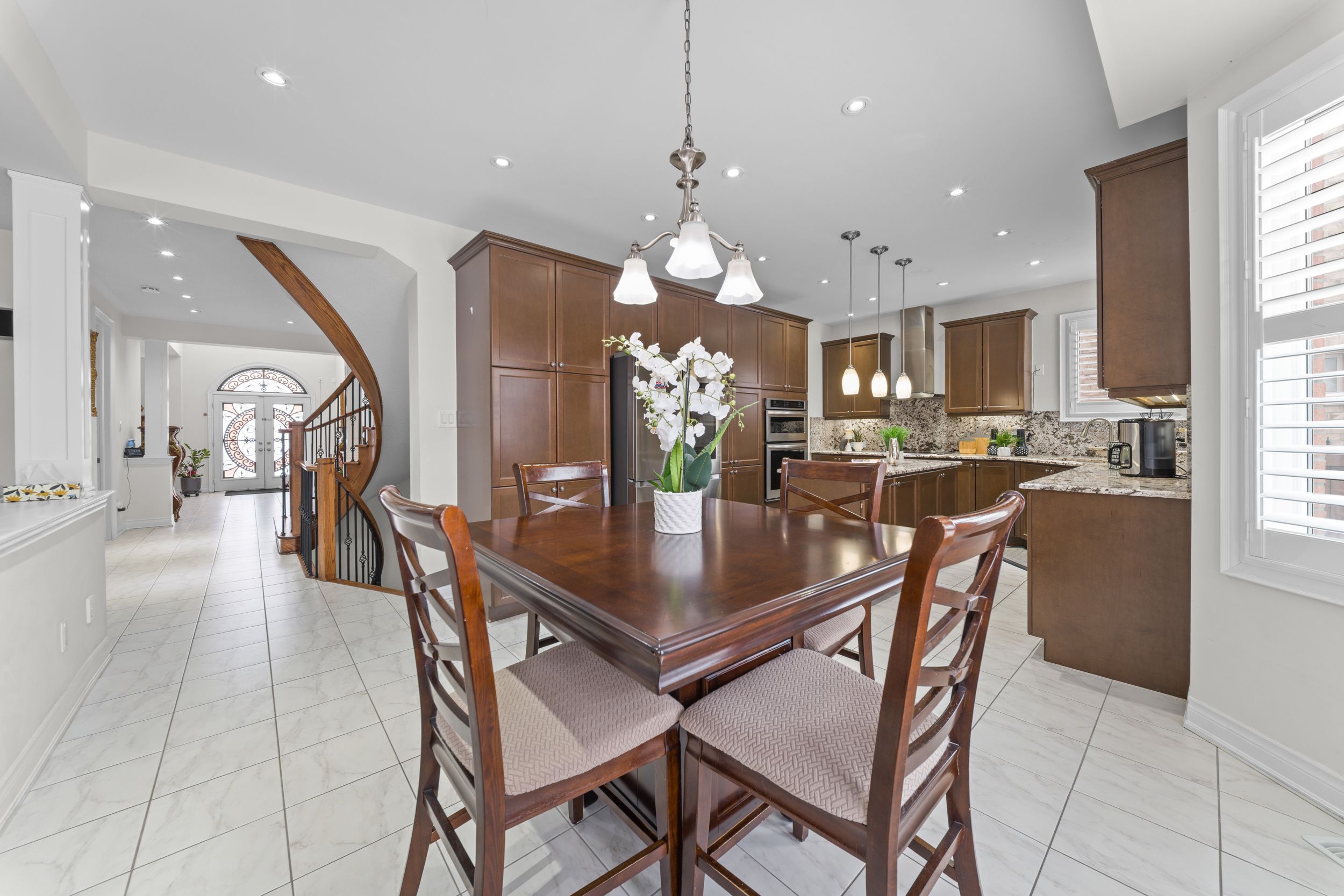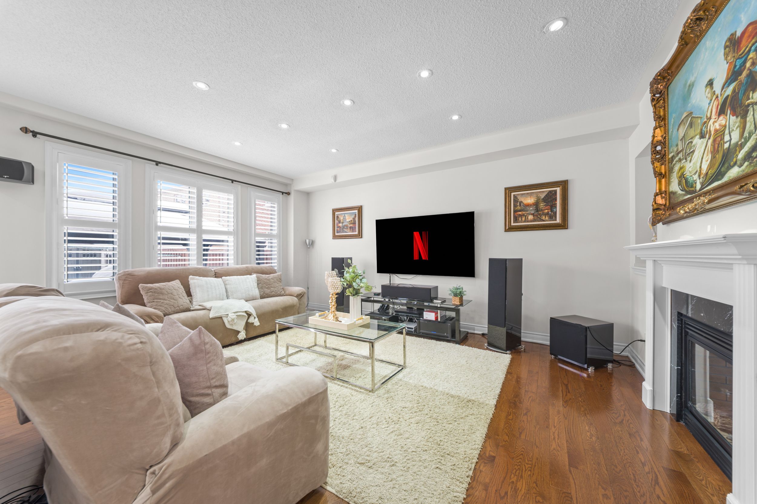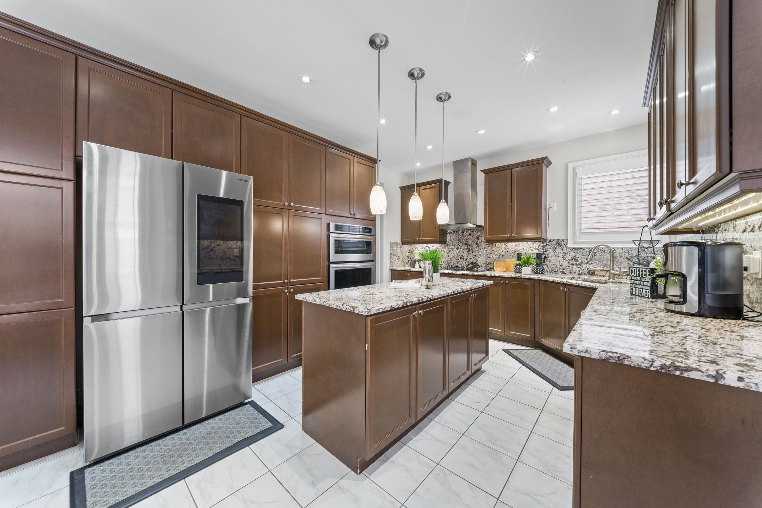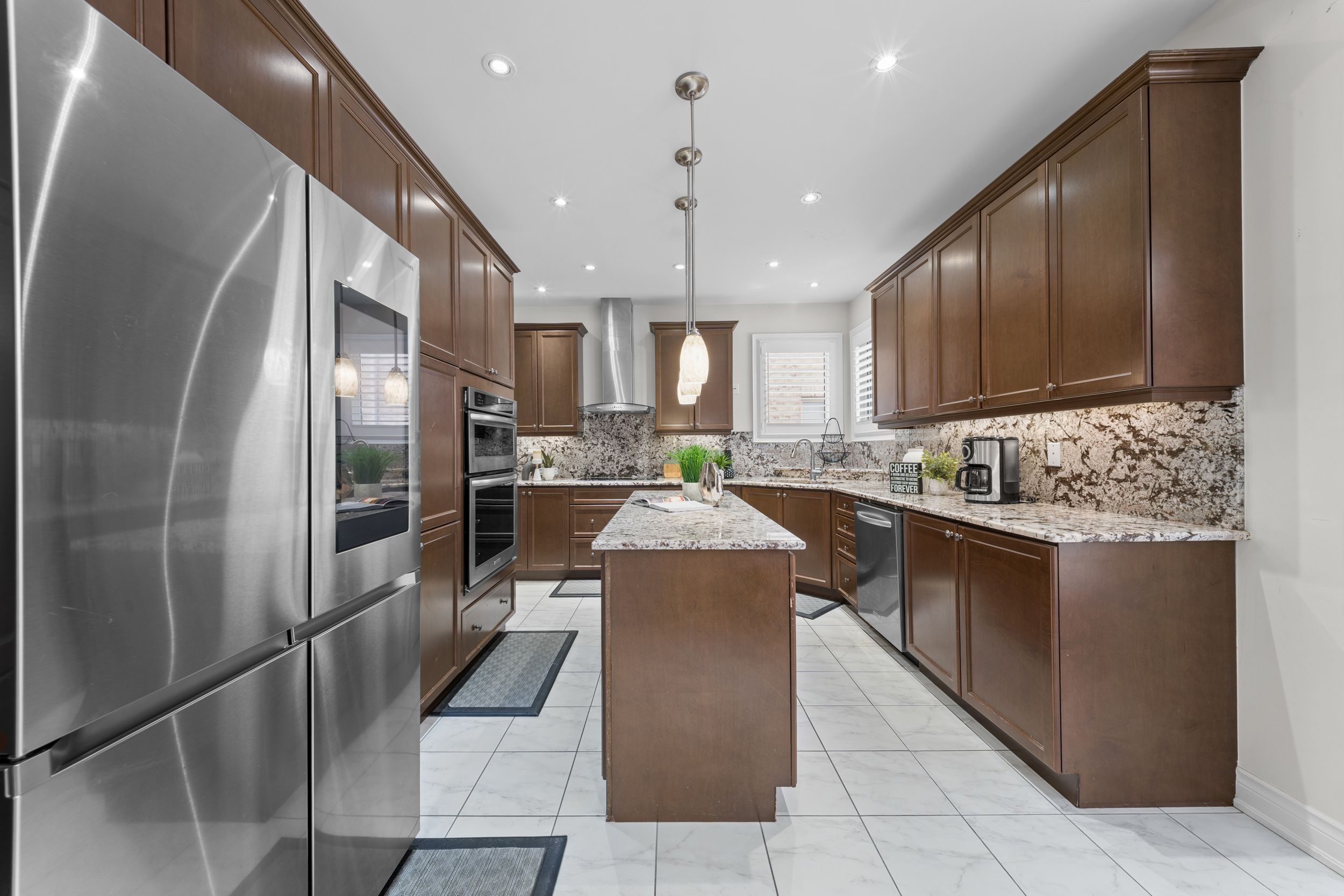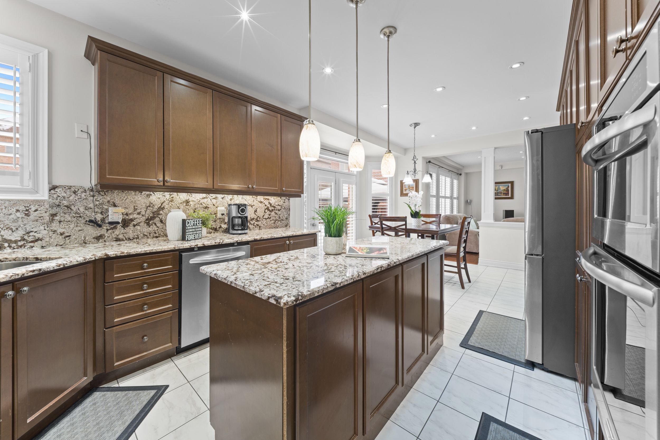 Exquisite Home offering approx. 3,700 sq. ft. of refined living space, featuring 9-ft ceilings on both floors and rich hardwood throughout. A grand double-door entry opens to a breathtaking open-to-above foyer with an elegant chandelier. The gourmet kitchen is beautifully appointed with granite countertops, designer backsplash, premium maple cabinetry, a spacious center island, built-in cooktop and oven, and stainless steel appliances. Expansive principal rooms include gas fireplaces in both the living room and private office, ideal for elegant entertaining and everyday comfort. The luxurious primary suite offers a spacious walk-in closet and a spa-inspired ensuite bath, complemented by four generously sized bedrooms and the rare convenience of three full bathrooms on the upper level. California shutters throughout enhance sophistication and privacy. Additional highlights include pot lights on the main floor and exterior, a separate entrance, no sidewalk for maximum parking, an interlocked driveway and patio, and a beautifully landscaped backyard with shed-an exceptional blend of luxury, space, and functionality.