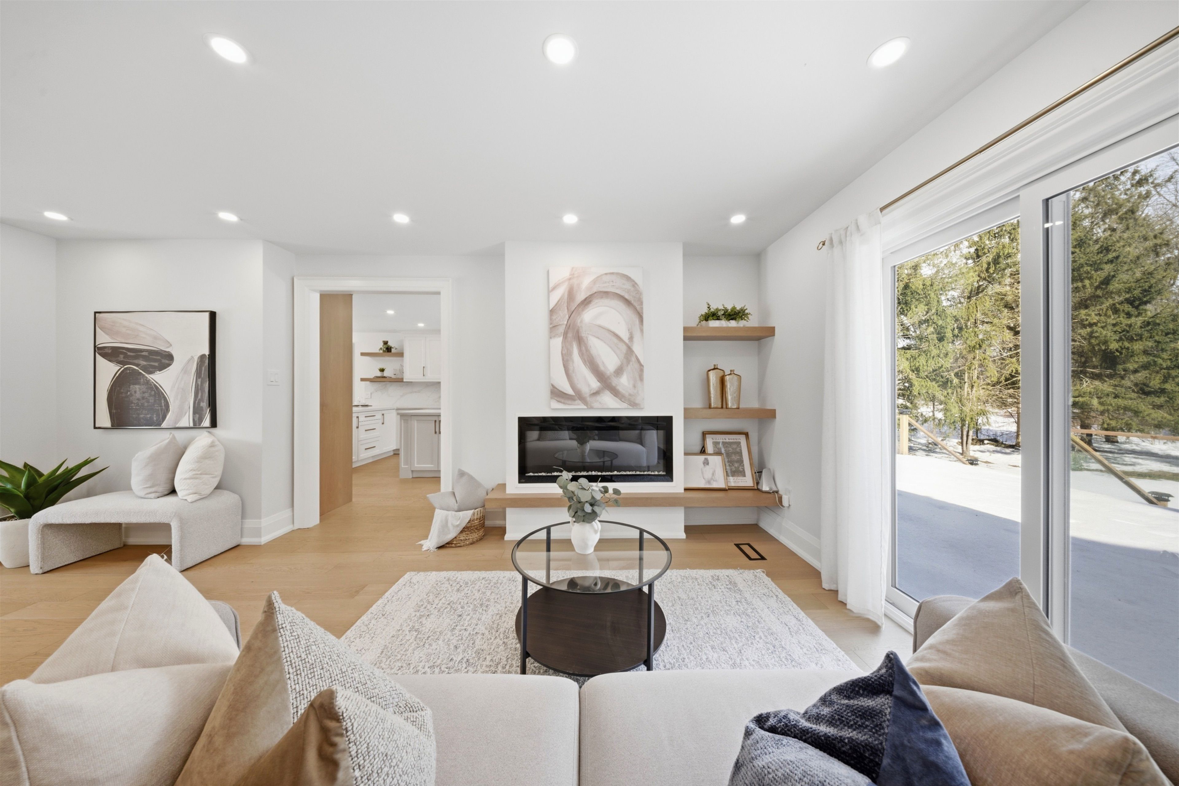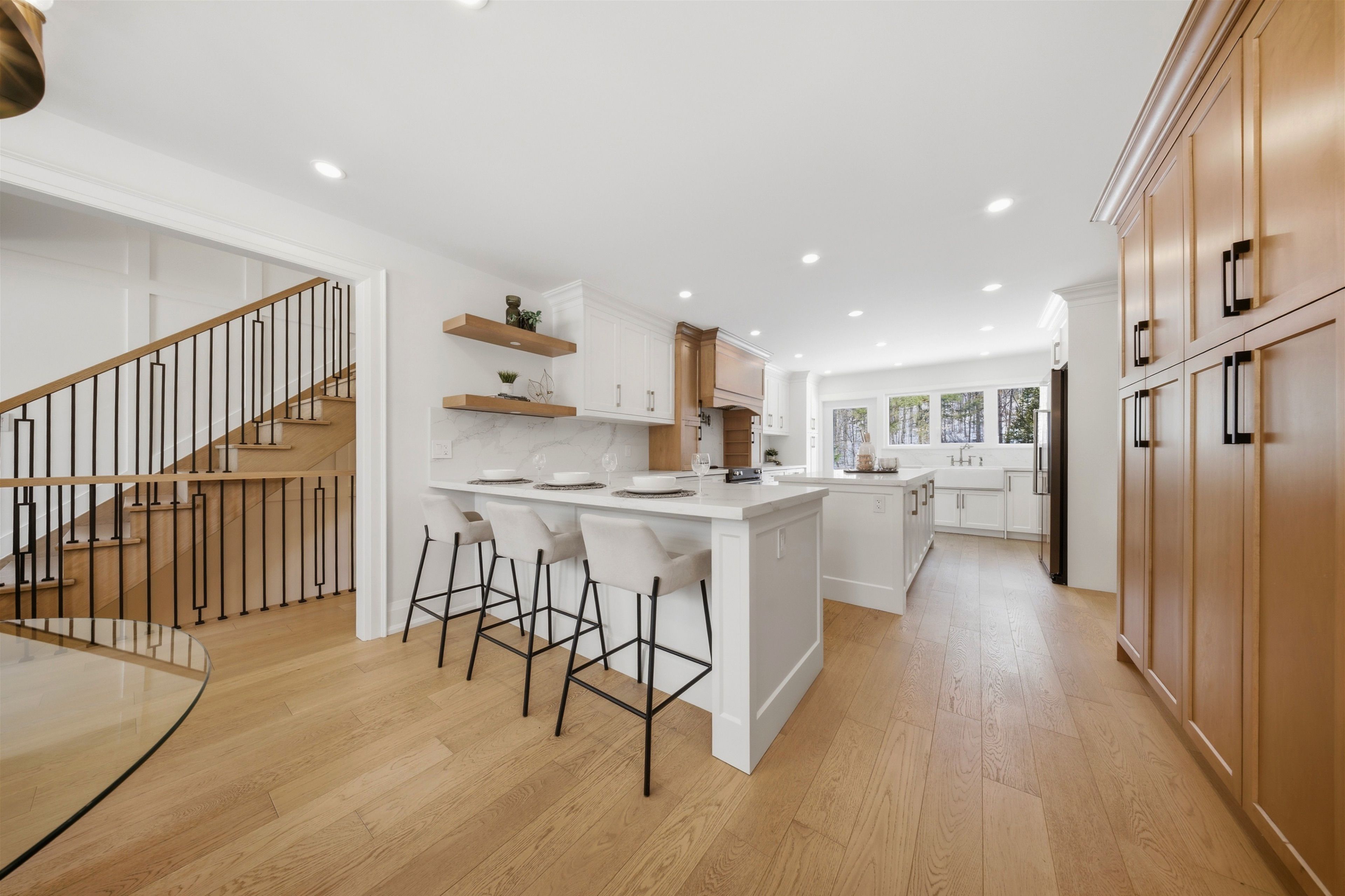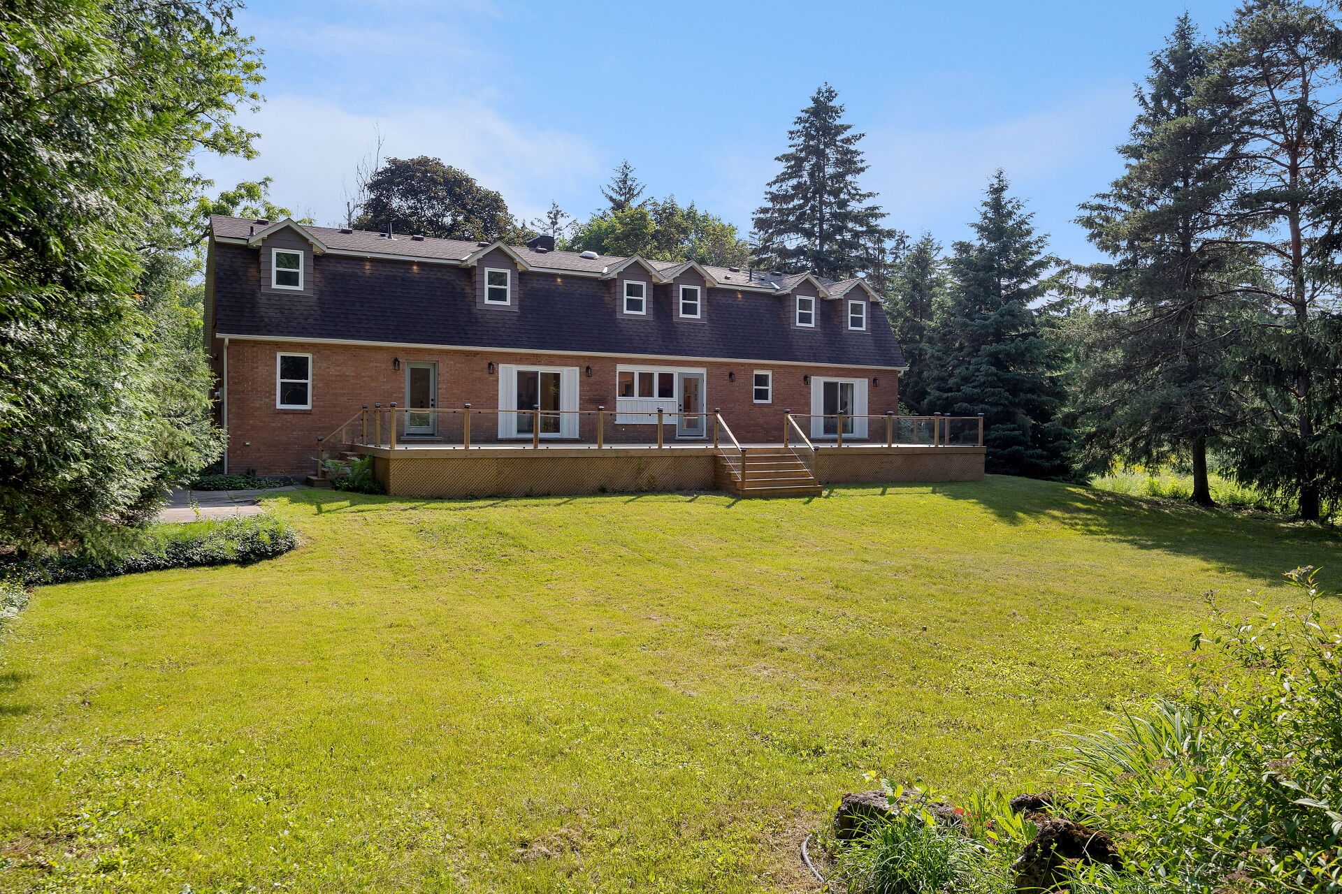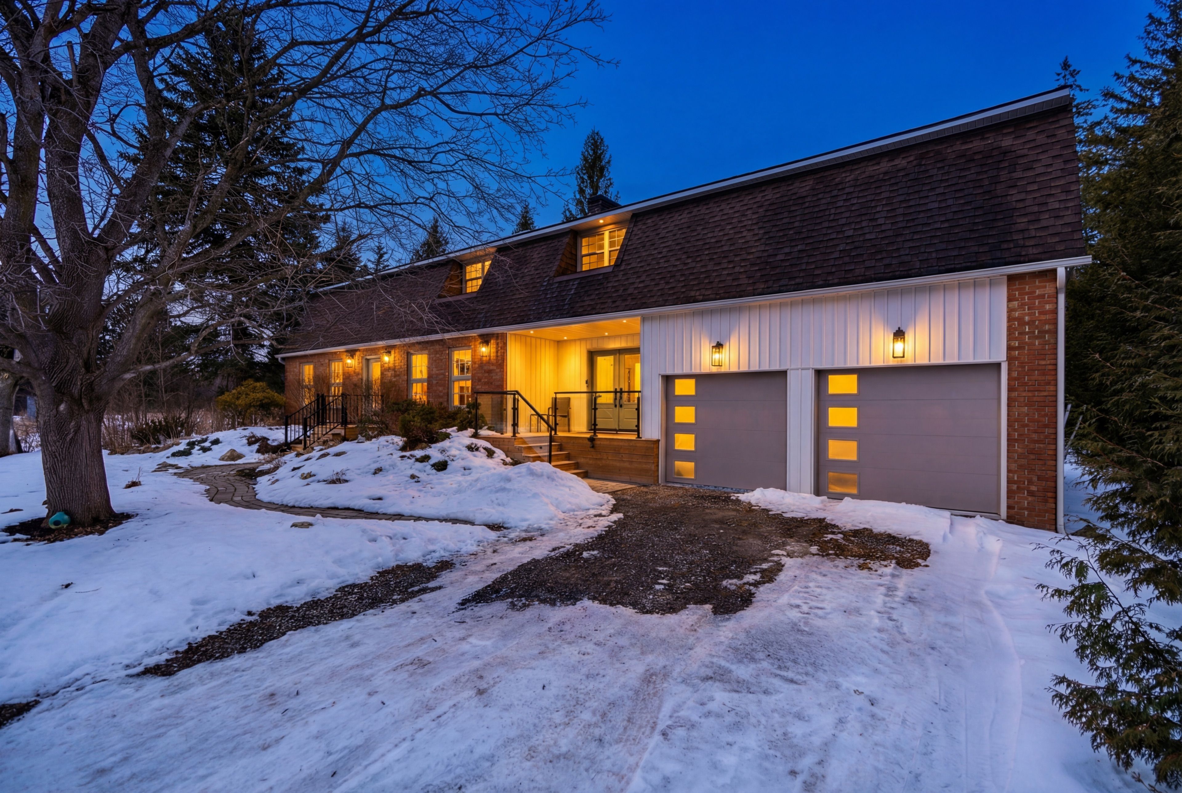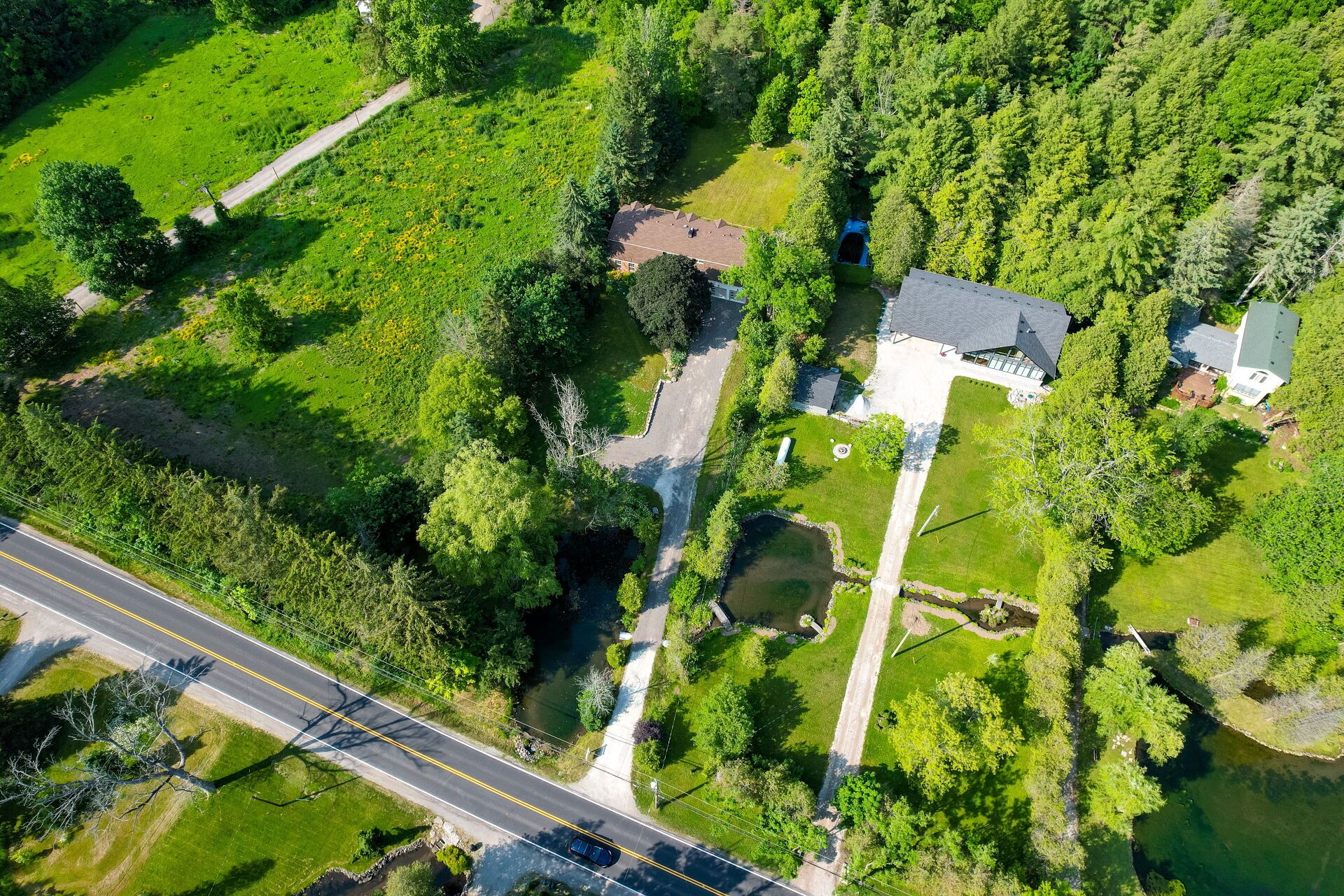 Welcome to this exceptional 5-bedroom estate offering over 6,000 sq. ft. of total refined living space, perfectly positioned on a breathtaking 3/4 acre property backing onto forest for ultimate privacy and serenity. Set well back from the road, this impressive residence delivers a true estate-like presence with a long approach and captivating natural surroundings. Inside, luxury and craftsmanship are showcased at every turn. The stunning chef's kitchen is a true showpiece, complete with quartz countertops, an oversized island, pot fillers, built-in refrigeration drawers, premium appliances, and custom cabinetry designed for both beauty and function. Ideal for entertaining, the expansive principal rooms flow seamlessly together, enhanced by elegant wall paneling, designer lighting, and an abundance of pot lights that create a warm yet sophisticated ambiance. The spacious bedrooms offer comfort and retreat, each featuring custom walk-in closets, while the primary suite elevates everyday living with spa-inspired finishes and elevated detailing. Every bathroom is appointed with heated floors, delivering everyday comfort and a true spa-like experience throughout the home. The exterior glass railings, and countless high-end upgrades throughout reflect thoughtful design and uncompromising quality. Adding to the home's charm and exclusivity, a picturesque creek with a tranquil pond runs across the front of the property, enhancing the natural beauty of the setting. Backing onto lush forest, this private oasis provides stunning views from every window. A seamless connection between indoor luxury and outdoor serenity. Cozy yet grand, elegant yet inviting, this is a rare opportunity to own a remarkable estate property where refined living meets breathtaking nature. Come and fall in love.