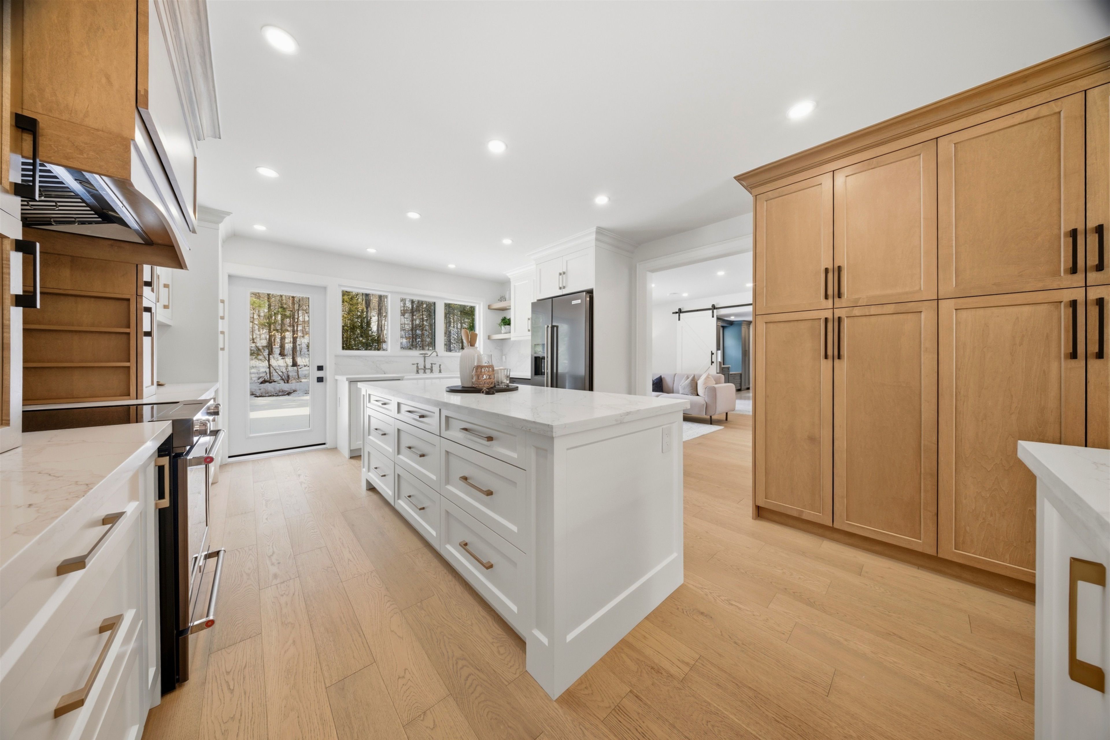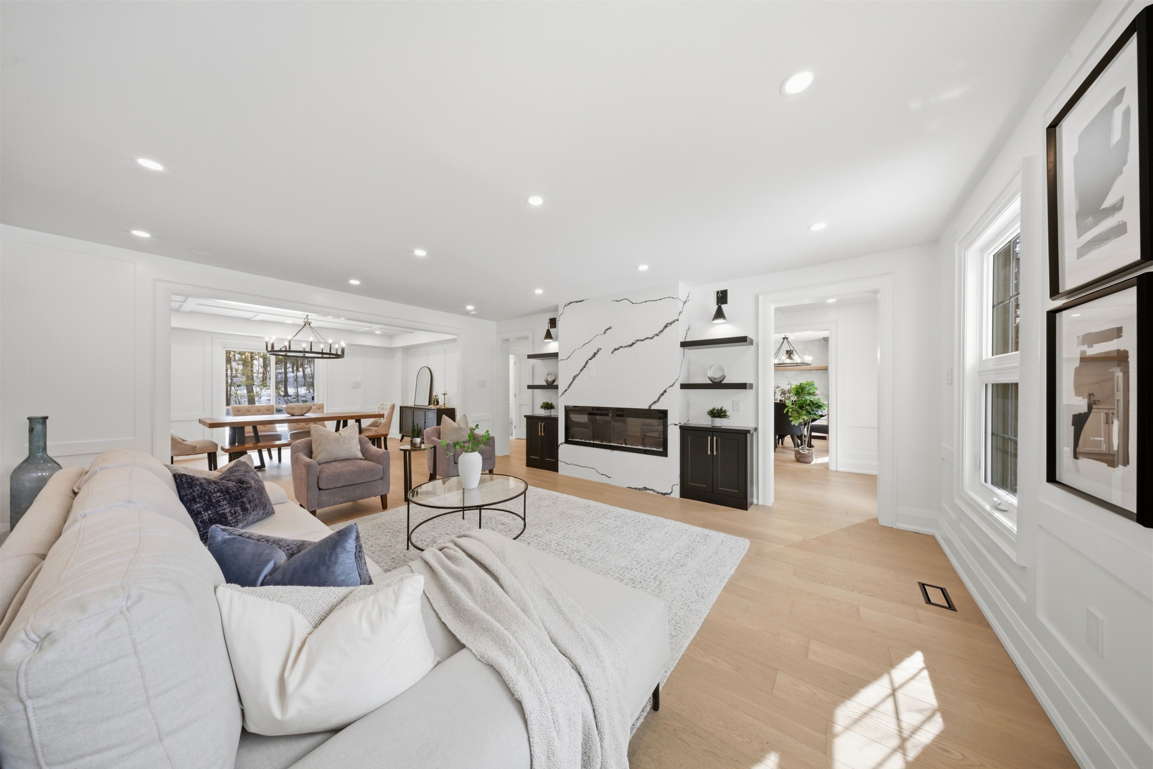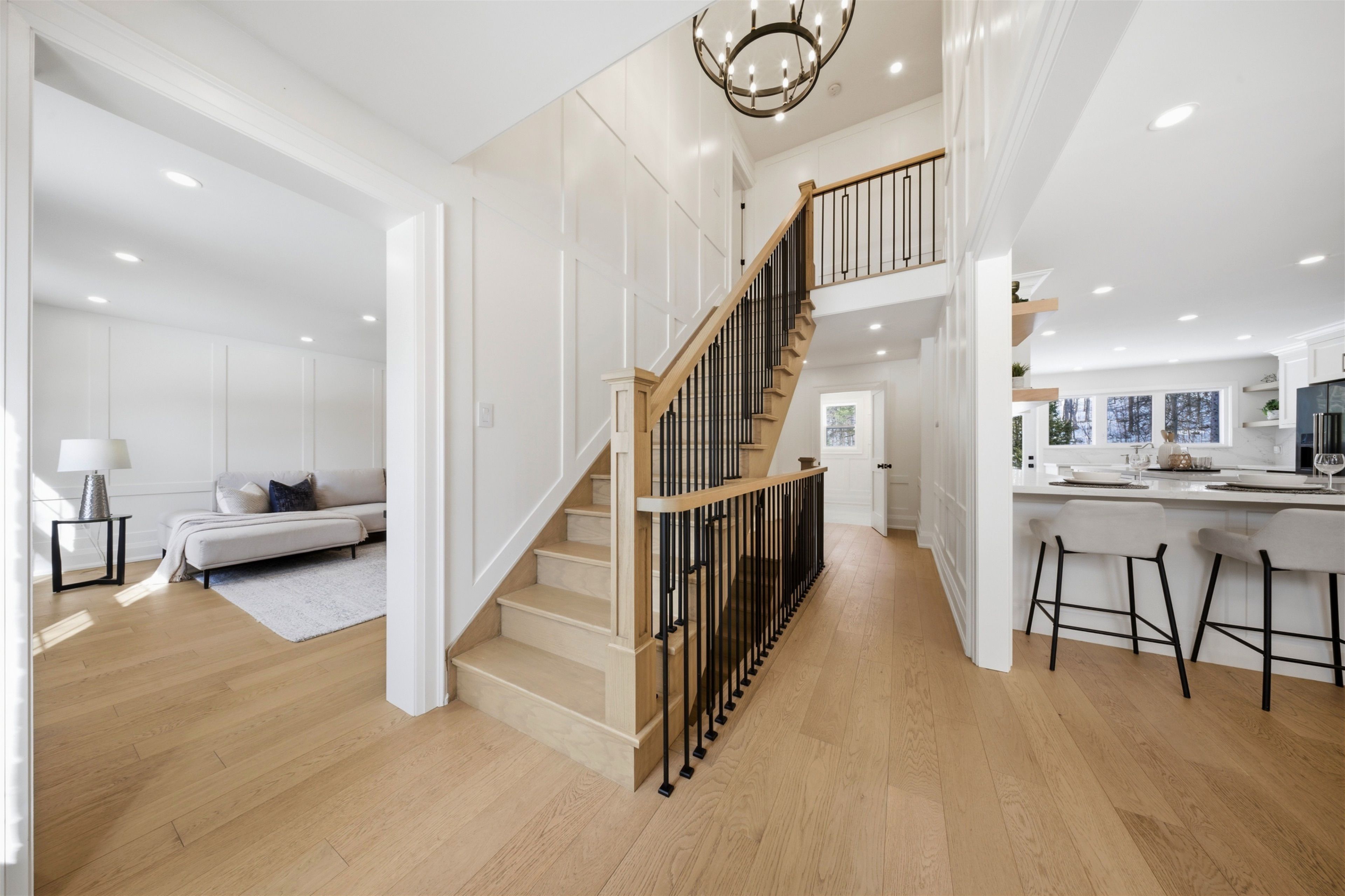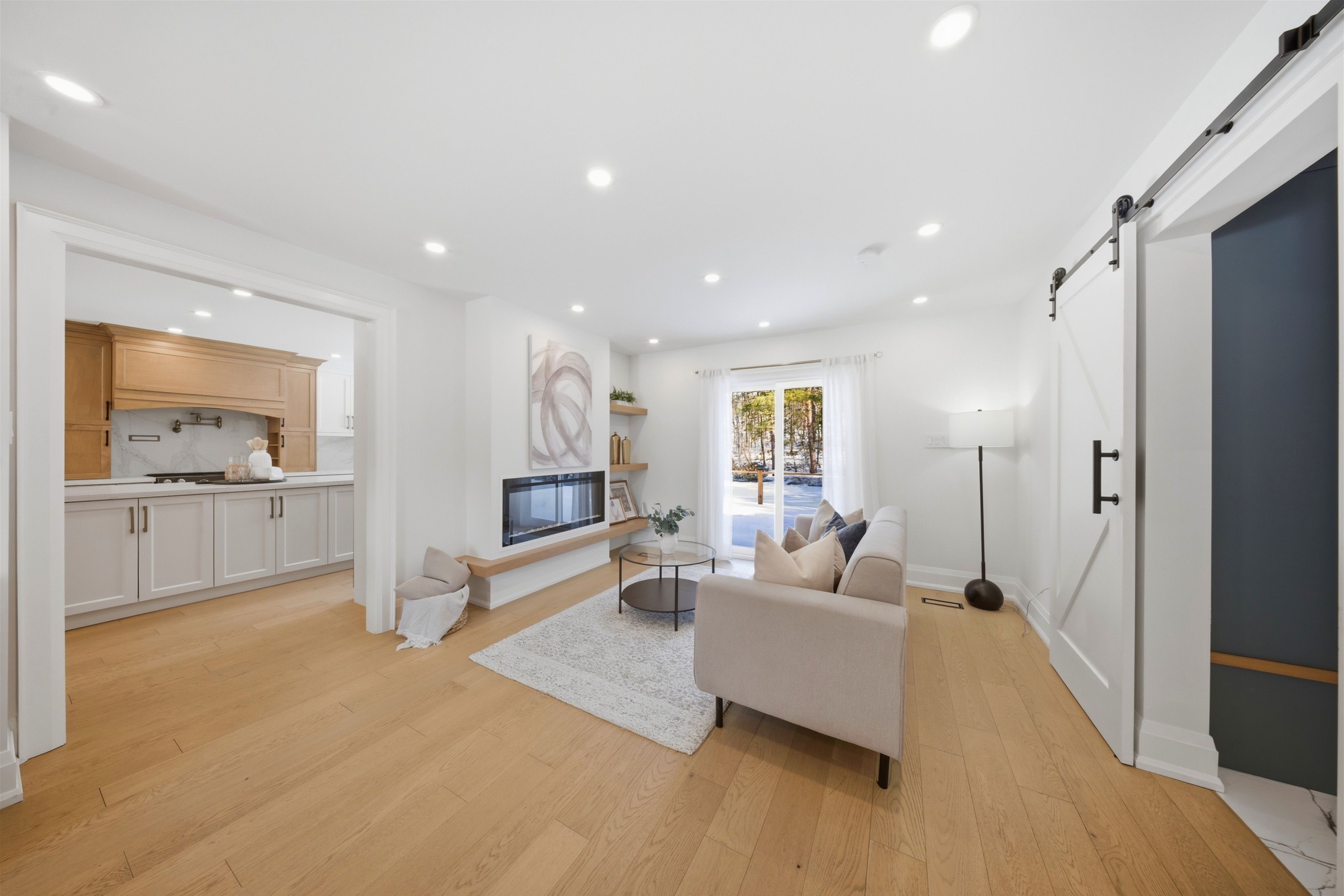 Welcome to this exceptional 5-bedroom estate offering over 6,000 sq. ft. of total refined living space, perfectly positioned on a breathtaking 3/4 acre property backing onto forest for ultimate privacy and serenity. Set well back from the road, this impressive residence delivers a true estate-like presence with a long approach and captivating natural surroundings. Inside, luxury and craftsmanship are showcased at every turn. The stunning chef's kitchen is a true showpiece, complete with quartz countertops, an oversized island, pot fillers, built-in refrigeration drawers, premium appliances, and custom cabinetry designed for both beauty and function. Ideal for entertaining, the expansive principal rooms flow seamlessly together, enhanced by elegant wall paneling, designer lighting, and an abundance of pot lights that create a warm yet sophisticated ambiance. The spacious bedrooms offer comfort and retreat, each featuring custom walk-in closets, while the primary suite elevates everyday living with spa-inspired finishes and elevated detailing. Every bathroom is appointed with heated floors, delivering everyday comfort and a true spa-like experience throughout the home. The exterior glass railings, and countless high-end upgrades throughout reflect thoughtful design and uncompromising quality. Adding to the home's charm and exclusivity, a picturesque creek with a tranquil pond runs across the front of the property, enhancing the natural beauty of the setting. Backing onto lush forest, this private oasis provides stunning views from every window. A seamless connection between indoor luxury and outdoor serenity. Cozy yet grand, elegant yet inviting, this is a rare opportunity to own a remarkable estate property where refined living meets breathtaking nature. Come and fall in love.