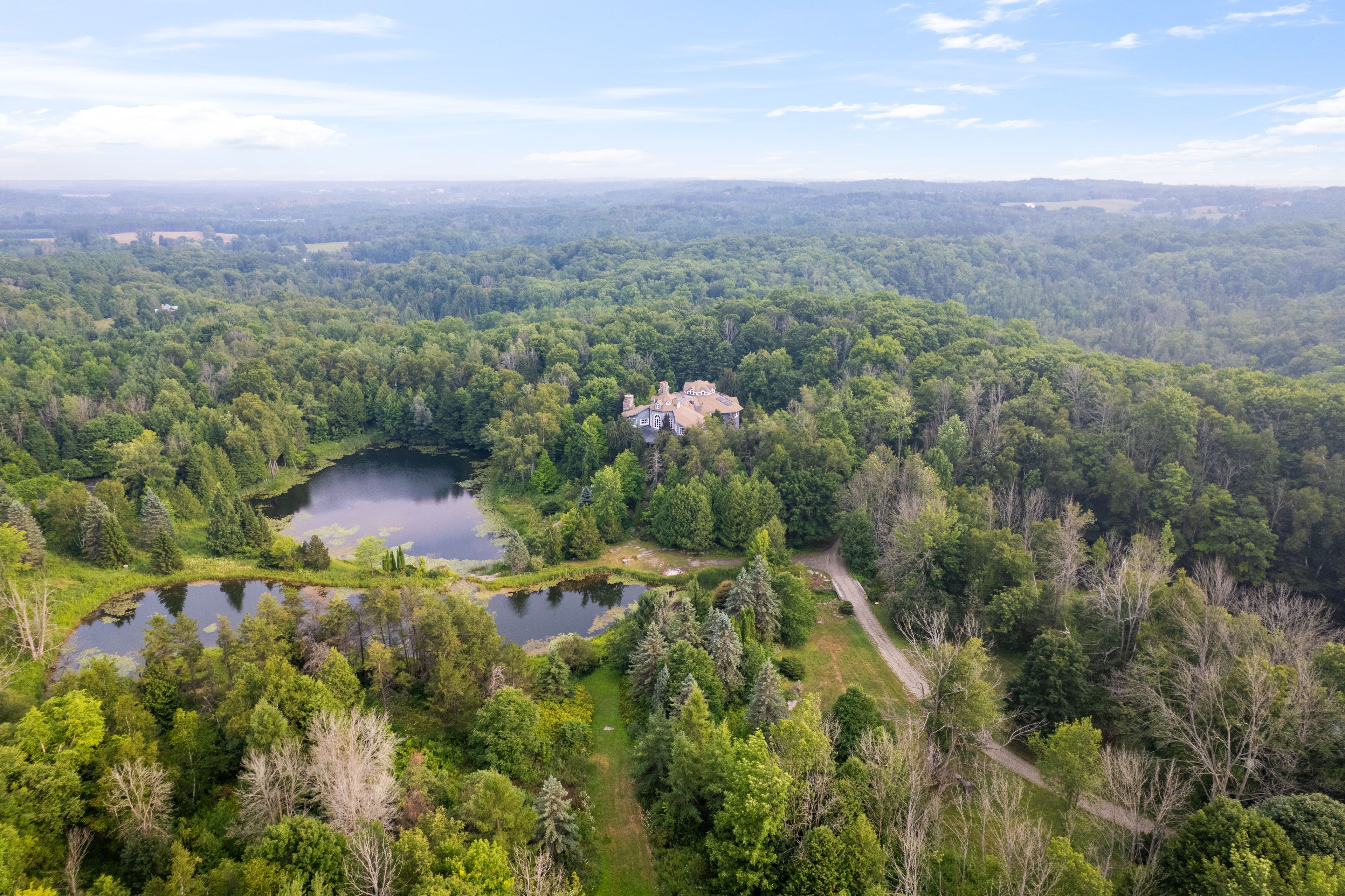 Welcome to 9 Flaherty Lane, a breathtaking custom estate nestled on over 10.6 acres in one of Caledon's prestigious enclaves and backing onto 50 acres of conservation land. Spanning over 13,500 square feet above grade and over 20,000 square feet total, this residence offers homeowners unmatched luxury, privacy, and scale. Inside, 5 prodigious bedrooms reside, each with its own ensuites, including a mesmerizing Owners' suite with his and her ensuites and a private guest bedroom in the lower level. Soaring ceiling heights are found across all 3 levels and range from 10 ft to 21ft, with 3 open to the above living areas. Both warm and inviting, this home attracts an abundance of natural light via the bespoke solarium and sunroom. As you make your way through this lovely home, signature features are found, including a 2-level mahogany library with an enchanting spiral staircase, a home theatre, a retro 50's inspired diner, a 5-car garage, multiple fireplaces, 9 geothermal heating and cooling systems, and a gourmet kitchen with a 60" Wolf gas cooktop and oven. Winning "North America's Best Pool" award in 1997, the indoor pool is truly a space where loved ones can gather and enjoy all year round. The serene outdoors offers just as much as the inside, with a spring fed 1 acre pond, a gazebo, a large designer patio with custom railing overlooking the water, and ample green space to host large social gatherings. This home is an absolute must see and offers a rare high-capacity well pumping 120 liters of water per minute, as well as an oversized septic tank and a new roof completed in 2024. With 16 interior and exterior cameras operated through Telus, security here is top-tier! Built to the highest standards using custom-made materials, this estate offers a rare blend of elegance and resort-style living. Whether hosting on a grand scale or seeking a private retreat, 9 Flaherty Lane delivers an extraordinary lifestyle!
