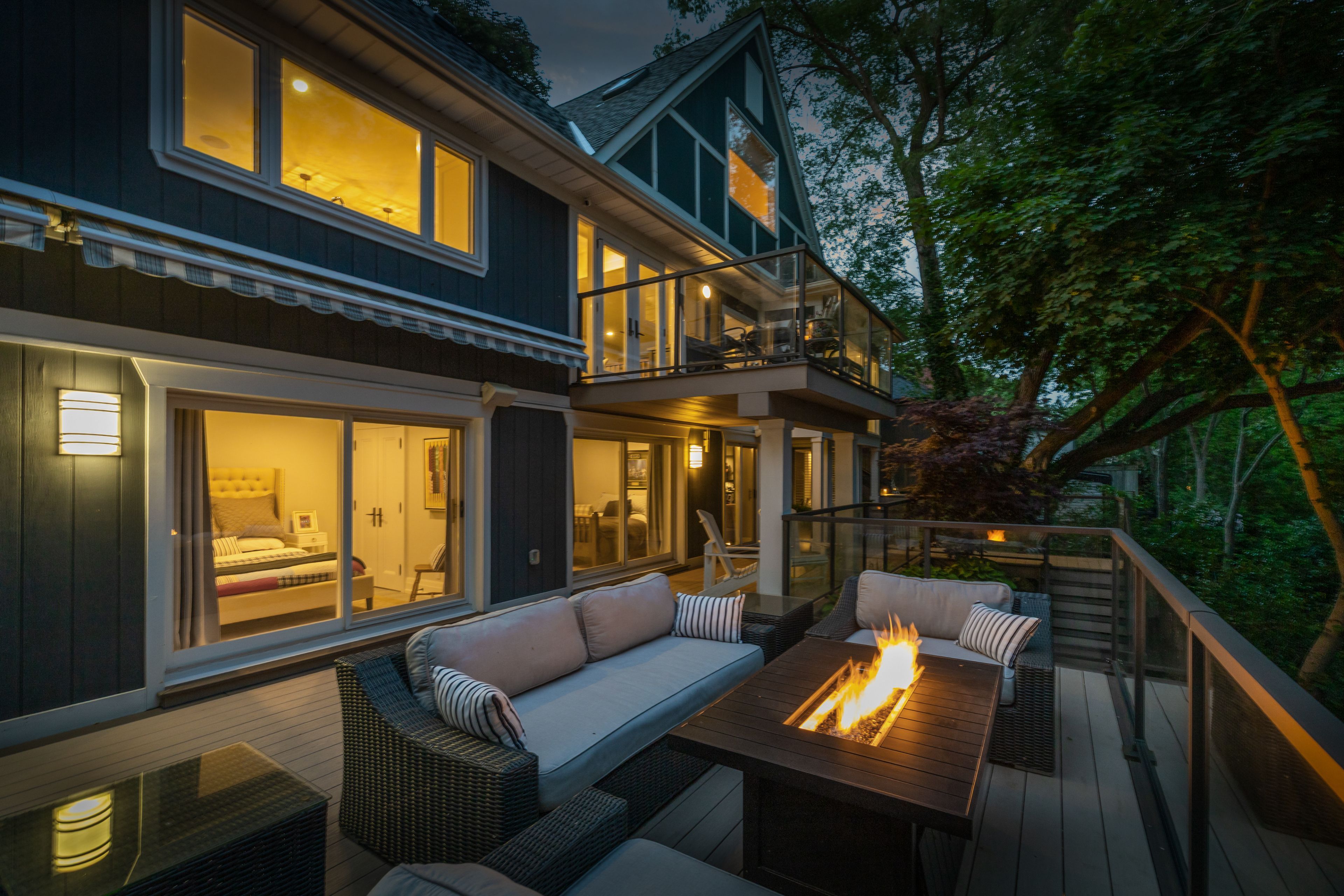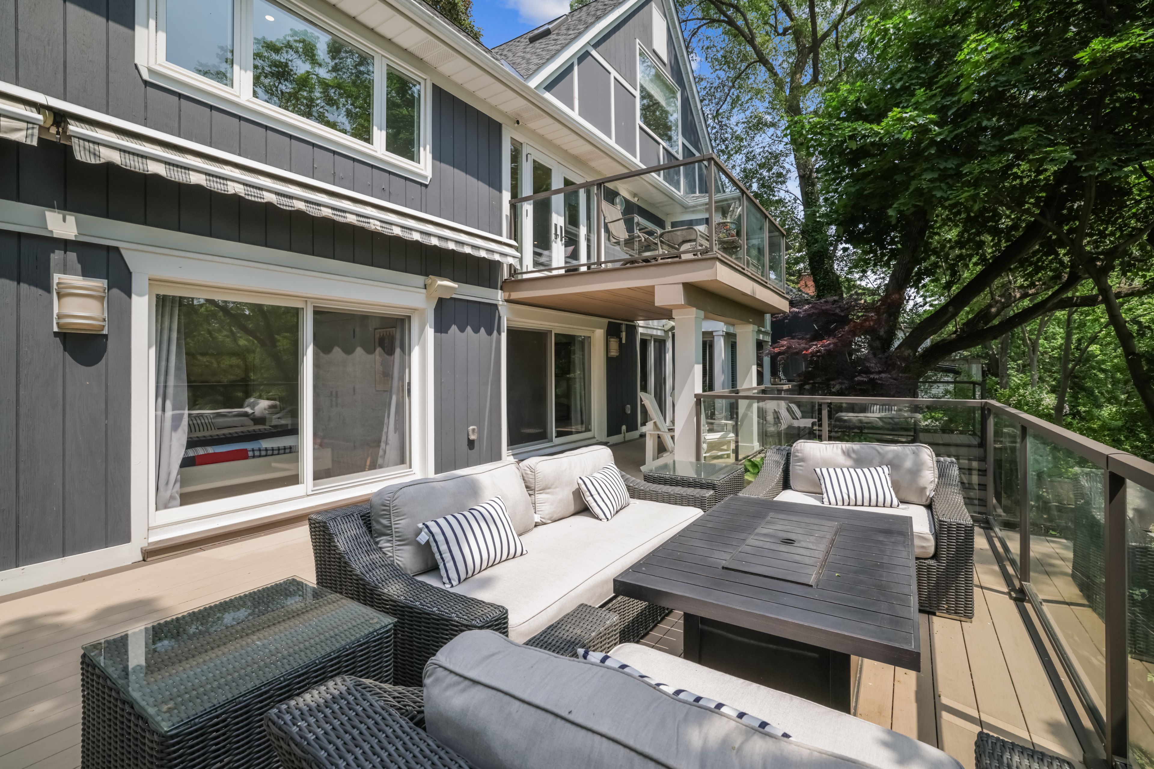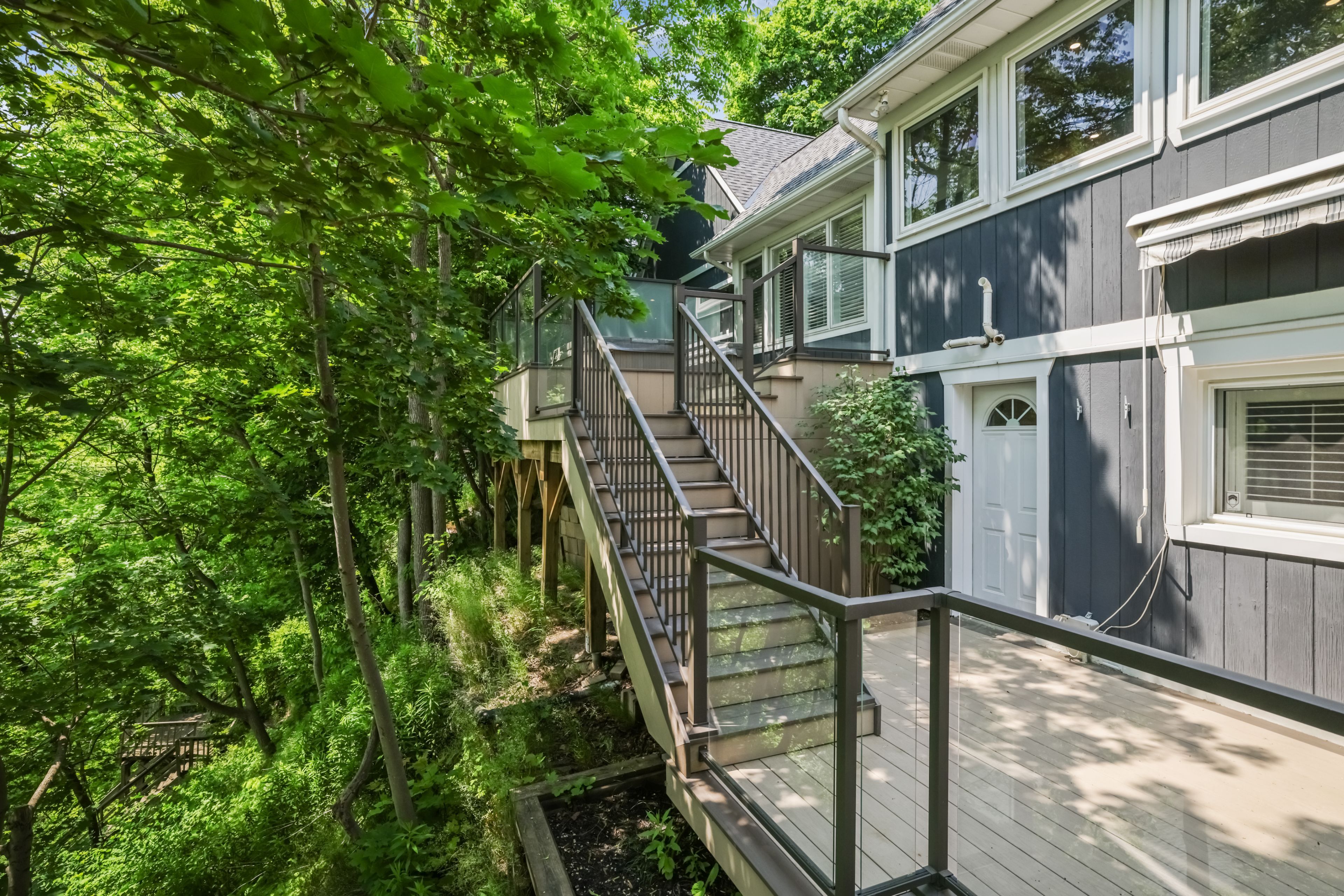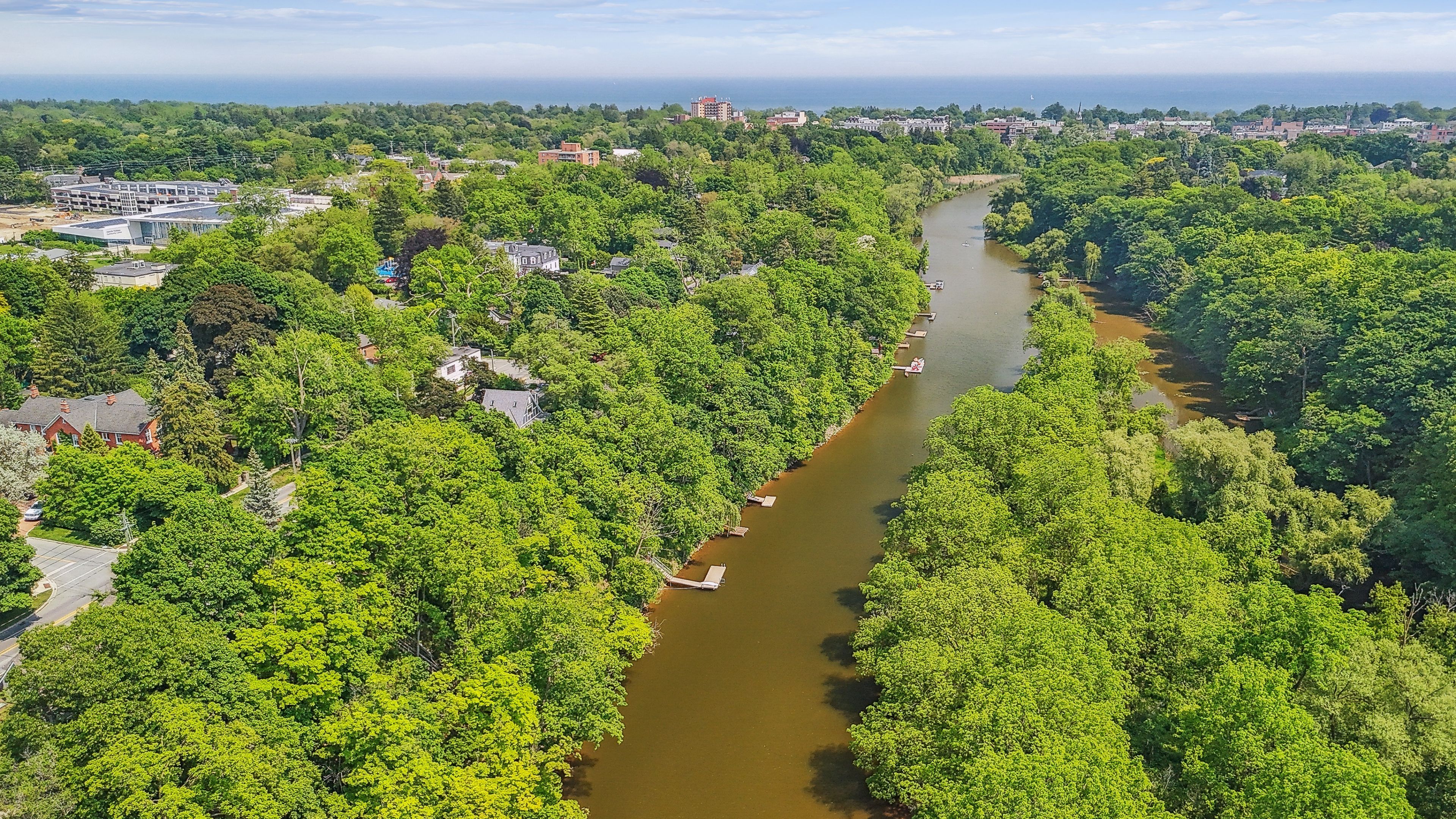 Private, elevated, and unlike anything else in Old Oakville - A true four-season outdoor retreat, your private playground for the outdoor enthusiast-where each day invites skating, paddling, kayaking, hiking, fishing, boating and cross-country skiing, alongside wildlife watching and refined al fresco dining, embracing nature in all its seasons. This lofted waterfront residence commands breathtaking views and unmatched privacy along the tranquil 16 Mile Creek. A testament to craftsmanship and design, this waterfront retreat boasts exclusive riparian rights and a private dock, inviting you to embrace the beauty of Oakville's scenic waterways year-round. .A meticulous 2016 renovation elevated this residence with rich hand-scraped oak floors, solid wood doors, custom millwork, and elegant tray ceilings. The sprawling 1,700 sq. ft. premium Wolf PVC deck includes a hot tub oasis, integrated fire table, and motorized awnings, leading to a dock with a kayak launch, swim ladder, and floating dock. Glass-encased staircases on helical piers deliver striking architectural presence and unbroken sight lines to the creek. Inside, sophistication defines every detail. Floor-to-ceiling windows in the living room frame stunning ravine views and dramatic sunsets, while a gas fireplace with a live-edge mantel adds warmth. The chef's kitchen impresses with a leathered Taj Mahal quartzite island, Wolf and Miele appliances, and an integrated Sub-Zero fridge. Heated floors run throughout, including in the spa-like primary ensuite with marble floors, a rain shower, and double vanity. The lower level offers a linear fireplace, built-in bar, and walkout to the deck. A concrete-lined storage room playfully known as the Bomb Shelter provides additional functionality. Blending natural beauty, refined design, and year-round outdoor living, this one-of-a-kind property is just steps to downtown Oakville and the GO Train offering luxury, serenity, and convenience in equal measure.