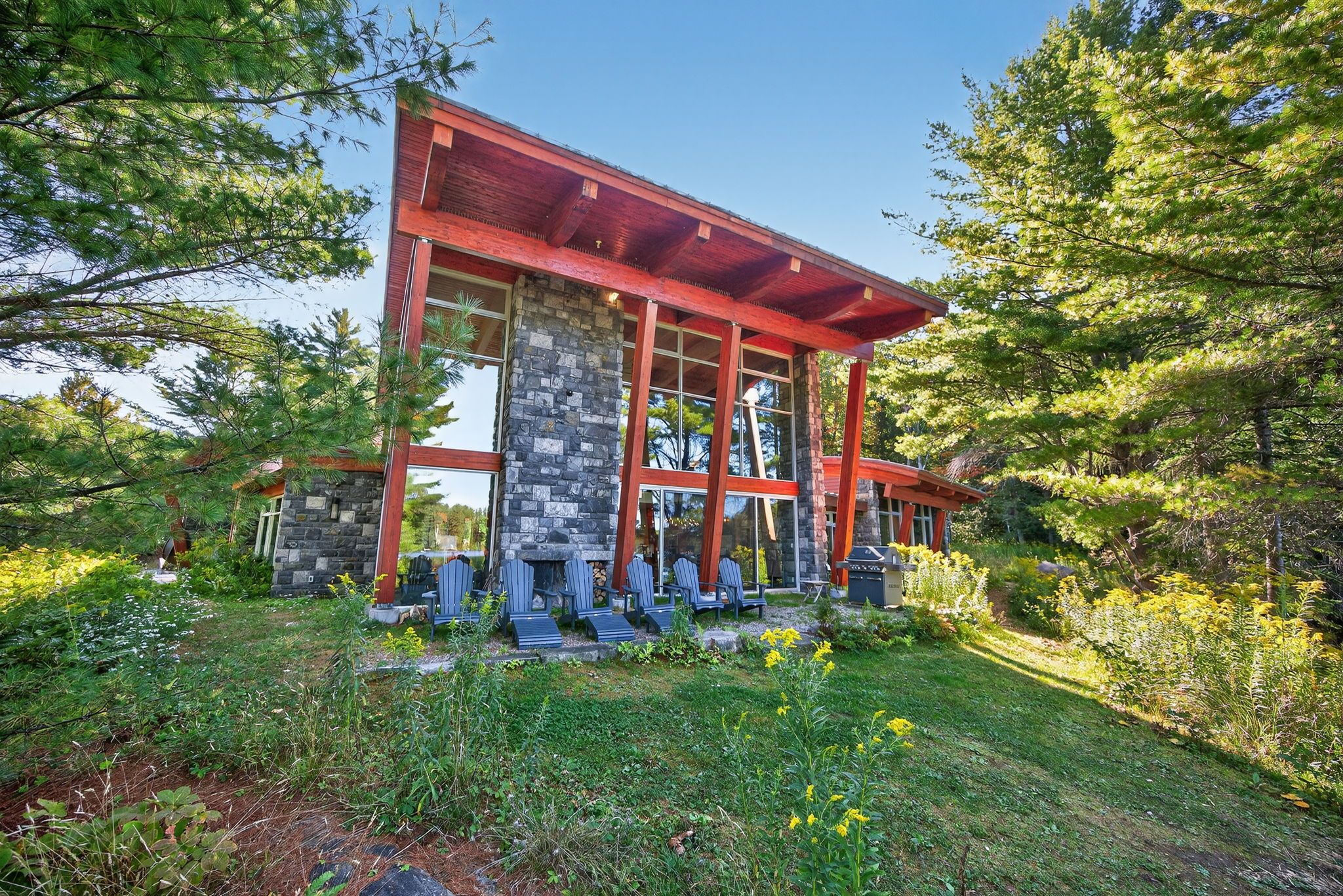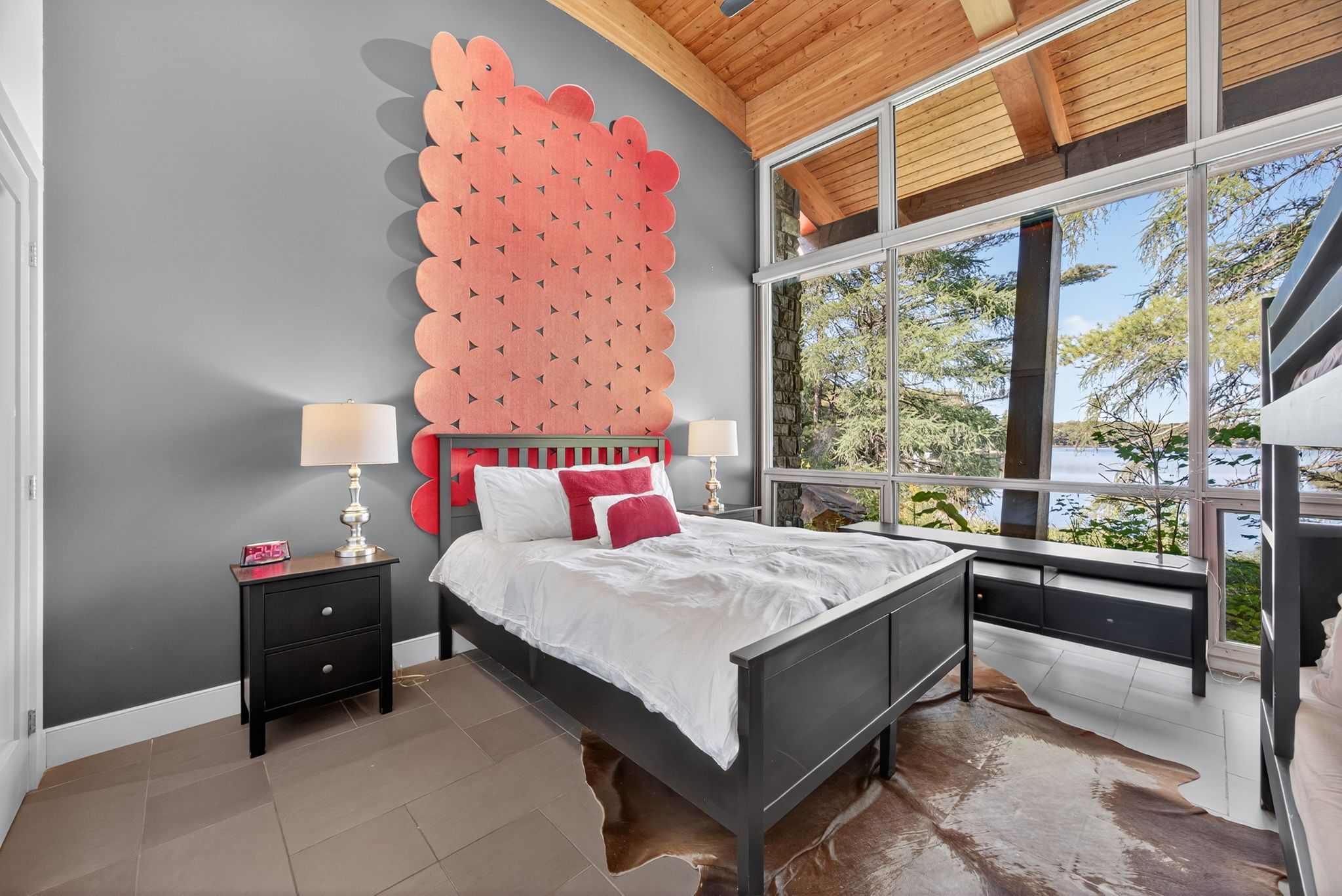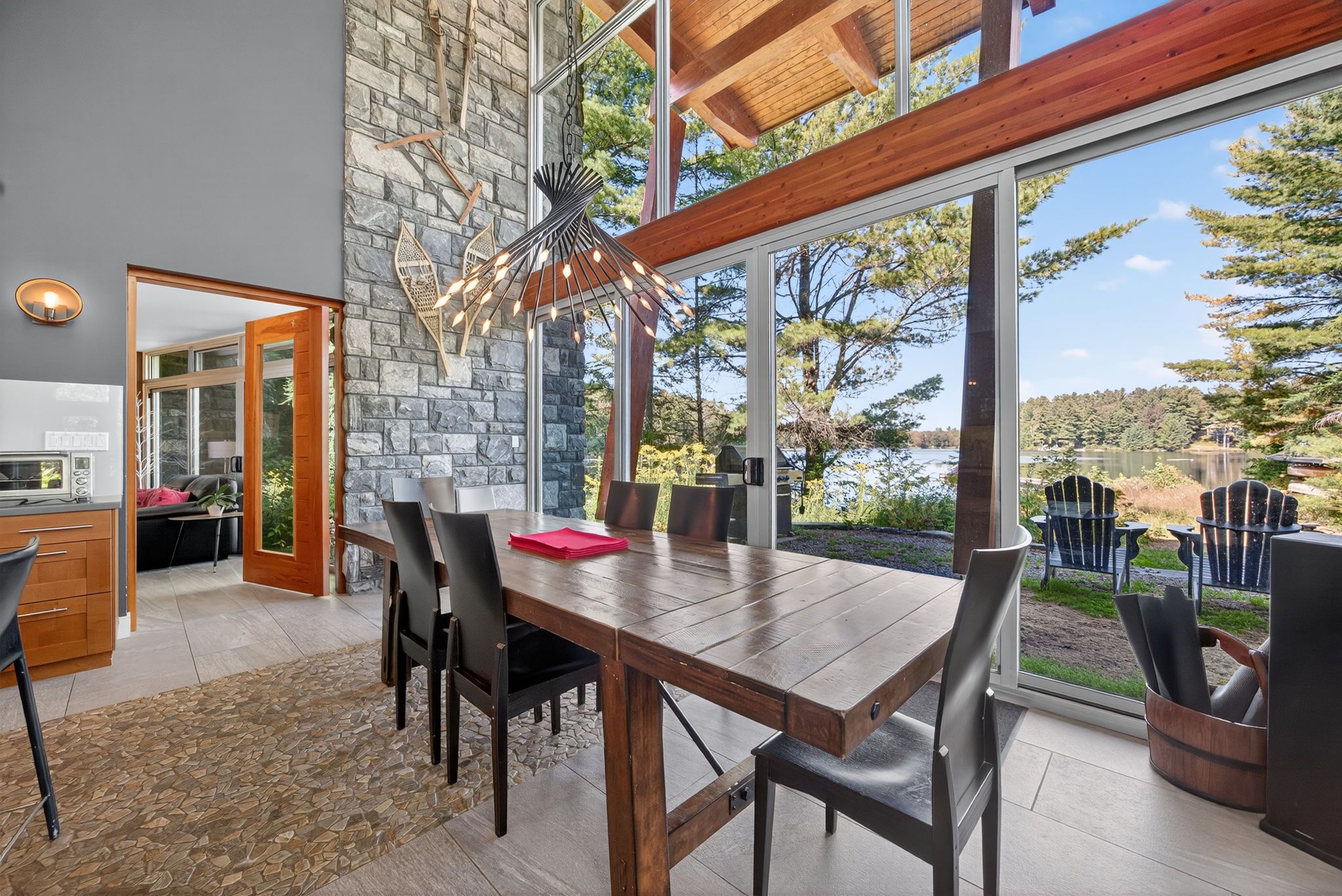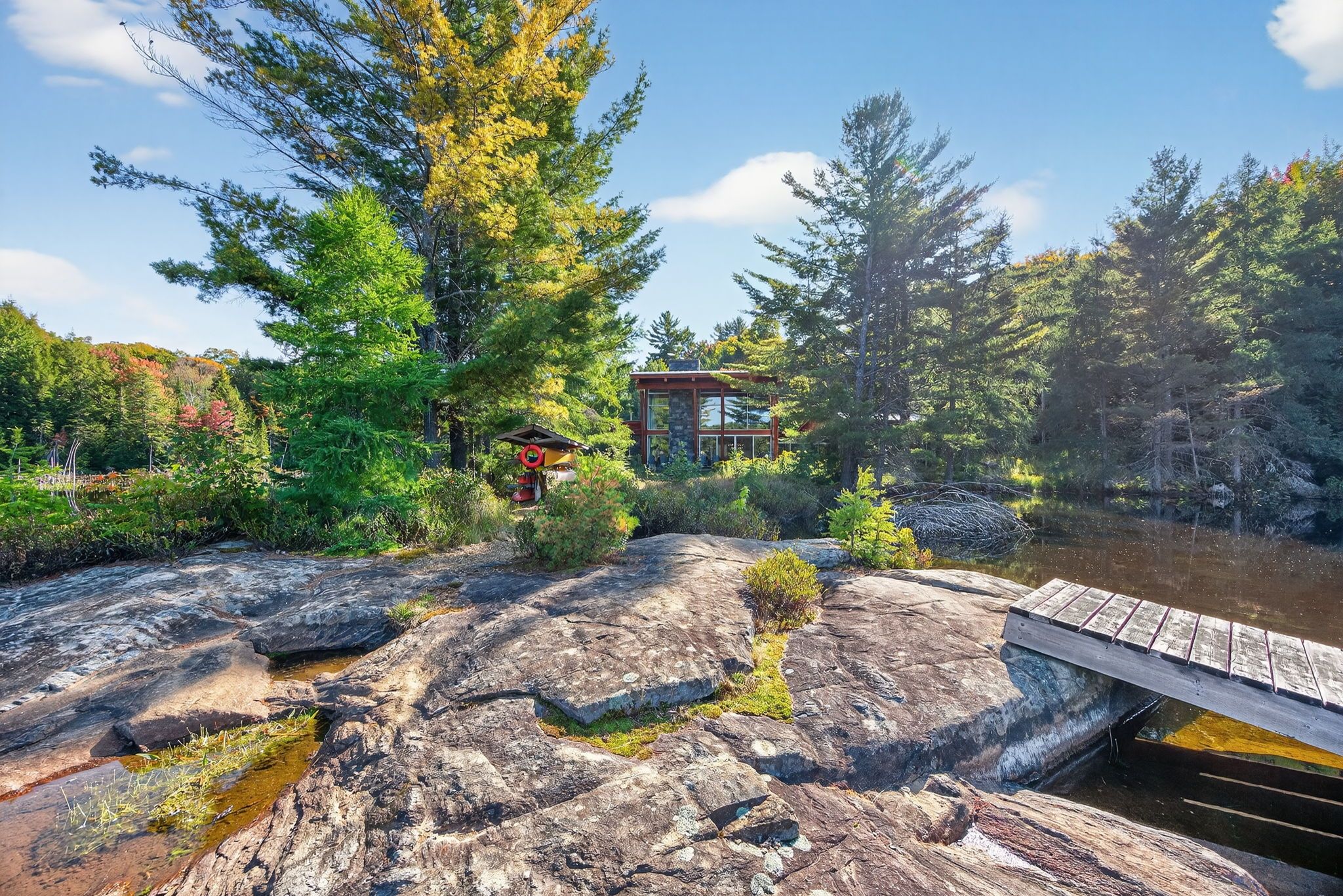 Welcome to "Serenity," an architect-designed, turn-key, four-season retreat on the crystal waters of Otter Lake. This extraordinary property rests on an 11.93-acre point with 1,771 ft of natural shoreline, offering unmatched privacy, breathtaking views, & a deep connection to Muskoka's rugged beauty, all just 10 mins from Huntsville's amenities. Approach via a winding granite lane that opens to the entrance courtyard, where the home's sweeping rooflines, hand-cut granite, & walls of glass reveal glimpses of the lake & Serenity Bay. Inside, the soaring 25-ft great room makes a dramatic impression with floor-to-ceiling windows, a granite Rumford fireplace, & a wall of glass that opens to the lakeside terrace. The open-concept chef's kitchen, dining room, & great room are designed for effortless entertaining. The kitchen showcases a 12-ft Brazilian granite island, gas cooktop, & stainless steel appliances. Host unforgettable dinners surrounded by nature, with sliding doors that extend the living space to a covered terrace, perfect for lakeside dining, sunrise coffee, or fireside evenings under the stars. A separate family room provides a cozy retreat, ideal for games, TV, or curling up with a book, with sliding doors that invite the outdoors in year-round. The primary wing is a private sanctuary featuring a Scandinavian wood stove, walk-through closet, motorized blinds, & a spa-like ensuite with pebble wall & rain shower. Two additional lake-view bedrooms & a stylish 4-pc bath complete the west wing. Upstairs, a loft offers a fourth bedroom with an ensuite, overlooks the great room with sweeping lake views, & includes space for ping-pong or yoga. A cedar path leads to the shoreline, offering multiple seating areas, a steel fire pit set on the rock, a dock for swimming, diving, or tranquil paddles. Hear the call of the loon as it drifts across mirror-like waters, capturing the essence of a true Muskoka escape on this motor-free lake.
