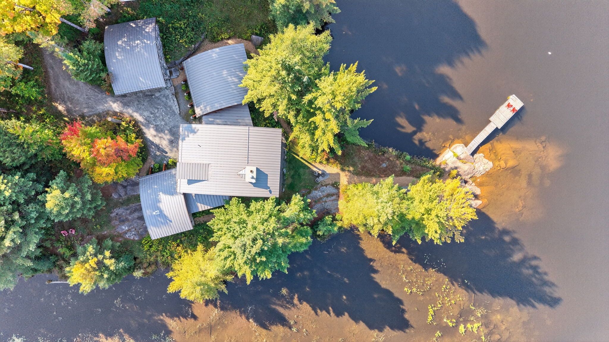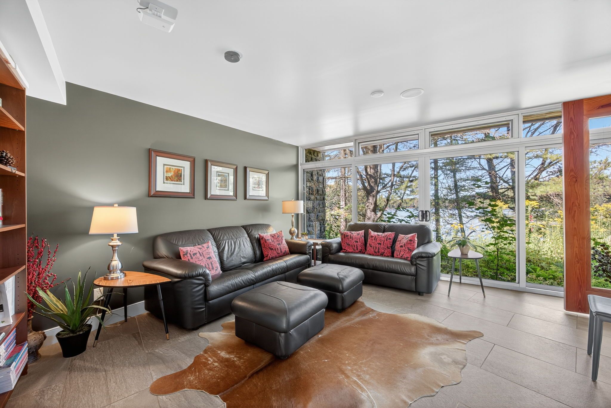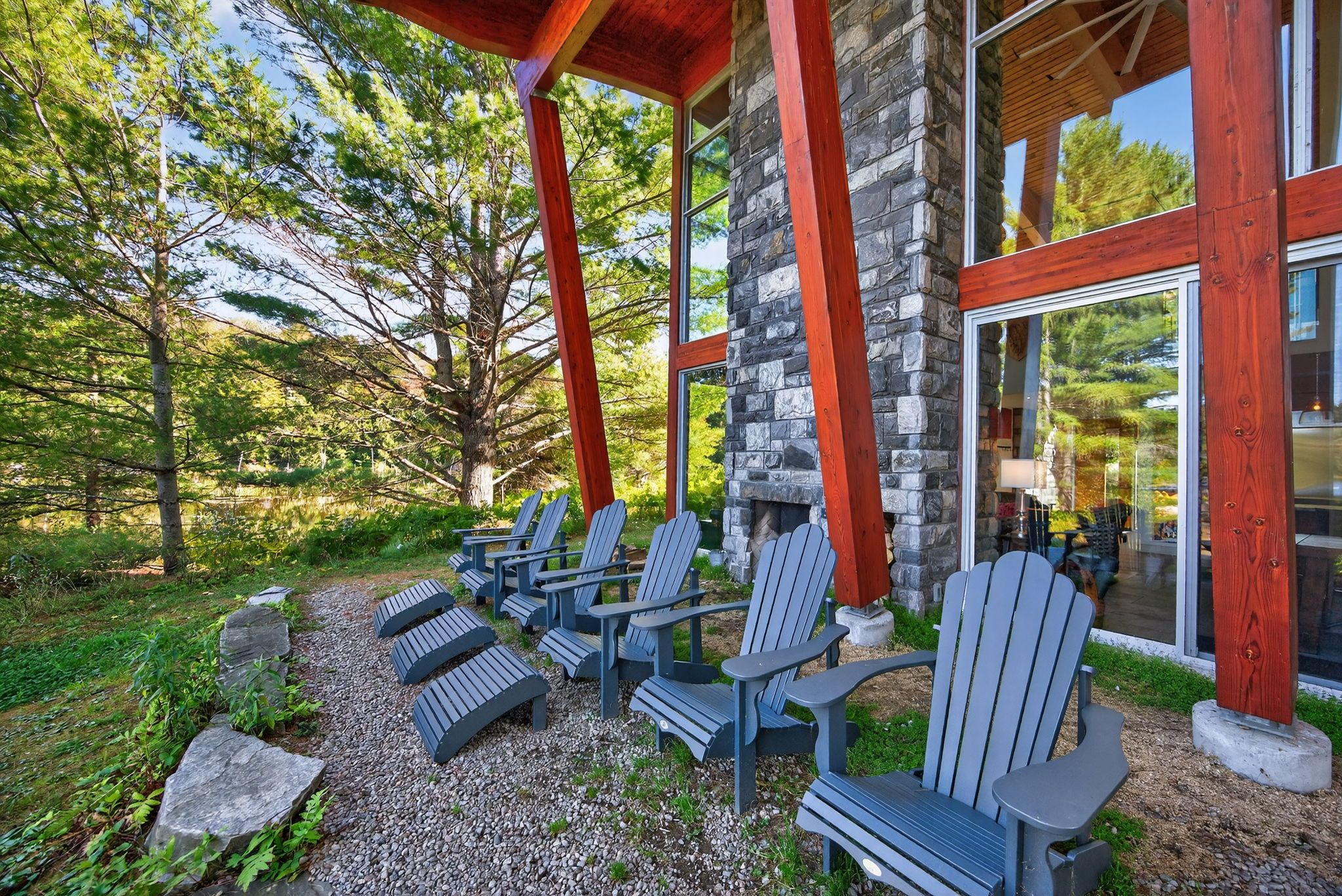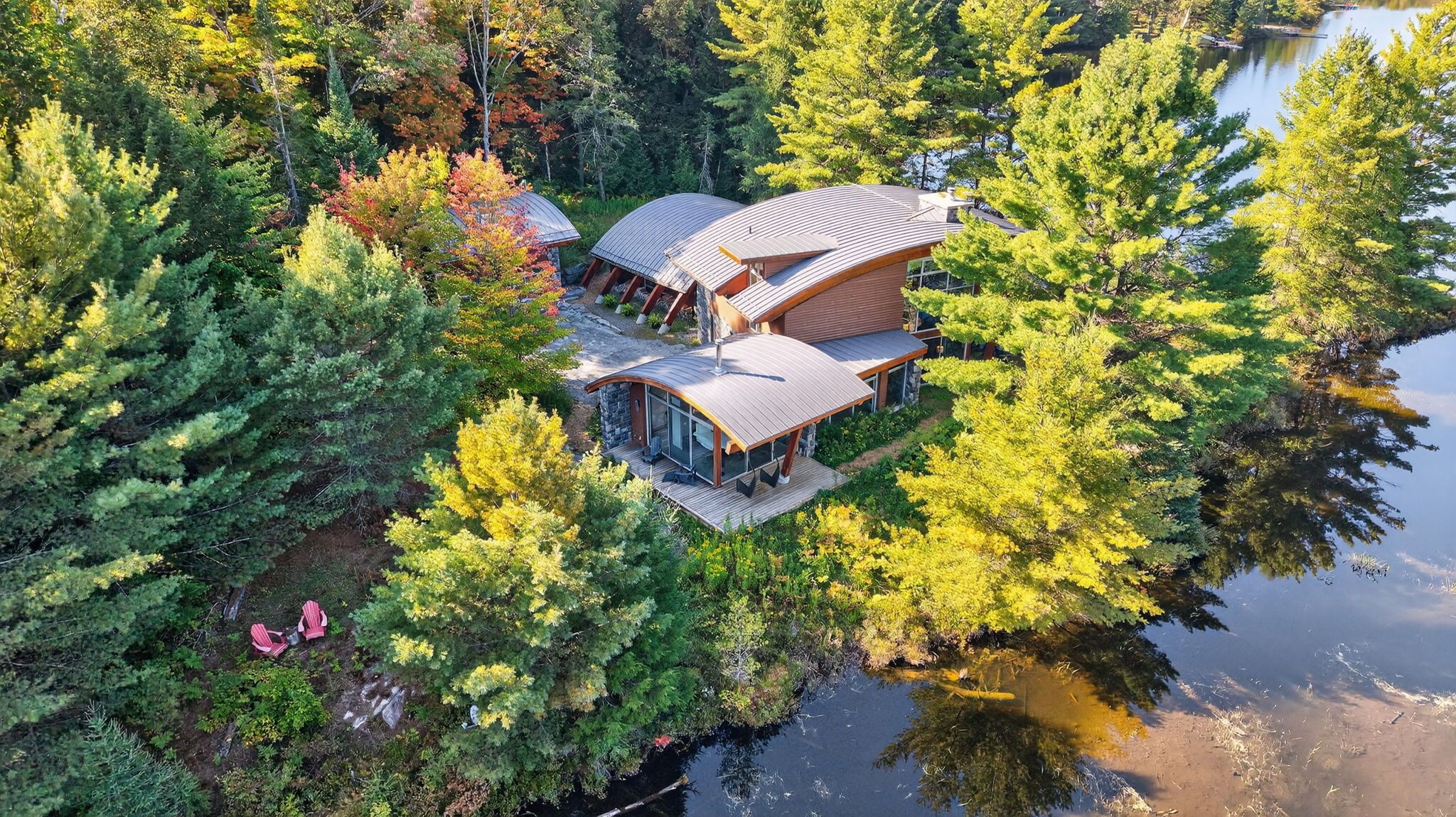 Welcome to "Serenity," an architect-designed, turn-key, four-season retreat on the crystal waters of Otter Lake. This extraordinary property rests on an 11.93-acre point with 1,771 ft of natural shoreline, offering unmatched privacy, breathtaking views, & a deep connection to Muskoka's rugged beauty, all just 10 mins from Huntsville's amenities. Approach via a winding granite lane that opens to the entrance courtyard, where the home's sweeping rooflines, hand-cut granite, & walls of glass reveal glimpses of the lake & Serenity Bay. Inside, the soaring 25-ft great room makes a dramatic impression with floor-to-ceiling windows, a granite Rumford fireplace, & a wall of glass that opens to the lakeside terrace. The open-concept chef's kitchen, dining room, & great room are designed for effortless entertaining. The kitchen showcases a 12-ft Brazilian granite island, gas cooktop, & stainless steel appliances. Host unforgettable dinners surrounded by nature, with sliding doors that extend the living space to a covered terrace, perfect for lakeside dining, sunrise coffee, or fireside evenings under the stars. A separate family room provides a cozy retreat, ideal for games, TV, or curling up with a book, with sliding doors that invite the outdoors in year-round. The primary wing is a private sanctuary featuring a Scandinavian wood stove, walk-through closet, motorized blinds, & a spa-like ensuite with pebble wall & rain shower. Two additional lake-view bedrooms & a stylish 4-pc bath complete the west wing. Upstairs, a loft offers a fourth bedroom with an ensuite, overlooks the great room with sweeping lake views, & includes space for ping-pong or yoga. A cedar path leads to the shoreline, offering multiple seating areas, a steel fire pit set on the rock, a dock for swimming, diving, or tranquil paddles. Hear the call of the loon as it drifts across mirror-like waters, capturing the essence of a true Muskoka escape on this motor-free lake.