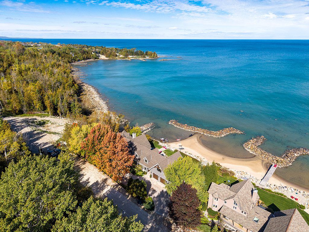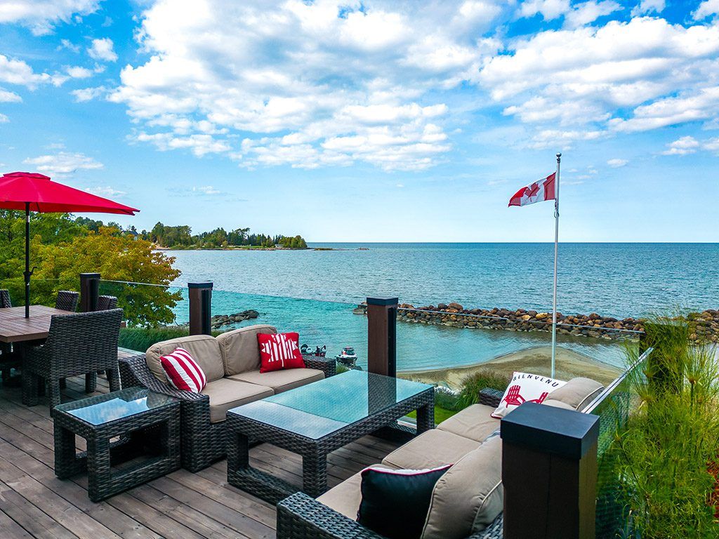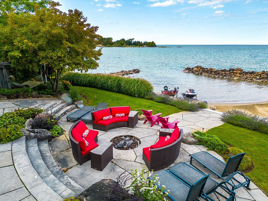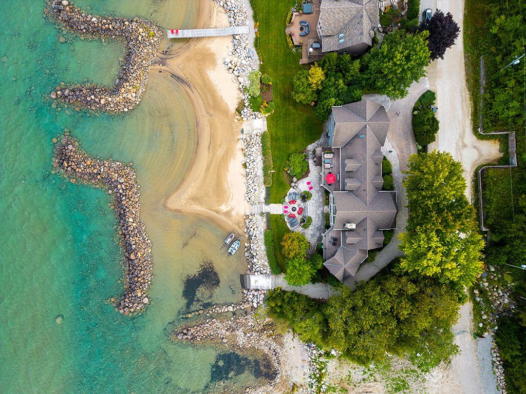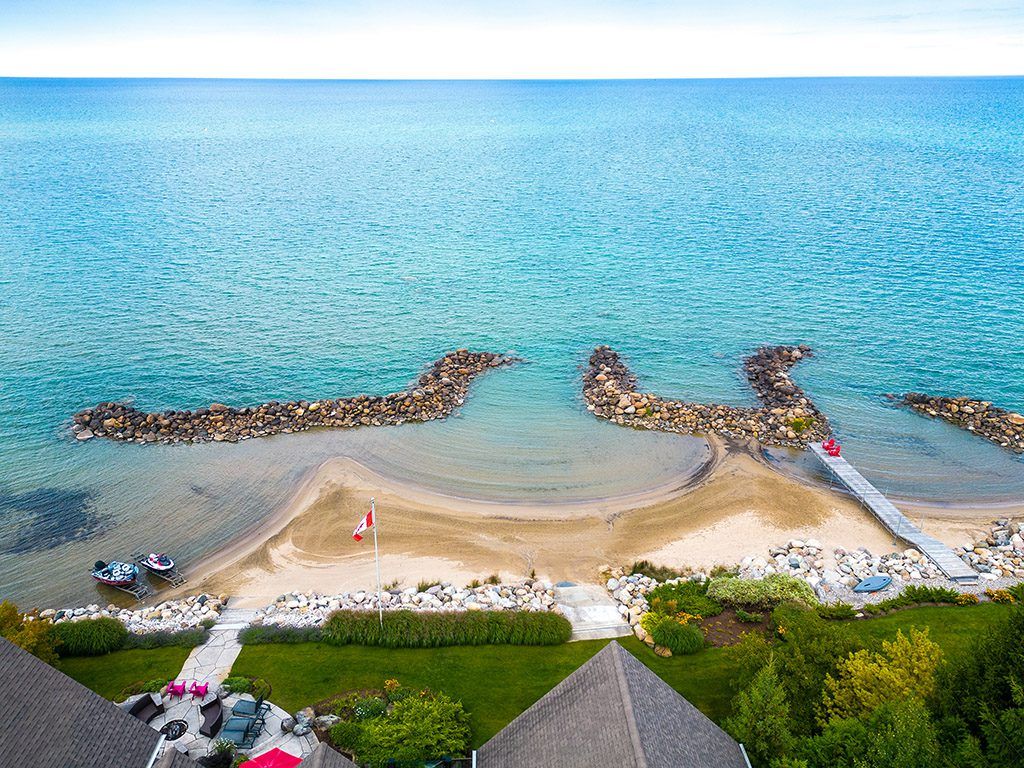 An Exclusive 200ft Sandy Shoreline Retreat on Lake Drive, Thornbury. Discover the ultimate waterfront sanctuary, where 200ft of rare sandy beach meets the sparkling blue of Georgian Bay. In a region known for its rocky shoreline, this remarkable stretch of sand offers an unmatched setting for swimming, paddle boarding, and boating all just minutes from downtown Thornbury and nearby private ski and golf clubs.Spanning over 7,500 sq. ft., this exceptional custom home is designed for gathering family and friends in comfort and style. The vaulted 26ft ceilings in the great room with exposed beams, floor-to-ceiling windows, and a grand Rumford fireplace captures the essence of relaxed luxury, framing breathtaking bay views at every turn.The chefs kitchen blends elegance and function with soapstone countertops, high-end appliances, a coffee bar, and a large island for effortless entertaining. It flows seamlessly into the dining area and out to a balcony with glass railings the perfect spot for morning coffee or sunset dinners overlooking the water.The primary suite offers a private wing of serenity with a cozy sitting room and gas fireplace, water-view deck, walk-in closet, and a spa-inspired ensuite with marble finishes and steam shower. Functional touches include a laundry and mudroom with dog wash, and direct access to the 3 level garage with mezzanine storage. Upstairs features two guest bedrooms, two 3-pc baths, a flex space, and a home office with inspiring views.The walk-out lower level extends the living space with heated floors, a recreation room, four bedrooms, and two full baths, opening directly to the patio and beach. Step outside to 200ft of pristine sand, a hot tub overlooking the bay, and total privacy to unwind after a day of golf or skiing.From sunrise paddles to starlit nights by the water, this extraordinary Thornbury residence is more than a home its a legacy on the shores of Georgian Bay.