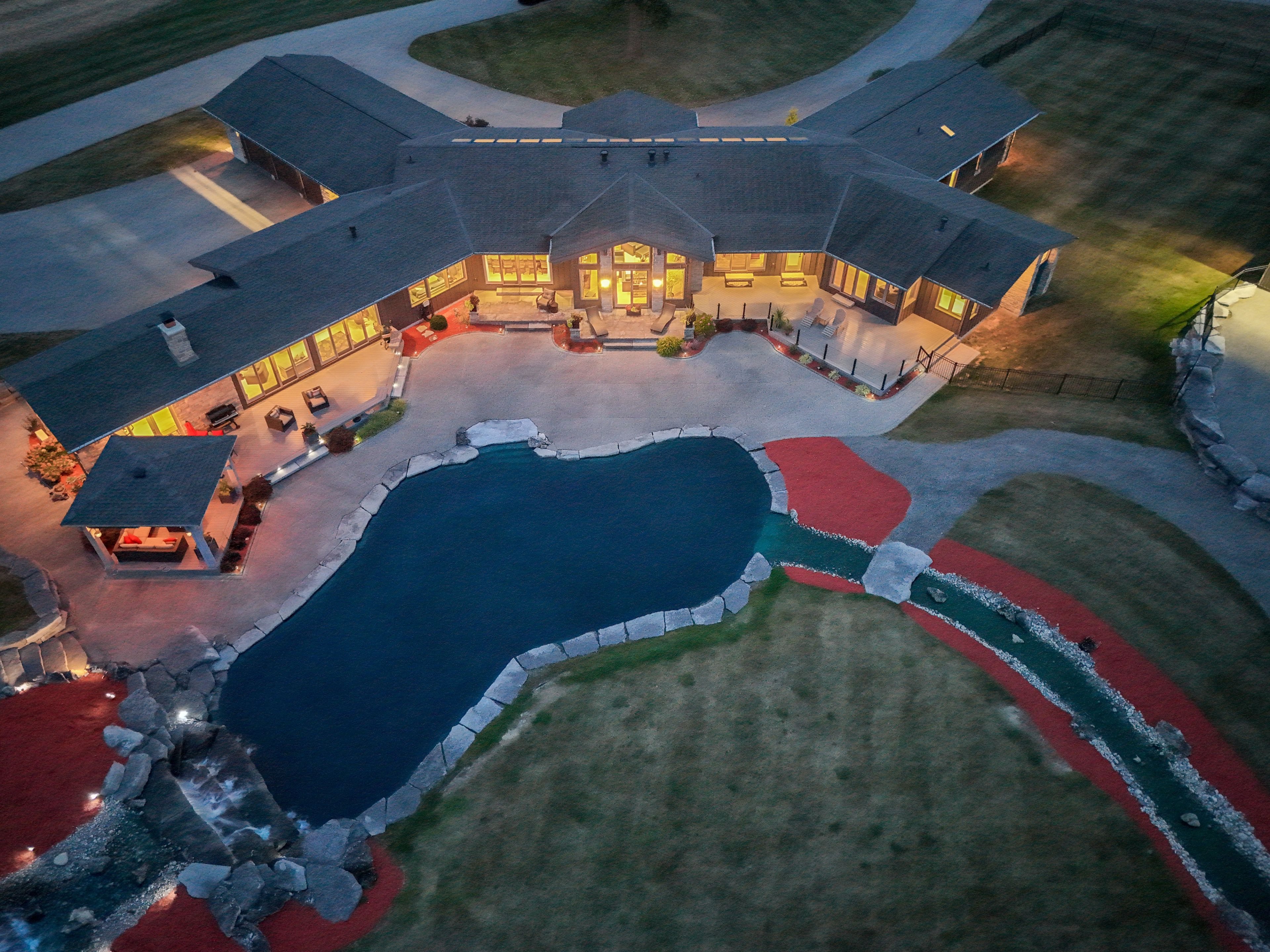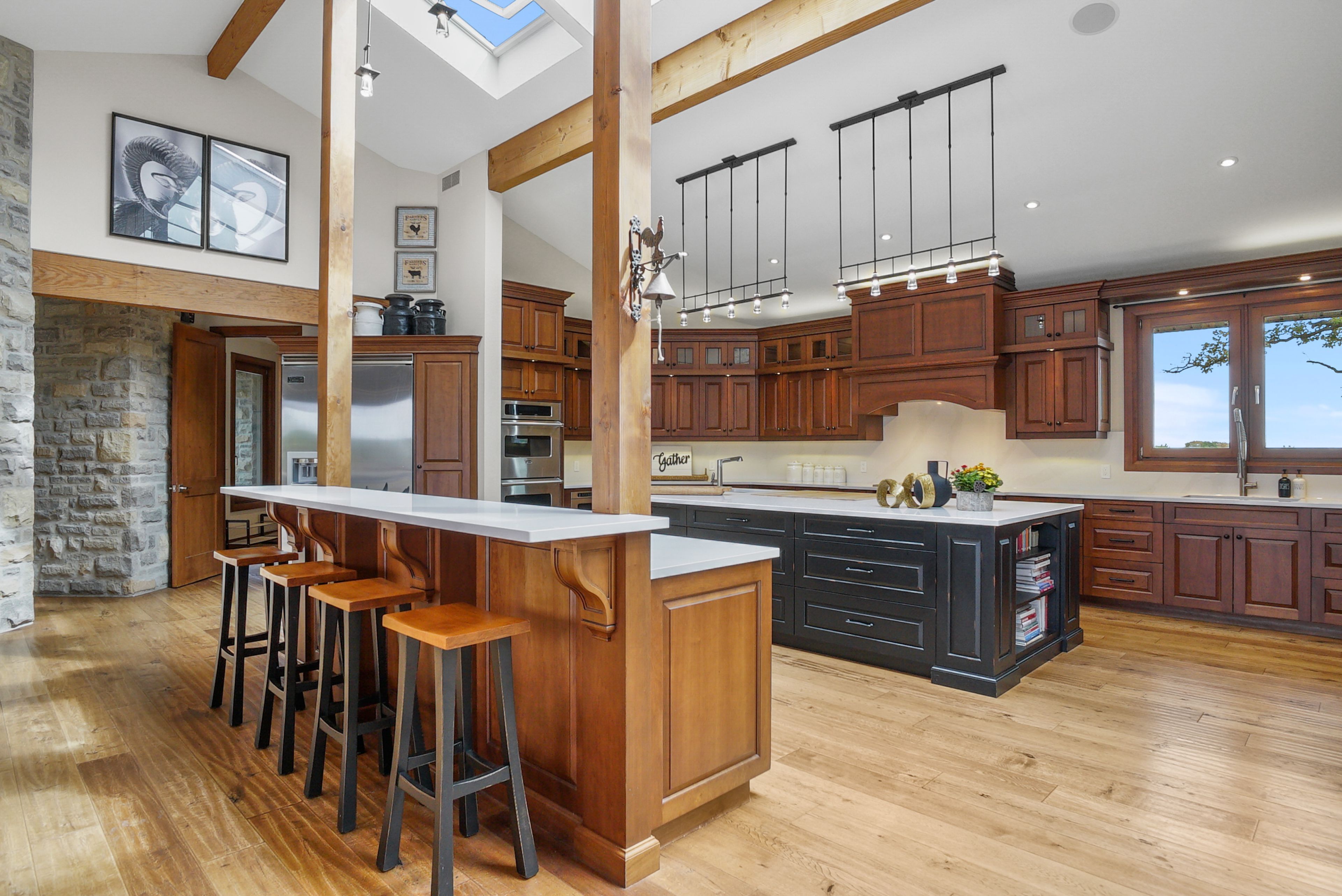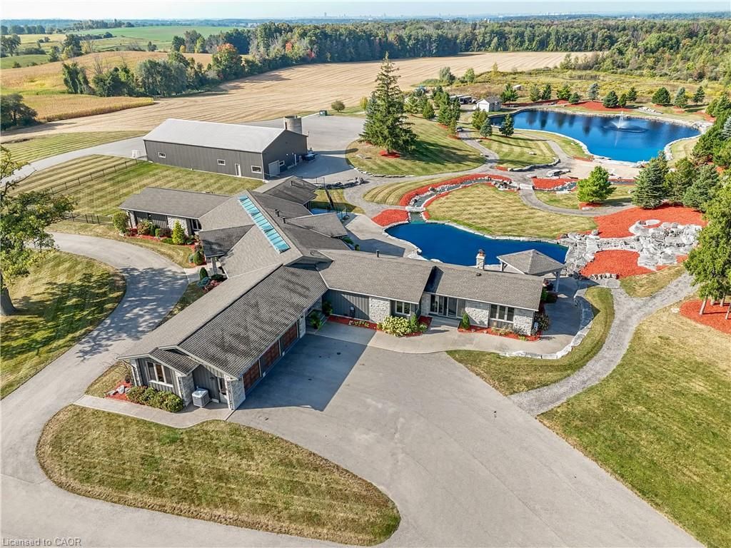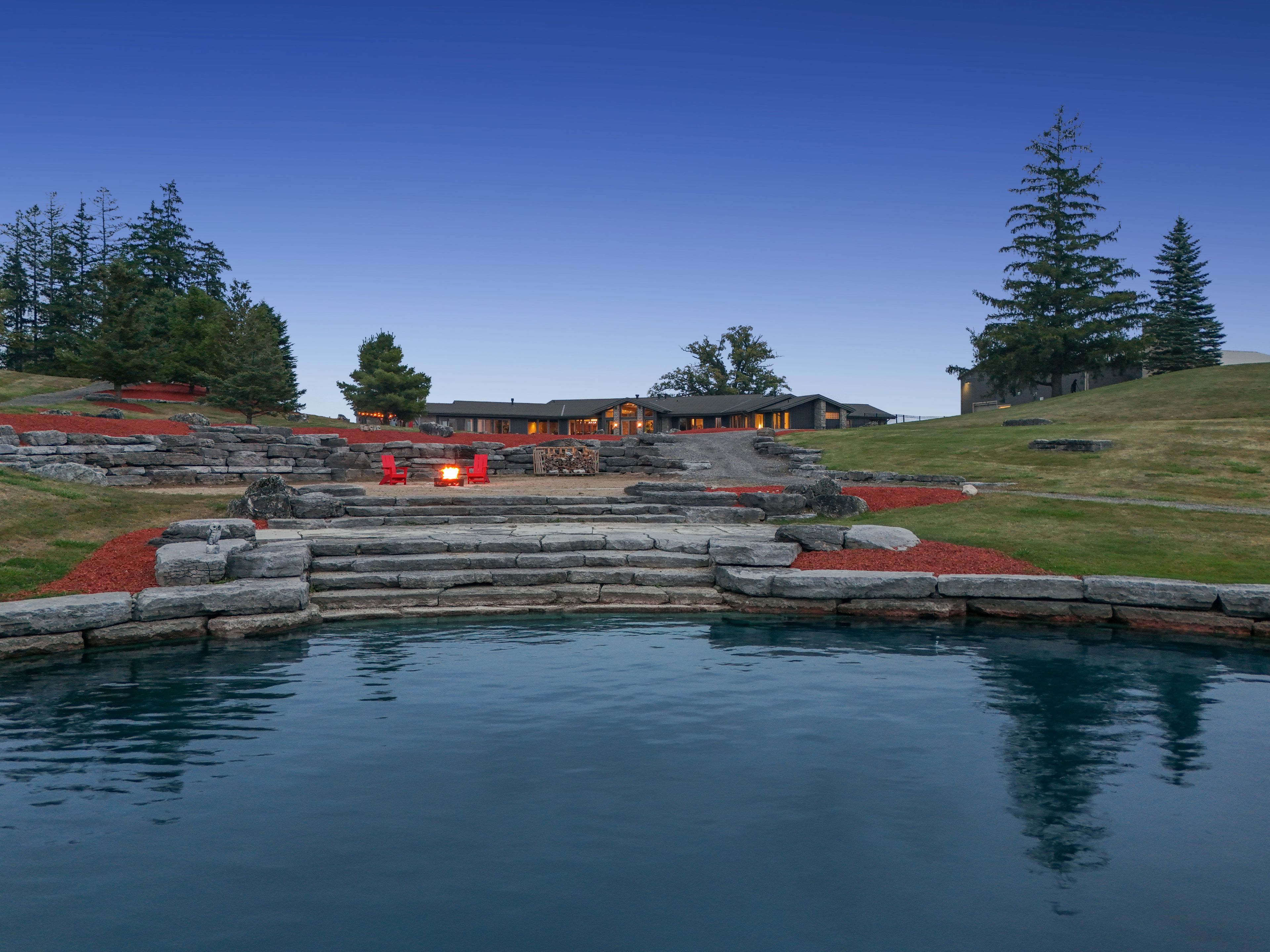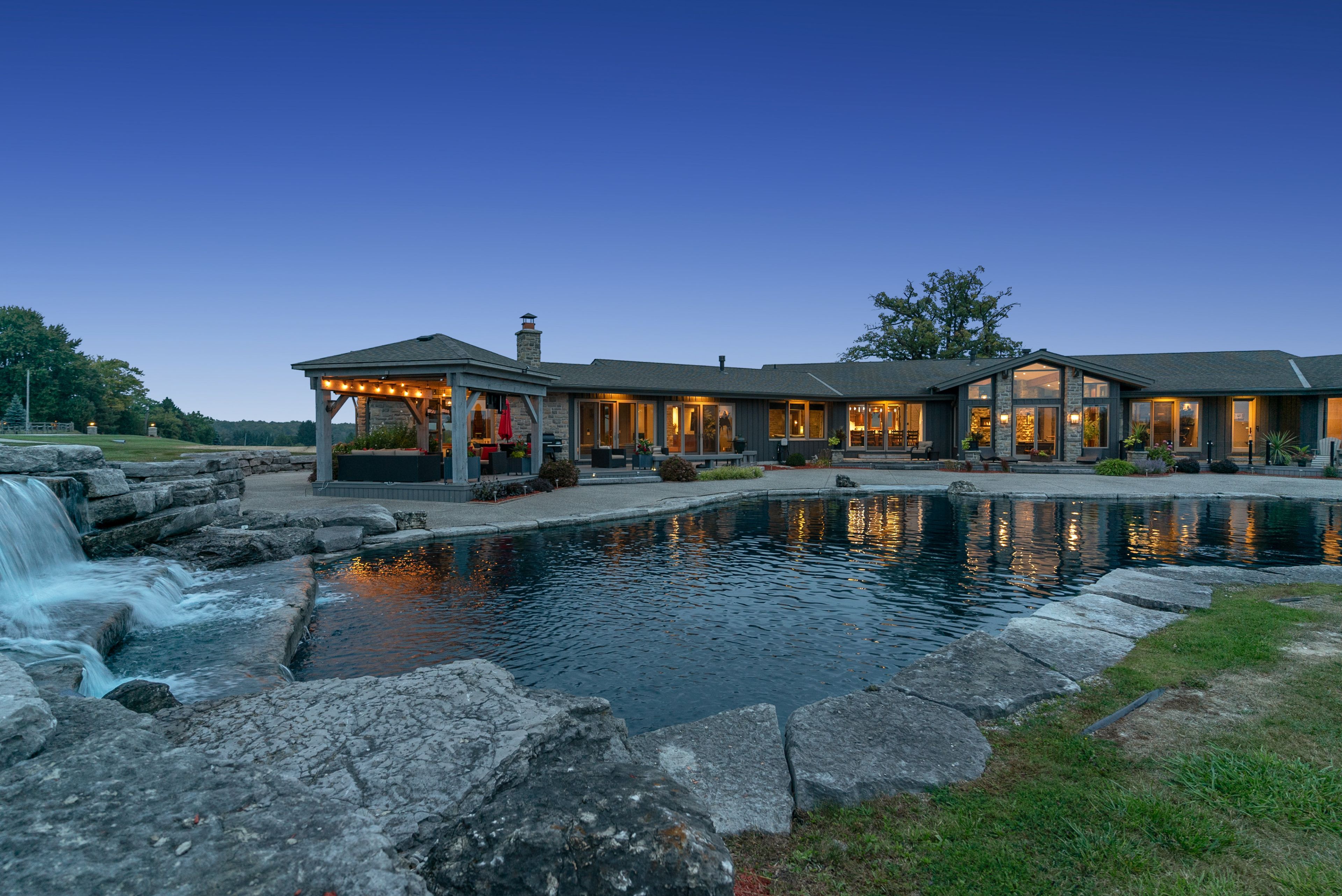 Experience an extraordinary retreat set on over 120 acres of natural beauty. This custom stone bungalow, spanning 10,454.23 sq. ft., showcases high-quality finishes and thoughtful design. Step into the gourmet kitchen, equipped with Viking Professional appliances, Silestone Quartz surfaces, and striking Douglas fir beams. The dual islands invite gatherings, while the dining area offers seating for 14, overlooking a scenic ponds. High ceilings throughout the home create an open, inviting space, while the use of stone and wood details adds a warm, cozy atmosphere. Hand-chipped stone accents and skylights flood the interior with natural light, enhancing the home's connection to its surroundings. The primary suite opens directly to the swim ponds, offering indoor-outdoor living and a spa-like ensuite with a jacuzzi tub beside a gas fireplace. An indoor grilling area with heated floors offers year-round enjoyment, making it an ideal space for entertaining. The lower level is designed for fun and relaxation, featuring a full bar, billiards area, wine cellar, and a private cinema for movie nights. Outdoors, you'll find two ponds: one with a sandy beach and waterfall, and the other stocked for fishing. A heated, 4,000 sq. ft. exterior building with in-floor heating adds both function and flexibility to this expansive property. Explore the trails, unwind in the sitting areas, and enjoy this ultimate private getaway!