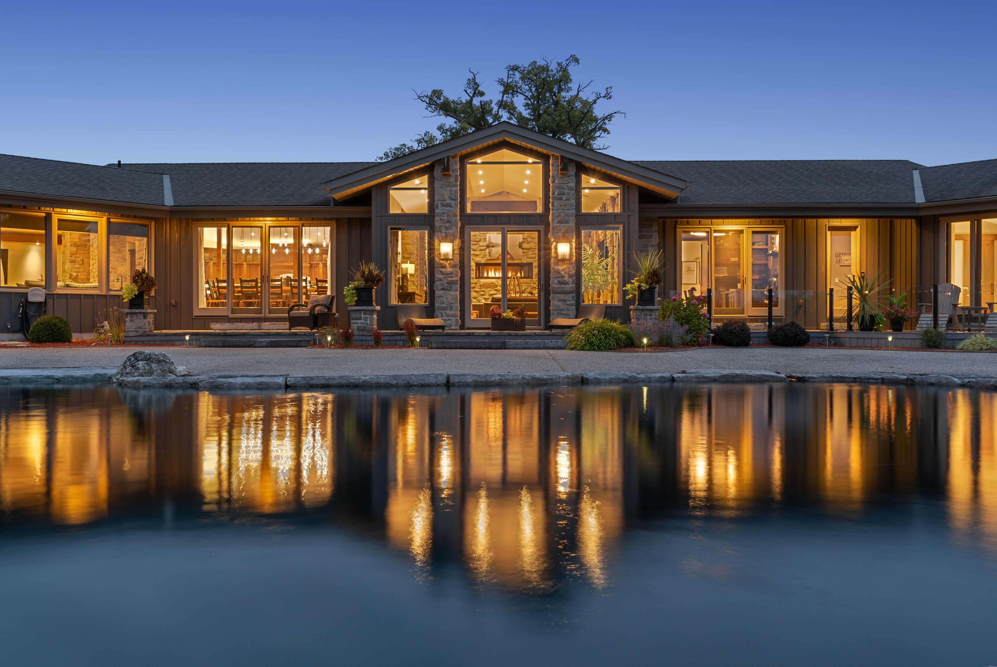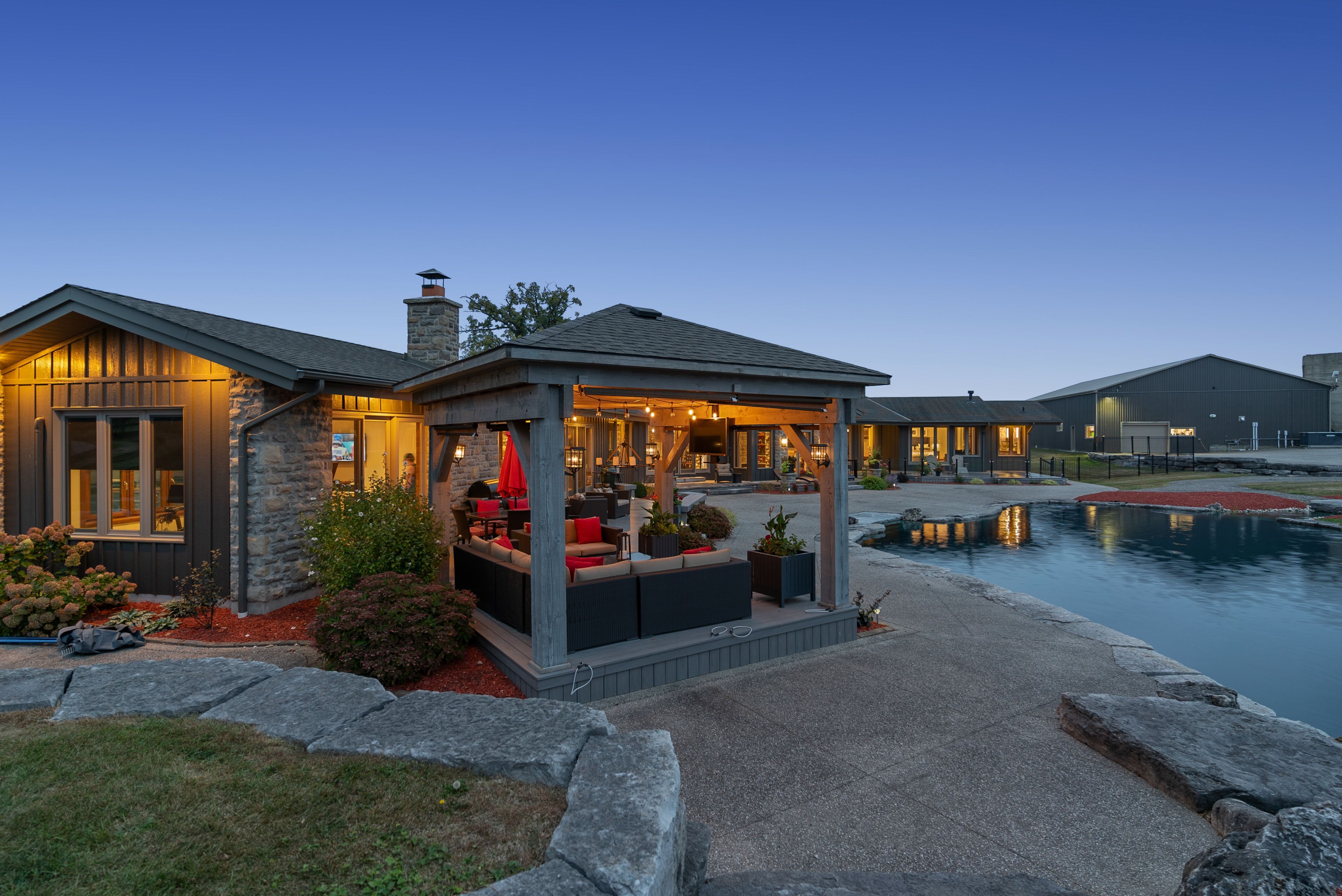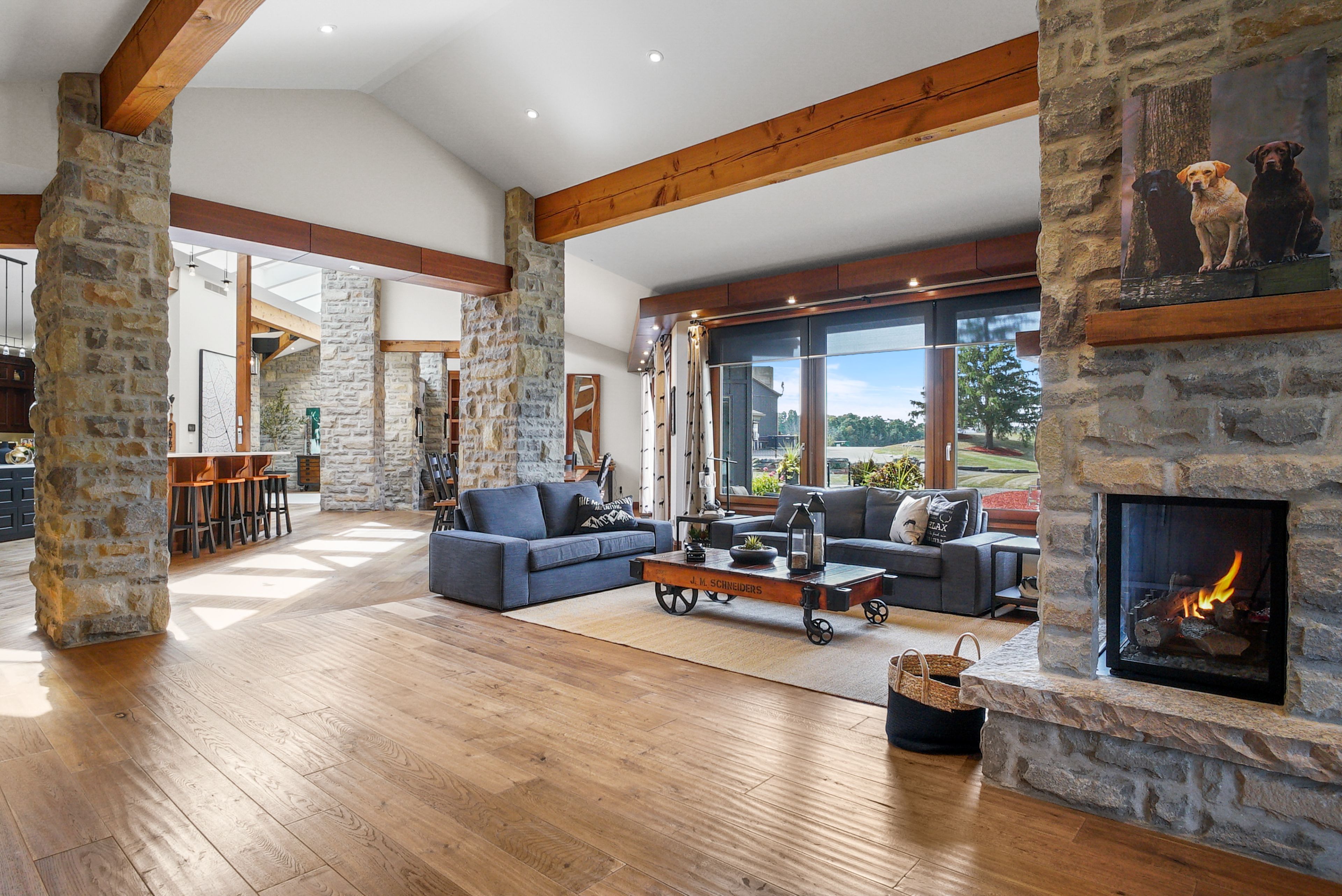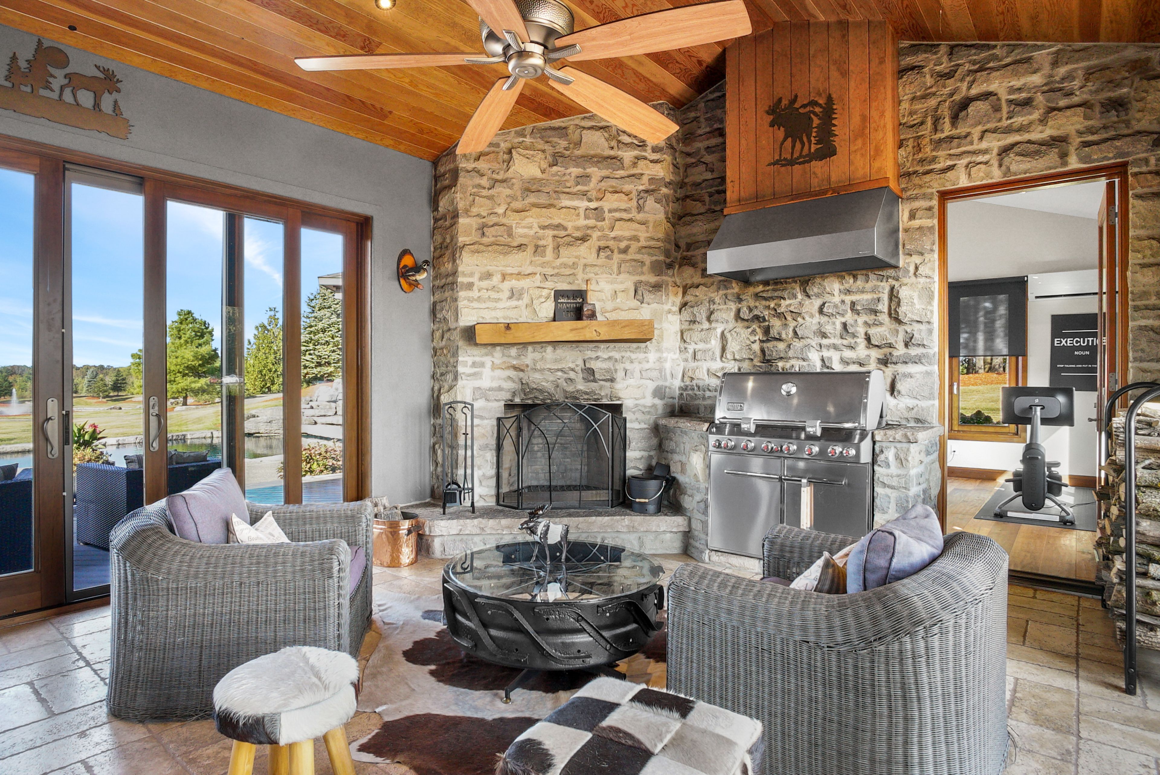 Experience an extraordinary retreat set on over 120 acres of natural beauty. This custom stone bungalow, spanning 10,454.23 sq. ft., showcases high-quality finishes and thoughtful design. Step into the gourmet kitchen, equipped with Viking Professional appliances, Silestone Quartz surfaces, and striking Douglas fir beams. The dual islands invite gatherings, while the dining area offers seating for 14, overlooking a scenic ponds. High ceilings throughout the home create an open, inviting space, while the use of stone and wood details adds a warm, cozy atmosphere. Hand-chipped stone accents and skylights flood the interior with natural light, enhancing the home's connection to its surroundings. The primary suite opens directly to the swim ponds, offering indoor-outdoor living and a spa-like ensuite with a jacuzzi tub beside a gas fireplace. An indoor grilling area with heated floors offers year-round enjoyment, making it an ideal space for entertaining. The lower level is designed for fun and relaxation, featuring a full bar, billiards area, wine cellar, and a private cinema for movie nights. Outdoors, you'll find two ponds: one with a sandy beach and waterfall, and the other stocked for fishing. A heated, 4,000 sq. ft. exterior building with in-floor heating adds both function and flexibility to this expansive property. Explore the trails, unwind in the sitting areas, and enjoy this ultimate private getaway!