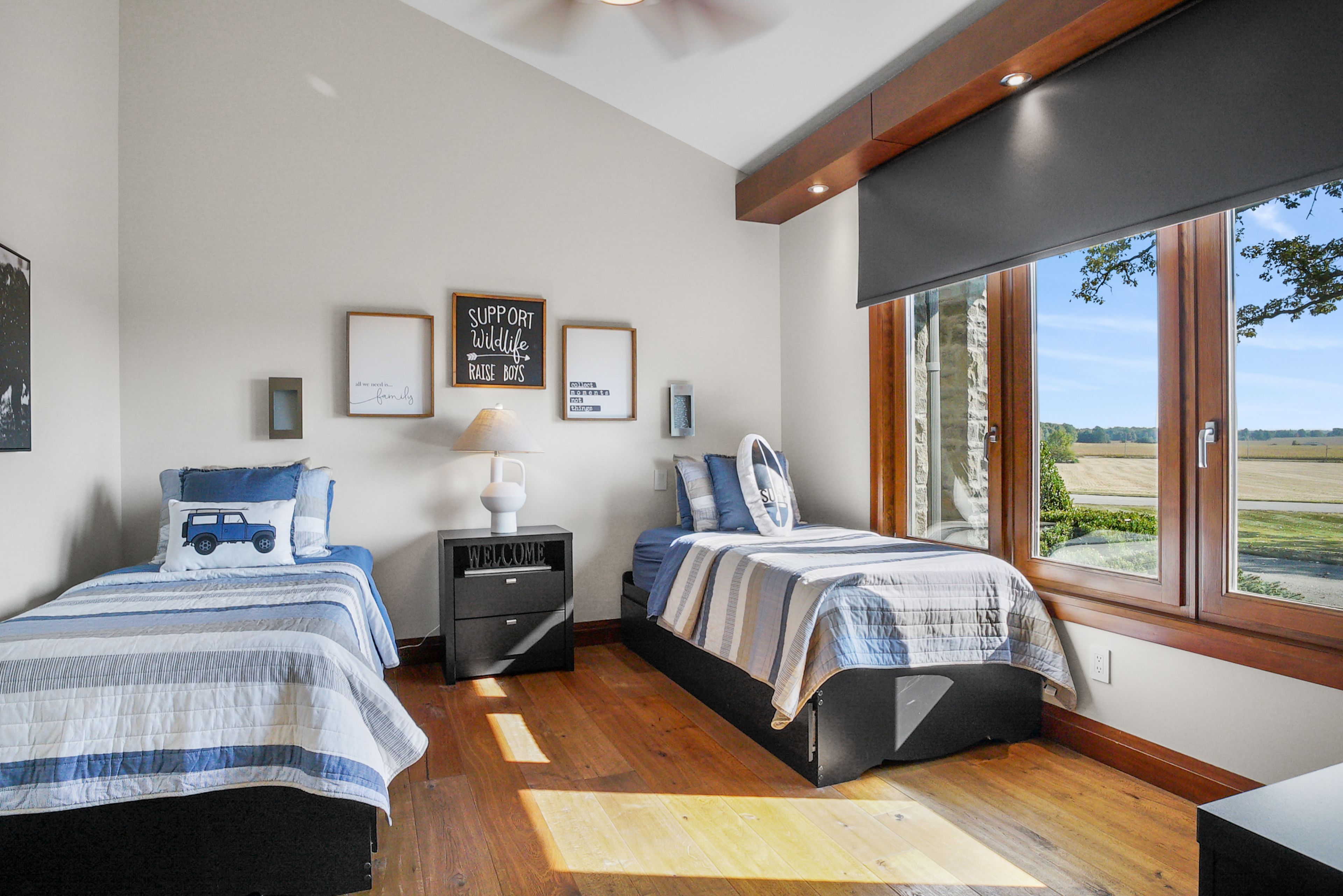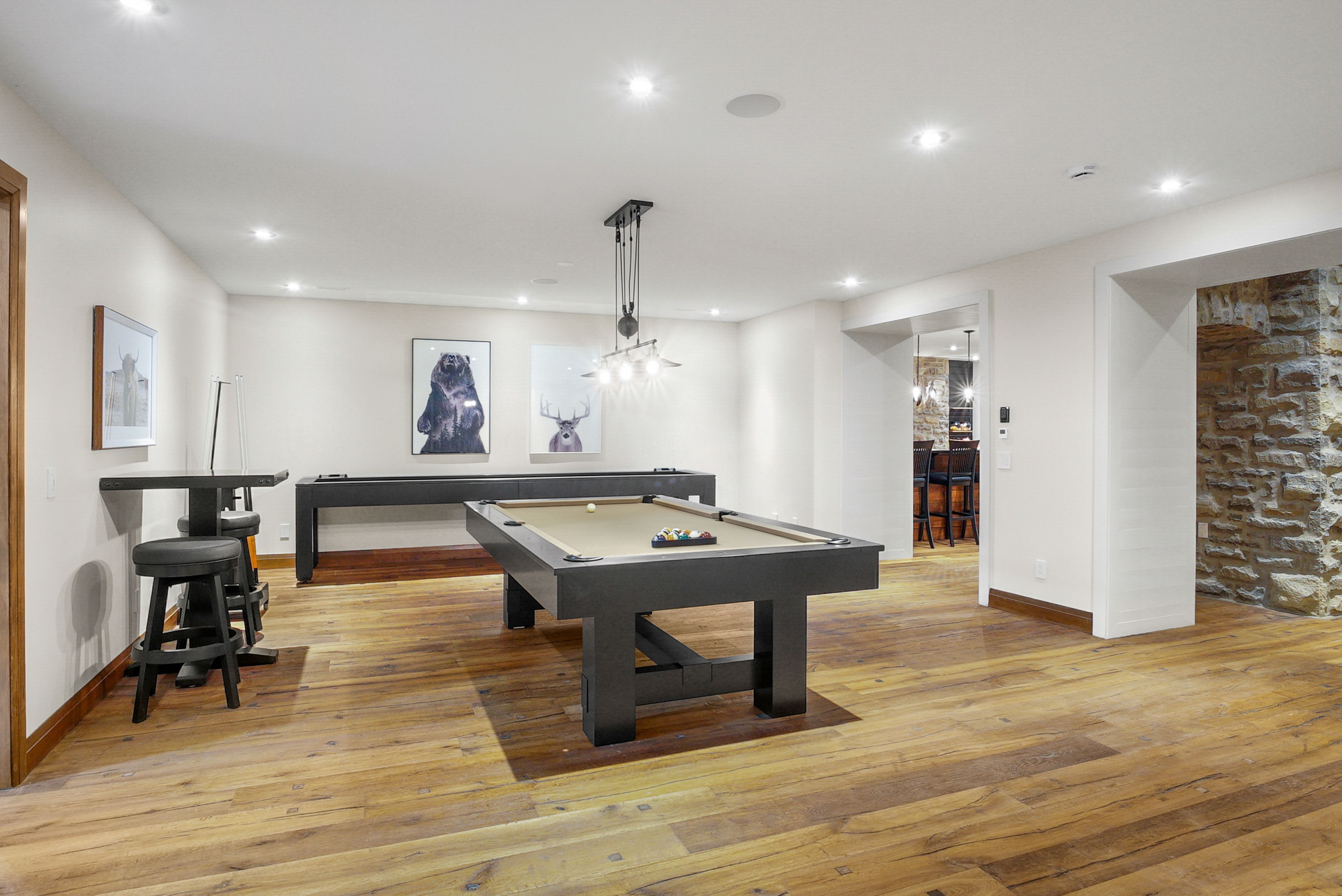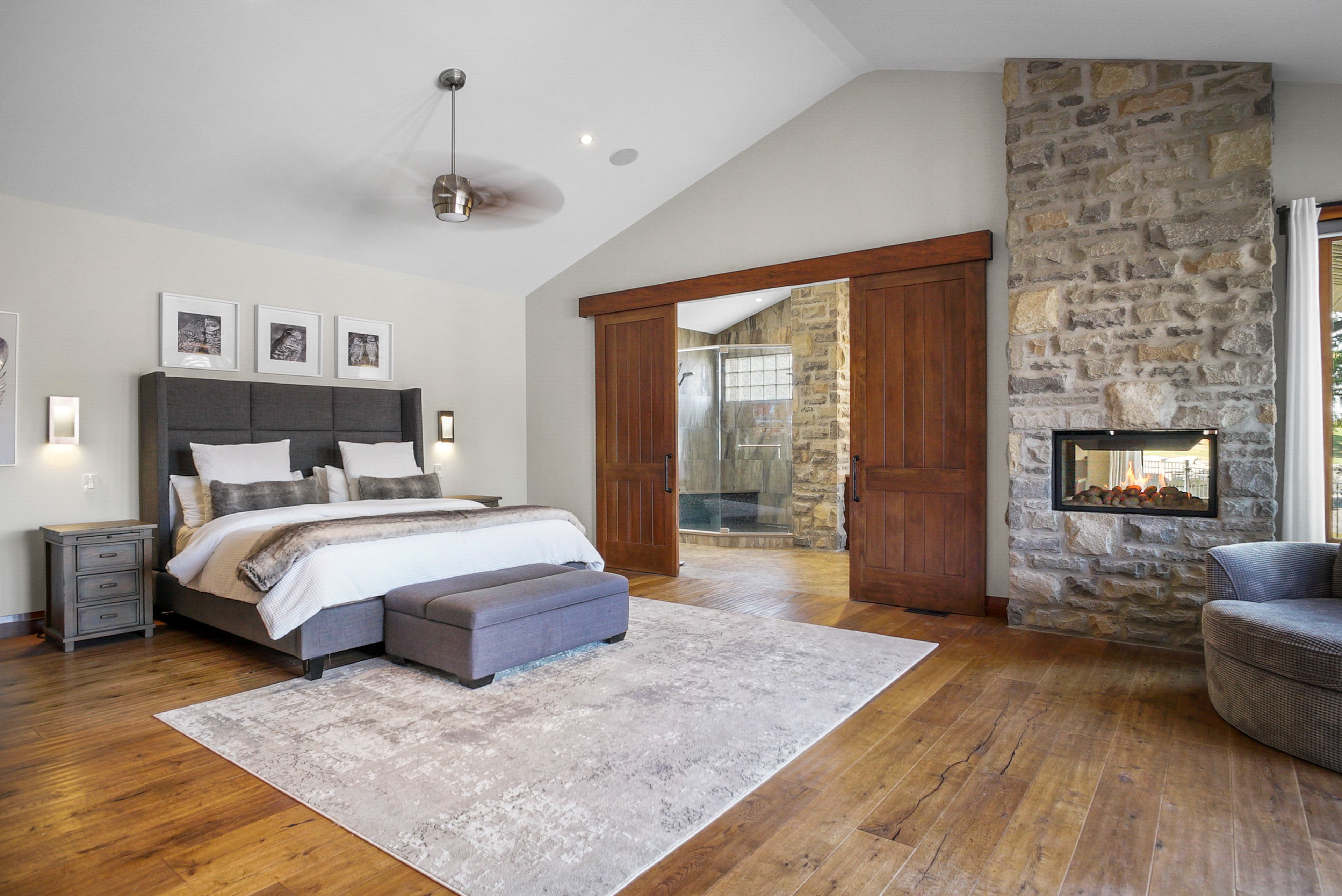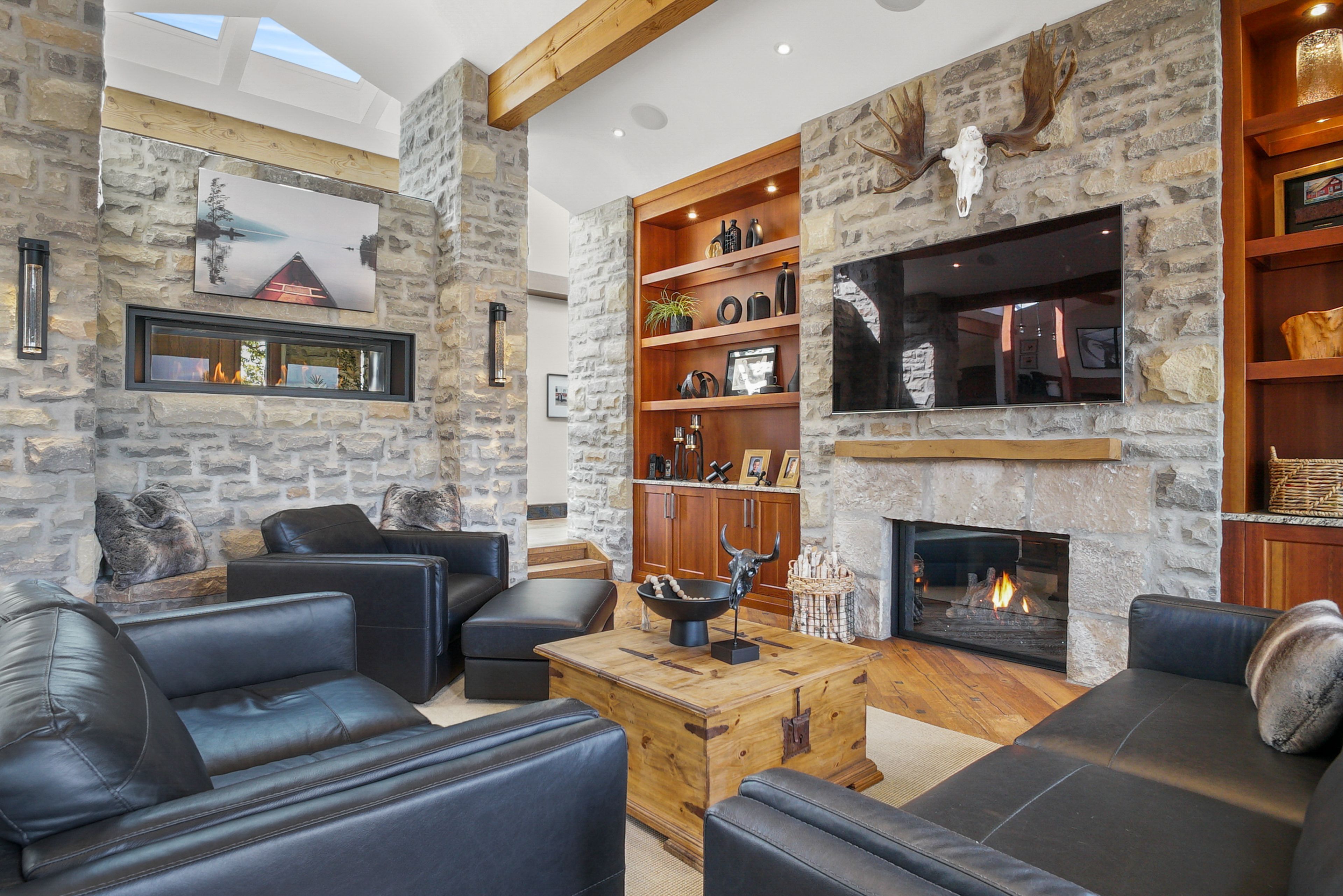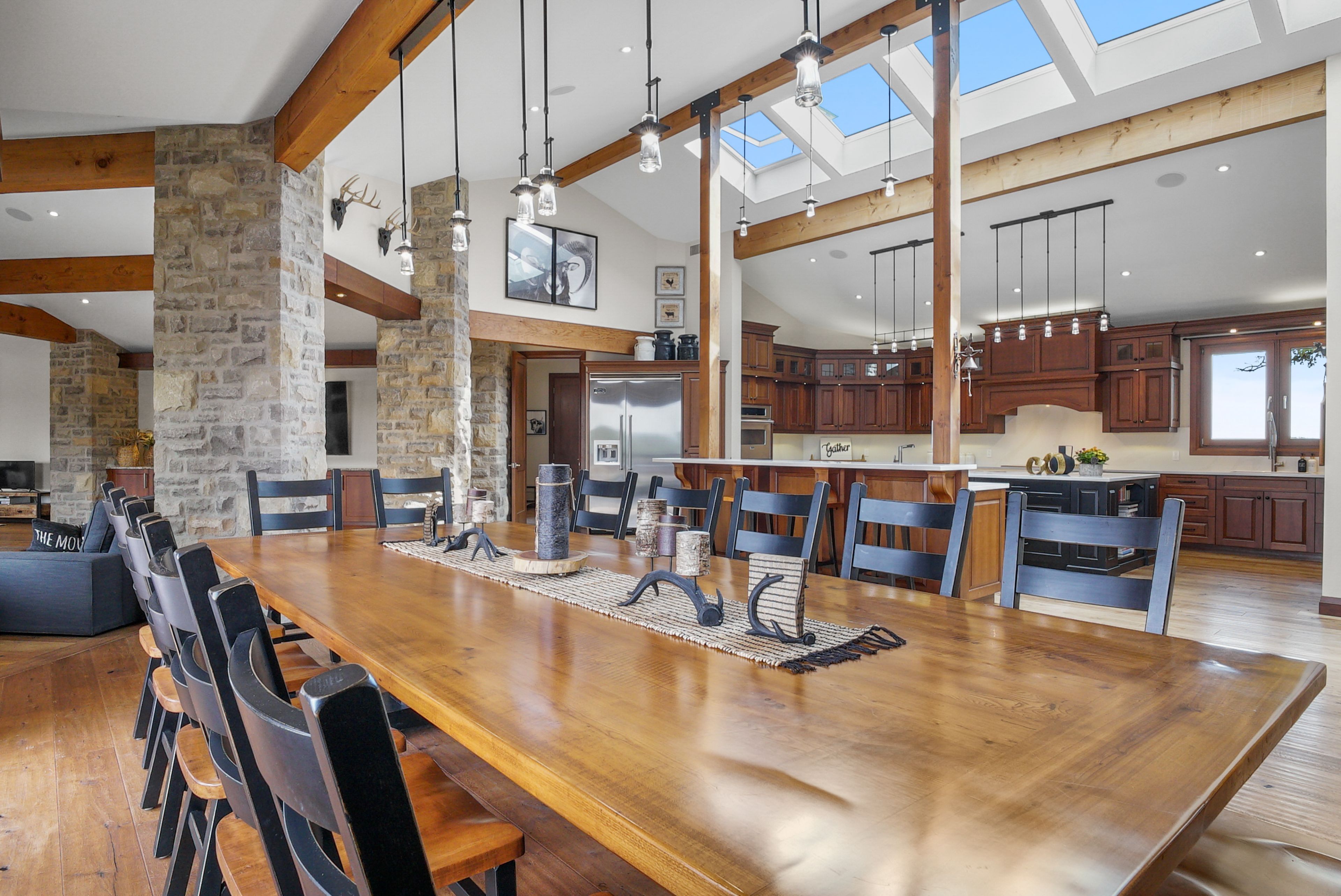 Experience an extraordinary retreat set on over 120 acres of natural beauty. This custom stone bungalow, spanning 10,454.23 sq. ft., showcases high-quality finishes and thoughtful design. Step into the gourmet kitchen, equipped with Viking Professional appliances, Silestone Quartz surfaces, and striking Douglas fir beams. The dual islands invite gatherings, while the dining area offers seating for 14, overlooking a scenic ponds. High ceilings throughout the home create an open, inviting space, while the use of stone and wood details adds a warm, cozy atmosphere. Hand-chipped stone accents and skylights flood the interior with natural light, enhancing the home's connection to its surroundings. The primary suite opens directly to the swim ponds, offering indoor-outdoor living and a spa-like ensuite with a jacuzzi tub beside a gas fireplace. An indoor grilling area with heated floors offers year-round enjoyment, making it an ideal space for entertaining. The lower level is designed for fun and relaxation, featuring a full bar, billiards area, wine cellar, and a private cinema for movie nights. Outdoors, you'll find two ponds: one with a sandy beach and waterfall, and the other stocked for fishing. A heated, 4,000 sq. ft. exterior building with in-floor heating adds both function and flexibility to this expansive property. Explore the trails, unwind in the sitting areas, and enjoy this ultimate private getaway!