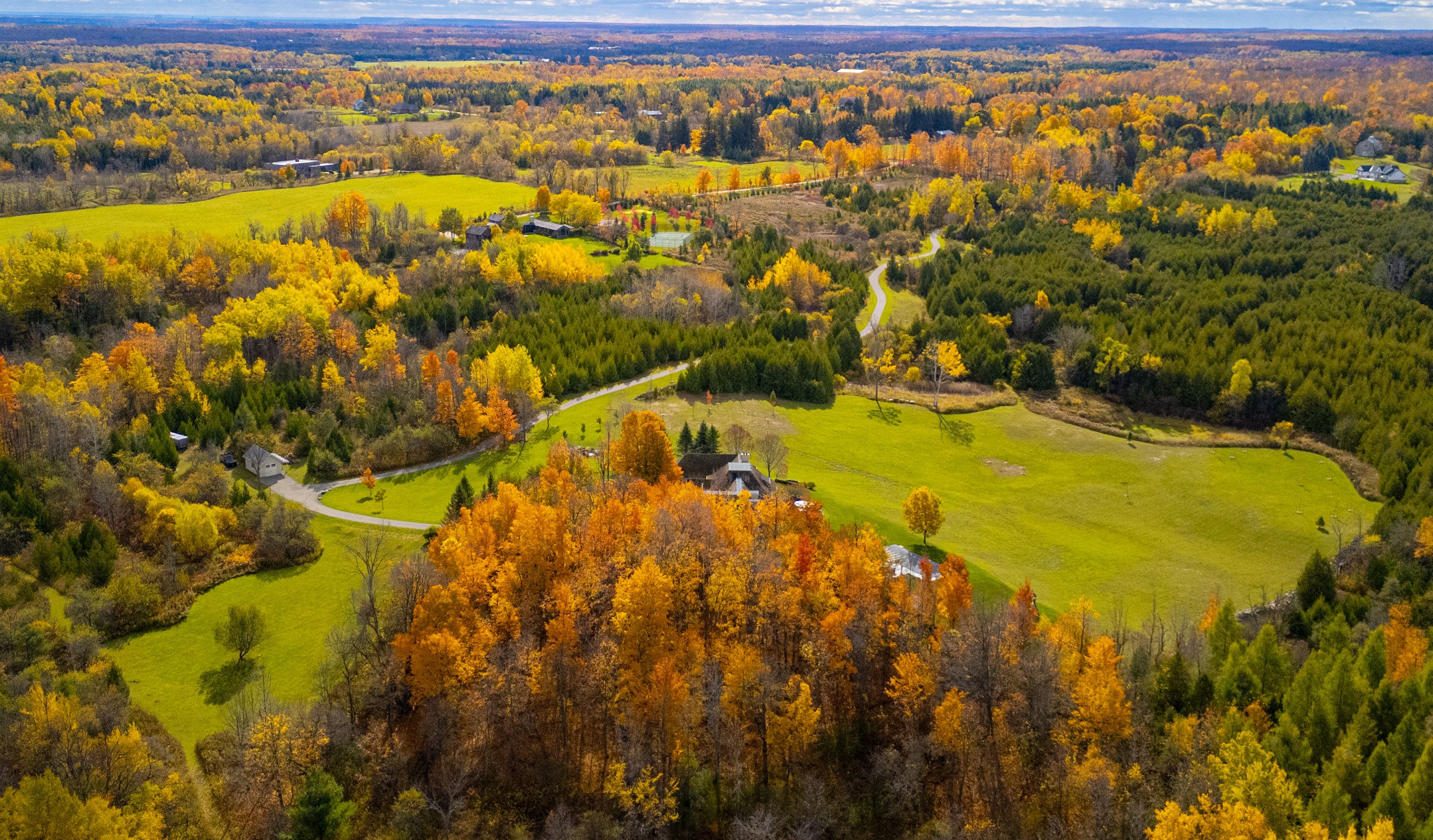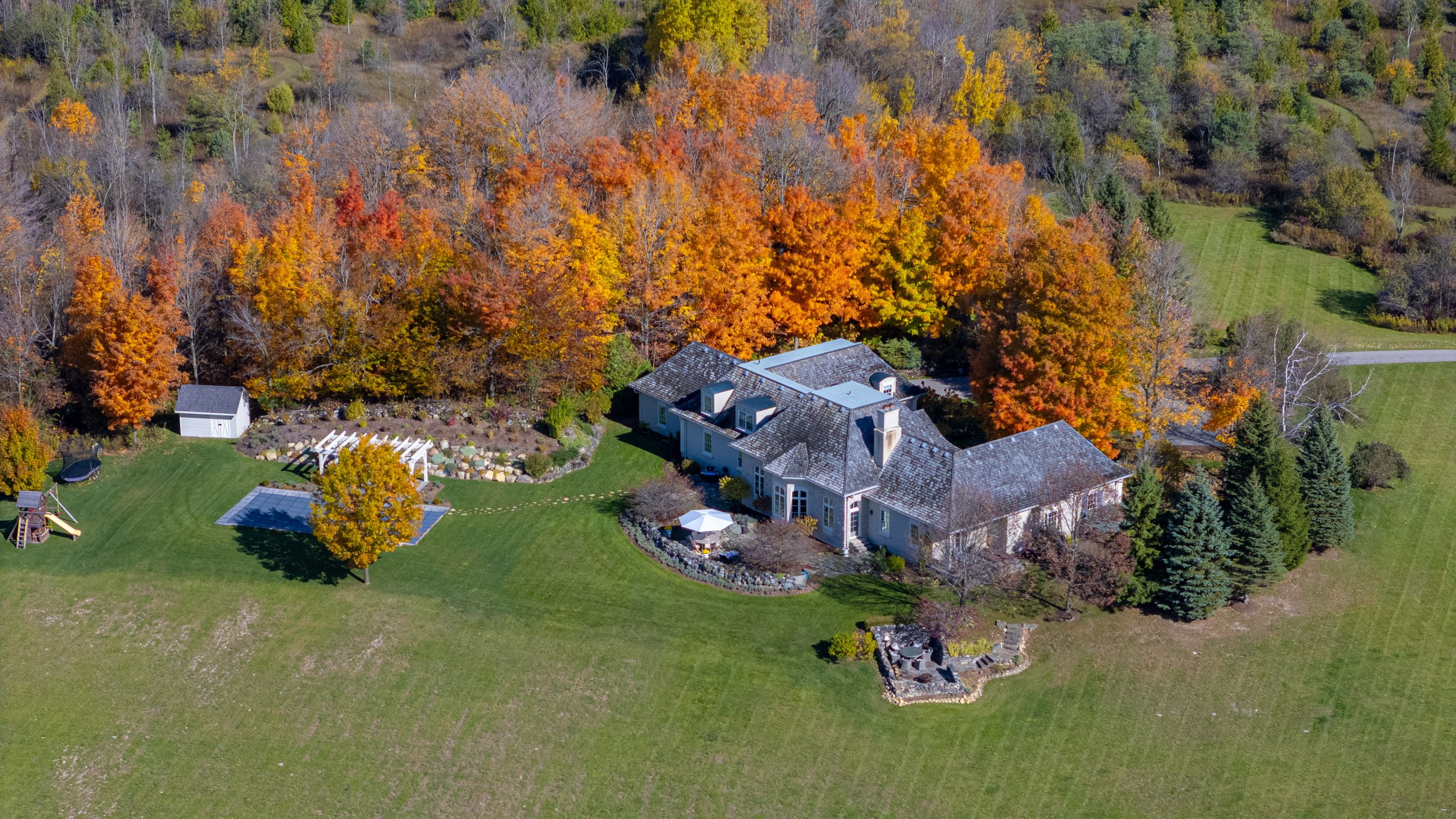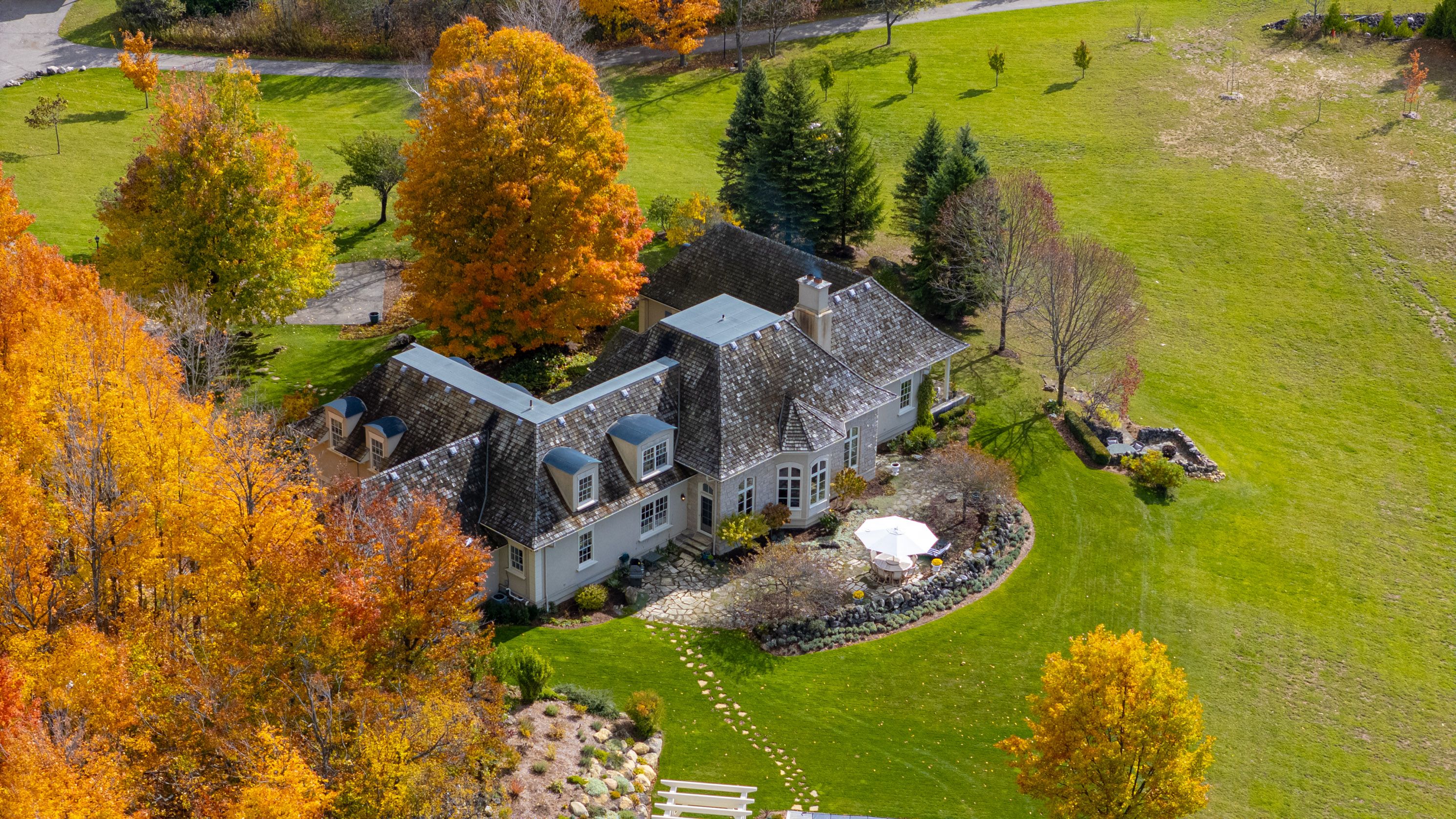 Nestled on 90.33 private acres along one of Erin's most coveted roads, Badger Hall represents the pinnacle of country estate living. This exceptional property combines rolling topography, manicured trails wide enough for utility vehicles, & multiple ponds perfect for summer fishing & winter skating. Beautiful fieldstone walls wind through the landscape, while the gated entry & long private drive ensure complete peace & privacy. Designed by renowned architect Stephan McCasey, the home is a masterpiece of craftsmanship beneath a stunning cedar shake roof. Light pours through every window, framing spectacular countryside views. The main level's great room, anchored by a limestone wood-burning fireplace, flows seamlessly into the dining room & opens to multiple patio walkouts. The kitchen impresses w/ its massive centre island, exceptional layout, & abundant storage. A cozy den off the kitchen provides the perfect retreat for quiet evenings, while a distinctive office w/ wood-burning fireplace & custom built-ins offers an inspiring workspace. The main-floor primary suite is a true sanctuary, bathed in natural light w/ beautiful countryside views. The spa-like ensuite features a soaker tub, walk-in shower, & double vanity, and has a generous walk-in closet. Upstairs, 3 beds & 2 baths provide comfortable family accommodation. The finished lower level includes a hot yoga studio & flexible space ideal for a gym/media room. Outside, the landscape captivates at every turn. The showpiece is undoubtedly the new pool area, artfully set into the natural landscape w/ sweeping views over the rolling fields. Long western views allow for stunning sunsets. Natural stone sitting areas throughout the grounds create intimate gathering spots, while the pristine trails (5km+) beckon equestrian enthusiasts. A 3-car garage & detached workshop complete the practical amenities. Located mins from Belfountain, Erin, Caledon Ski Club, The Pulpit, & TPC Osprey Valley. Less than 1 hr from TO.
