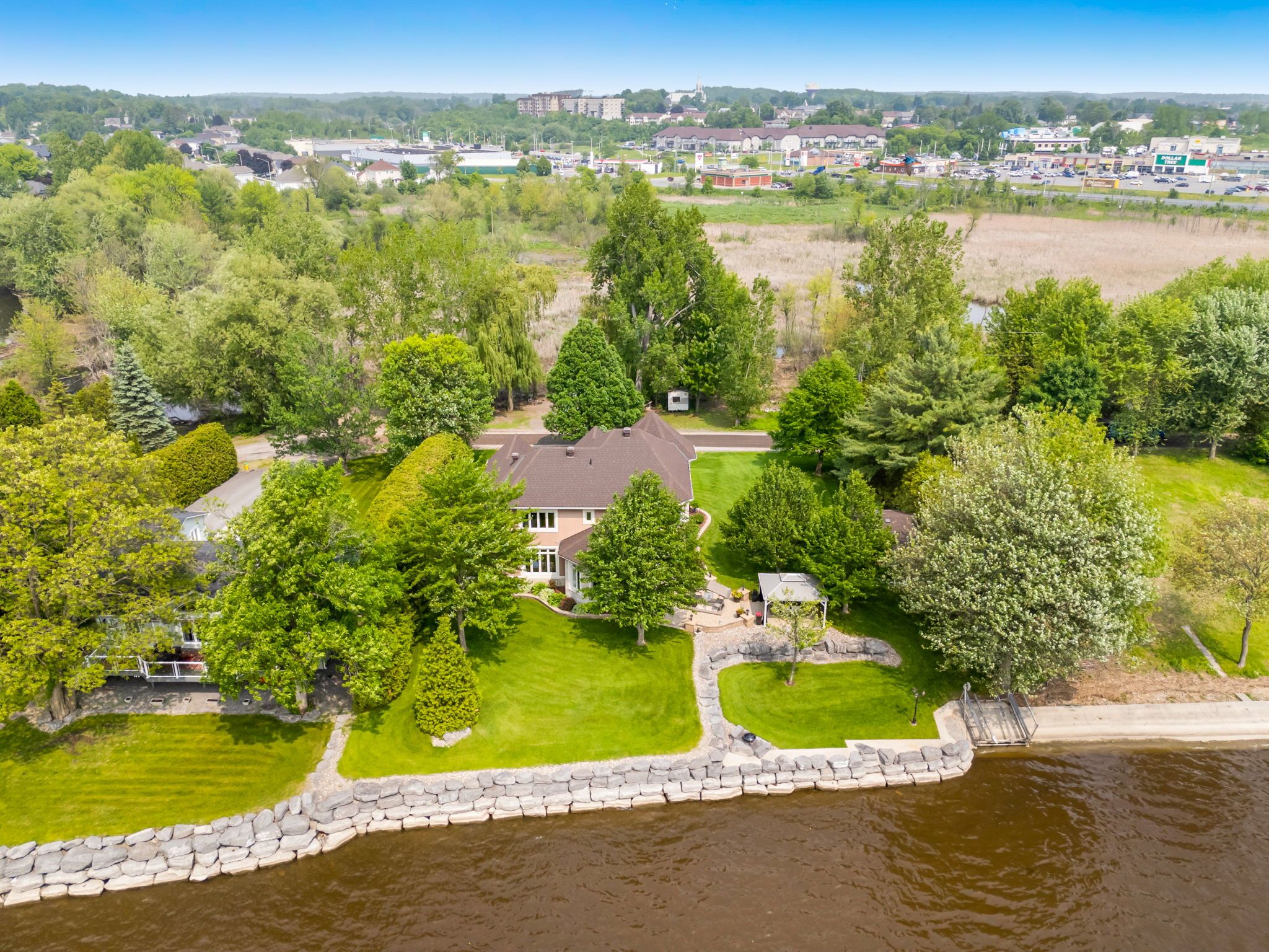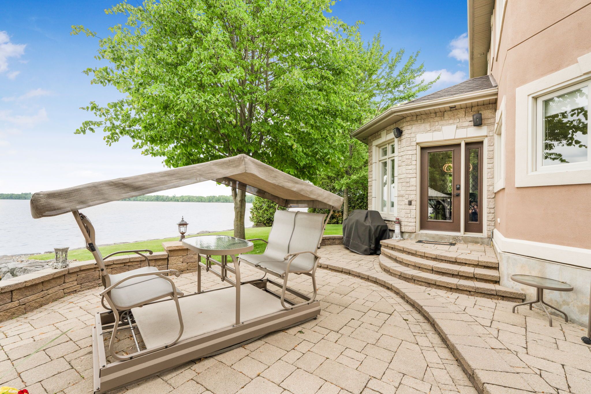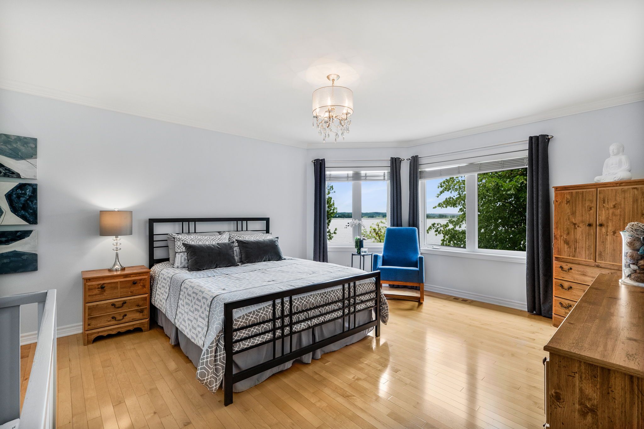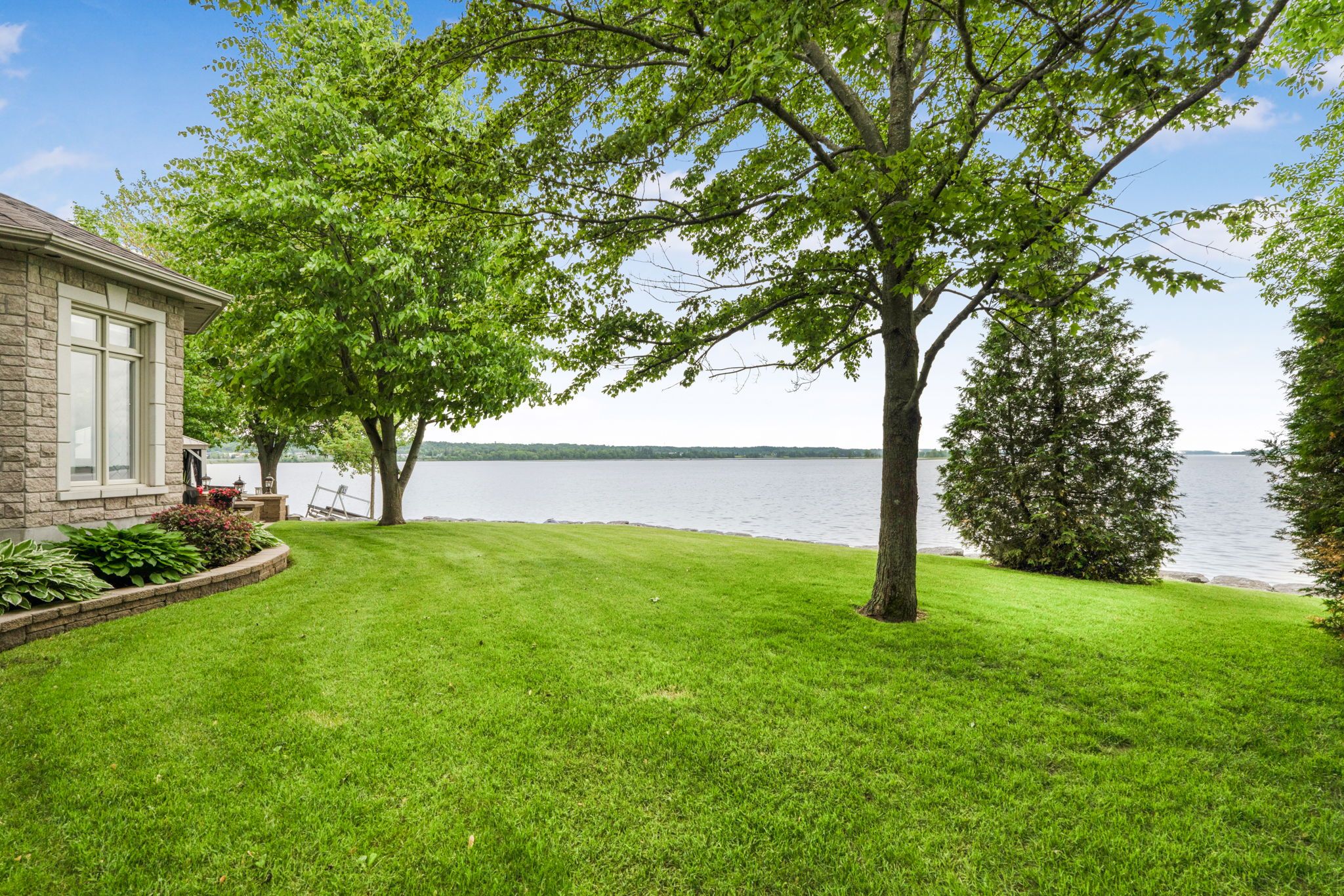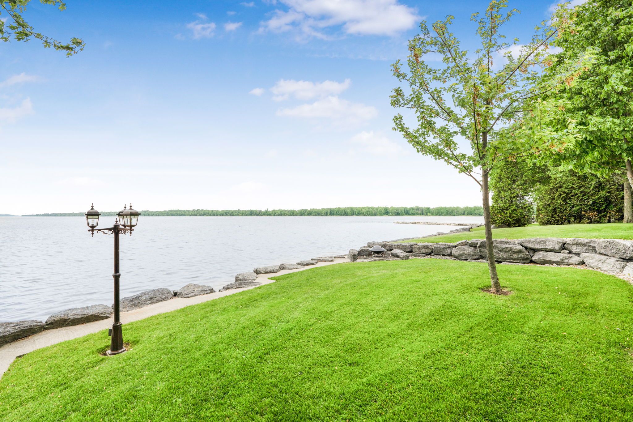 Welcome to an exceptional waterfront residence that defines elegance and sophistication. Perfectly situated in the heart of Rockland, this custom-built 3,200 sq.ft. home offers an unparalleled lifestyle with breathtaking water views and sunset backdrops, all within a short distance to local amenities. Originally built in 2004, the main floor was fully remodelled in 2021, blending timeless design with fresh, contemporary finishes.The sun-drenched open-concept layout features soaring 9-ft ceilings, a flowing design, and refined touches throughout. The chef-inspired kitchen is a true showpiece, complete with granite countertops, an oversized island with seating, and seamless flow into the expansive living and dining areas. This luxurious home offers 3 generously sized bedrooms, each with its own walk-in closet, and 3 beautifully appointed bathrooms, including a spa-like ensuite in the primary suite. A separate family room provides versatile space ideal as an executive home office, library, or lounge. A convenient main-floor laundry adds to the everyday ease of living. Additional features include a spacious 25 x 26 double attached garage perfect for vehicles, storage, or a hobby space. Outside, experience true tranquility in your private, fully landscaped backyard oasis. Enjoy al fresco dining on the interlock patio, unwind beneath the elegant pavilion-style gazebo, and appreciate the privacy offered by mature cedar hedges flanking both sides of the property. A built-in lawn sprinkling system ensures your grounds remain lush and green with minimal effort. Whether entertaining or relaxing, the ever-changing waterfront views provide a stunning natural backdrop.This rare offering combines refined interiors, modern comfort, and a coveted in-town waterfront location ideal for those seeking luxury without compromise.