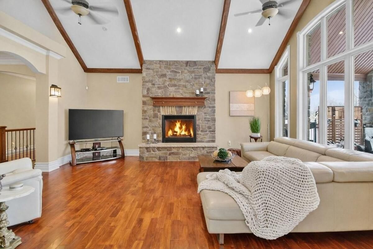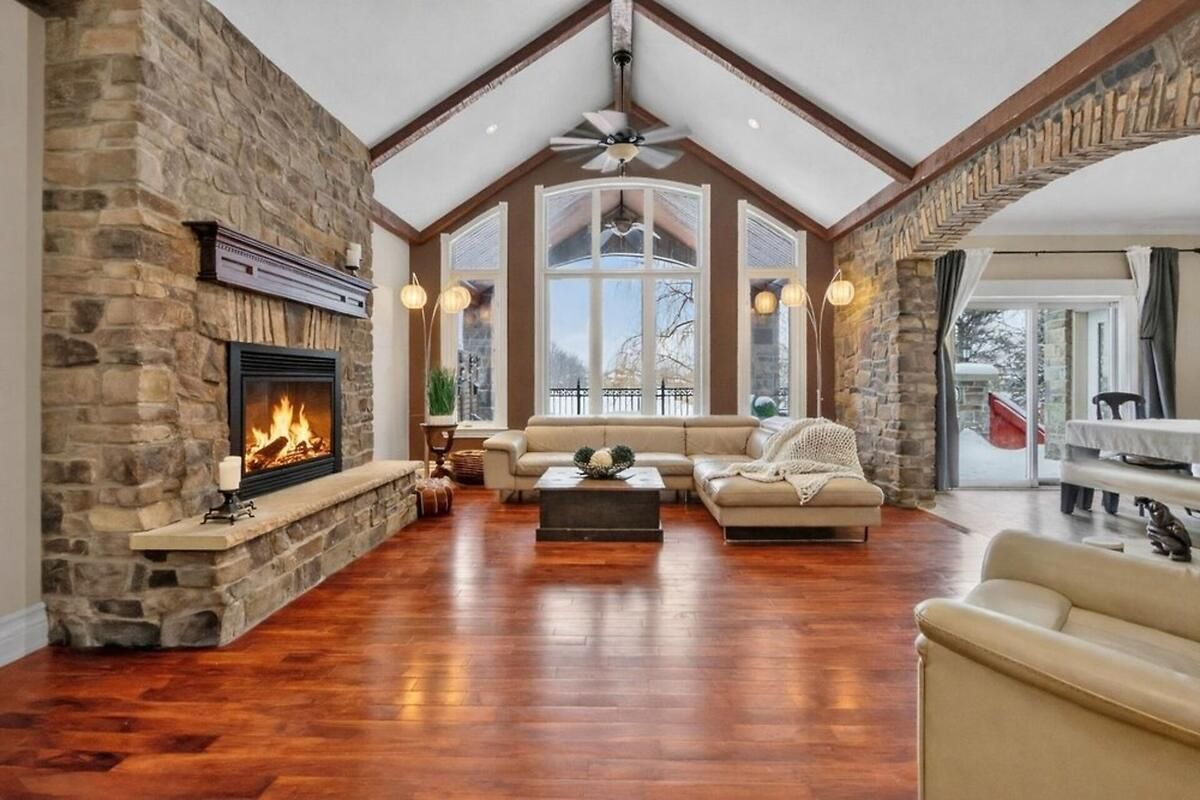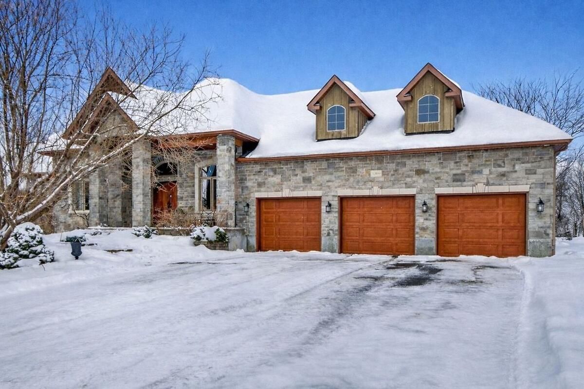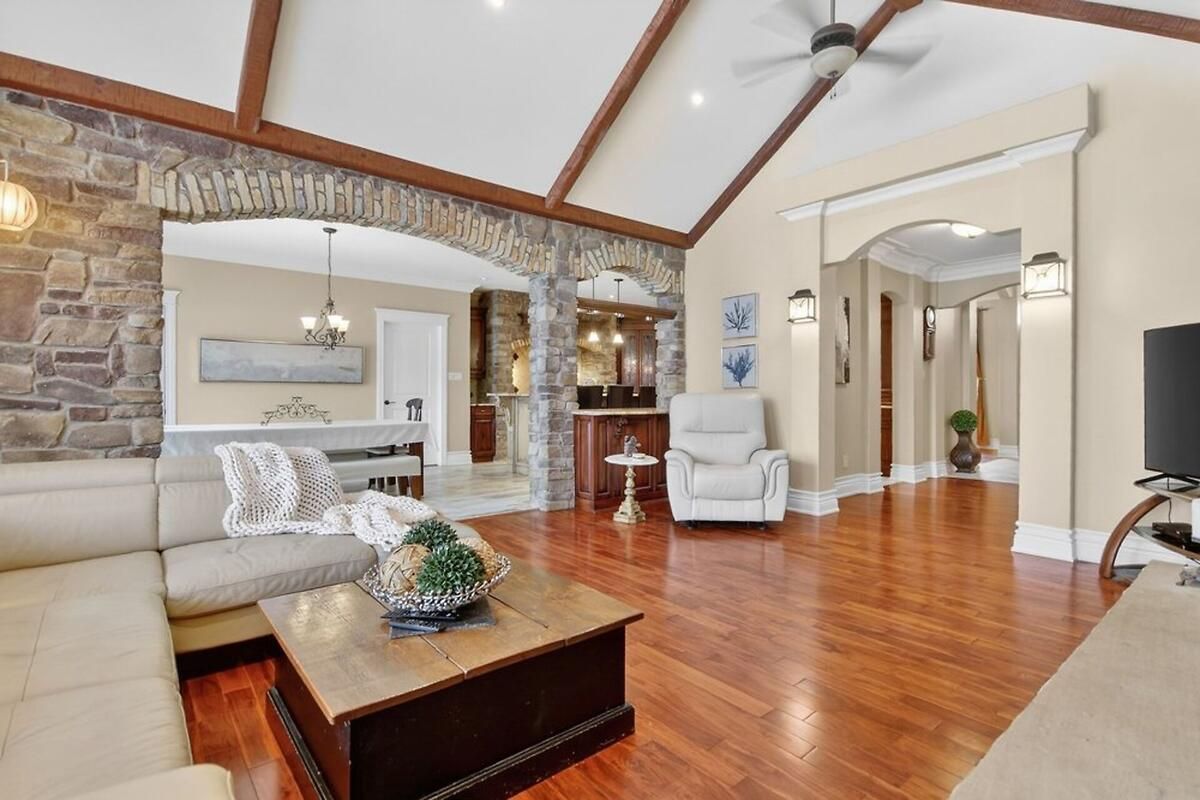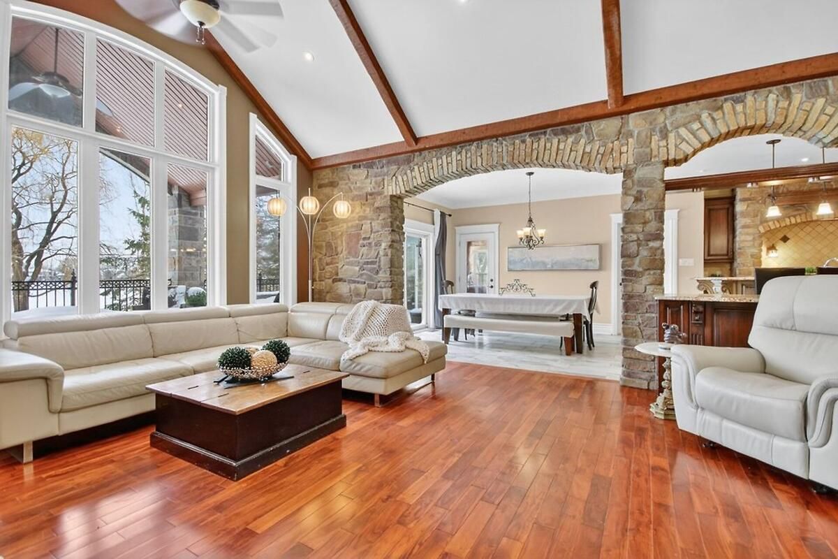 *OPEN HOUSE THIS SUNDAY, JAN 18 FROM 2-4PM* Welcome to a truly exceptional waterfront bungalow with walkout lower level in Greely, where timeless craftsmanship, thoughtful design & breathtaking natural surroundings come together to create a home that is both luxurious & welcoming. The home impresses immediately with dramatic architectural elements, including soaring 12-foot vaulted ceilings with exposed wood beams, a striking floor-to-ceiling stone fireplace & an elegant stone archway leading into the eat-in kitchen. Large windows flood the main living area with natural light & frame picturesque waterfront views, creating a warm and inviting atmosphere ideal for both everyday living & entertaining. The kitchen is thoughtfully designed with generous workspace and storage, seamlessly connected to the living & dining areas. One of the home's standout features is the expansive balcony overlooking the water, accessible from both the kitchen & primary bedroom-perfect for morning coffee or evening relaxation. The primary suite is a private retreat featuring a spa-inspired 6-piece ensuite & an exceptionally deep 14-foot walk-in closet. Two additional main-floor bedrooms offer flexibility for family, guests, or home office use, while main floor laundry adds everyday convenience. The walkout lower level dramatically expands the living space, offering direct access to the yard & waterfront. This level includes two generously sized bedrooms, each with its own large walk-in closet, expansive open living areas & an additional kitchen, making it ideal for an in-law suite or extended family living. Outside, the beautiful waterfront setting & large yard provide endless opportunities for outdoor entertaining, recreation & relaxation. With spectacular attention to detail throughout, a lodge-inspired interior, and six bedrooms across a well-designed layout, this remarkable home offers a lifestyle of comfort, elegance & lasting value. Hydro approx. $330/mo, Gas approx. $110-170/mo