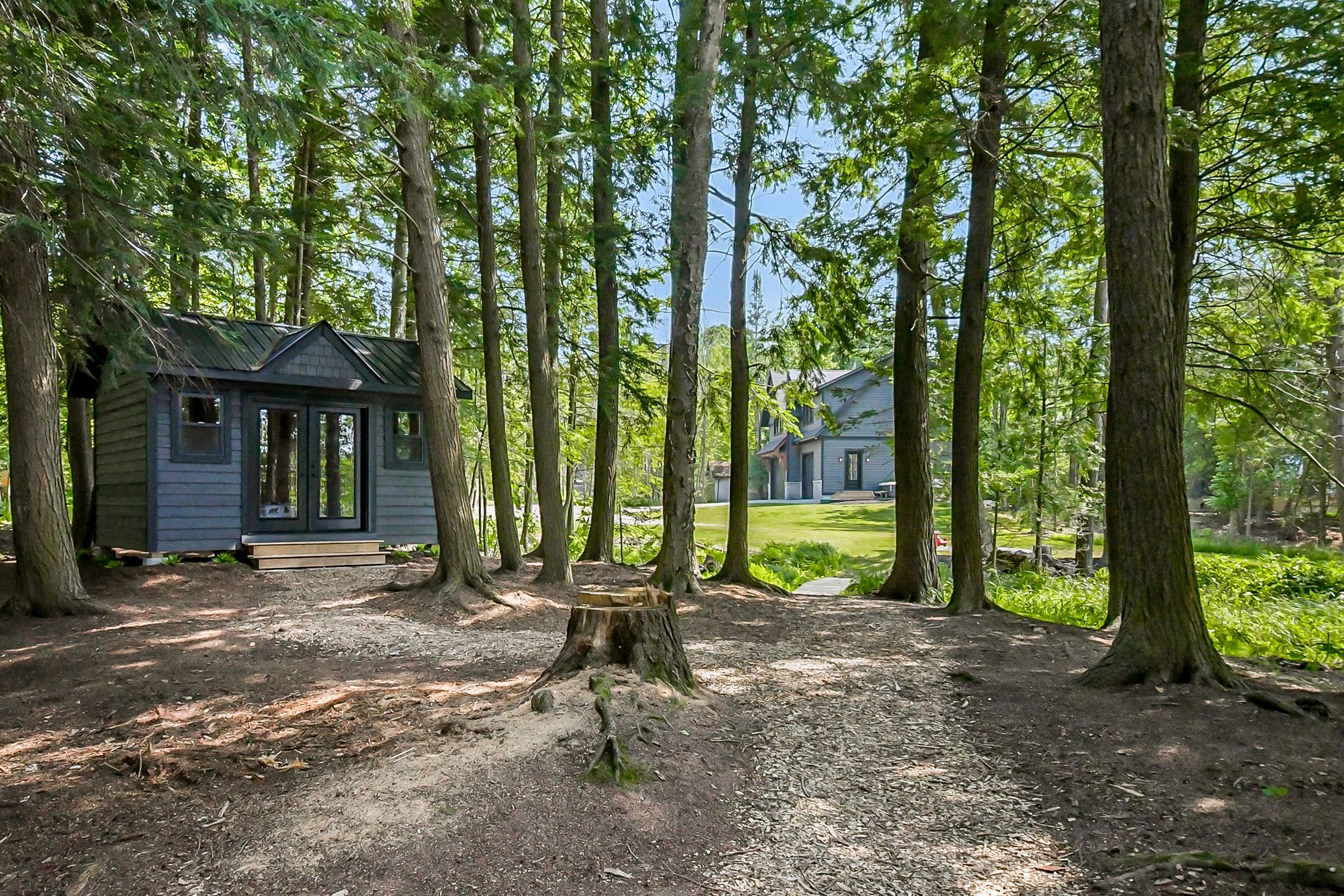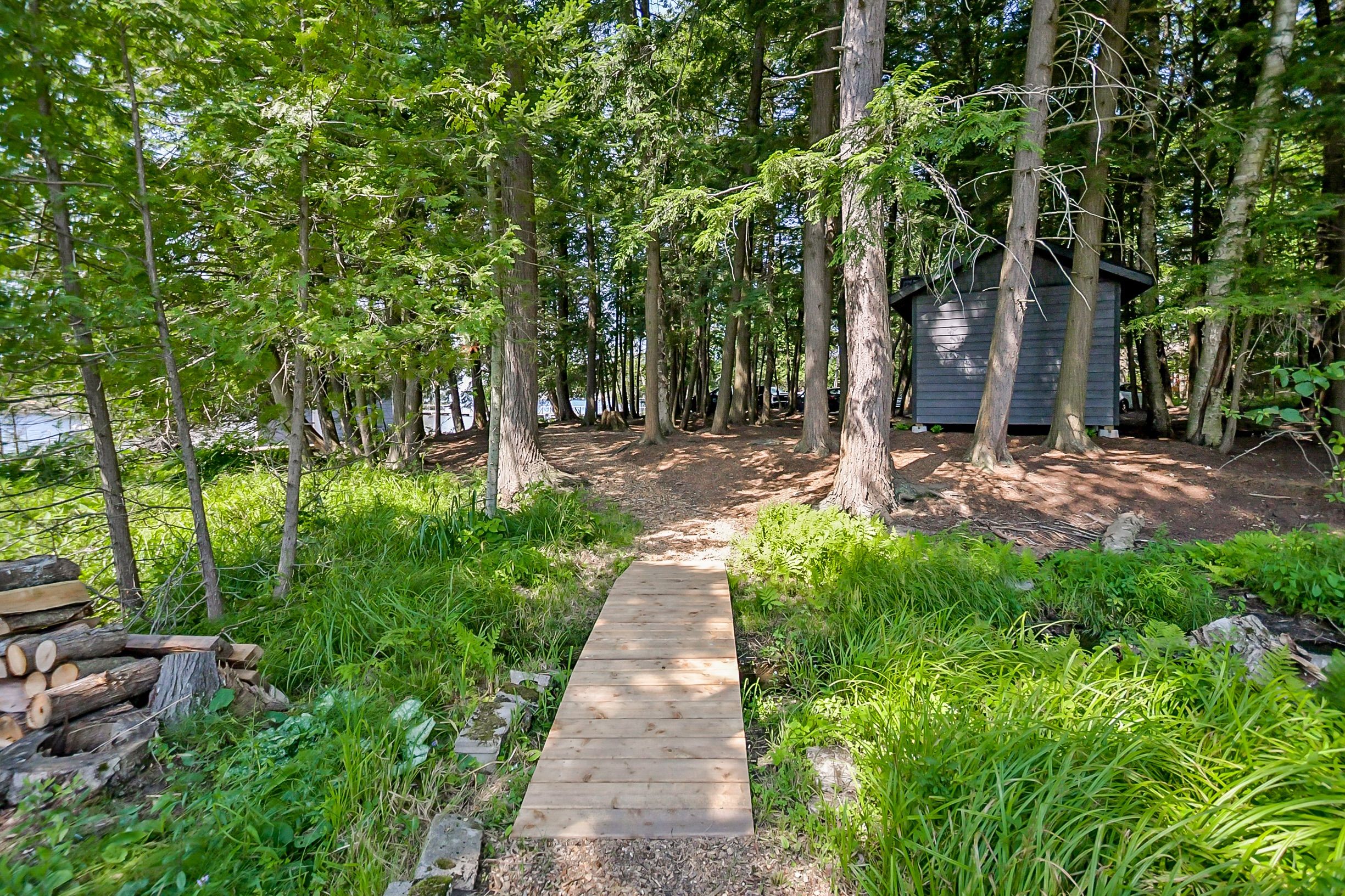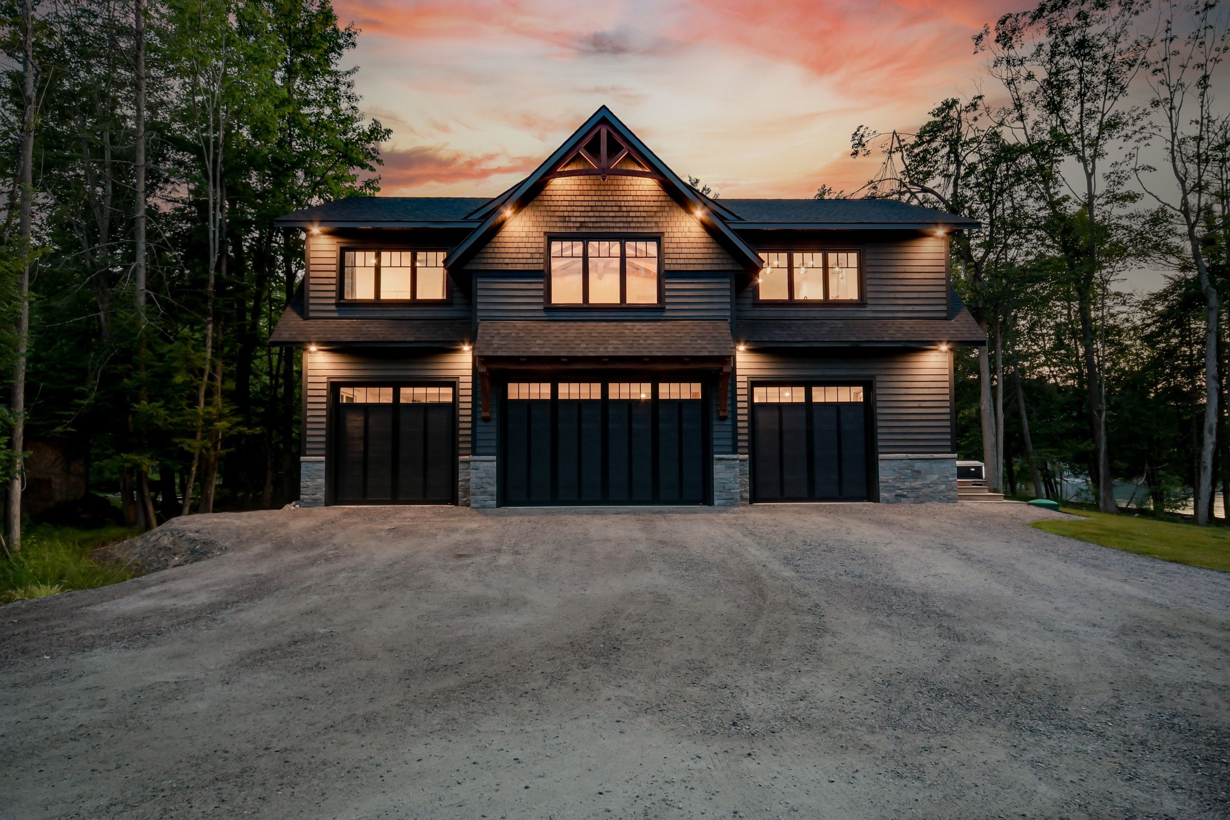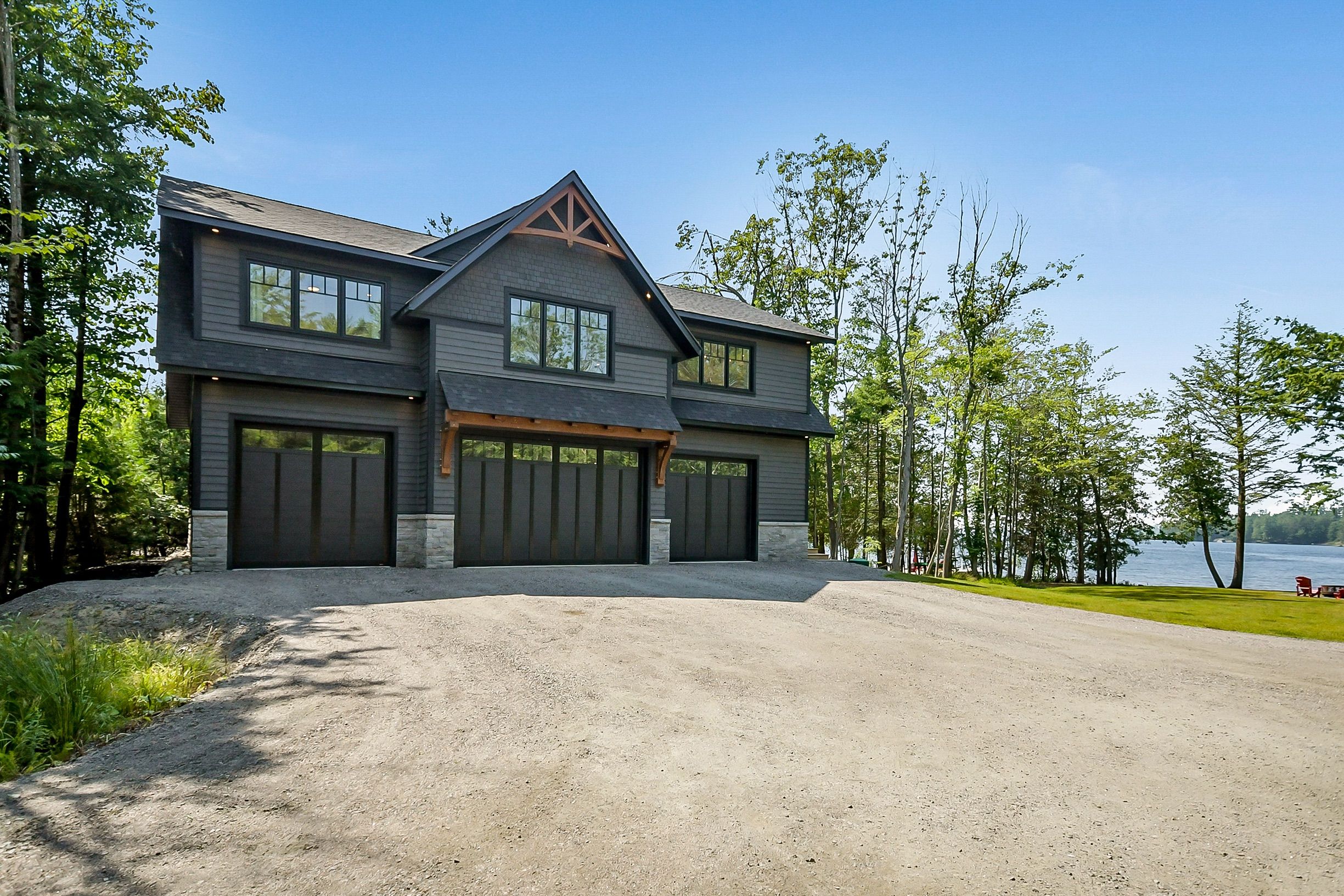 This property was originally Mr. Brydon's property of Brydon's bay! This developer's dream consists of R2 zoning with full municipal services: water, sewer, natural gas and fiber run down your 600' private driveway, very gradual 1.33 acre lot with 270' curved (200' straight line frontage) with coveted NW sunset views and long lake views out the bay. Shallow clean sandy waterfront excellent for pets and people of all ages. Site plan approved for a large attached 5350sqft 2 storey main cottage with 5 bedrooms and 8 additional bathrooms, partially approved and proposed triple boathouse with 2nd storey deck and storage, as well as much more lot coverage available for sports courts, additional storage garages etc. The large luxurious carriage house completed in 2023 is just phase 1 of this spectacular property, with enough parking for 7 cars, its approx. 32' deep and 52' wide, space to park boats and other toys, it also has a convenient dog shower, 2 piece washroom, radiant glycol heated slab and mechanical room. The back garage door was planning ahead for the future main cottage as it provides easy access to the lakeside for machines. The carriage house contains 3 bedrooms and 2 bathrooms upstairs with 9' ceilings throughout, vaulted great room with wood beams, granite floor to ceiling fireplace, decorative shiplap, extensive built in cabinets, very large kitchen and island for entertaining, heated with a high end boiler system and natural gas the efficiency is unlike most cottages. Heated floors in the entrance and bathrooms, glass tile bathtubs with the ensuite having a jacuzzi. Whole home 22kw Generac newly installed in 2025. Matching shed with metal roof just completed in the forested area on the way to the boathouse. The double boathouse is grandfathered and provides good docking. Low boat traffic due to land bridge next door, no neighbors to the East, just islander parking. Incredible Lake Muskoka property, make this your legacy!