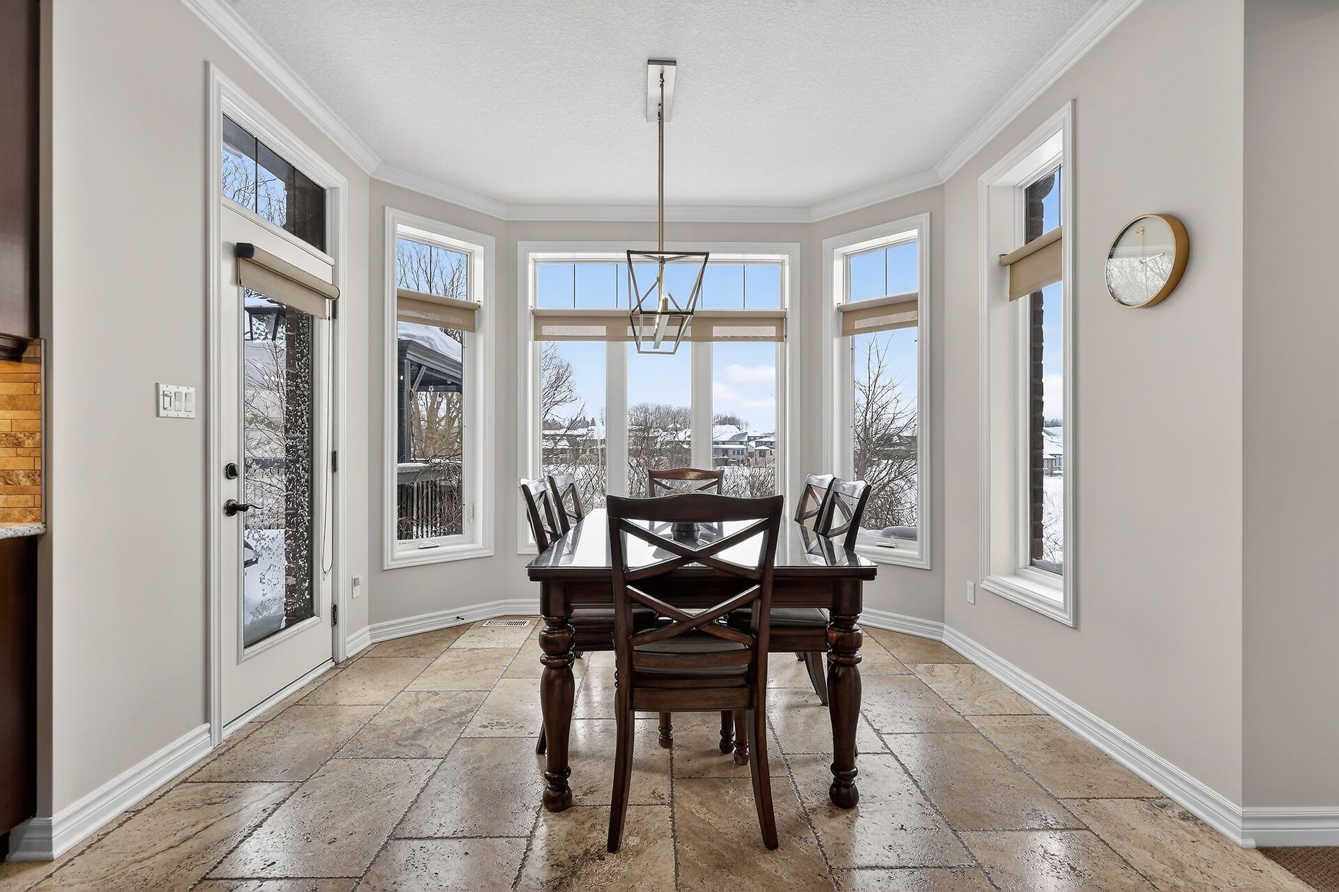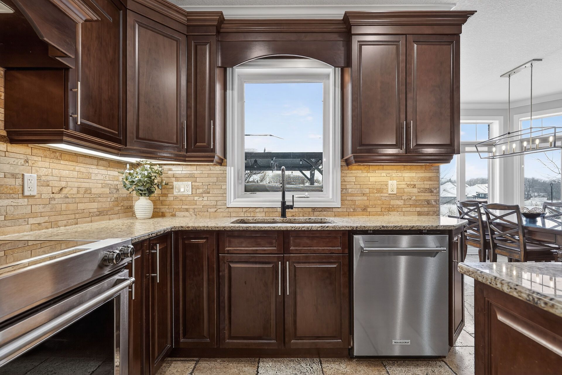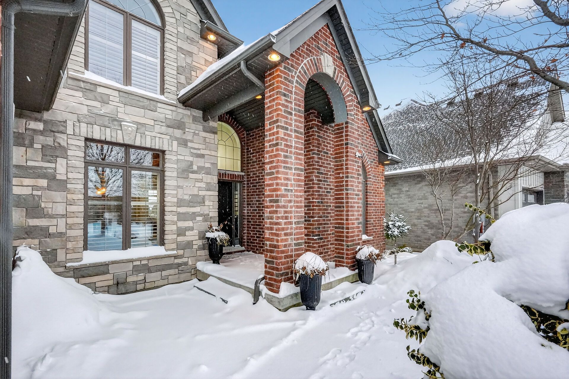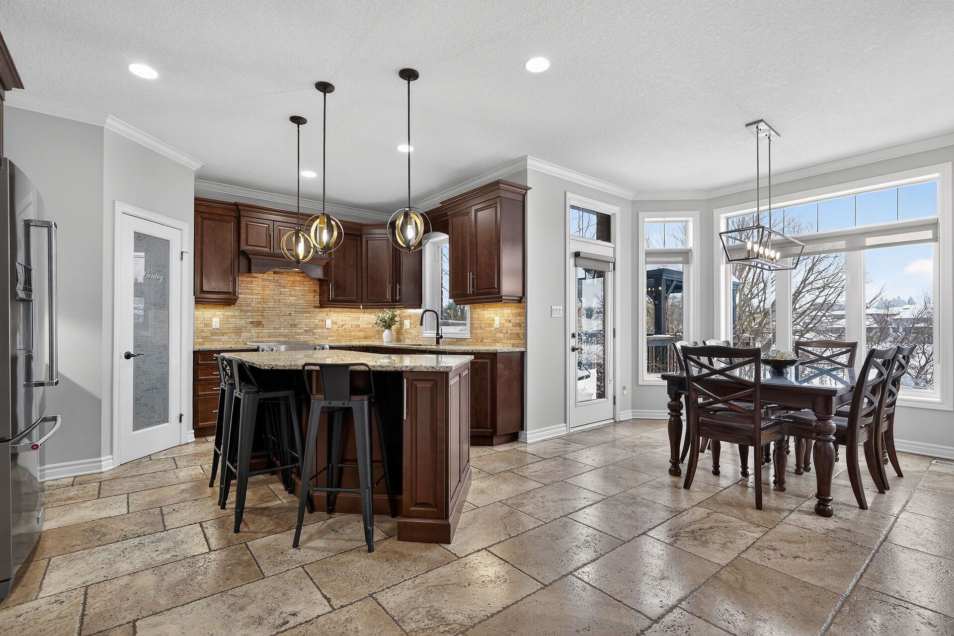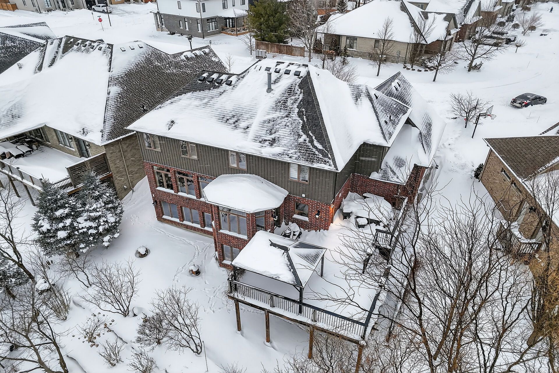 Welcome to 2505 Gatenby Street, ideally located in sought-after Riverbend on one of the neighbourhood's most distinguished streets. This exceptional stone and brick residence sits on a rare pie-shaped lot of nearly 1/4 acre, backing onto mature trees and protected green space for remarkable privacy and a serene ravine setting. Professionally landscaped by Nature's Image, the terraced backyard features mature gardens and a tranquil pond, creating a true outdoor retreat. A full sprinkler system services the front, sides, and rear gardens, complete with app-based remote control. Built in 2012 by respected London builder Aleck Harasym Homes, this residence offers over 4,200 sq ft of finished living space with meticulous attention to detail throughout. The formal main floor includes living, dining, and family rooms accented by warm hardwood floors, crown moulding, window transoms, in-ceiling surround sound, and a striking double-sided gas fireplace. The maple-brown kitchen features granite countertops, a walk-in pantry, octagonal dinette, and new stainless-steel appliances (under warranty). It opens to a wraparound deck overlooking treed views. The extended second-floor deck, updated in 2020, includes under-deck storage. Main-floor laundry includes newer washer and dryer (2021). Additional upgrades include an owned tankless water heater (2021), updated lighting and faucets (2022), rough-in central vacuum, and camera-enabled exterior security. Upstairs, 4 spacious bedrooms await, including an oversized primary retreat with his-and-her closets and a refined five-piece ensuite.The finished walkout basement, renovated in 2022, adds flexibility with two additional bedrooms, a den, 3pc bath, second kitchen, a large office with custom wall unit, and a cozy banquette window-seat nook. Walk directly out to your private backyard sanctuary. Offered far below replacement cost for this lot size and square footage. A rare opportunity in one of Riverbend's most coveted settings.