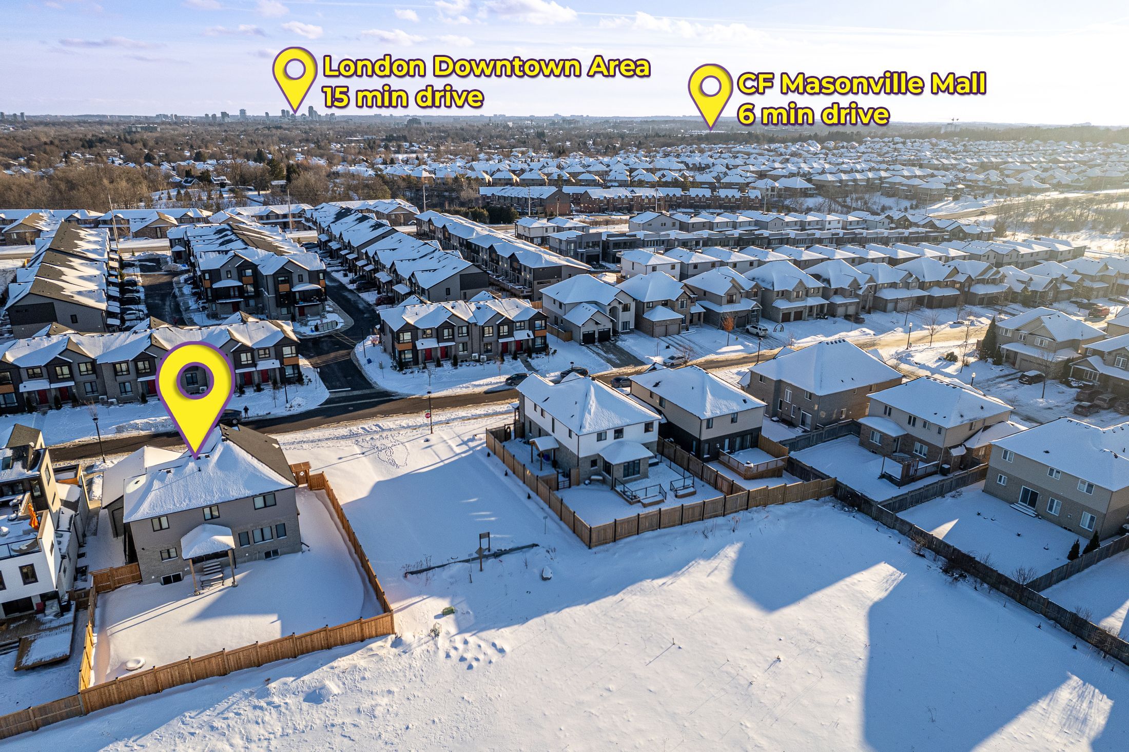 Welcome to 828 Kleinburg Drive, a luxurious 4-bedroom, 2.5-bathroom home offering over 2,700 sq. ft. of sophisticated living in one of London's most sought-after neighbourhoods. This custom-built property features a striking stone-and-stucco façade, black-grilled windows, and a widened concrete driveway, making it a standout on its large corner lot. Inside, the open-concept main floor boasts 9' ceilings, pot lights, hardwood floors, and oversized baseboards. The living room features a floor-to-ceiling tiled gas fireplace, while the great room includes a second gas fireplace. The gourmet kitchen has ceiling-height cabinets, quartz countertops, a large island, a gas range, stainless steel appliances, and a pantry. A bright dinette is located next to the kitchen, with a separate formal dining area for entertaining. This home is equipped with Lutron Caseta light switches throughout, making it a true smart home. Built-in speakers are installed on the main floor (office, living room, and family room) and in the second-floor bathrooms, all managed with Lutron smart audio remotes. The Google Nest smart thermostat, smoke detectors, and Ring security system enhance the home's security and convenience. Upstairs, you'll find four spacious bedrooms, including a primary suite with a walk-in closet and a spa-like en-suite with in-floor heating, double sinks, and a glass-enclosed shower. The second bathroom also has in-floor heating for added comfort. All bedrooms are fitted with Lutron Serena automated blinds. Additional upgrades include a Tesla charger in the garage and a modern fence for privacy. The house is available furnished or unfurnished to meet your needs. Please note that the basement is rented separately (Currently vacant)
