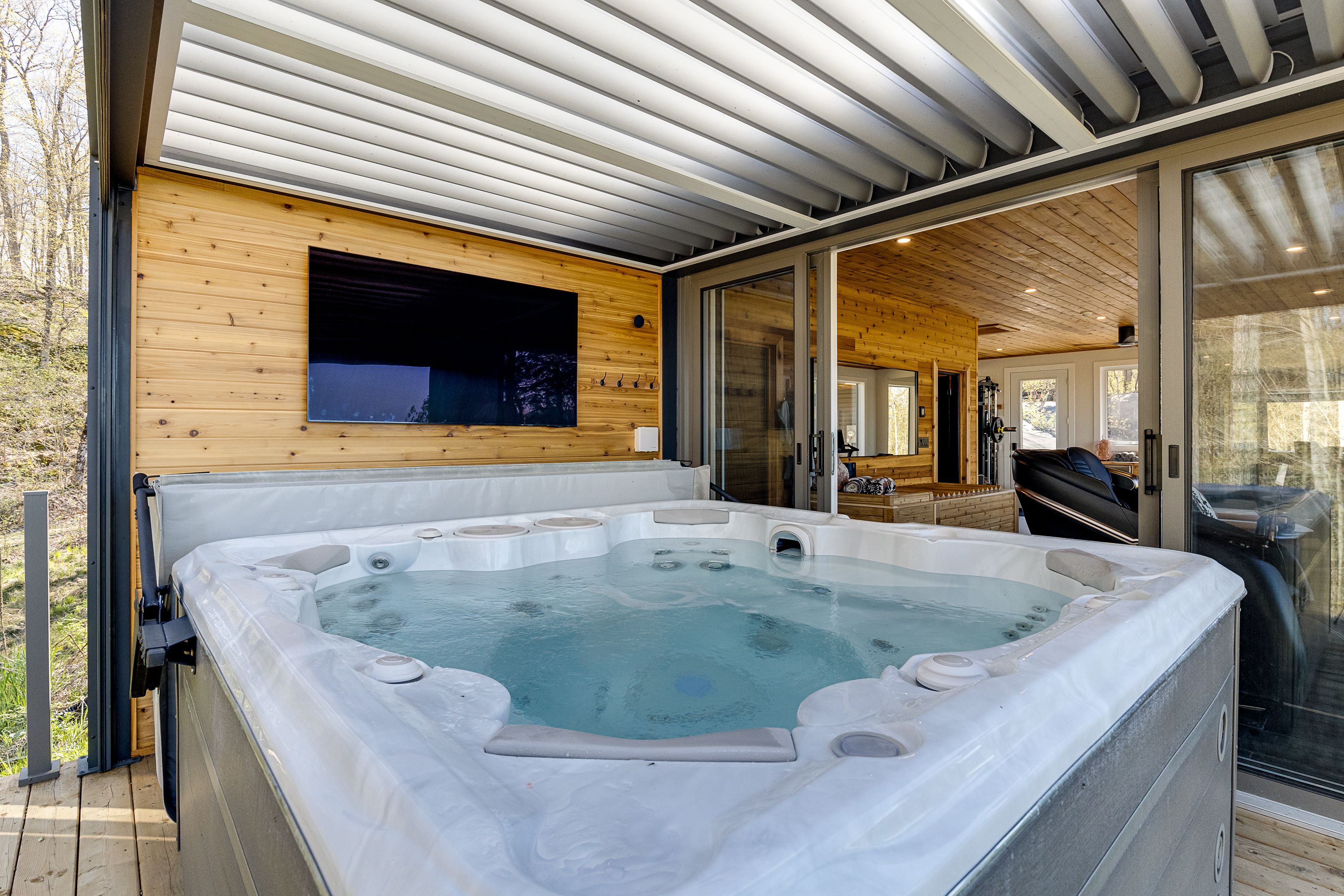 - Exterior Features: Deck, Landscape Lighting, Landscaped, Lawn Sprinkler System, Patio, Privacy, Porch, Year Round Living, Hot Tub