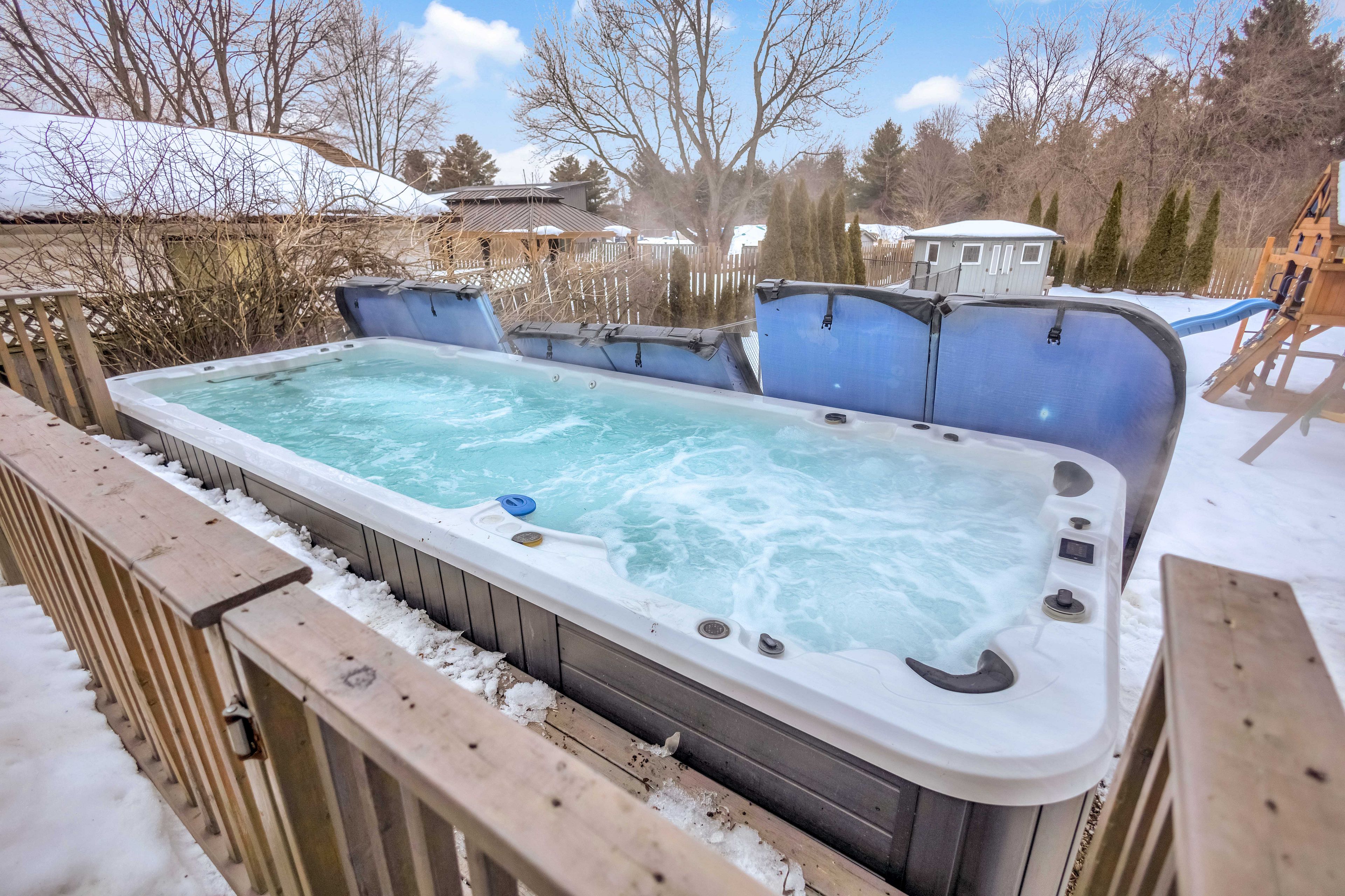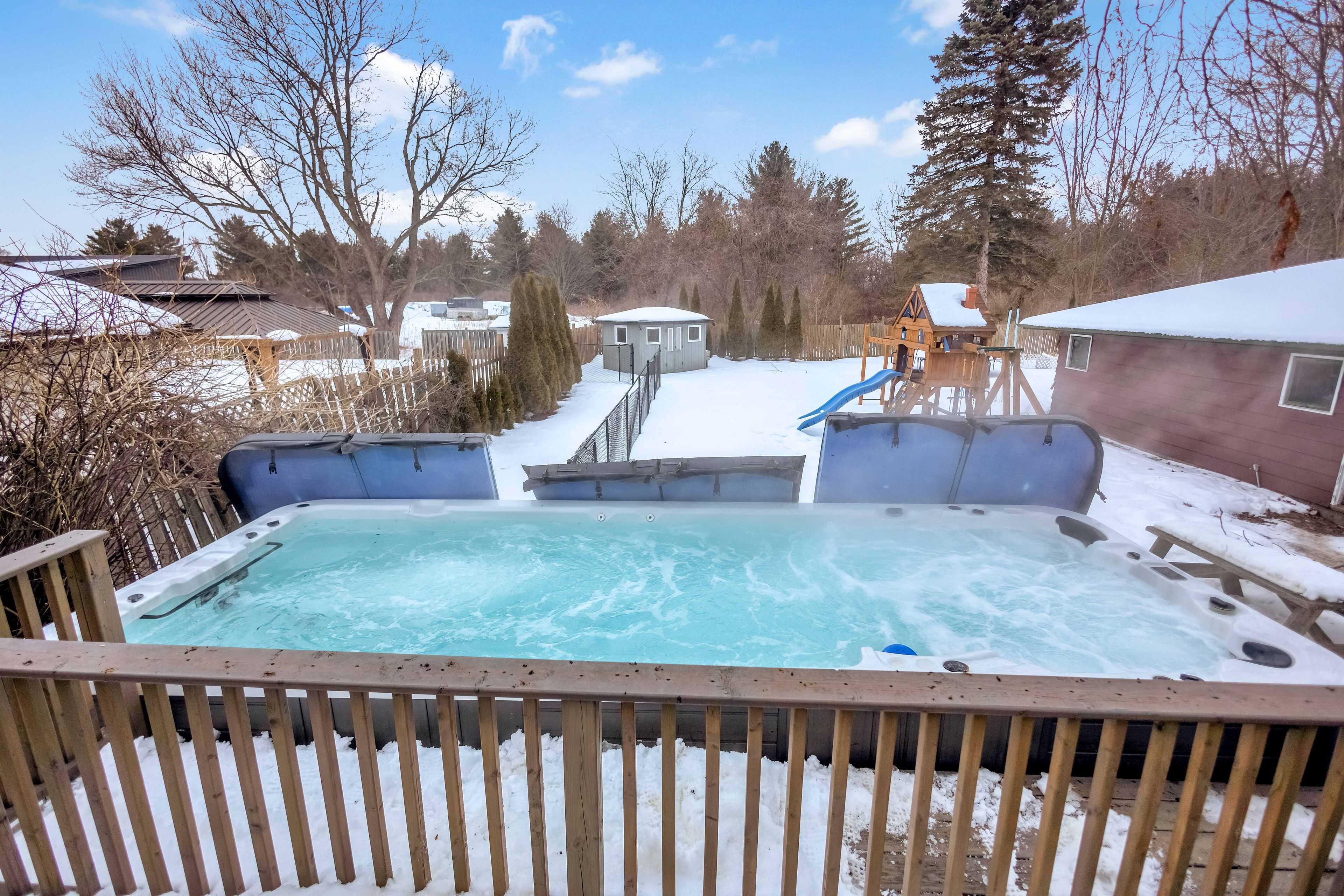 Tucked along one of the most desirable edge-of-city corridors between Ancaster and Hamilton, this exceptional bungalow offers a lifestyle defined by space, privacy, and effortless comfort. Set on an impressive 75' x 200' estate-style property, the home enjoys a peaceful setting surrounded by mature landscapes with fully fenced yard (2021) and open skies - creating the feeling of country living while remaining moments from premier amenities, commuter routes, and everyday conveniences. Inside, a sun-filled open-concept layout creates a warm and welcoming atmosphere where the living, dining, and kitchen areas blend seamlessly - designed equally for relaxed daily living and entertaining. Three well-appointed bedrooms and a 4-piece bath complete the main level. The finished lower level extends the home's versatility, featuring a spacious recreation room anchored by a gas fireplace, along with a private suite ideal for guests, multigenerational living, or a refined home office, complete with ensuite that has key fixtures already installed and remaining finishes ready for customization. Outdoors, the property transforms into a private retreat. A large deck overlooks the expansive backyard where a newer year-round 19 foot swim spa (2020) provides both relaxation and fitness in every season. The oversized detached garage accommodates up to four vehicles and offers exceptional flexibility for collectors, hobbyists, or workshop use. Located minutes from Ancaster Meadowlands shopping, conservation trails, golf, and highway access, this property delivers the rare opportunity to enjoy a tranquil setting without sacrificing connectivity. A refined country-inspired lifestyle - right at the city's edge.