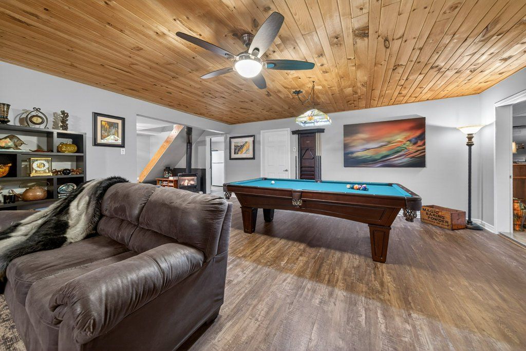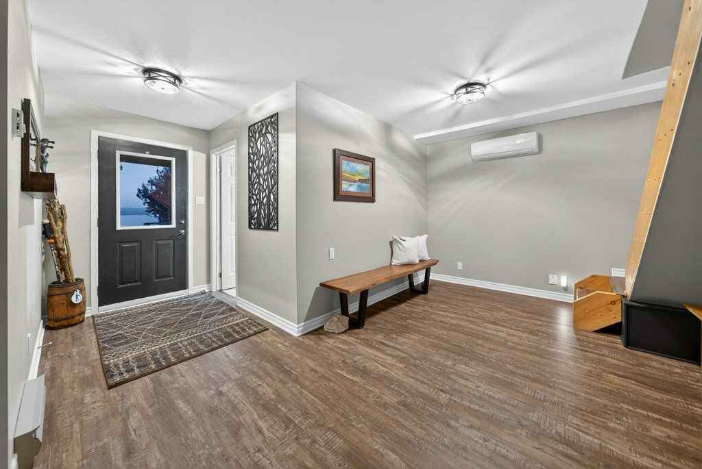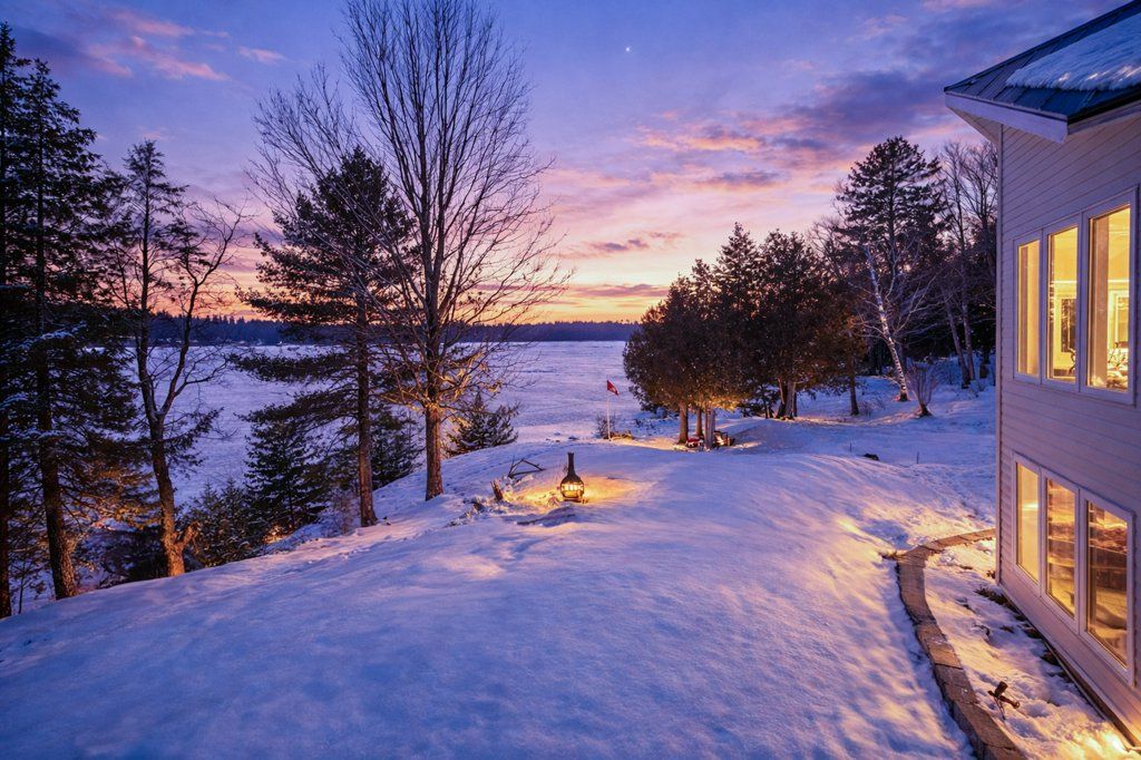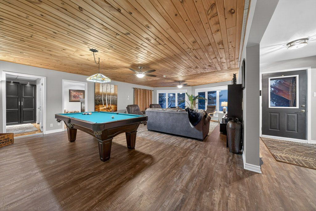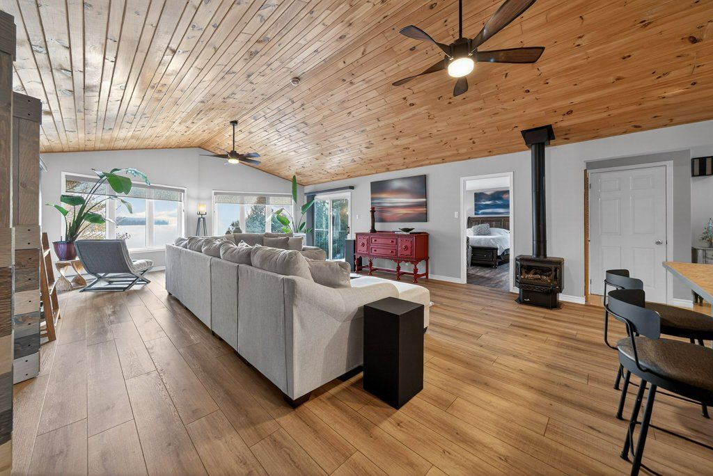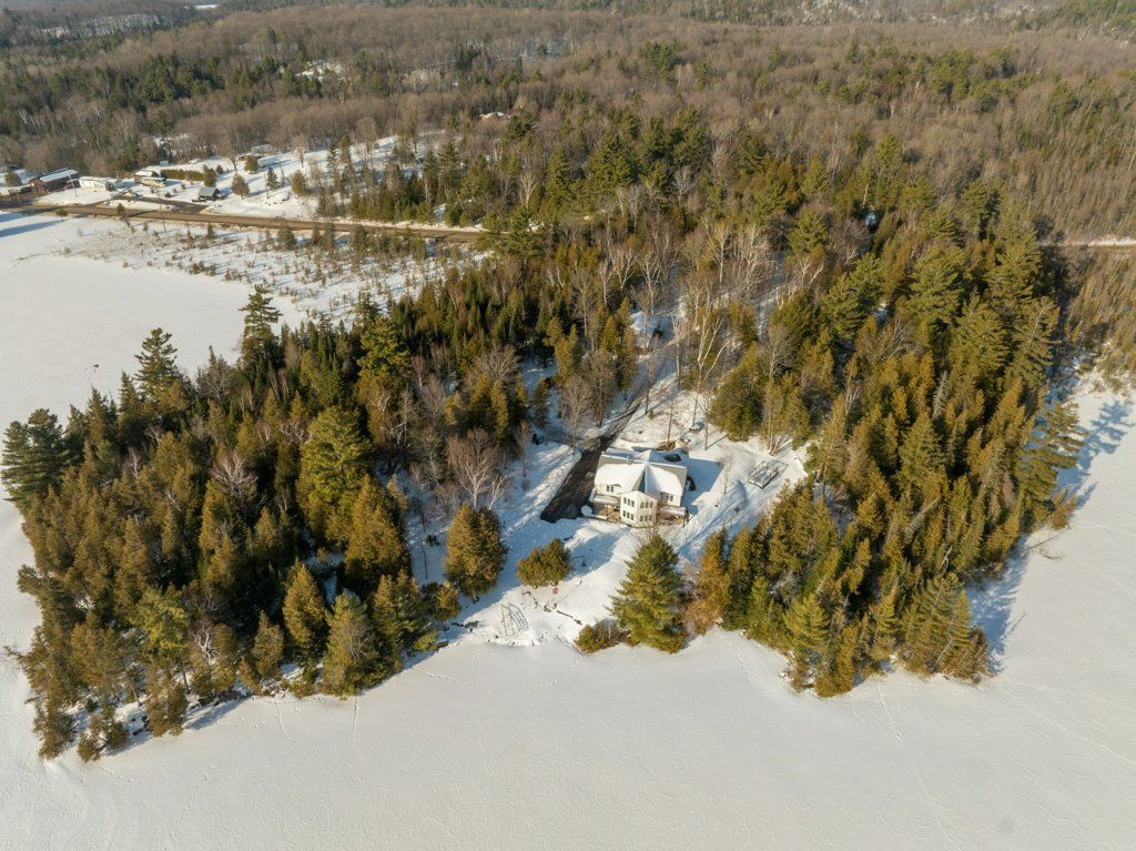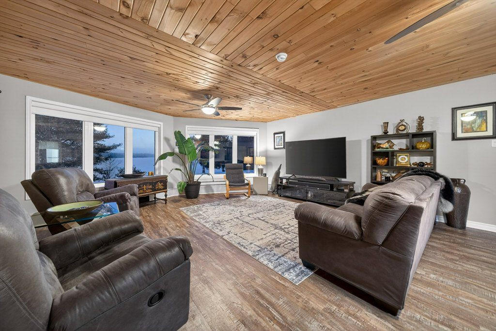 Experience the pinnacle of refined recreational living on this private 8.2-acre peninsula, boasting an extraordinary 548 feet of pristine waterfront. This meticulously curated waterfront residence seamlessly blends rugged natural beauty with tastefully curated interior upgrades, offering a turnkey sanctuary designed for the modern era.The heart of the home features an expansive open-concept kitchen and a glorious vaulted ceiling living room, where wall-to-wall views frame the daily masterpiece of the sunset. Step across engineered hardwood floors to find a residence built for ease, featuring custom power blinds, signature double-bifold barn doors, and a wellness-focused climate system powered by two new heat pumps (2026). The layout flows effortlessly with entry foyer, open concept living room with fireplace and walk- out to two lakefront decks, custom designed kitchen with centre island, new appliances; 2 bedrooms on the main level including primary bedroom & 4pce ensuite with laundry, a separate dining room with cove molding w/back light, electric fireplace and lakefront views, a lower level 519 sq. ft. recreation and games room-complete with pool and ping-pong tables, 2 additional bedrooms, and 3 pce bathroom, lake front walk out and large storage & utility rooms - perfect for hosting at scale.The transition to the outdoors is impeccable. Expansive decking with wide stairs leading to landscaped gardens to a new dock and swim platform at the lake. For the hobbyist, the oversized 1,276 sq. ft. detached garage is a standout feature, offering a workshop and ample space for a car collection or all-terrain vehicles.Whether you are exploring private trails, gathering at the waterfront fire pit, or enjoying the breeze from the Global Dec-K-ing balconies, this resilient property offers a "purpose-driven" lifestyle that is increasingly rare. Extra Special !!! - As there is potential for 3acre severance for a family compound, maintaining privacy for all!!!