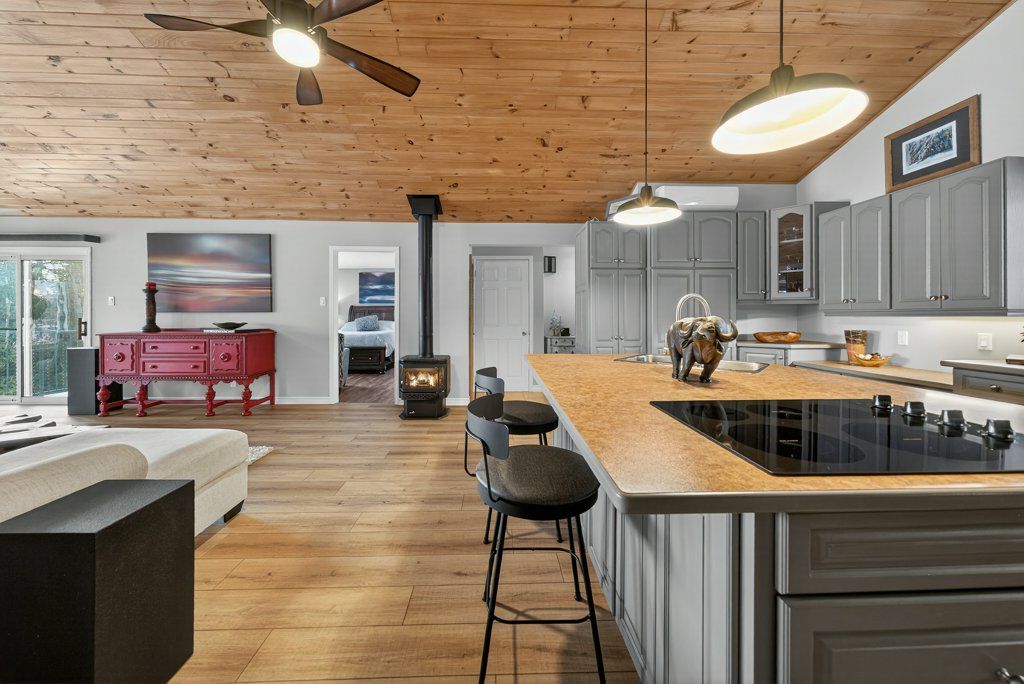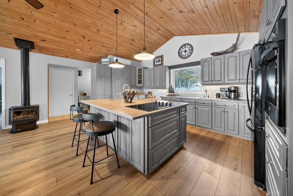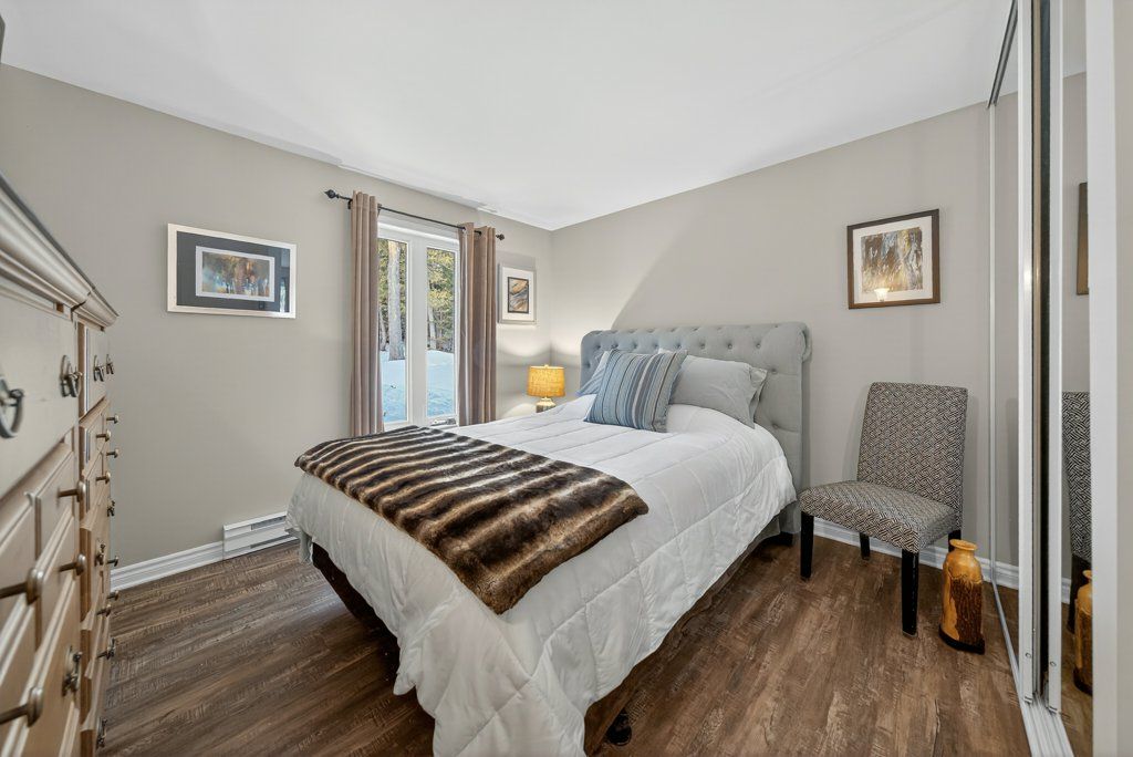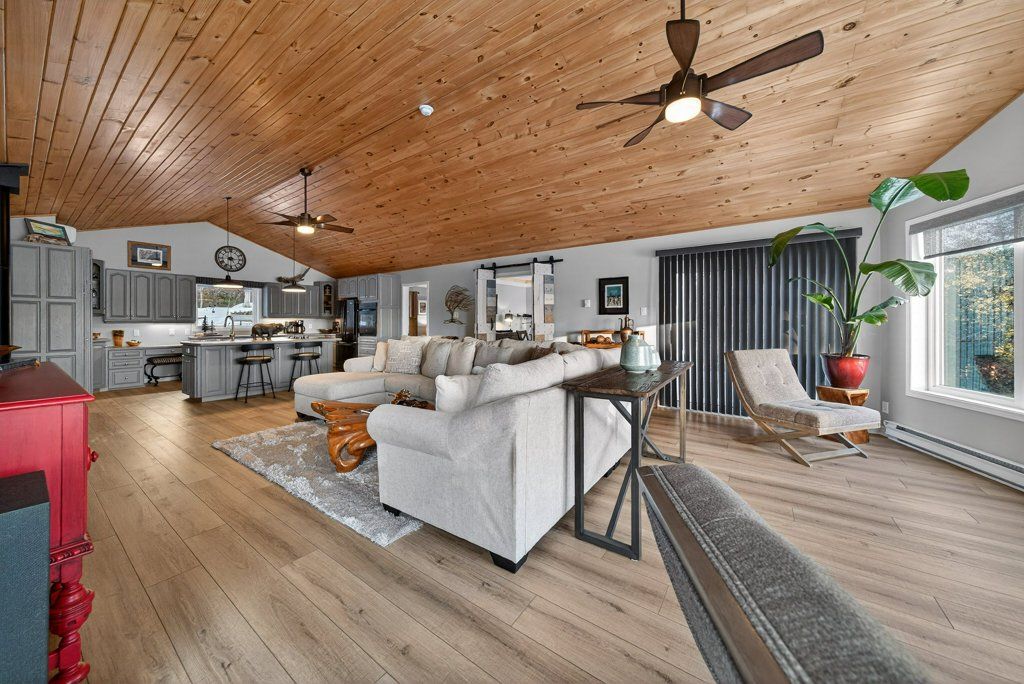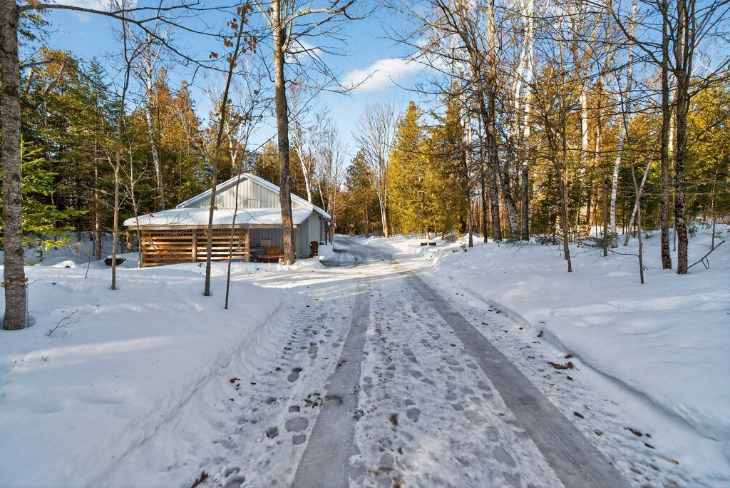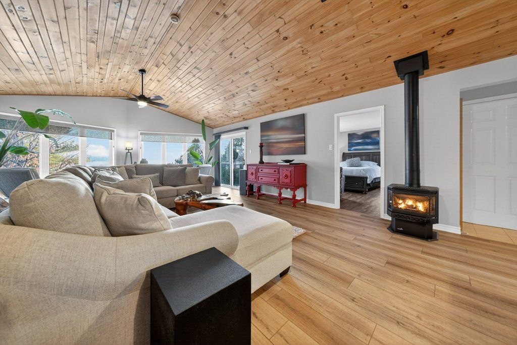 Experience the pinnacle of refined recreational living on this private 8.2-acre peninsula, boasting an extraordinary 548 feet of pristine waterfront. This meticulously curated waterfront residence seamlessly blends rugged natural beauty with tastefully curated interior upgrades, offering a turnkey sanctuary designed for the modern era.The heart of the home features an expansive open-concept kitchen and a glorious vaulted ceiling living room, where wall-to-wall views frame the daily masterpiece of the sunset. Step across engineered hardwood floors to find a residence built for ease, featuring custom power blinds, signature double-bifold barn doors, and a wellness-focused climate system powered by two new heat pumps (2026). The layout flows effortlessly with entry foyer, open concept living room with fireplace and walk- out to two lakefront decks, custom designed kitchen with centre island, new appliances; 2 bedrooms on the main level including primary bedroom & 4pce ensuite with laundry, a separate dining room with cove molding w/back light, electric fireplace and lakefront views, a lower level 519 sq. ft. recreation and games room-complete with pool and ping-pong tables, 2 additional bedrooms, and 3 pce bathroom, lake front walk out and large storage & utility rooms - perfect for hosting at scale.The transition to the outdoors is impeccable. Expansive decking with wide stairs leading to landscaped gardens to a new dock and swim platform at the lake. For the hobbyist, the oversized 1,276 sq. ft. detached garage is a standout feature, offering a workshop and ample space for a car collection or all-terrain vehicles.Whether you are exploring private trails, gathering at the waterfront fire pit, or enjoying the breeze from the Global Dec-K-ing balconies, this resilient property offers a "purpose-driven" lifestyle that is increasingly rare. Extra Special !!! - As there is potential for 3acre severance for a family compound, maintaining privacy for all!!!