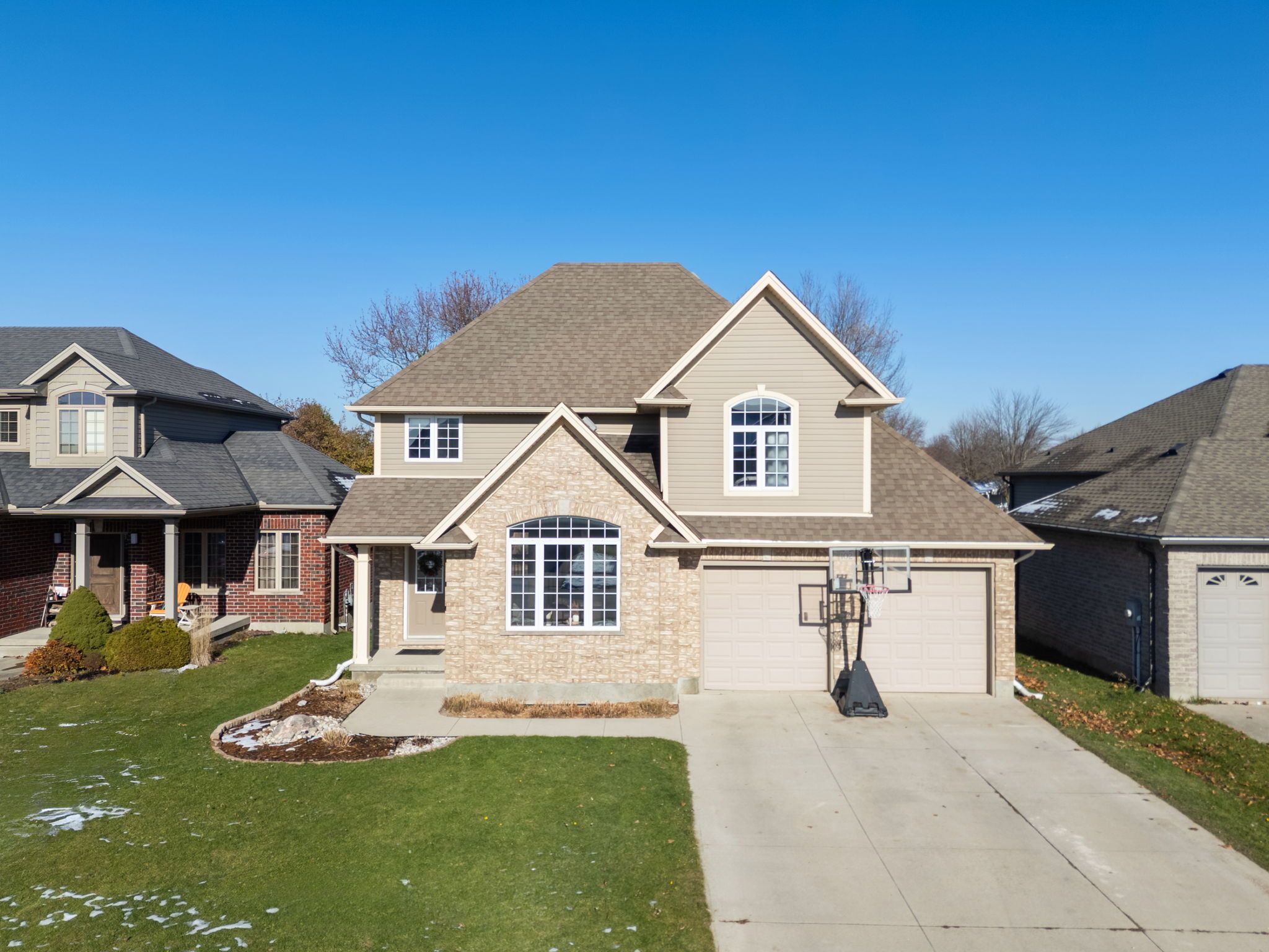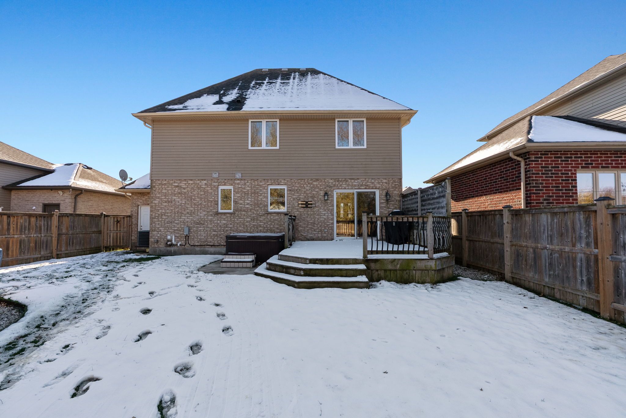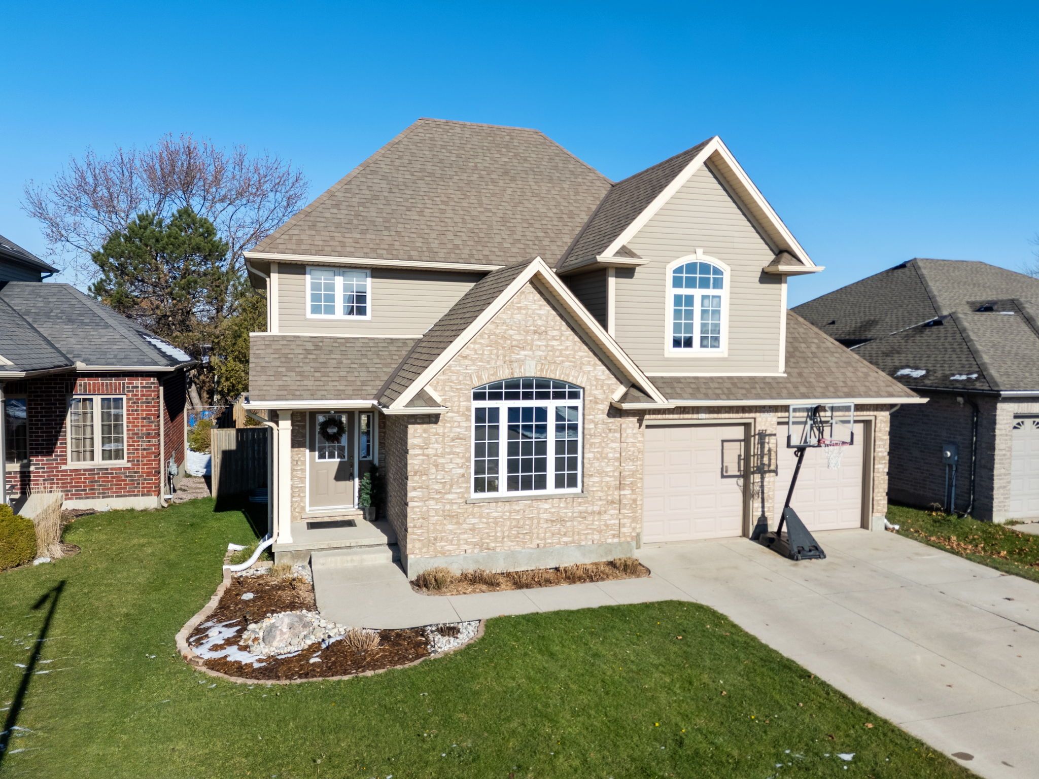 Welcome to this beautiful Timothy custom-built home located in the highly sought-after Saintsbury Estates in Lucan. Built when lots were larger, this property sits on an oversized lot crafted by a high-end builder and designed with young families in mind. Inside, the spacious open-concept main floor features tile flooring that flows through the foyer, dining area, and kitchen. The kitchen offers exceptional functionality with generous counter space, a pantry, and plenty of extra cabinetry. Bright natural light fills the dining room, complete with patio doors leading to the backyard deck. The main floor continues with a warm and inviting living room showcasing a large front window, a nicely sized laundry room with recent shelving upgrades, a convenient 2-piece bathroom, and access to the attached two-car garage. Upstairs, you'll find two comfortable bedrooms and a large cheater bathroom leading to the impressive primary bedroom, which includes a walk-in closet. The basement is mostly finished, offering a cozy recreation room with brand-new carpet and a utility/storage area with ample space. Outside, the fully fenced, oversized backyard is perfect for family fun and entertaining. Enjoy the deck, relax in the hot tub, or cool off in the 13x25 oval above-ground pool featuring a stylish wood exterior. A mounted TV near the deck lets you catch the game from the pool or hot tub-your own personal outdoor oasis. This home has wonderful curb appeal with a double-wide concrete driveway and a beautifully landscaped front yard. You'll love living in Lucan, just 20 minutes from London and home to a new grocery store, restaurants, shopping, and outstanding community amenities, including soccer fields, baseball diamonds, a community centre, and a hockey arena. Book your showing today before this exceptional home in Lucan's most desirable subdivision is gone!