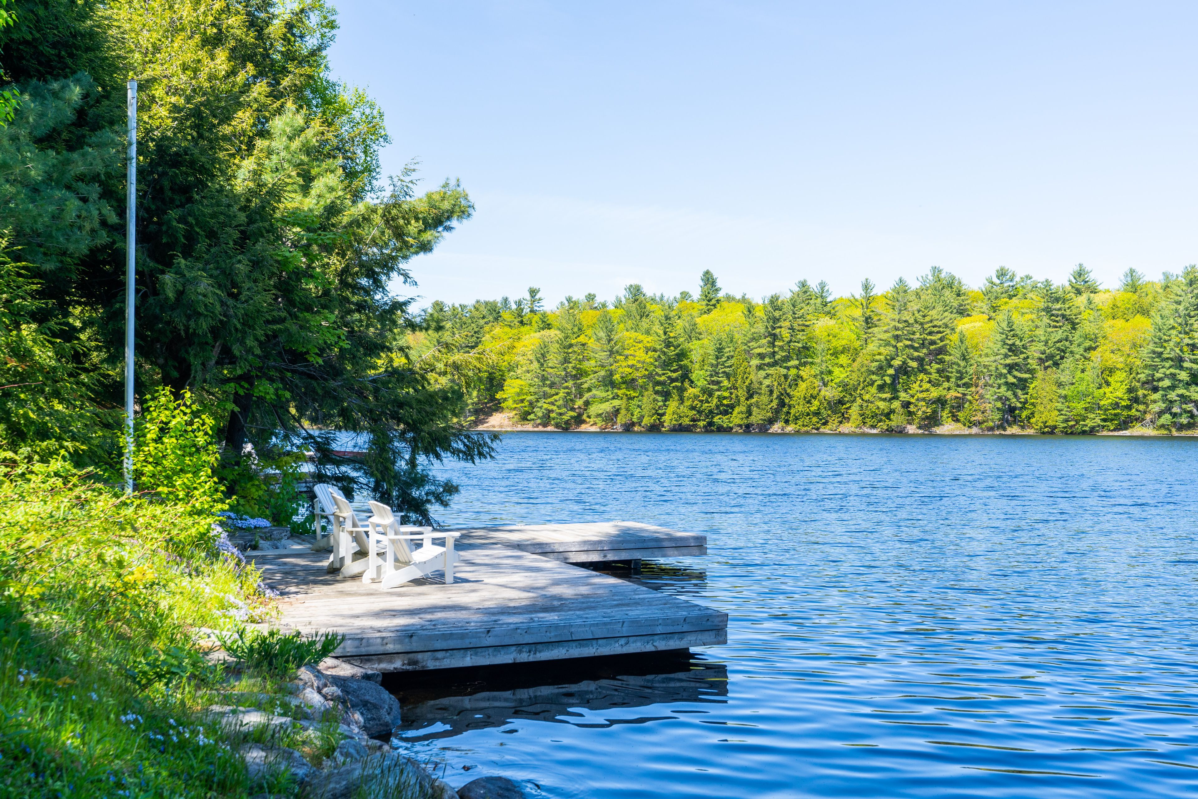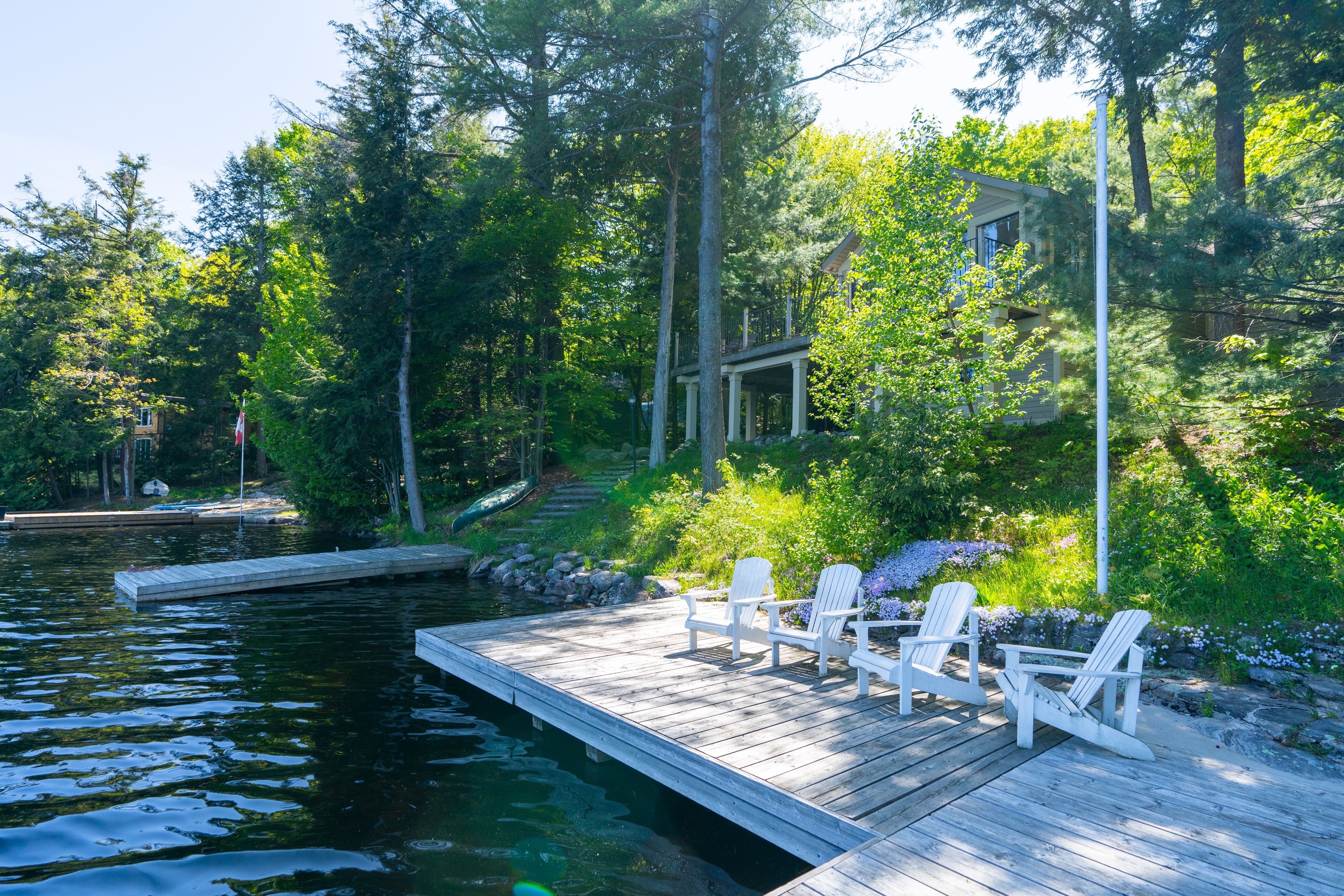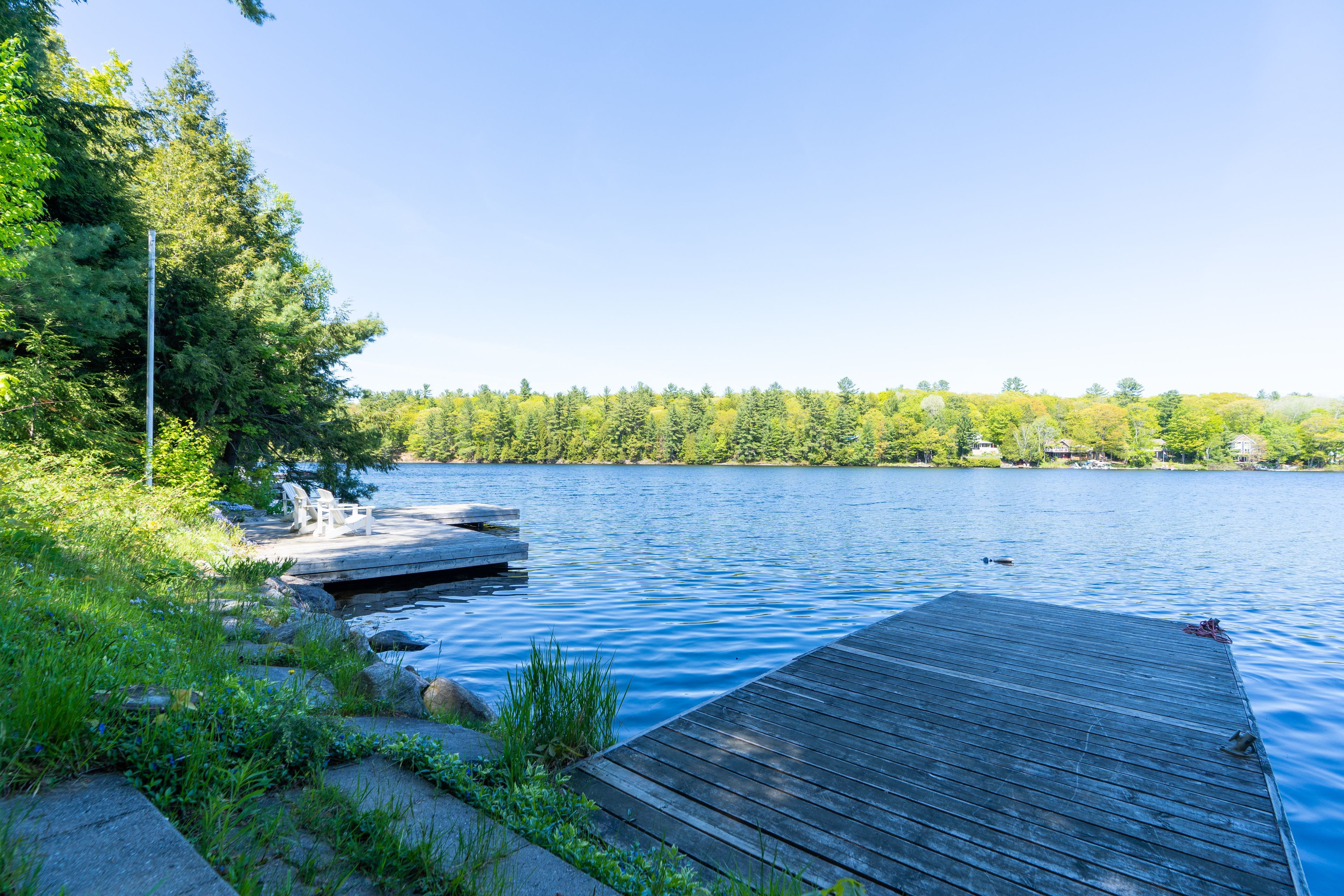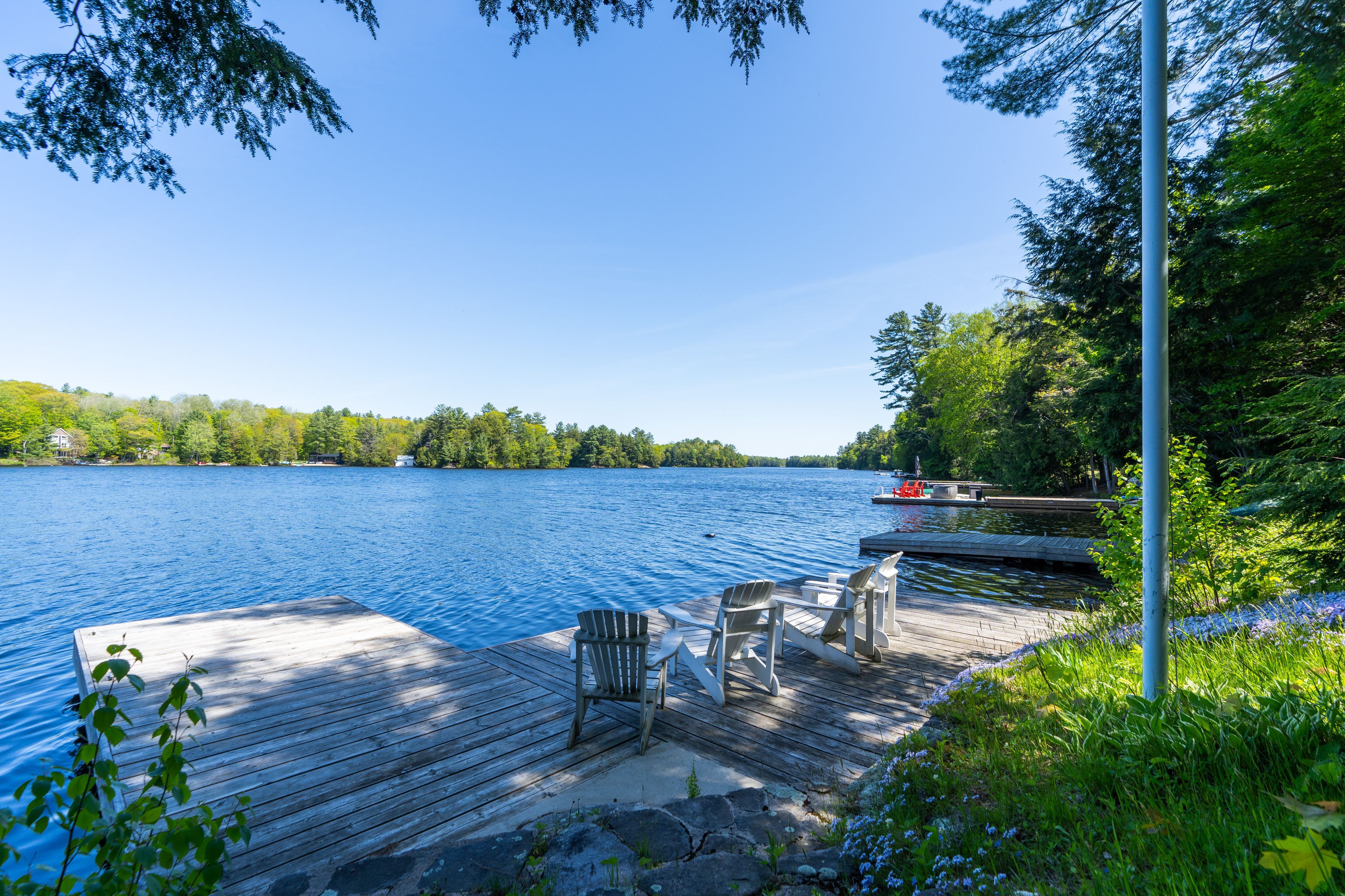 Welcome to this stunning 3-bedroom, 3-bathroom waterfront retreat on the shores of Bass Lake. Designed for both relaxation and entertaining, this home offers an inviting dining area and a spacious living room, each framed by picturesque lake views that bring the outdoors in. The open-concept kitchen flows seamlessly into the main living spaces, making it ideal for hosting family and friends. Generous bedrooms provide comfort and privacy, including a serene primary suite with breathtaking views of the water. Start your mornings with coffee on the dock as the sun rises over the lake, and spend your evenings entertaining on the expansive wrap-around deck. With 108 feet of private waterfront and two docks, this property delivers the ultimate Muskoka lifestyle. Centrally located in the heart of Muskoka, just minutes from Port Carling and Port Sandfield, this is a rare opportunity to own a true waterfront escape