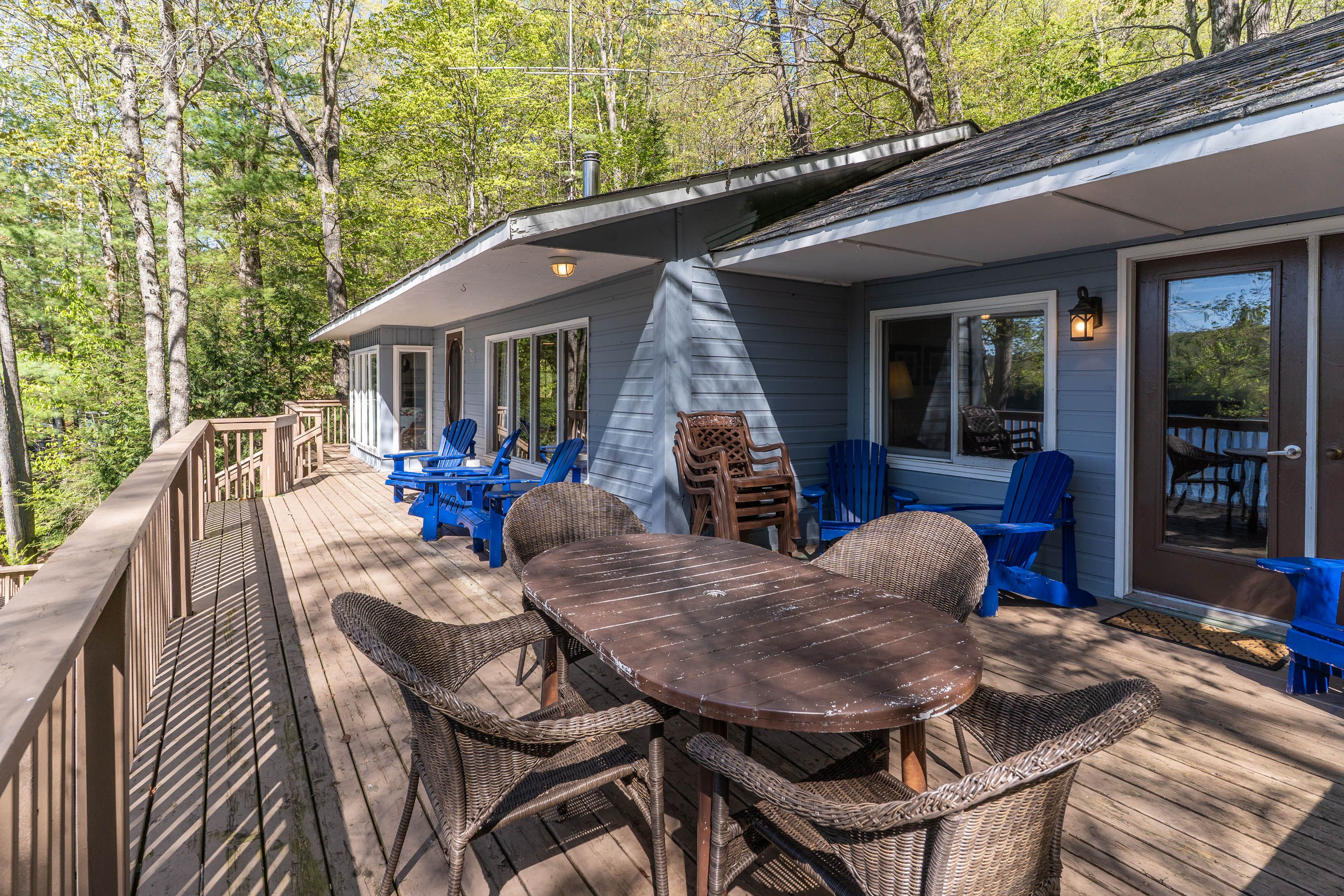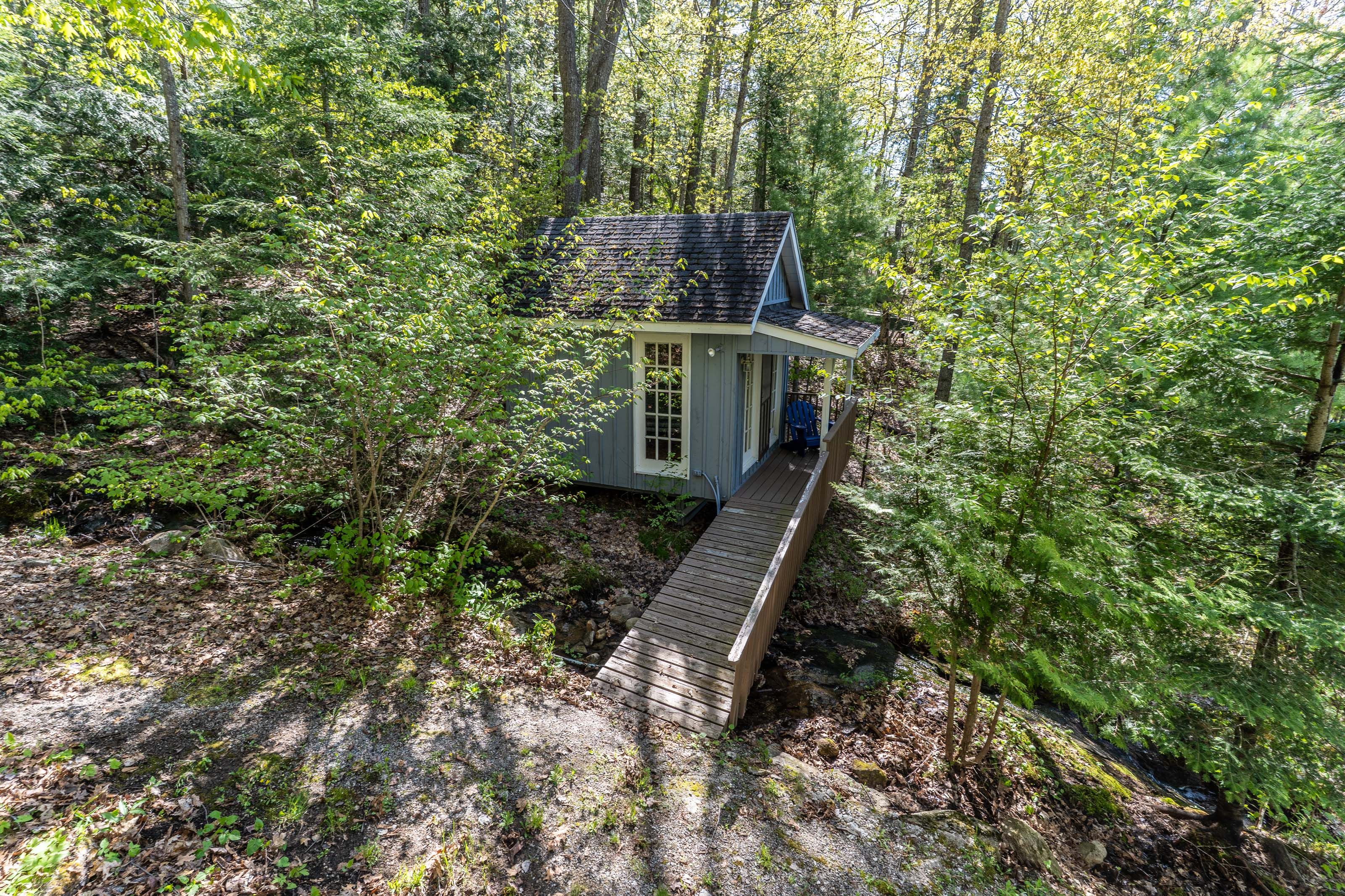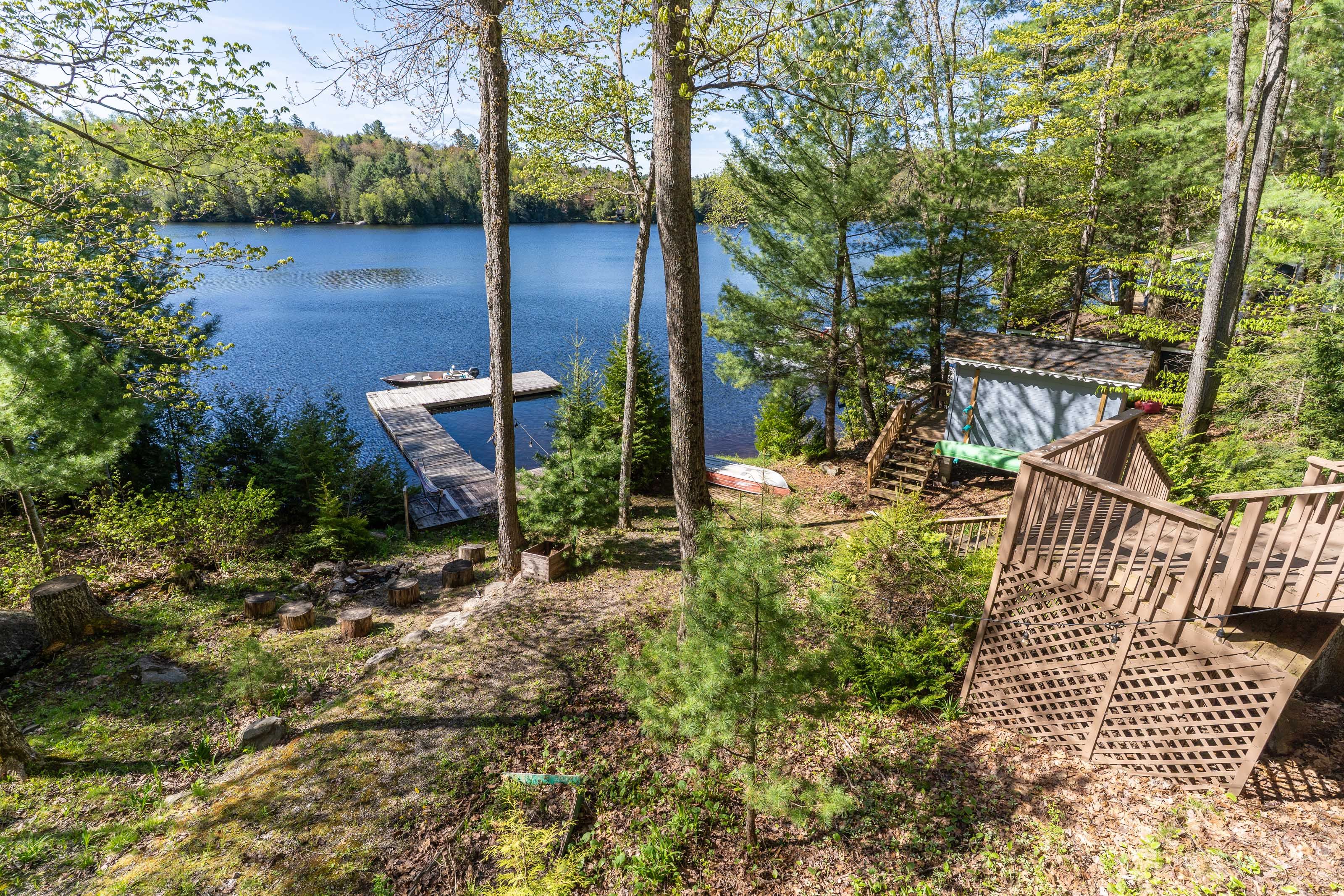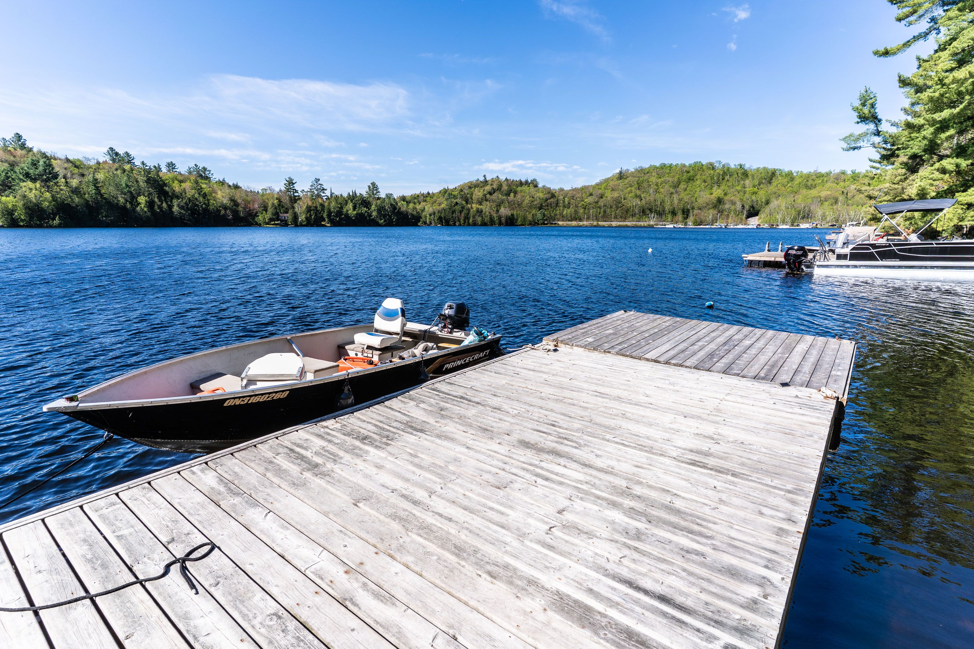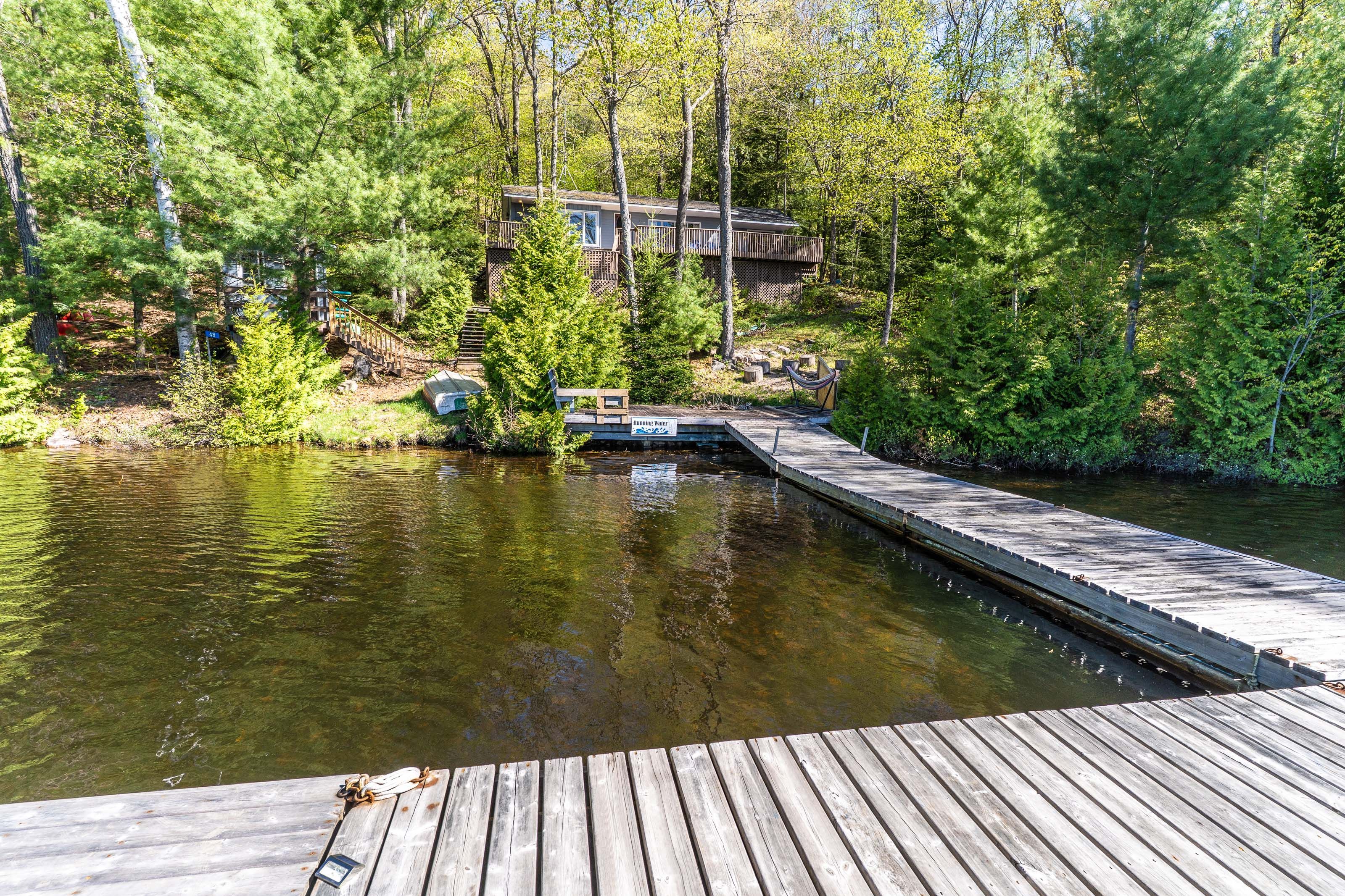 Charming waterfront retreat on Raven Lake. Fully Furnished! Welcome to your private lakeside paradise with 141 feet of waterfront on sought-after Raven Lake. Set in a tranquil bay, just a short 1-minute boat ride from your own private boat slip, this fully furnished 3-bedroom cottage + large bunkie offers the perfect blend of rustic charm and modern comfort.The main cottage features an open-concept layout with stunning lake views from the kitchen and living room with a walkout to a large sundeck. The primary bedroom is executive-size, and all bedrooms boast new laminate flooring (installed 2 years ago). A quaint stream with a picturesque bridge runs through the property from spring until late July, adding to the serene ambiance. Professionally rebuilt over the last 25 years and supported by solid concrete and wooden piers. Electric baseboard heaters and a cozy wood stove provide warmth throughout. A 3-piece bathroom with laundry, fully equipped kitchen and pine accents enhance the cottage vibe. There is a water purification system (with UV and reverse osmosis) and septic system. High speed internet is available, and newer appliances and furnishings are included. Outdoors, enjoy a large deck wrapping around the front and sides of the cottage, perfect for soaking in gorgeous lake views and nature. The property includes a cedar sauna in the pump house, a spacious workshop man cave with fridge and workbench and a large wooden L-shaped dock with a swim ladder. Bonus: Ownership includes a transferable membership and dock slip with Raven Lake Dock Association (valued at ~$10,000 & annual fees of $700). Negotiable: Trailer and 2006 20 ft Pontoon Boat, Make/Model is Misty Harbor, 50 HP outboard motor in very good condition with newer upholstery on seats in 2022. Only 5 minutes to Dorset, 30 min to Huntsville & Minden and 45 min to Bracebridge and Algonquin Park. This turn-key property is ready for you - just bring your suitcase and start your memories here!