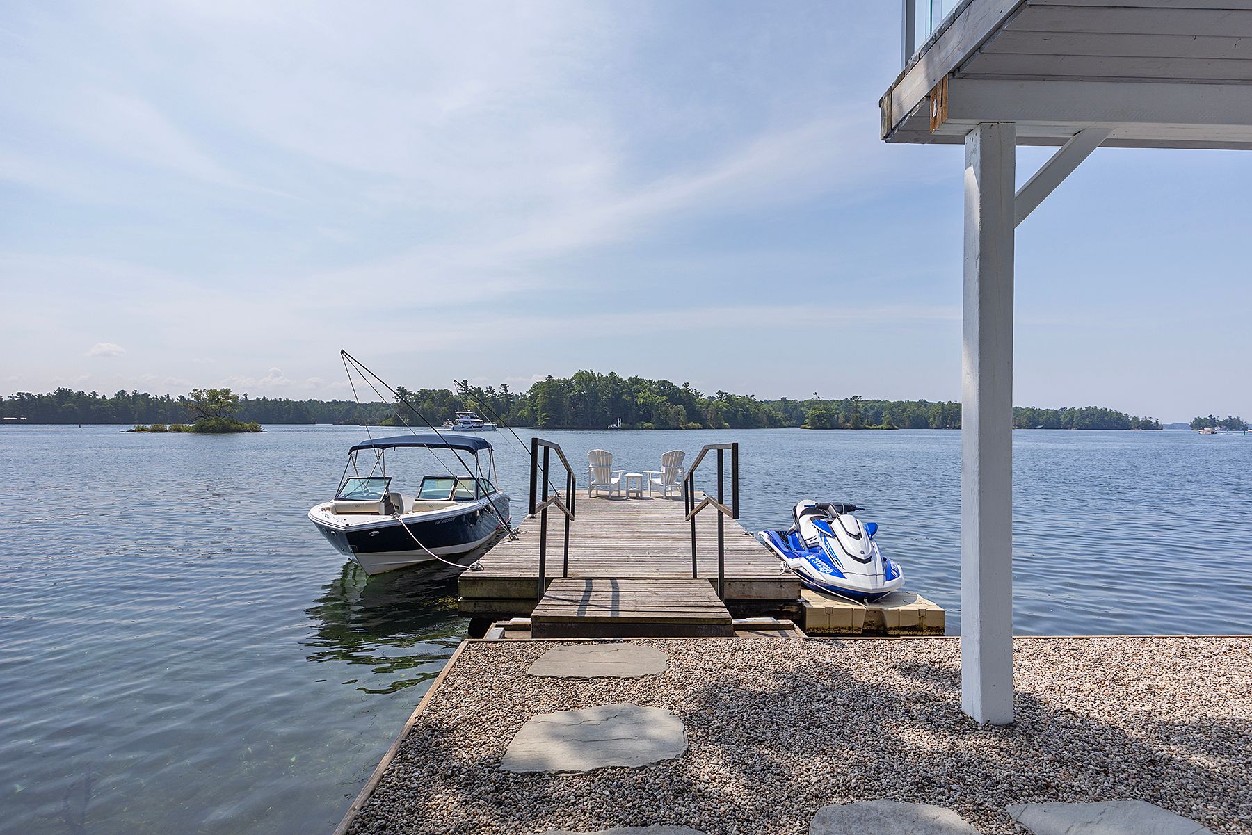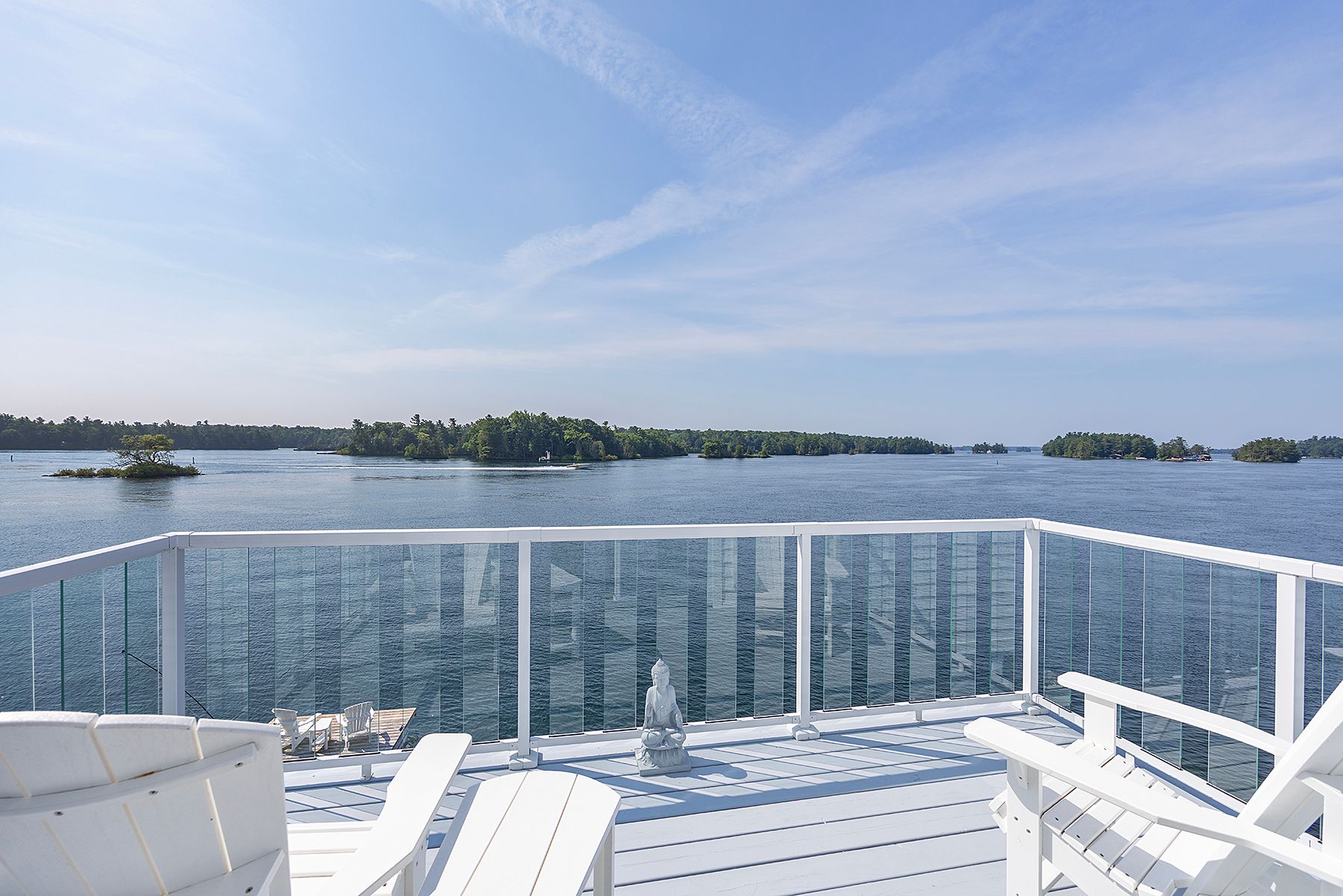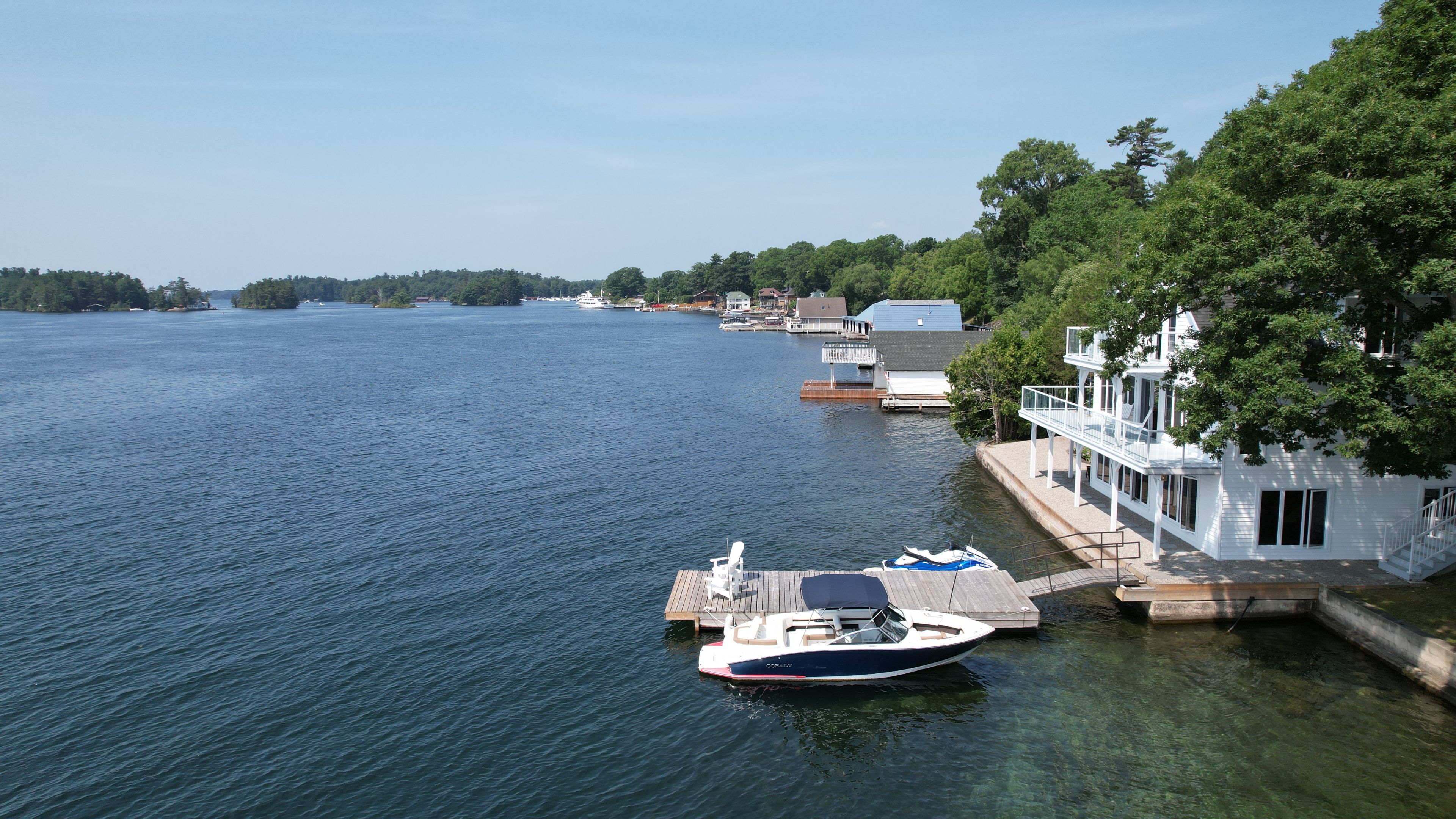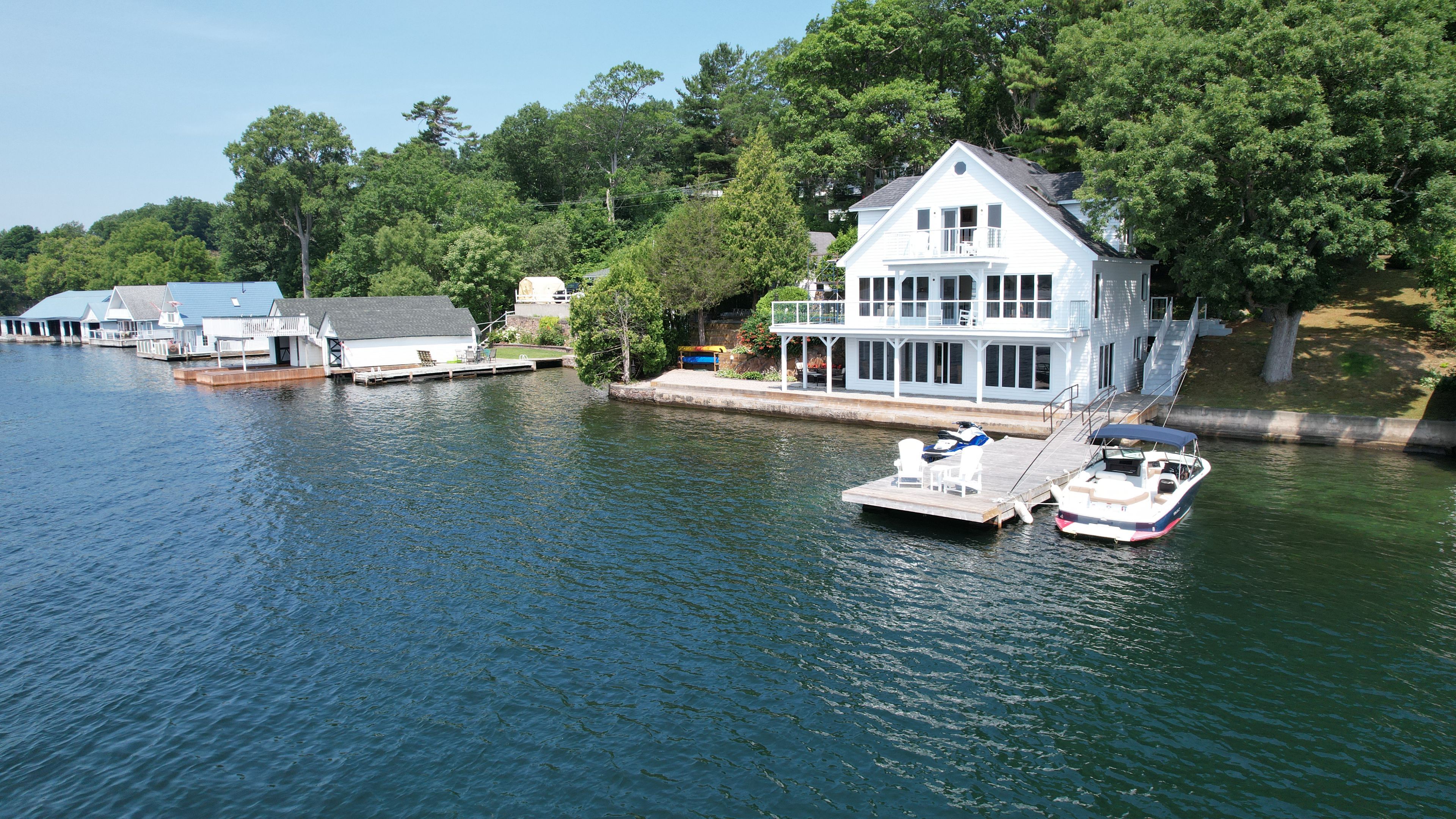 Perched on the pristine shores of the St Lawrence River in the exclusive Ivy Lea enclave, this exceptional three bedroom, two bathroom residence is a rare offering that blends refined comfort with world class waterfront living. Every room in the home is framed by sweeping river views, creating an ever changing backdrop of natural beauty. The upper level is dedicated entirely to the primary suite, a private sanctuary with panoramic vistas, large walk in closet and spa-like serenity. There is also a private deck for your morning coffee or evening wine. On the main level, a well appointed guest bedroom and full bathroom provide comfort and privacy for family or guests. There is a substantial family room with access to the equally generous sized deck also offering those incredible 1000 Islands views. The heart of the home lies on the walkout lower level, where a large eat in kitchen and sun drenched family room open directly to the waters edge, ideal for effortless entertaining or quiet evenings watching the boats drift by. Step outside to discover your private dock with deep and clean water ideal for boats or pwc of almost any size. Whether you're seeking a year round residence or a seasonal escape, this turnkey home delivers timeless charm, modern convenience, and an unparalleled 1000 Islands lifestyle, all just steps from the river. This home sits on a double lot and boasts 120' of waterfront. This modern construction is concrete slab on grade, and has been recently renovated. The positioning of the home on the lot allows for both magnificent sunrises and breathtaking sunsets from a singular vantage point.