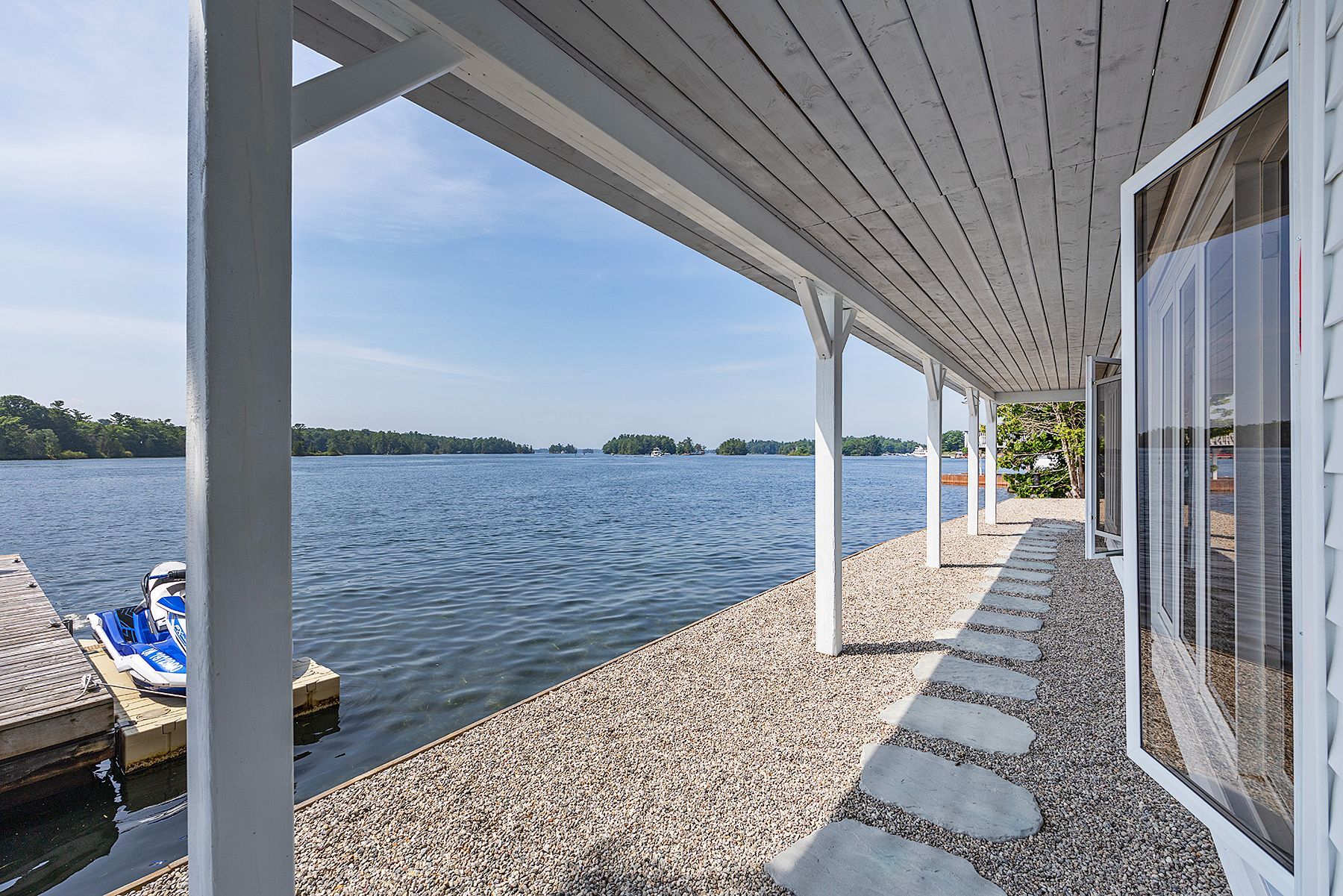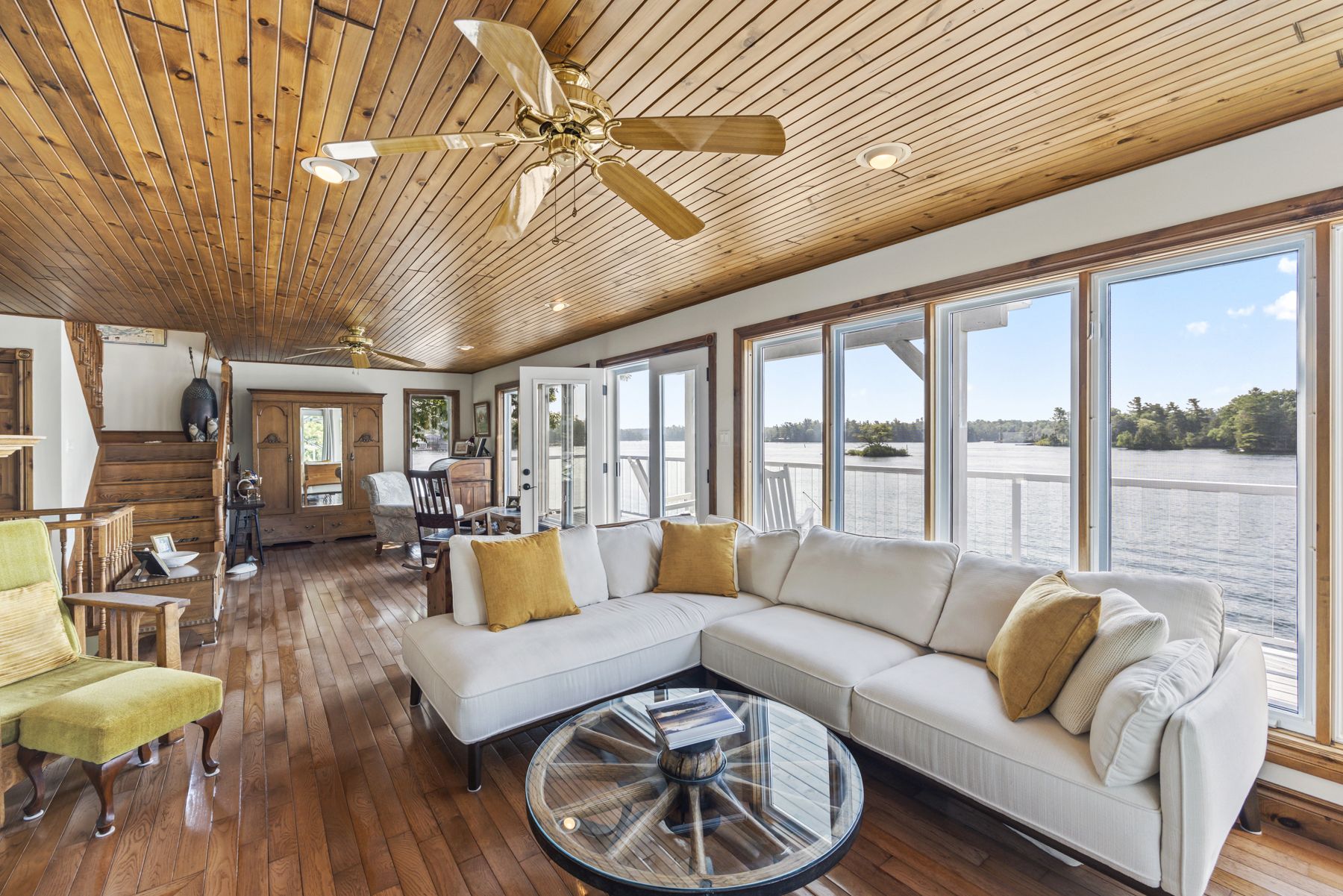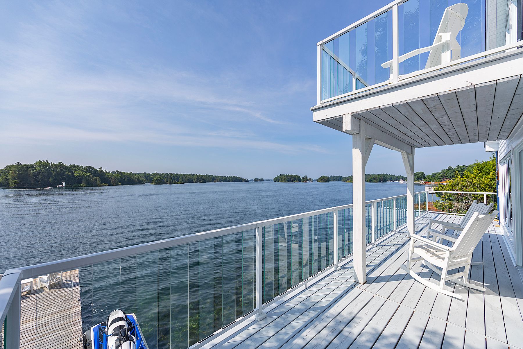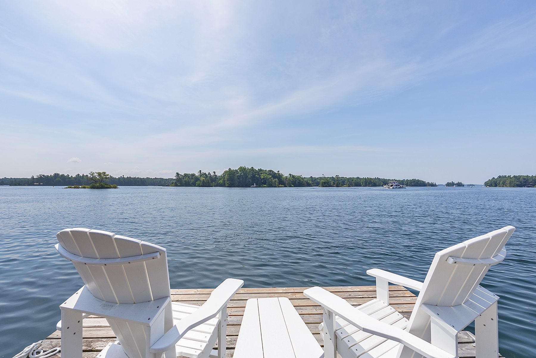 Perched on the pristine shores of the St Lawrence River in the exclusive Ivy Lea enclave, this exceptional three bedroom, two bathroom residence is a rare offering that blends refined comfort with world class waterfront living. Every room in the home is framed by sweeping river views, creating an ever changing backdrop of natural beauty. The upper level is dedicated entirely to the primary suite, a private sanctuary with panoramic vistas, large walk in closet and spa-like serenity. There is also a private deck for your morning coffee or evening wine. On the main level, a well appointed guest bedroom and full bathroom provide comfort and privacy for family or guests. There is a substantial family room with access to the equally generous sized deck also offering those incredible 1000 Islands views. The heart of the home lies on the walkout lower level, where a large eat in kitchen and sun drenched family room open directly to the waters edge, ideal for effortless entertaining or quiet evenings watching the boats drift by. Step outside to discover your private dock with deep and clean water ideal for boats or pwc of almost any size. Whether you're seeking a year round residence or a seasonal escape, this turnkey home delivers timeless charm, modern convenience, and an unparalleled 1000 Islands lifestyle, all just steps from the river. This home sits on a double lot and boasts 120' of waterfront. This modern construction is concrete slab on grade, and has been recently renovated. The positioning of the home on the lot allows for both magnificent sunrises and breathtaking sunsets from a singular vantage point.