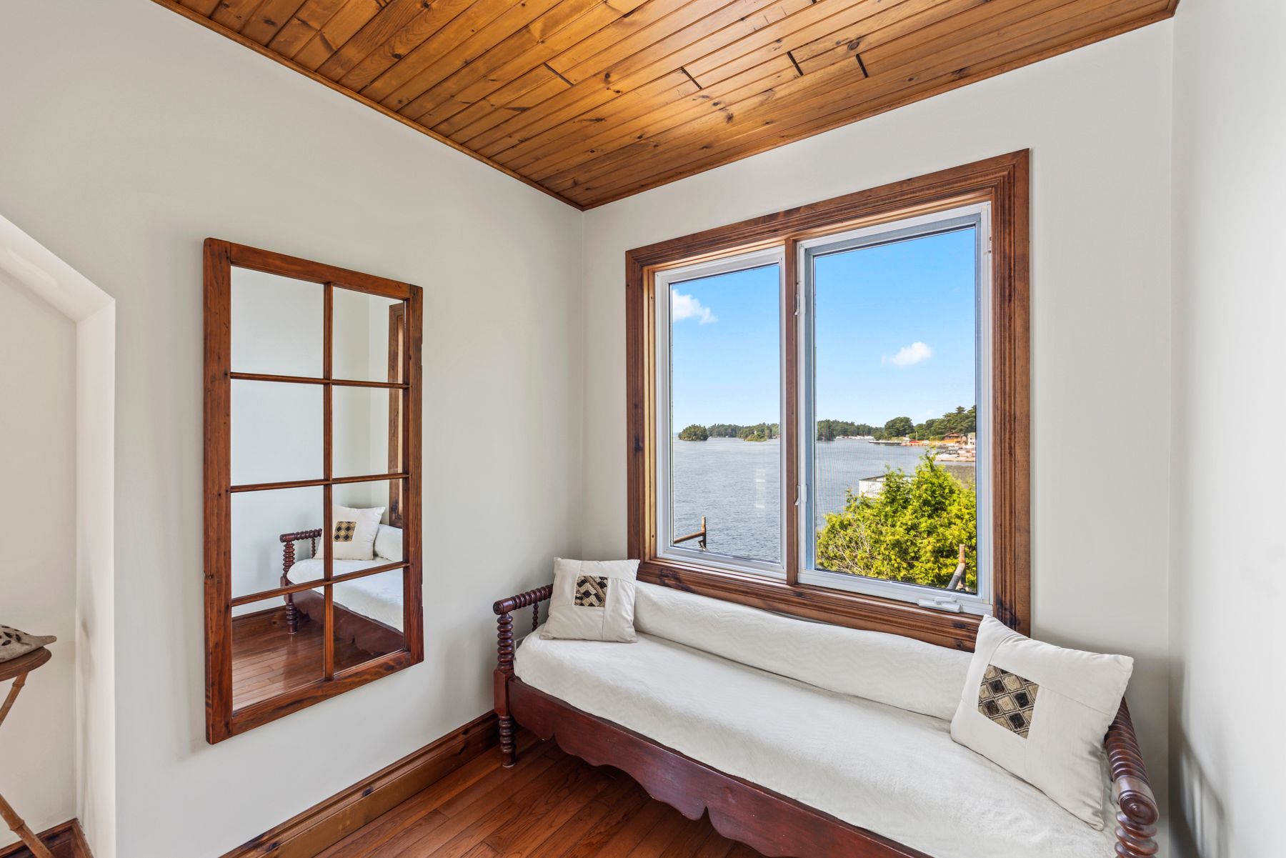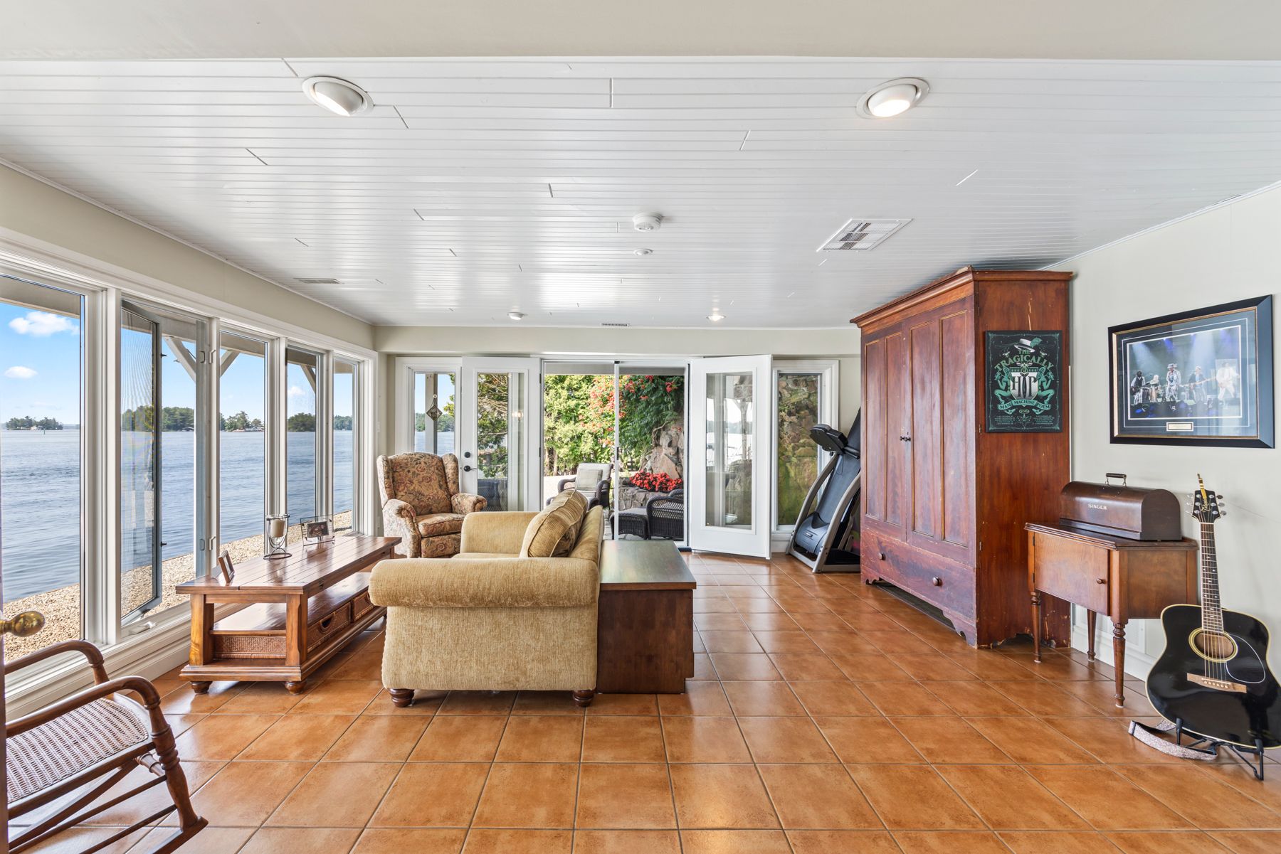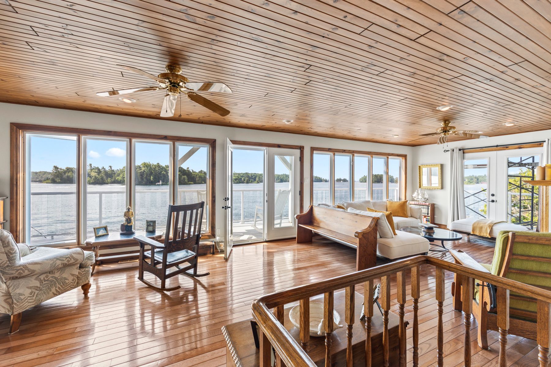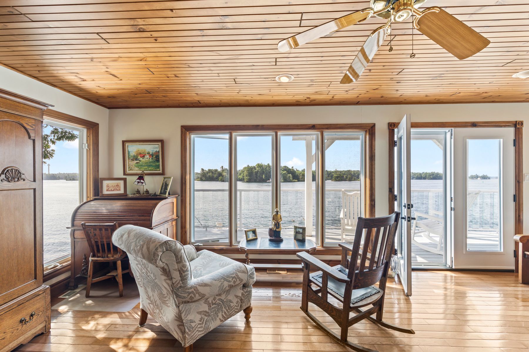 Perched on the pristine shores of the St Lawrence River in the exclusive Ivy Lea enclave, this exceptional three bedroom, two bathroom residence is a rare offering that blends refined comfort with world class waterfront living. Every room in the home is framed by sweeping river views, creating an ever changing backdrop of natural beauty. The upper level is dedicated entirely to the primary suite, a private sanctuary with panoramic vistas, large walk in closet and spa-like serenity. There is also a private deck for your morning coffee or evening wine. On the main level, a well appointed guest bedroom and full bathroom provide comfort and privacy for family or guests. There is a substantial family room with access to the equally generous sized deck also offering those incredible 1000 Islands views. The heart of the home lies on the walkout lower level, where a large eat in kitchen and sun drenched family room open directly to the waters edge, ideal for effortless entertaining or quiet evenings watching the boats drift by. Step outside to discover your private dock with deep and clean water ideal for boats or pwc of almost any size. Whether you're seeking a year round residence or a seasonal escape, this turnkey home delivers timeless charm, modern convenience, and an unparalleled 1000 Islands lifestyle, all just steps from the river. This home sits on a double lot and boasts 120' of waterfront. This modern construction is concrete slab on grade, and has been recently renovated. The positioning of the home on the lot allows for both magnificent sunrises and breathtaking sunsets from a singular vantage point.