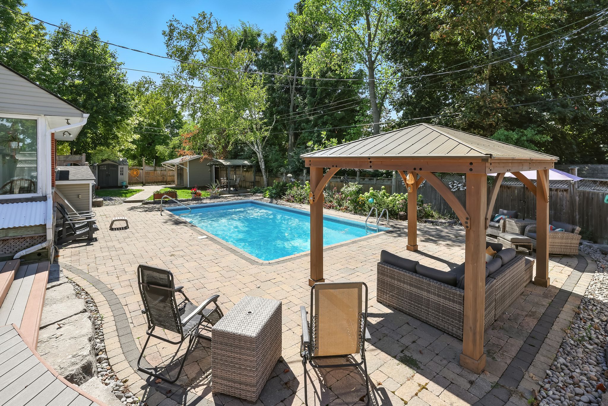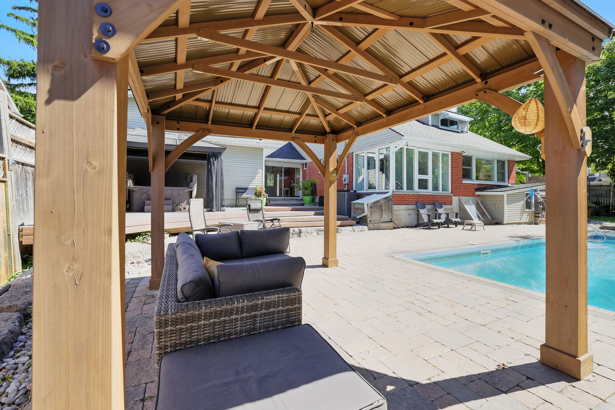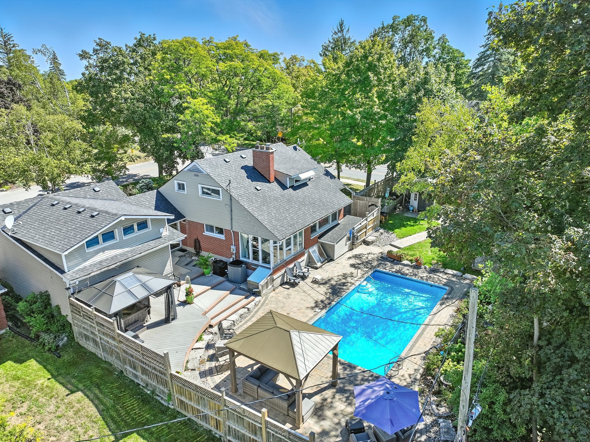 Welcome to 433 Manorhill Avenue. This expansive, solid-brick home is set on a double-wide corner lot with mature trees, offering a serene, country-like feel in Peterborough's highly desirable Old West End. The main floor welcomes you with comfort and elegance, featuring two bedrooms, a full bathroom, a formal living and dining room, an updated kitchen and a lovely sunroom. With engineered hardwood floors throughout, a cozy brick fireplace, and large windows overlooking the pool and gardens, creating a perfect space to relax. Upstairs, you'll find two additional spacious bedrooms and another full bathroom. The lower level offers excellent potential for multigenerational living or guest accommodations, complete with its own separate entrance, a bedroom, kitchenette, bathroom, and a cozy living room with a welcoming brick fireplace. The fully fenced backyard is a private retreat, professionally landscaped with raised garden beds, perennial flower beds, and interlocking stone surrounding the large inground pool. Multiple gazebos, a hot tub, and generous patio space provide the perfect setting for entertaining or unwinding. The oversized attached two-car garage includes a workshop and a loft designed as a mancave-complete with a pool table and lounge space. Ideally located within walking distance to Peterborough Regional Health Centre, shopping, schools, and amenities, this home truly offers it all: space, character, privacy and a lifestyle you'll love.