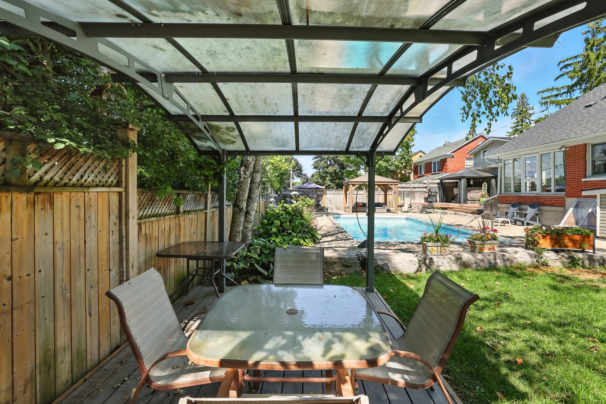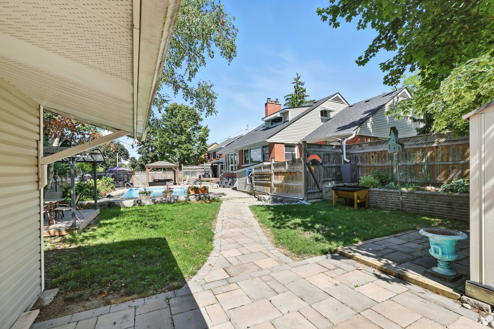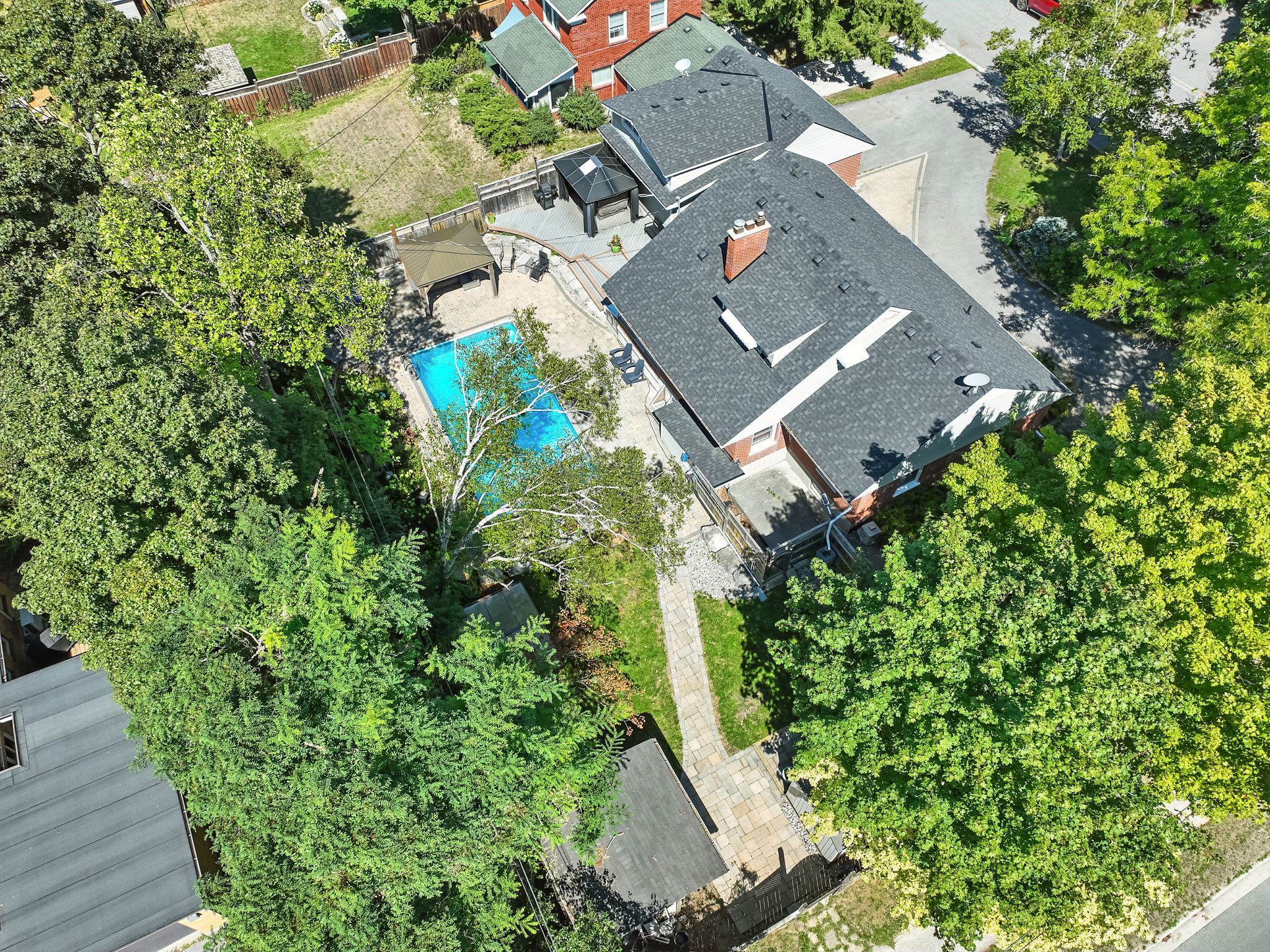 Welcome to 433 Manorhill Avenue. This expansive, solid-brick home is set on a double-wide corner lot with mature trees, offering a serene, country-like feel in Peterborough's highly desirable Old West End. The main floor welcomes you with comfort and elegance, featuring two bedrooms, a full bathroom, a formal living and dining room, an updated kitchen and a lovely sunroom. With engineered hardwood floors throughout, a cozy brick fireplace, and large windows overlooking the pool and gardens, creating a perfect space to relax. Upstairs, you'll find two additional spacious bedrooms and another full bathroom. The lower level offers excellent potential for multigenerational living or guest accommodations, complete with its own separate entrance, a bedroom, kitchenette, bathroom, and a cozy living room with a welcoming brick fireplace. The fully fenced backyard is a private retreat, professionally landscaped with raised garden beds, perennial flower beds, and interlocking stone surrounding the large inground pool. Multiple gazebos, a hot tub, and generous patio space provide the perfect setting for entertaining or unwinding. The oversized attached two-car garage includes a workshop and a loft designed as a mancave-complete with a pool table and lounge space. Ideally located within walking distance to Peterborough Regional Health Centre, shopping, schools, and amenities, this home truly offers it all: space, character, privacy and a lifestyle you'll love.