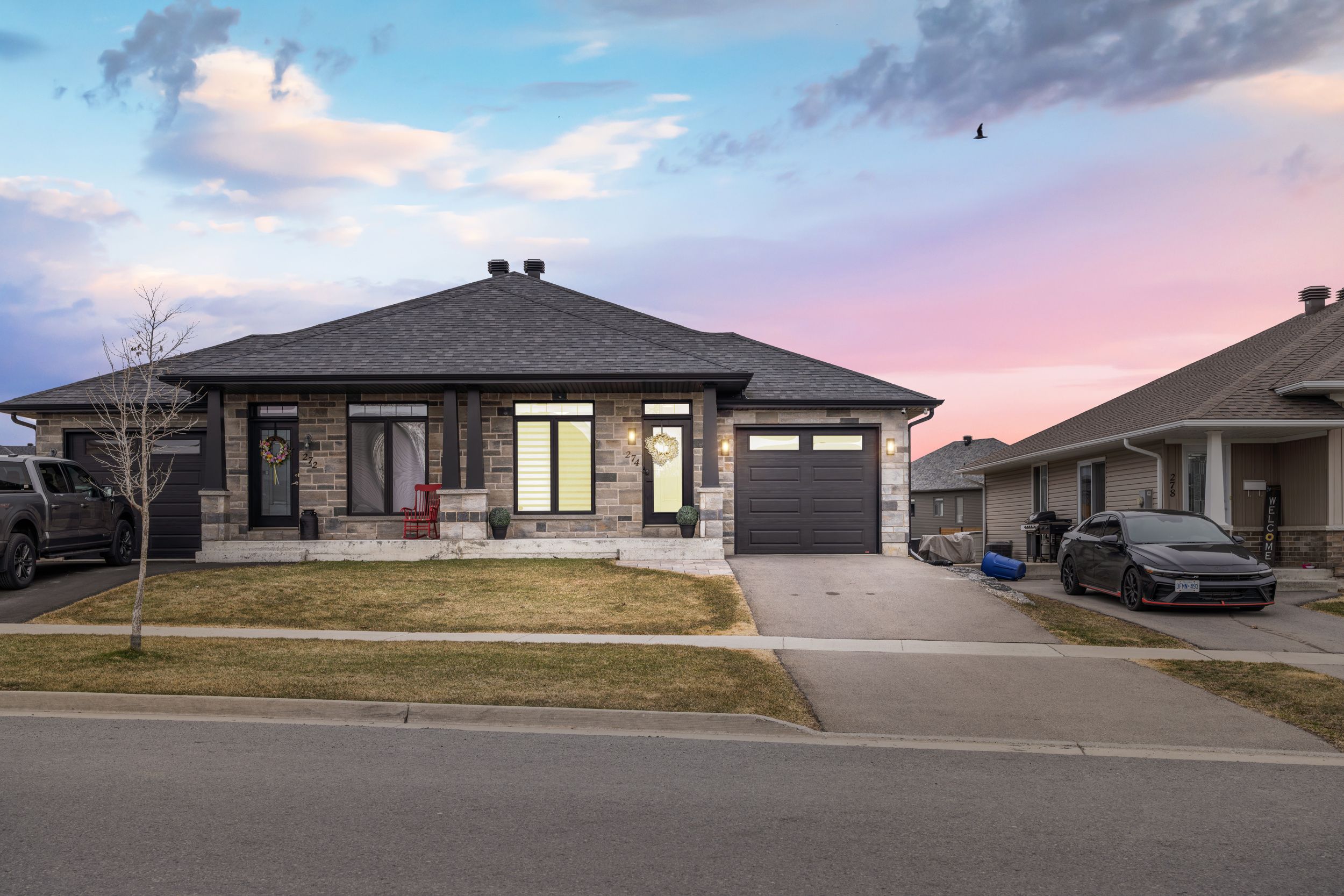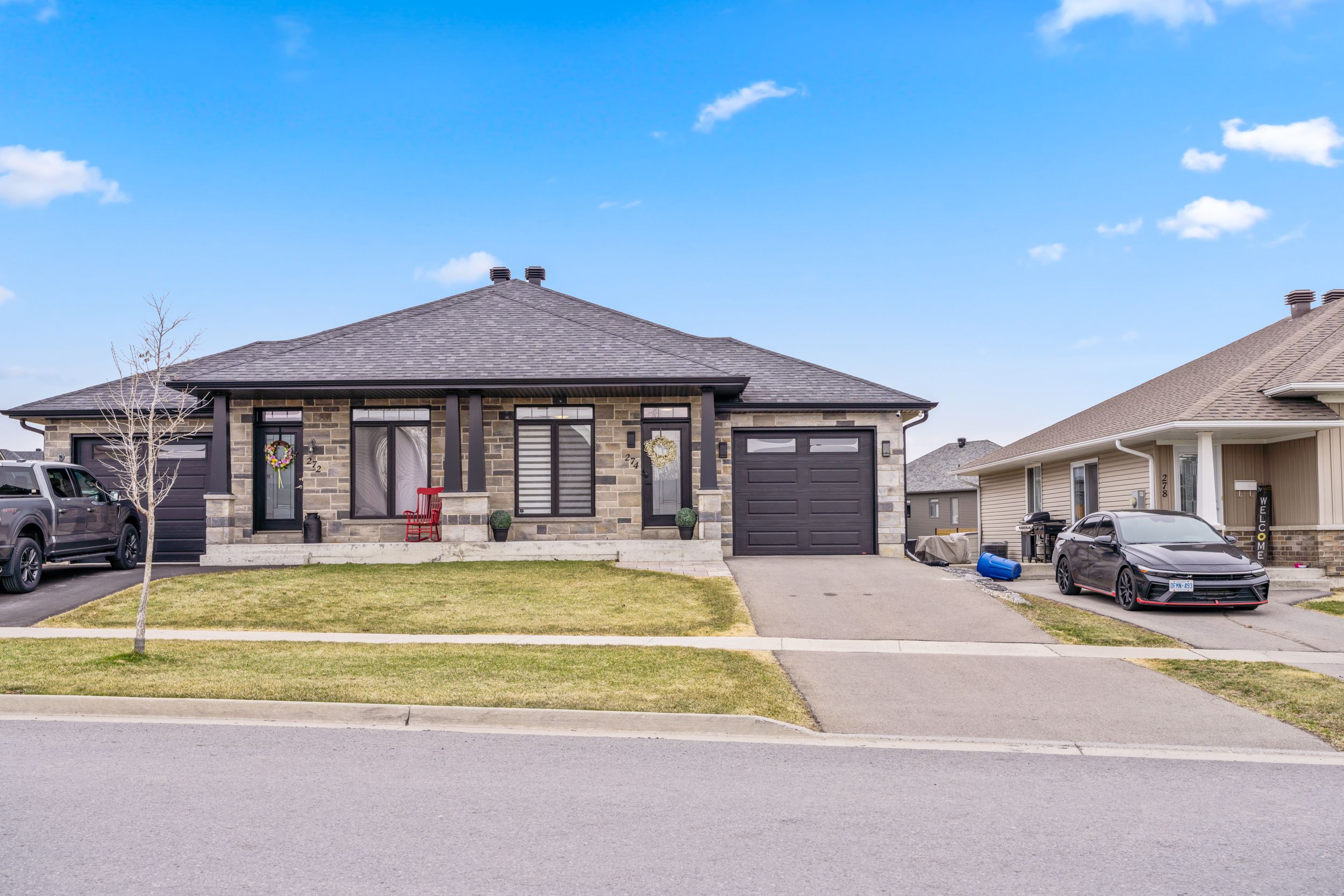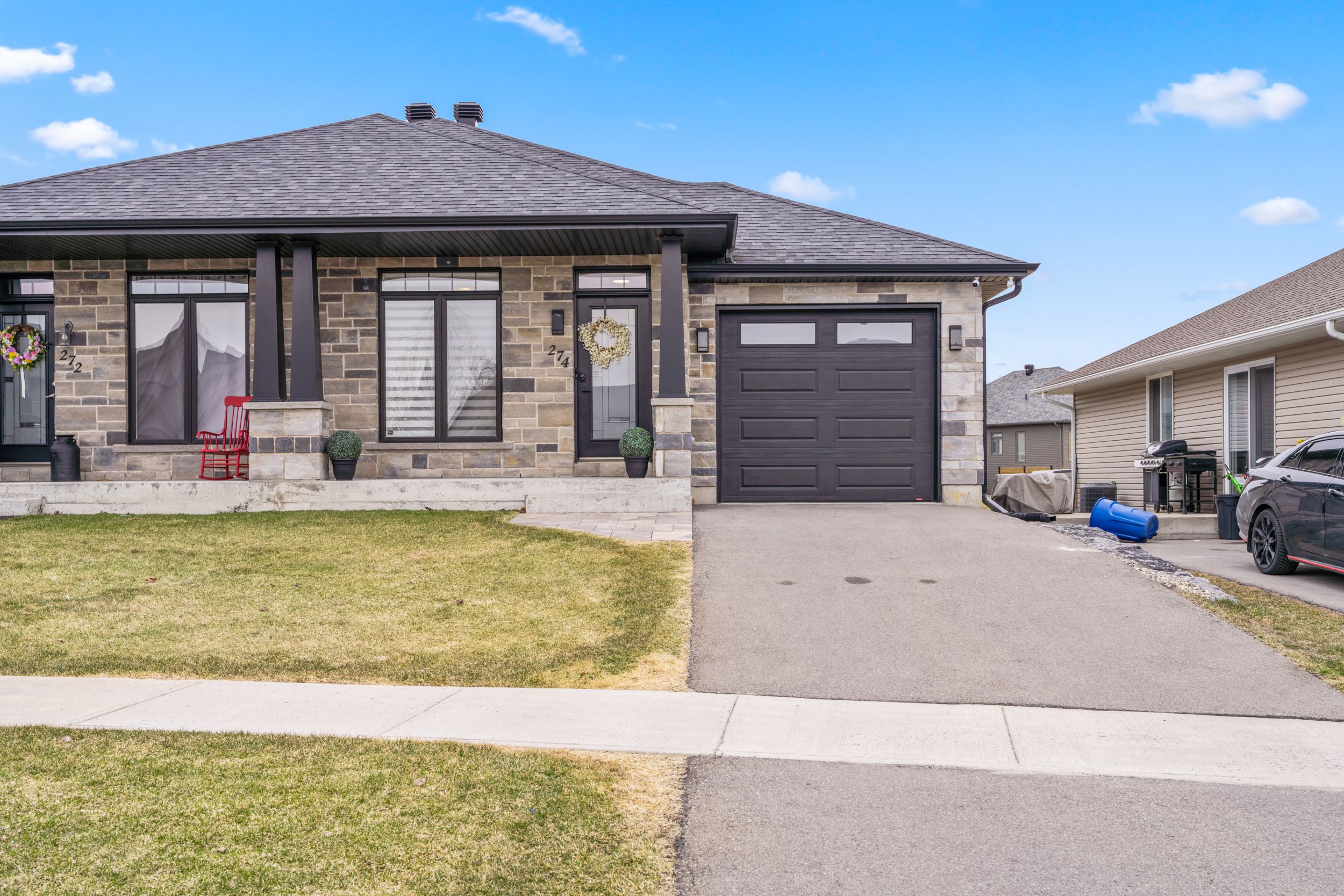 Introducing impressive 274 Eastridge Dr! This one is anything but ordinary, a stunning 1-car garage semi-detached bungalow, ideally nestled in the coveted EastRidge community, near all family-friendly amenities and great schools. Ideally situated within walking distance to public transit, Gray's Creek Conservation Area, the Waterfront Trail, the St-Lawrence River & trails, and easy access to HWY 401. Everything about this property makes you want to stay and soak in the modern vibe. From the fully fenced-in backyard retreat featuring a deck and gazebo, a hot tub on a concrete slab with pergola, a ground-level patio, to the large custom shed (with power), every corner is sure to impress. Step inside to a sunlite open-concept floor plan featuring a gourmet kitchen complete with highend stainless appliances (inlc built-in microwave), quartz countertops, an under-mount sink, ceramic backsplash, a breakfast counter/island, a convenient pantry, pot lights high ceiling. The dining area flows seamlessly into the inviting LR, accented by crafted coffered ceilings and a walk out to your backyard oasis. The main level offers a spacious primary bedroom, a full 4-piece bathroom, a 2-pc bath, and a separate laundry area for added convenience and access to the garage. Downstairs, the professionally finished basement expands your living space with a spacious lounge area boasting a gas fireplace, a brick feature wall with a live-edge mantel, a spa-like 3 pc bathroom, and a large utility room incl. the natural gas furnace, central A/C, hot water on demand system, and air exchanger, with plenty of additional space for storage or a potential future hobby room, bedrm or rec area. The custom closet organiser is incl. (20k). Please allow 24 hours business hrs irrevocable to all offers.