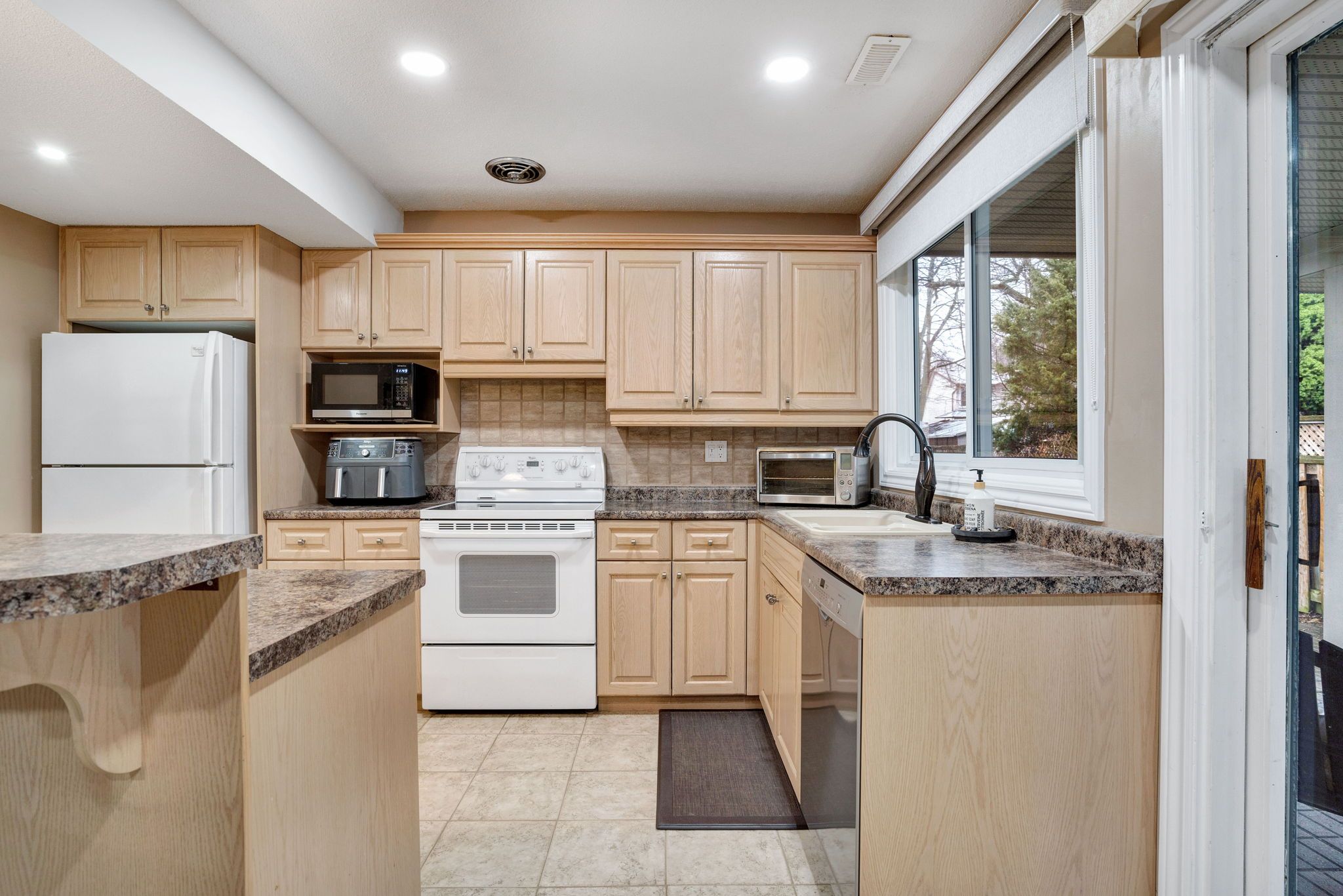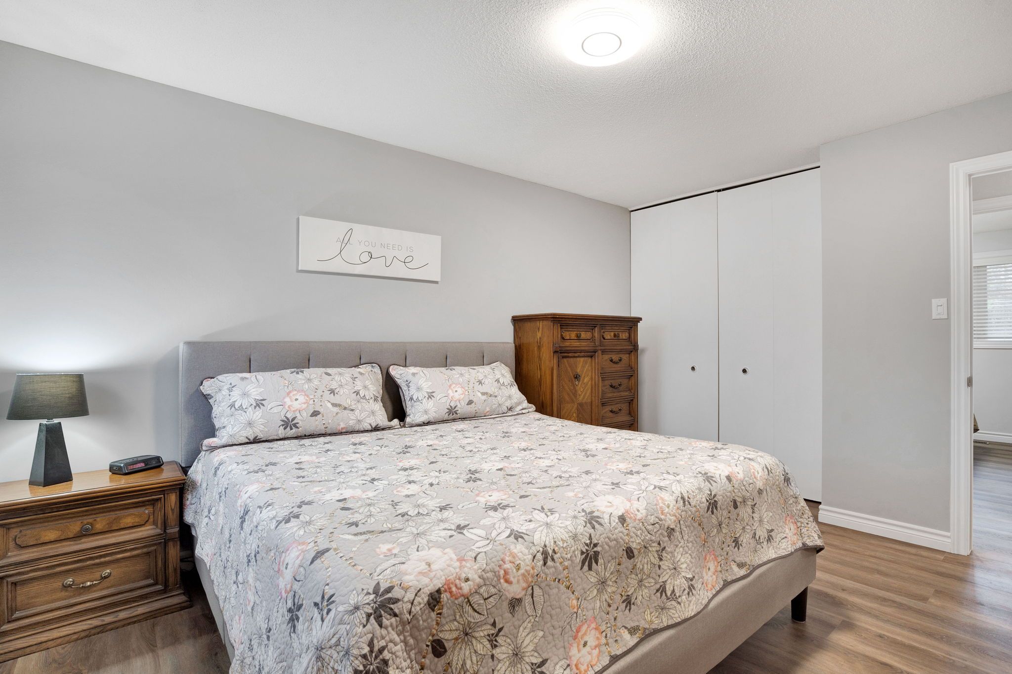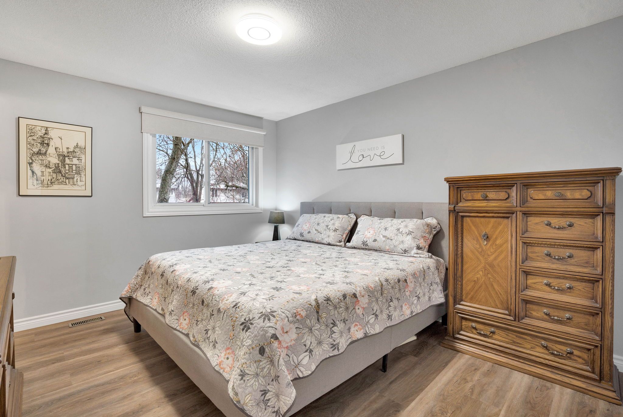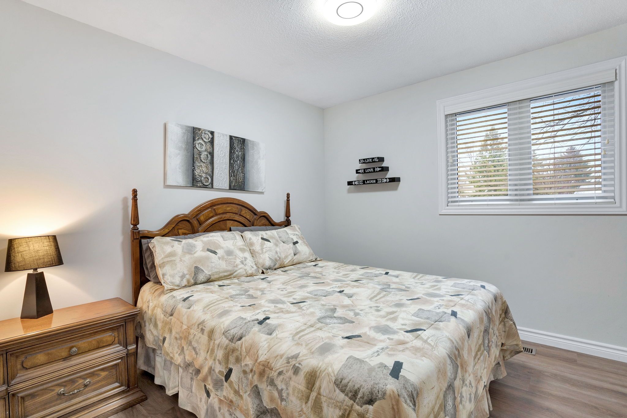 Welcome to this charming home situated on a beautiful corner lot on a quiet, tree-lined street, surrounded by mature trees that add warmth and character. Perfect for first-time buyers or those looking to downsize, this home offers a functional and inviting layout. Featuring 3 good size bedrooms upstairs plus a versatile 4th room ideal for a home office, along with 1 full bathroom, a private ensuite and a convenient 2 -piece on the main floor. The open-concept living space is bright and welcoming, complemented by new flooring throughout (2023), updated lighting and a stylish new staircase (2016).The spacious sun-filled kitchen offers ample counter space and a dedicated eating area, with room for a full size dining table-perfect for entertaining. Step outside to a covered patio overlooking a fully fenced, private backyard ideal for relaxing or hosting the next BBQ with loved ones. Additional highlights include a stamped concrete driveway and walkway adding curb appeal, and a durable metal roof with gutter guards providing long-term peace of mind. A fantastic opportunity in a desirable, family-friendly neighbourhood ready for the next chapter and a place to call home.