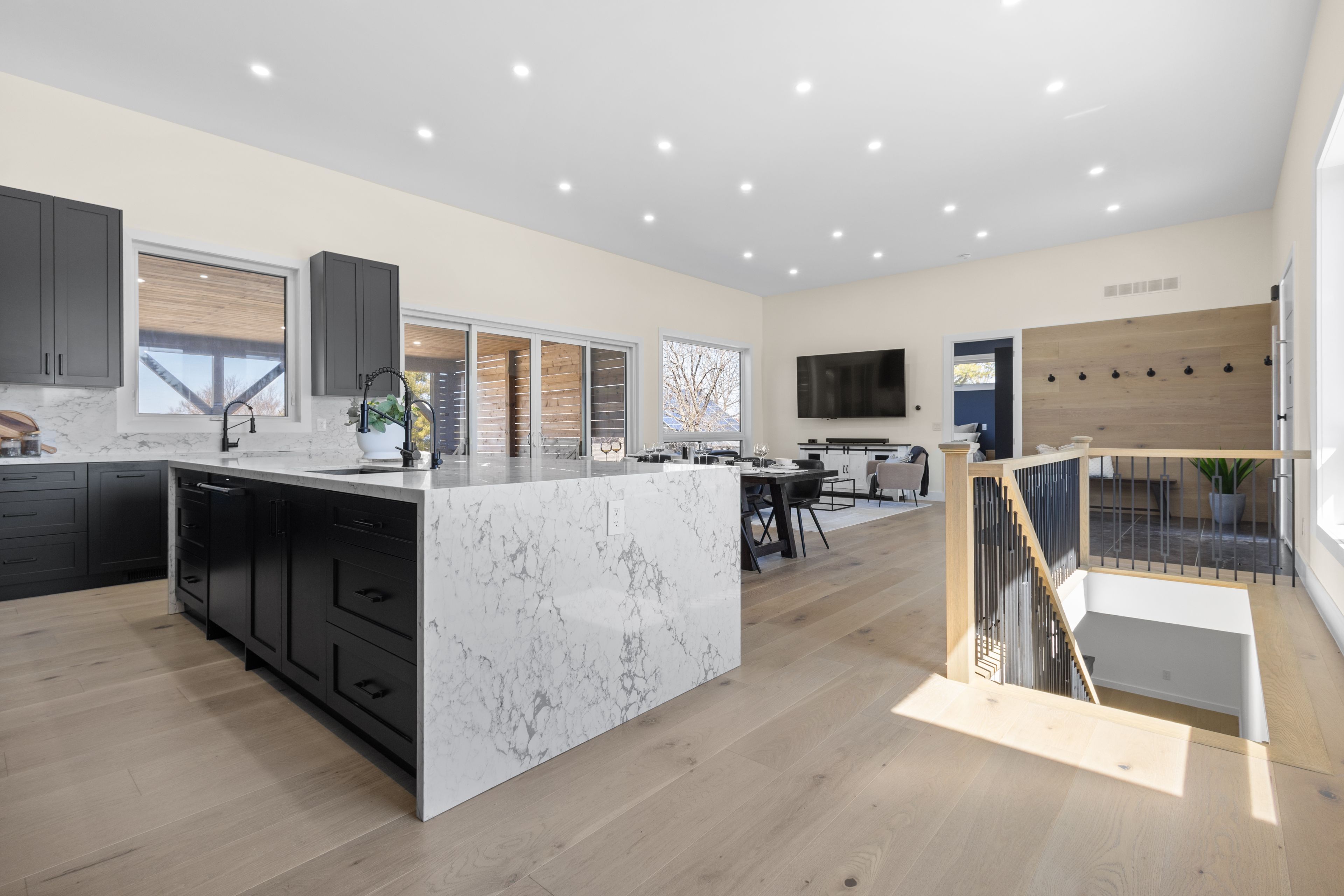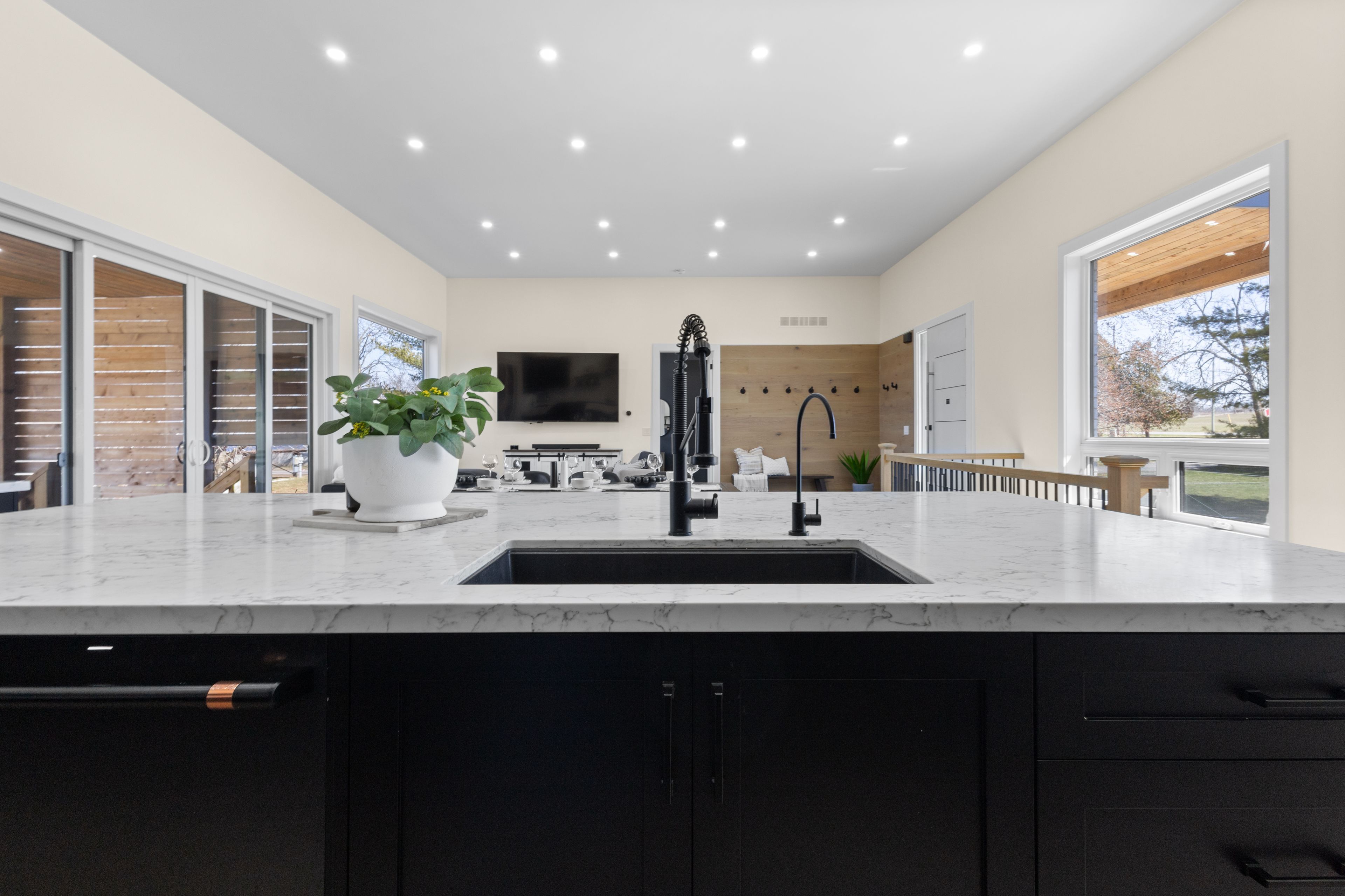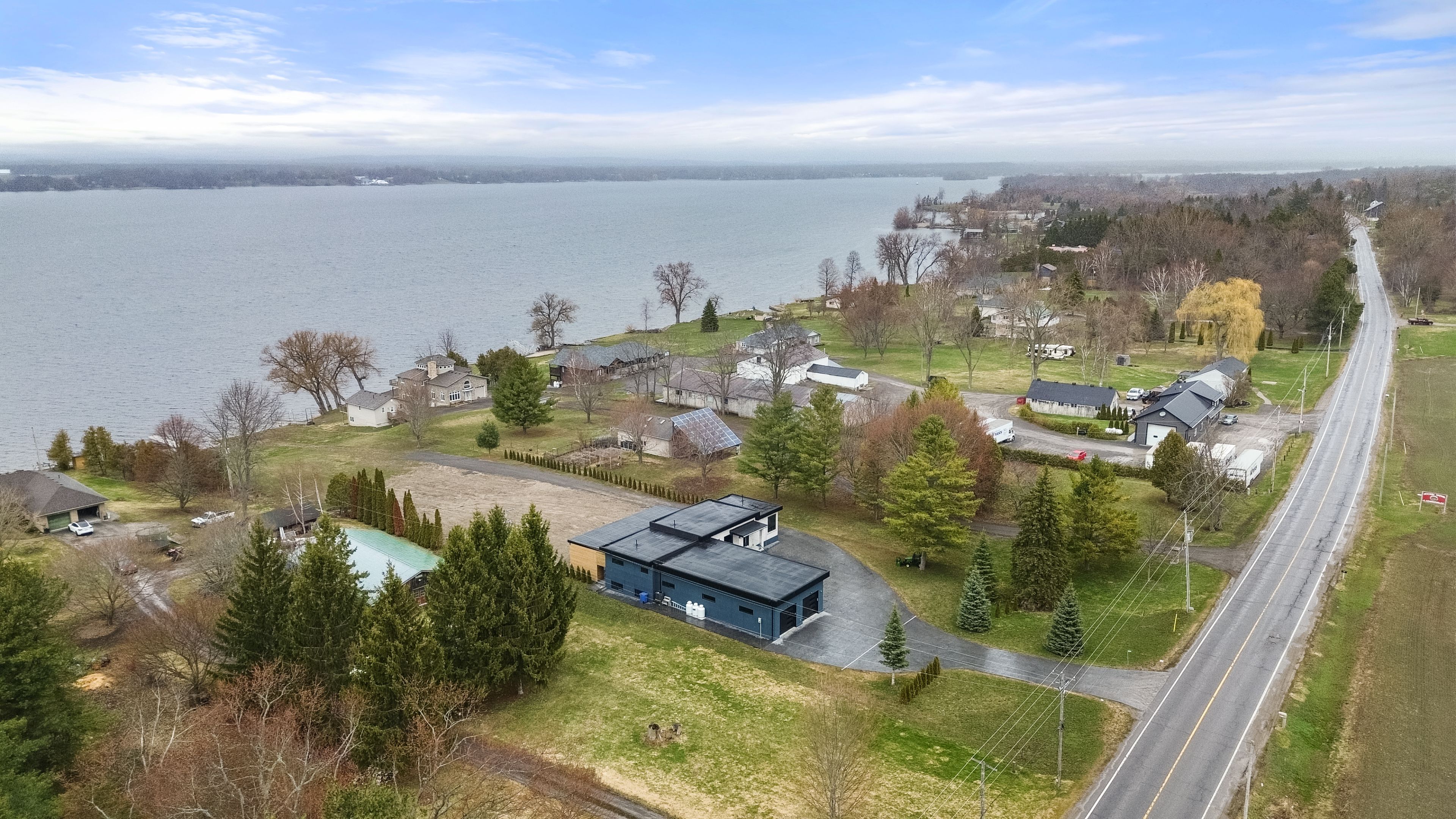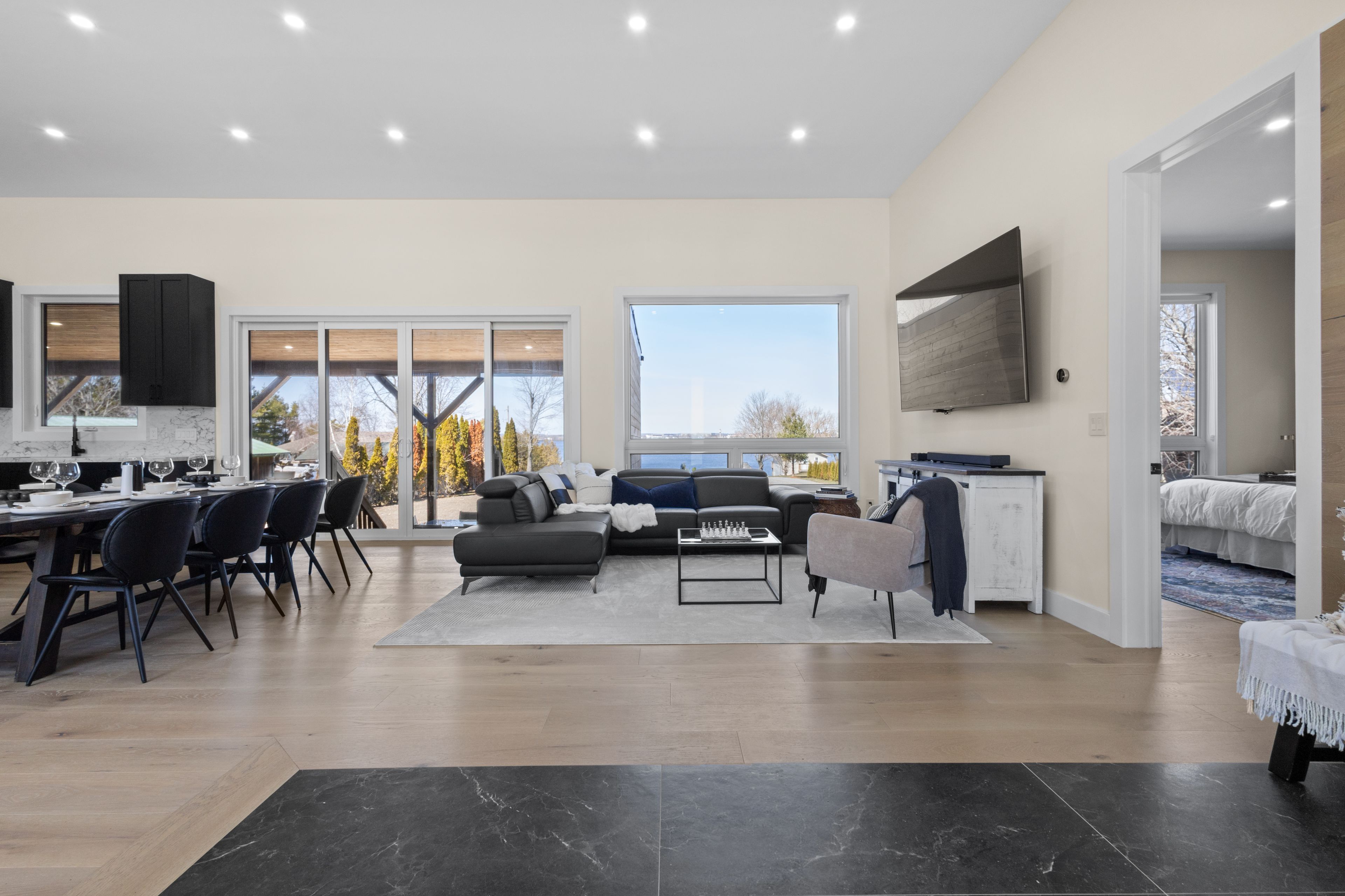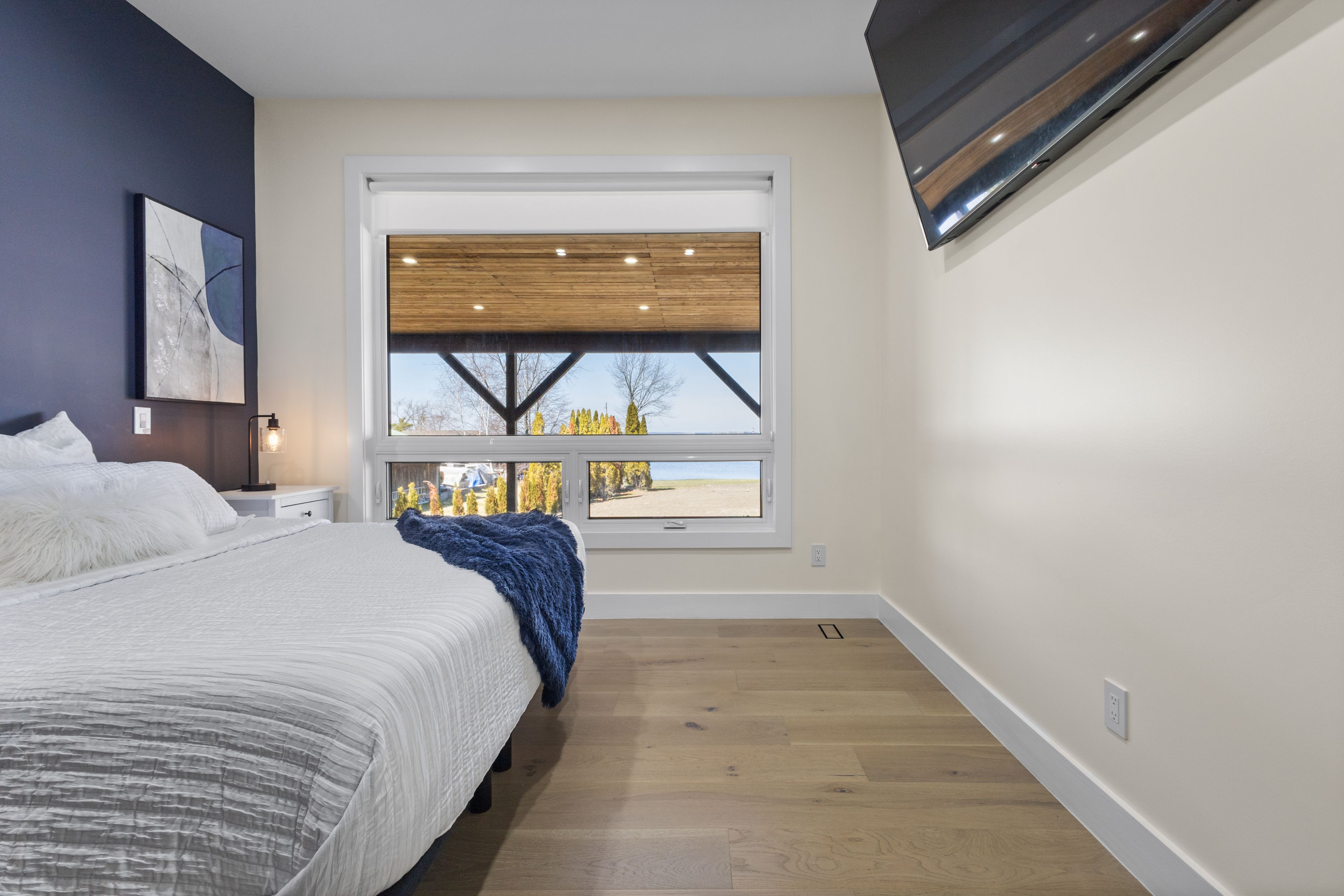 Stunning modern waterfront home set on over 1.6 acres with approximately 150 feet of private shoreline on the Bay of Quinte, located along one of the most exclusive stretches in Prince Edward County. This newly constructed custom bungalow showcases a high level of construction throughout, featuring a striking stucco and brick exterior, stamped concrete driveway, patio, and walkways. Inside, the home offers 3+3 bedrooms and 3 bathrooms across two fully finished levels, with water views from nearly every room. The main living area features 12-foot ceilings, 10-foot ceilings in the bedrooms, oversized Alcabri windows, 8-foot doors, and custom cabinetry throughout, complimented by 9-inch engineered white oak flooring. The kitchen includes a 10 x 5 quartz waterfall island with hidden storage, dual sink, continuous quartz backsplash, and Café appliances. The primary suite offers a 5-piece ensuite with double sinks, soaker tub, and glass walk-in shower, along with a 12-foot sliding door leading to a 55 x 21 covered patio. The lower level features 8-foot ceilings, a large rec room, gym area, powder room, laundry with quartz counters, and 3 additional bedrooms with oversized windows. Connected through a heated and cooled flex space is a 40.5 x 28.5 garage with 13-foot ceilings, pot lights, and 12-inch concrete flooring. The waterfront includes a 20-foot composite cantilever dock, armour stone shoreline, and firepit patio. The lot allows for a secondary dwelling. A well-executed waterfront home in Prince Edward County.