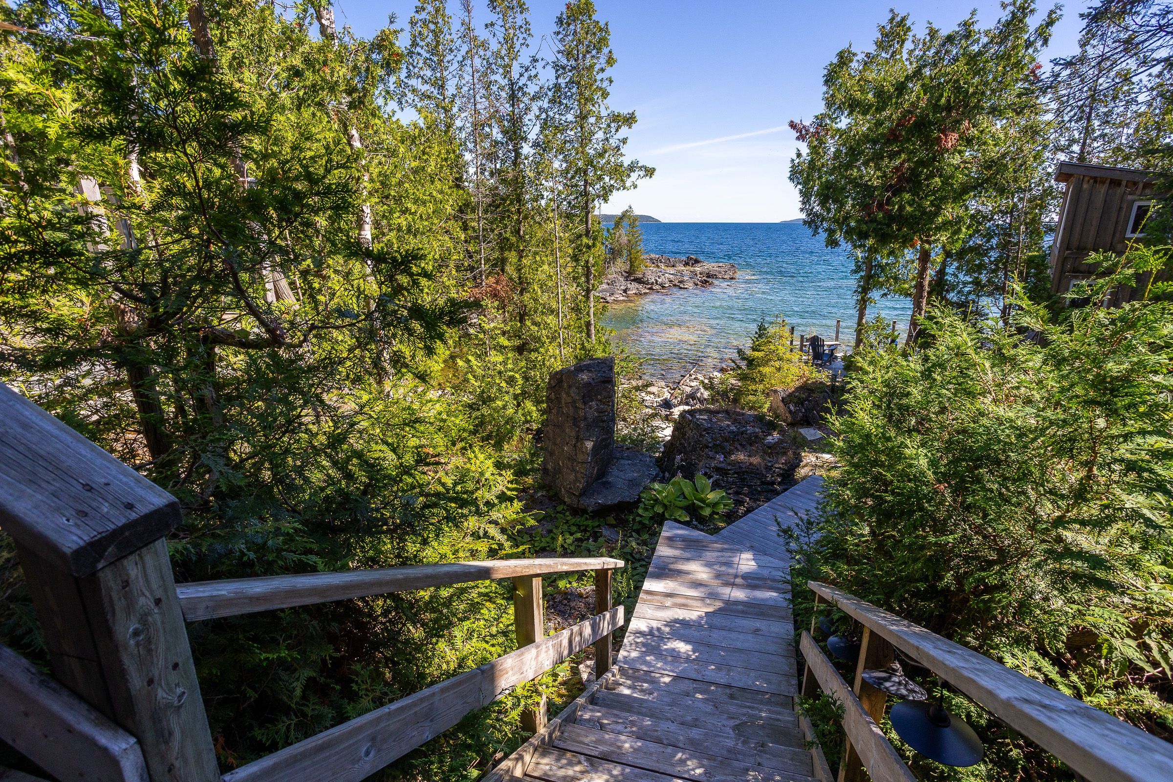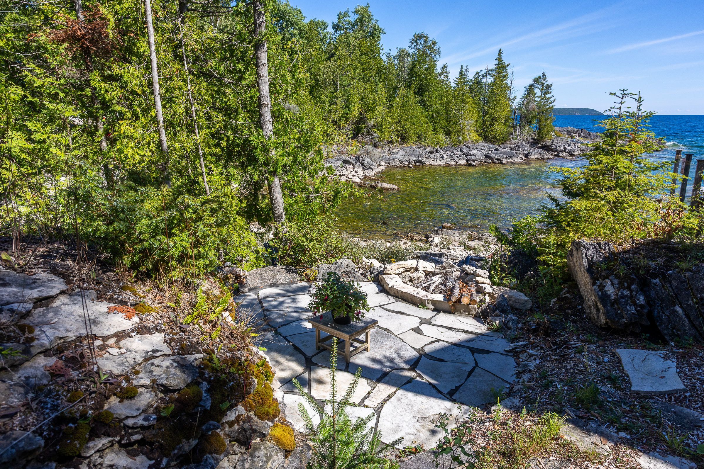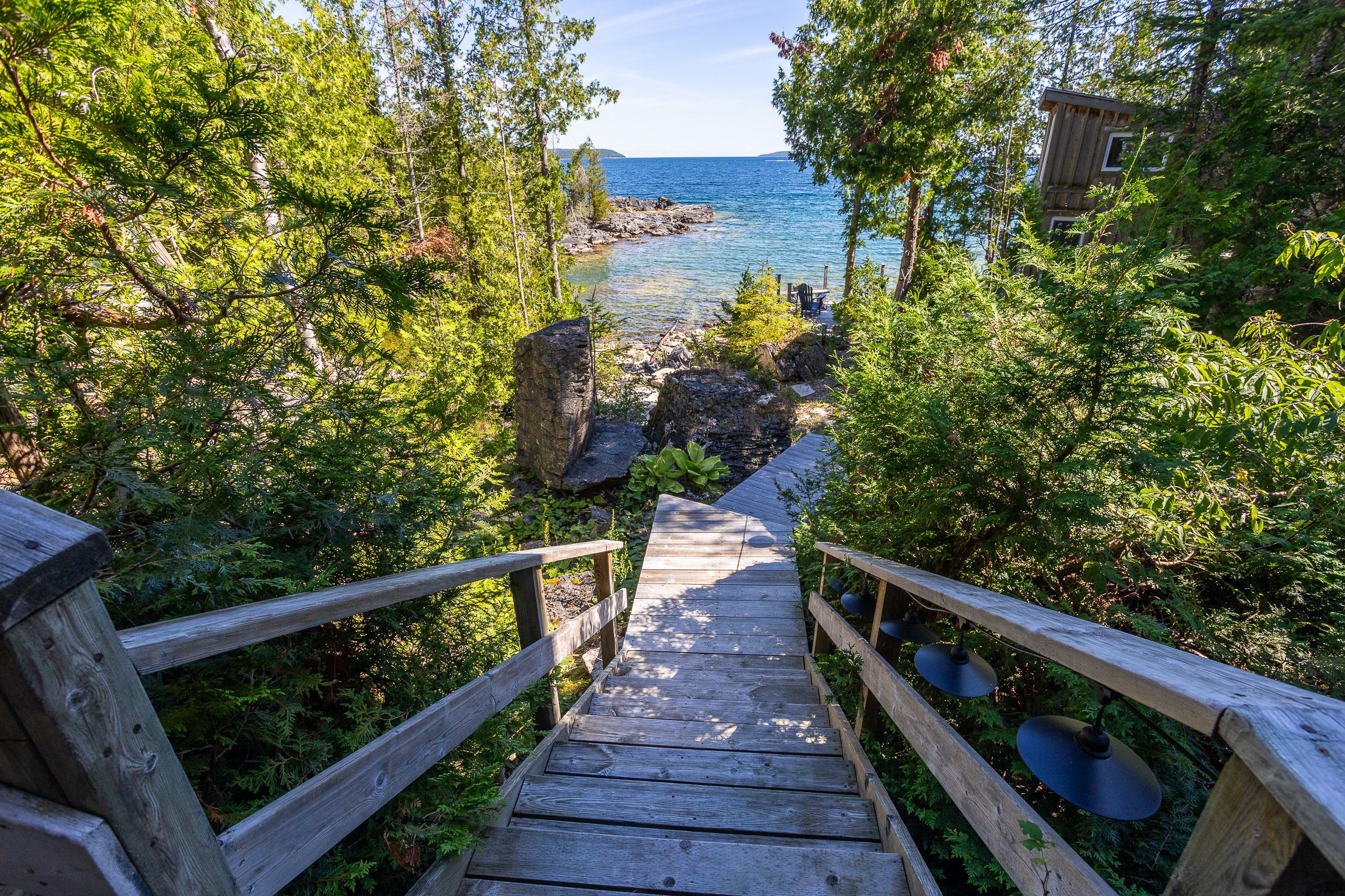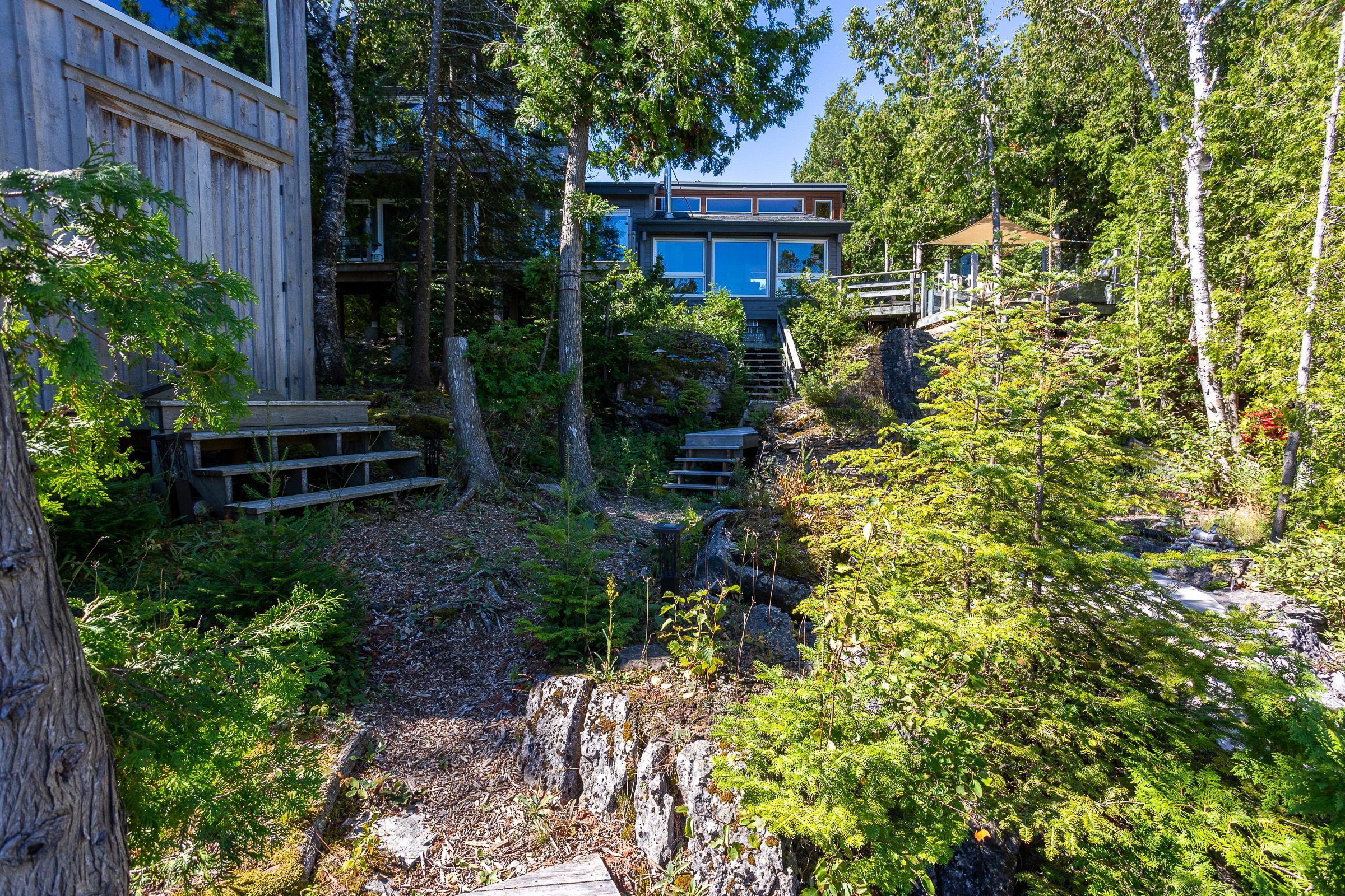 Welcome to your private Georgian Bay retreat in the heart of Tobermory-where contemporary design meets comfort and breathtaking natural beauty. Set on a rare protected cove with inspiring views toward Flowerpot and Bear's Rump Island, this extensively renovated waterfront home offers exceptional privacy just a short walk to the village, shops, and restaurants. Reimagined in 2019 with a complete down-to-the-studs extensive renovation and thoughtful addition, this 3+1 bedroom, 2-bath home was designed for energy efficiency. A 7.6kW solar system with net metering, SolarEdge inverter, and Level 2 EV charger pairs with a Zuba air-source heat pump for near net-zero living. Inside, warm modern finishes include ready-pine ceilings, custom Douglas fir stairs, and expansive windows framing the water. Durable concrete-effect flooring runs throughout, complemented by Italian porcelain tile and in-floor heat in the primary bath. A Blaze King Chinook wood stove adds efficiency and ambiance. All major systems were also updated in 2019, including plumbing, electrical, septic, windows, roofing (addition), and a 3-stage water purification system. Additional features include a custom office with built-ins, automatic closet lighting, and a heated, insulated crawl space. Outdoors, enjoy all-cedar decks, luxury hot tub, a waterfront platform, and beautifully landscaped stone patios (2023) with firepit and raised garden beds. The large single-car garage includes a garden prep/sink area. A charming two-level cedar bunkie at the water's edge (2017) provides extra guest space ( up to 4 people) and stunning views over Georgian Bay. Surrounded by nature trails and hiking, yet close to the harbour village, this property offers the perfect balance of privacy, efficiency, and waterfront living.