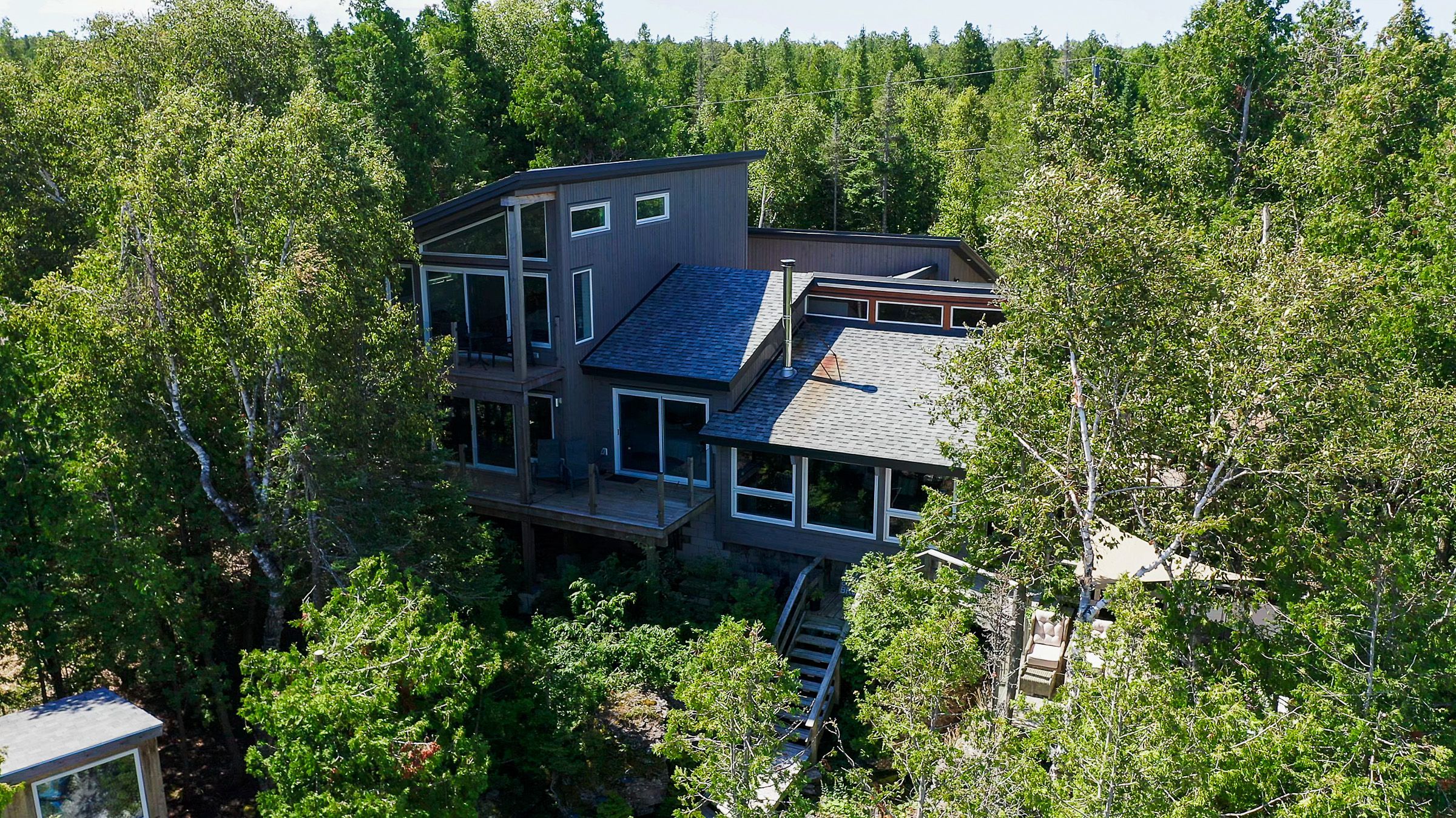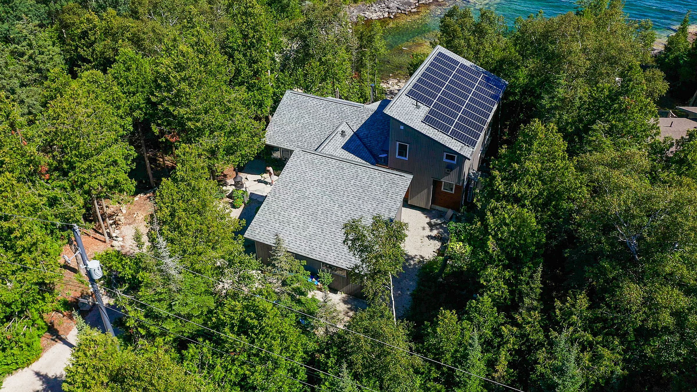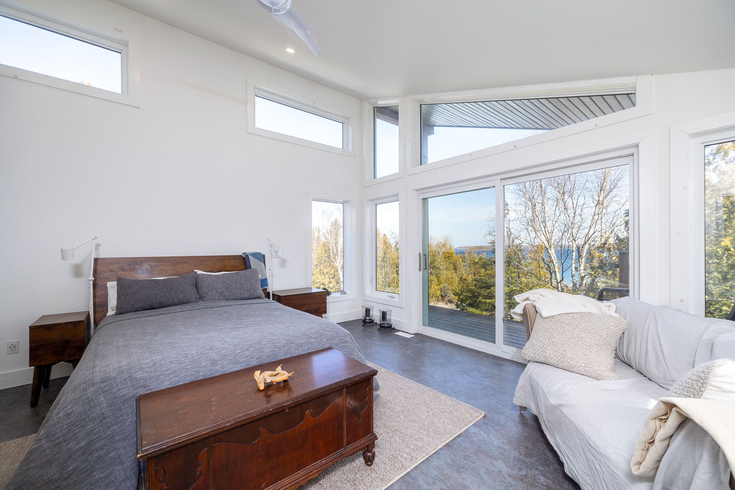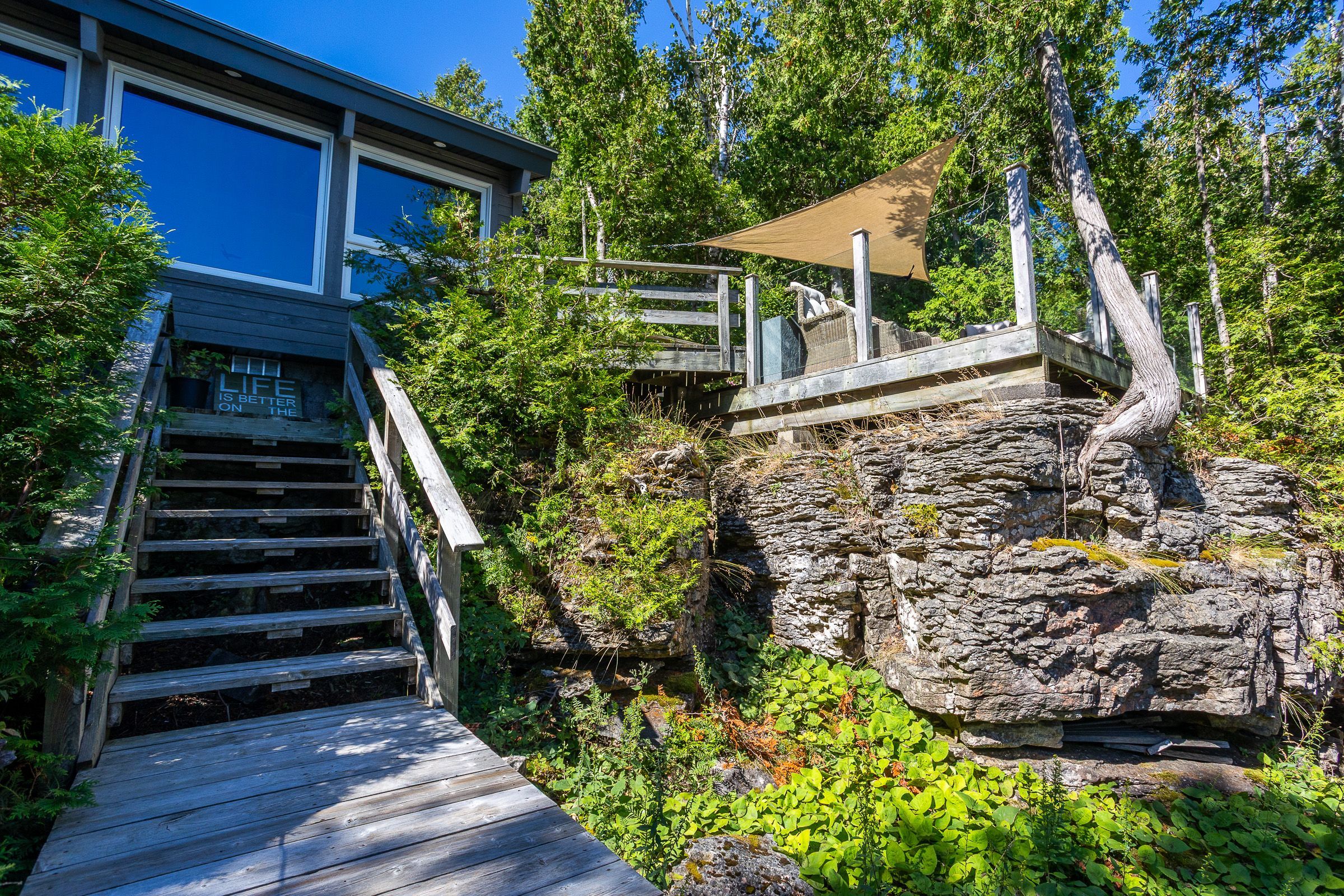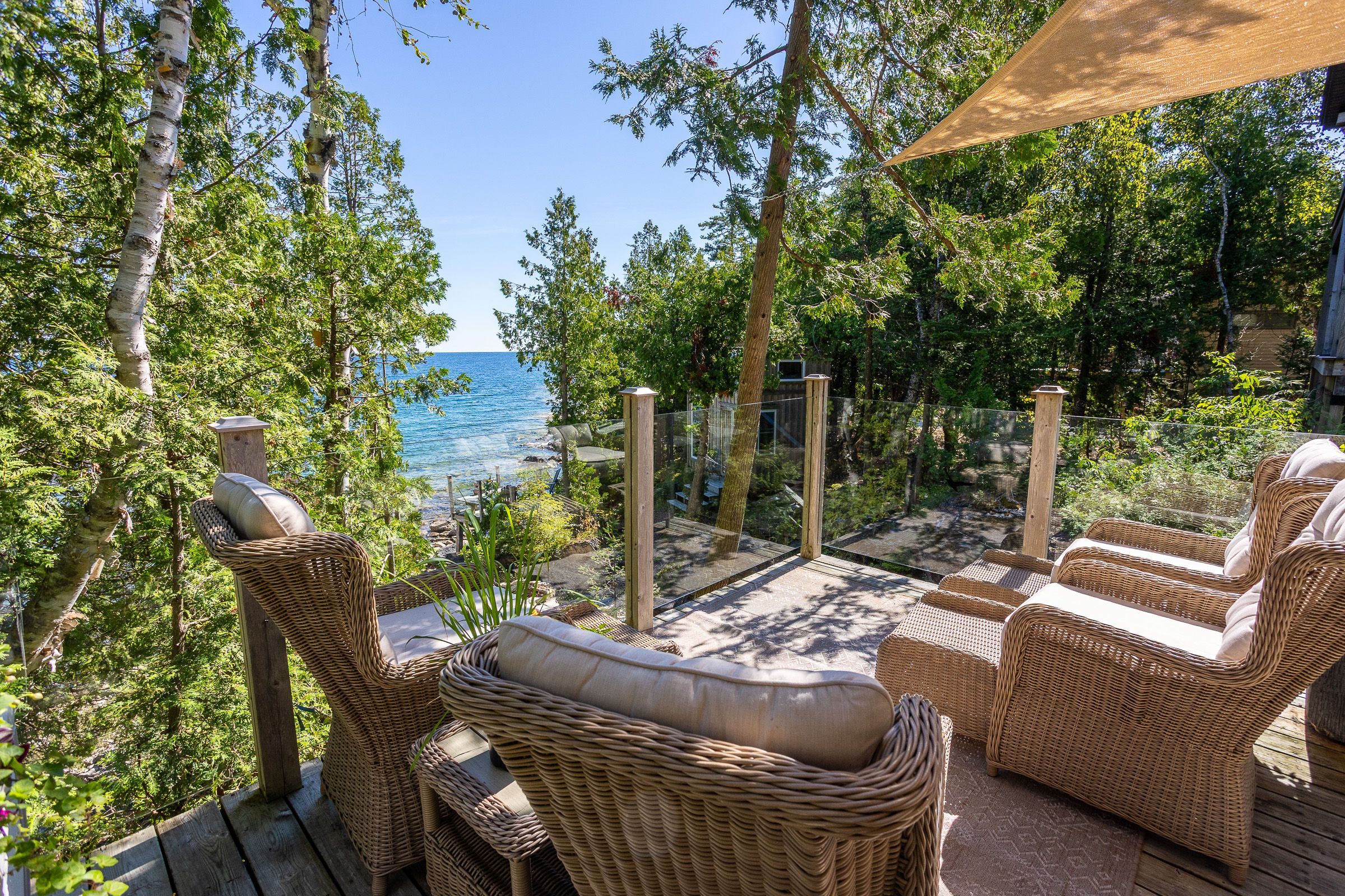 Welcome to your private Georgian Bay retreat in the heart of Tobermory-where contemporary design meets comfort and breathtaking natural beauty. Set on a rare protected cove with inspiring views toward Flowerpot and Bear's Rump Island, this extensively renovated waterfront home offers exceptional privacy just a short walk to the village, shops, and restaurants. Reimagined in 2019 with a complete down-to-the-studs extensive renovation and thoughtful addition, this 3+1 bedroom, 2-bath home was designed for energy efficiency. A 7.6kW solar system with net metering, SolarEdge inverter, and Level 2 EV charger pairs with a Zuba air-source heat pump for near net-zero living. Inside, warm modern finishes include ready-pine ceilings, custom Douglas fir stairs, and expansive windows framing the water. Durable concrete-effect flooring runs throughout, complemented by Italian porcelain tile and in-floor heat in the primary bath. A Blaze King Chinook wood stove adds efficiency and ambiance. All major systems were also updated in 2019, including plumbing, electrical, septic, windows, roofing (addition), and a 3-stage water purification system. Additional features include a custom office with built-ins, automatic closet lighting, and a heated, insulated crawl space. Outdoors, enjoy all-cedar decks, luxury hot tub, a waterfront platform, and beautifully landscaped stone patios (2023) with firepit and raised garden beds. The large single-car garage includes a garden prep/sink area. A charming two-level cedar bunkie at the water's edge (2017) provides extra guest space ( up to 4 people) and stunning views over Georgian Bay. Surrounded by nature trails and hiking, yet close to the harbour village, this property offers the perfect balance of privacy, efficiency, and waterfront living.