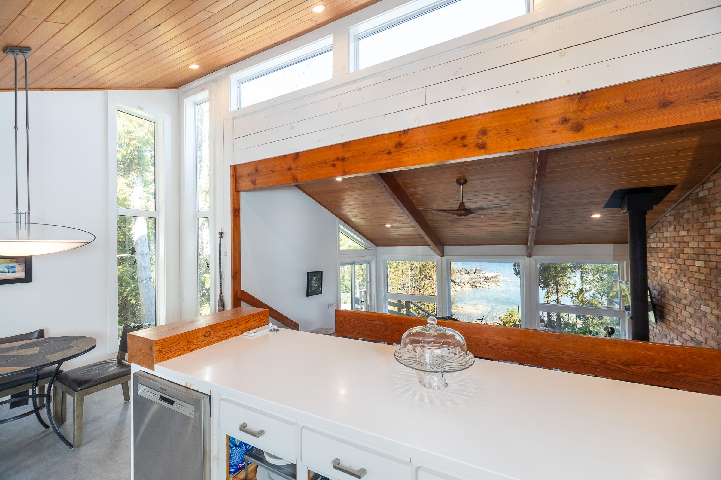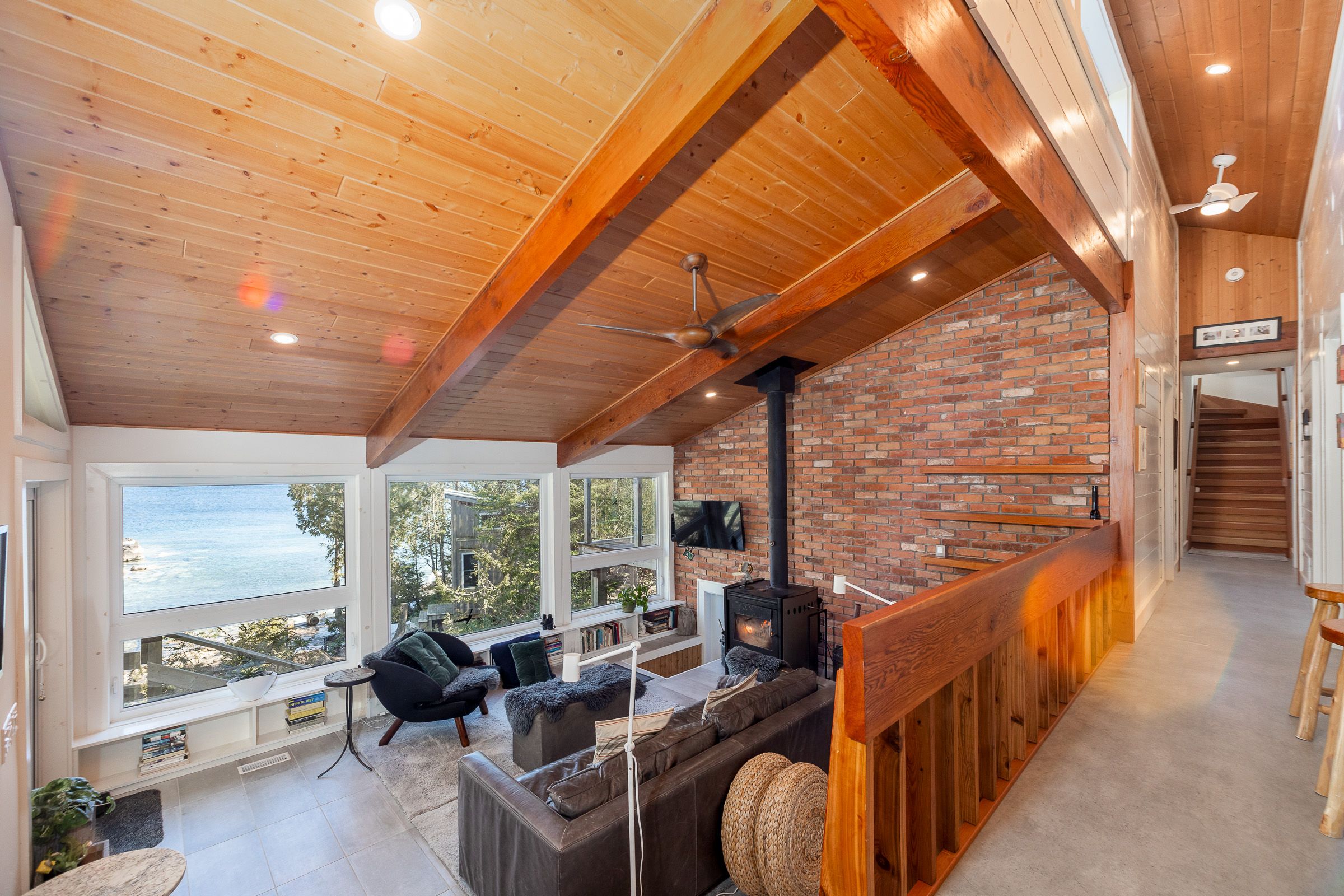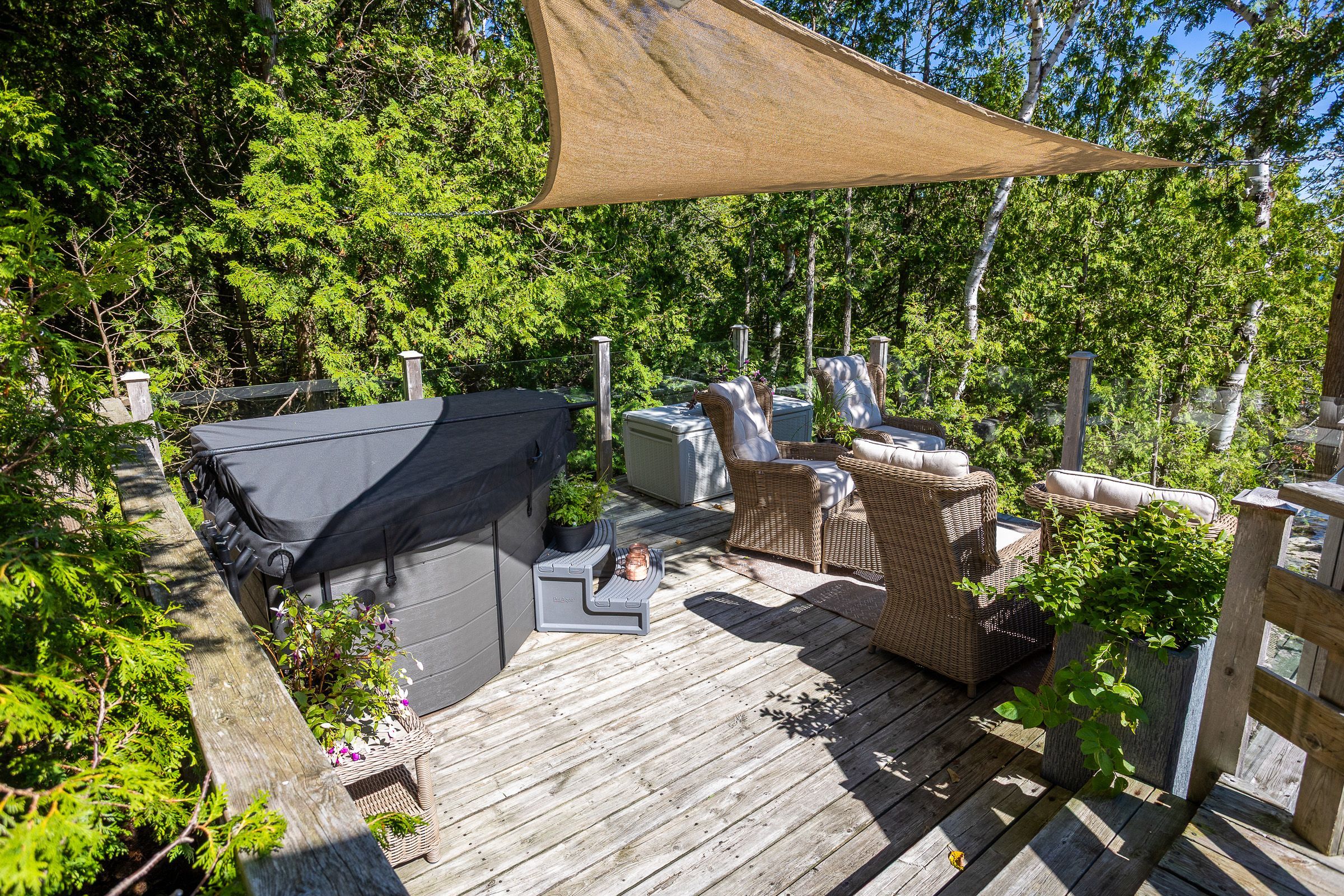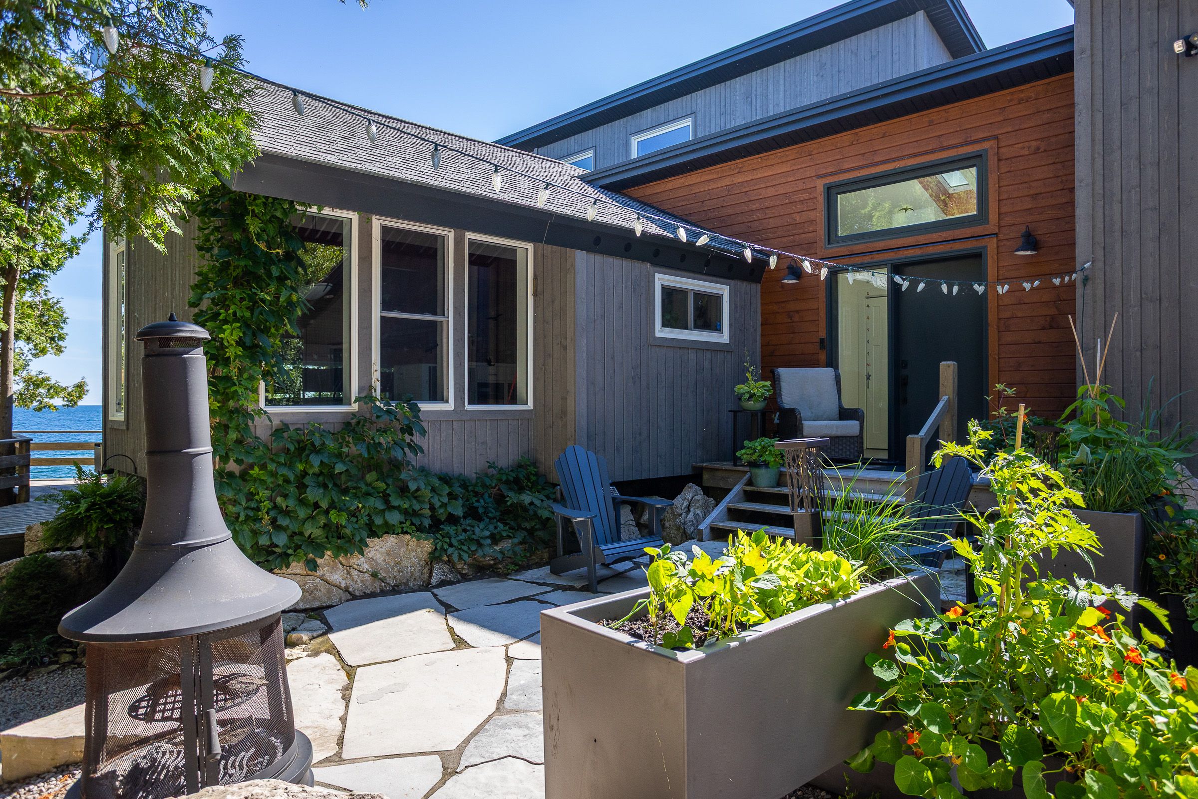 Welcome to your private Georgian Bay retreat in the heart of Tobermory-where contemporary design meets comfort and breathtaking natural beauty. Set on a rare protected cove with inspiring views toward Flowerpot and Bear's Rump Island, this extensively renovated waterfront home offers exceptional privacy just a short walk to the village, shops, and restaurants. Reimagined in 2019 with a complete down-to-the-studs extensive renovation and thoughtful addition, this 3+1 bedroom, 2-bath home was designed for energy efficiency. A 7.6kW solar system with net metering, SolarEdge inverter, and Level 2 EV charger pairs with a Zuba air-source heat pump for near net-zero living. Inside, warm modern finishes include ready-pine ceilings, custom Douglas fir stairs, and expansive windows framing the water. Durable concrete-effect flooring runs throughout, complemented by Italian porcelain tile and in-floor heat in the primary bath. A Blaze King Chinook wood stove adds efficiency and ambiance. All major systems were also updated in 2019, including plumbing, electrical, septic, windows, roofing (addition), and a 3-stage water purification system. Additional features include a custom office with built-ins, automatic closet lighting, and a heated, insulated crawl space. Outdoors, enjoy all-cedar decks, luxury hot tub, a waterfront platform, and beautifully landscaped stone patios (2023) with firepit and raised garden beds. The large single-car garage includes a garden prep/sink area. A charming two-level cedar bunkie at the water's edge (2017) provides extra guest space ( up to 4 people) and stunning views over Georgian Bay. Surrounded by nature trails and hiking, yet close to the harbour village, this property offers the perfect balance of privacy, efficiency, and waterfront living.