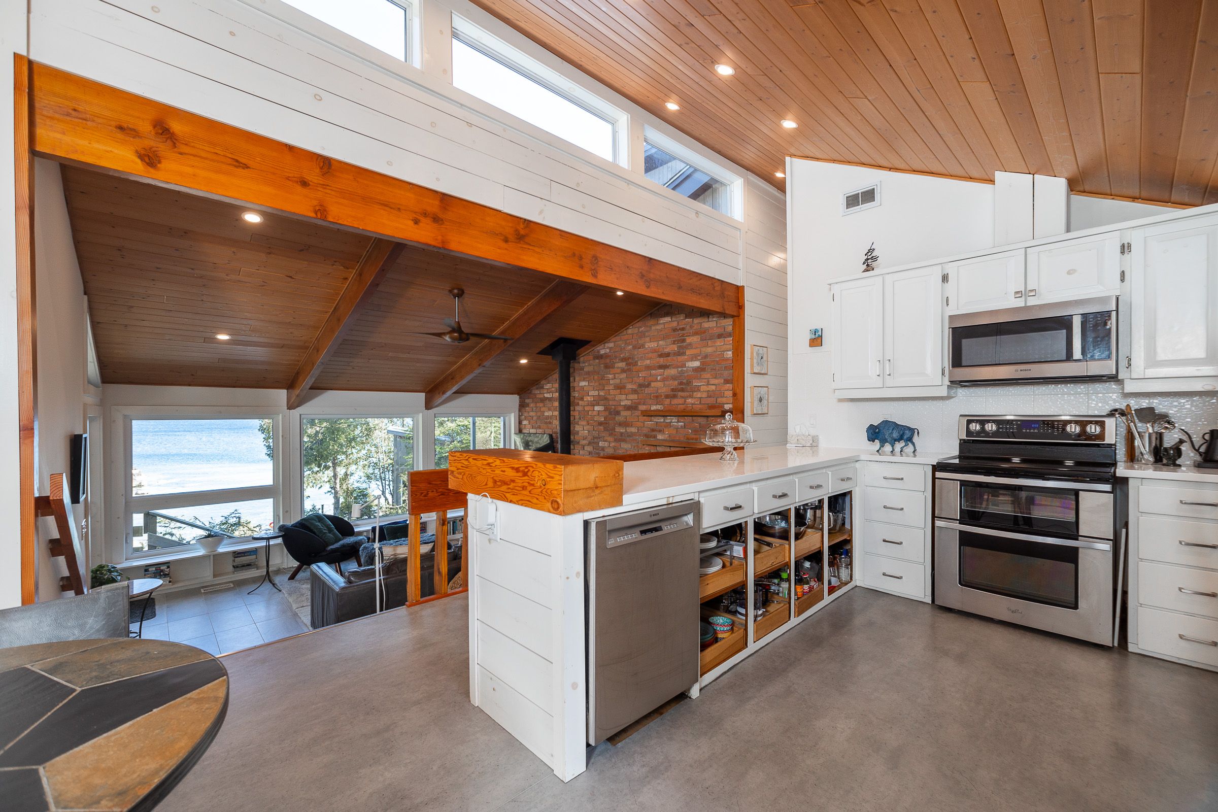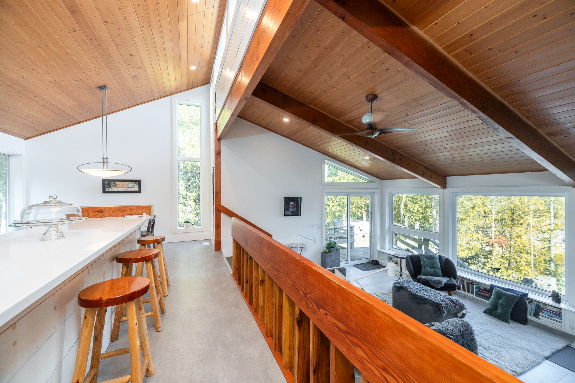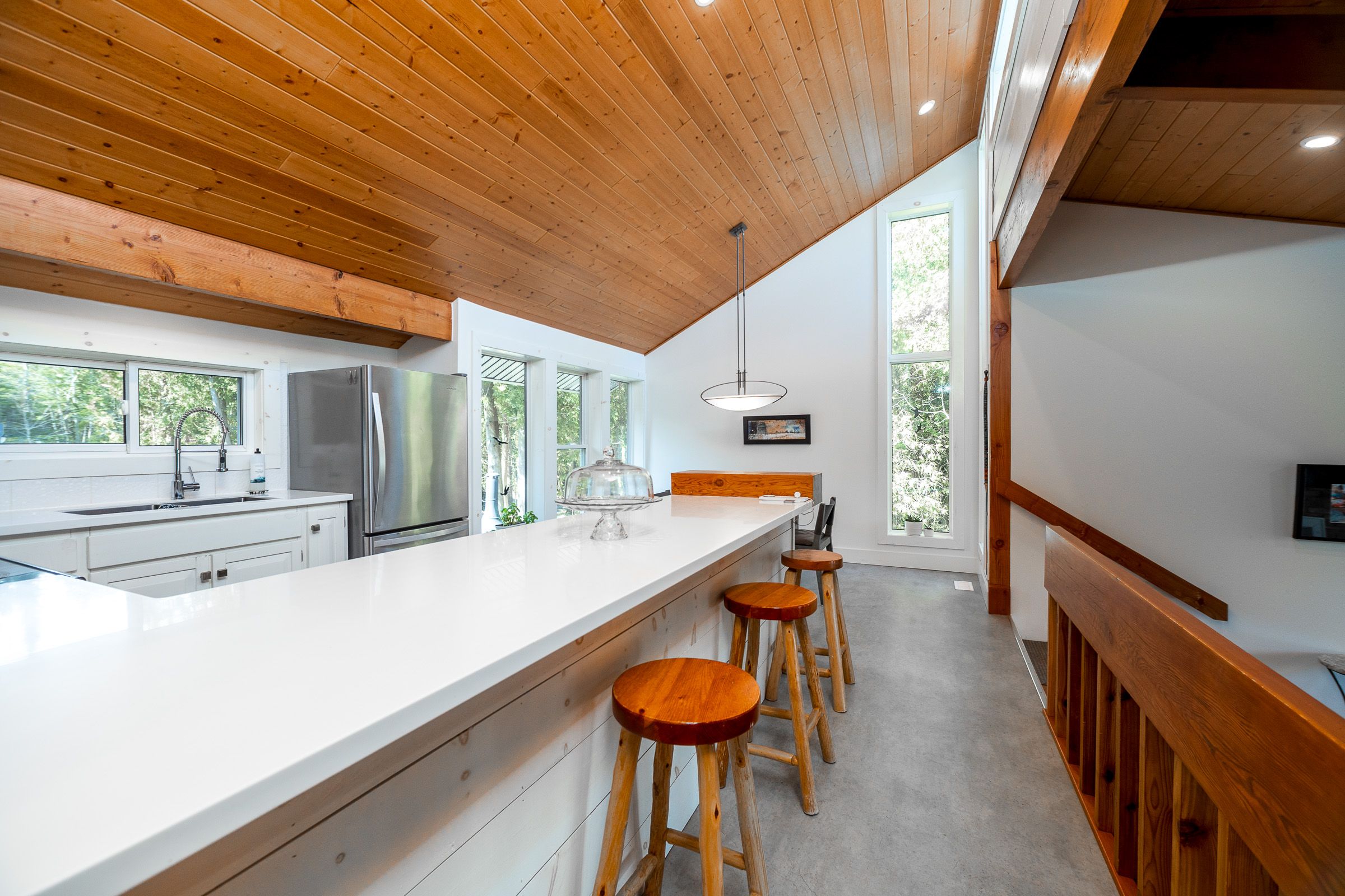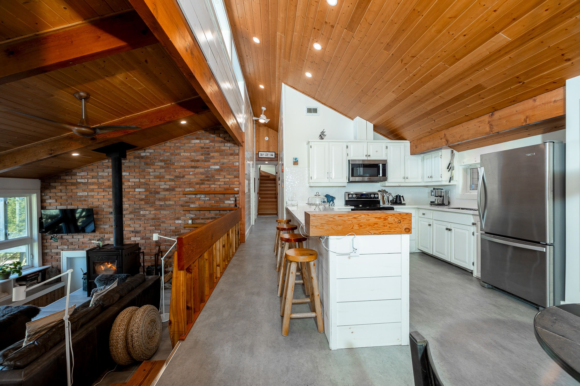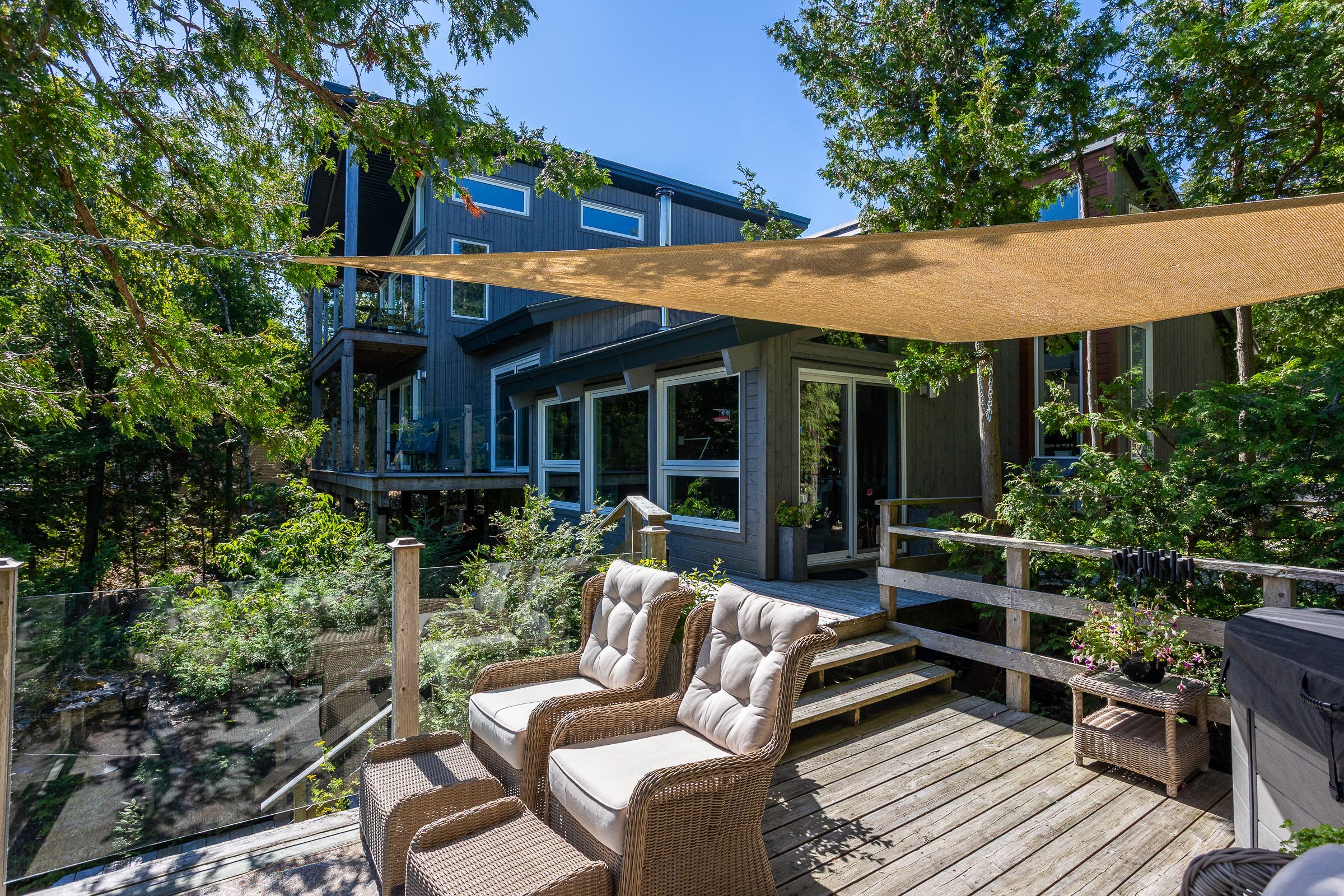 Welcome to your private Georgian Bay retreat in the heart of Tobermory-where contemporary design meets comfort and breathtaking natural beauty. Set on a rare protected cove with inspiring views toward Flowerpot and Bear's Rump Island, this extensively renovated waterfront home offers exceptional privacy just a short walk to the village, shops, and restaurants. Reimagined in 2019 with a complete down-to-the-studs extensive renovation and thoughtful addition, this 3+1 bedroom, 2-bath home was designed for energy efficiency. A 7.6kW solar system with net metering, SolarEdge inverter, and Level 2 EV charger pairs with a Zuba air-source heat pump for near net-zero living. Inside, warm modern finishes include ready-pine ceilings, custom Douglas fir stairs, and expansive windows framing the water. Durable concrete-effect flooring runs throughout, complemented by Italian porcelain tile and in-floor heat in the primary bath. A Blaze King Chinook wood stove adds efficiency and ambiance. All major systems were also updated in 2019, including plumbing, electrical, septic, windows, roofing (addition), and a 3-stage water purification system. Additional features include a custom office with built-ins, automatic closet lighting, and a heated, insulated crawl space. Outdoors, enjoy all-cedar decks, luxury hot tub, a waterfront platform, and beautifully landscaped stone patios (2023) with firepit and raised garden beds. The large single-car garage includes a garden prep/sink area. A charming two-level cedar bunkie at the water's edge (2017) provides extra guest space ( up to 4 people) and stunning views over Georgian Bay. Surrounded by nature trails and hiking, yet close to the harbour village, this property offers the perfect balance of privacy, efficiency, and waterfront living.