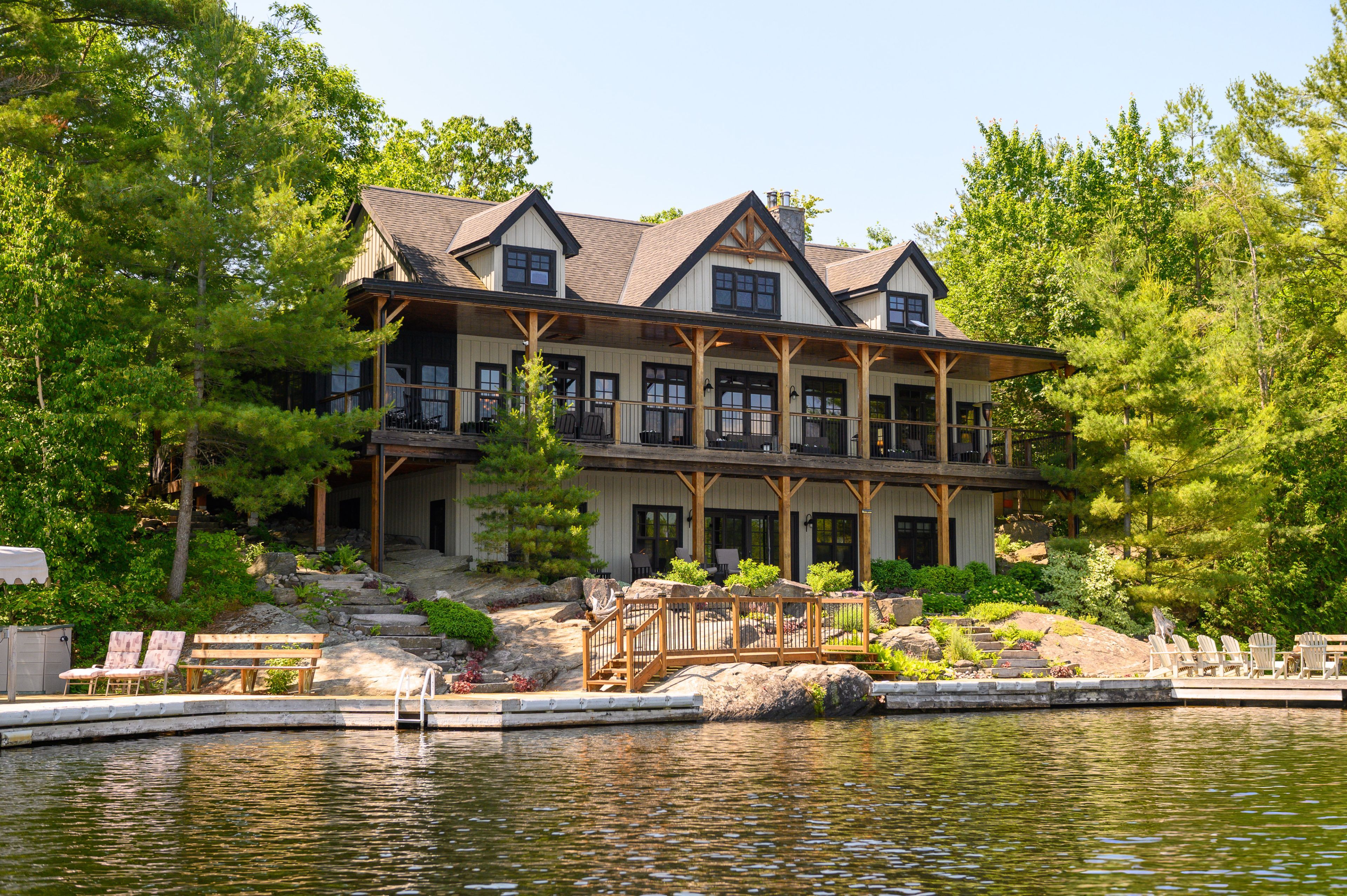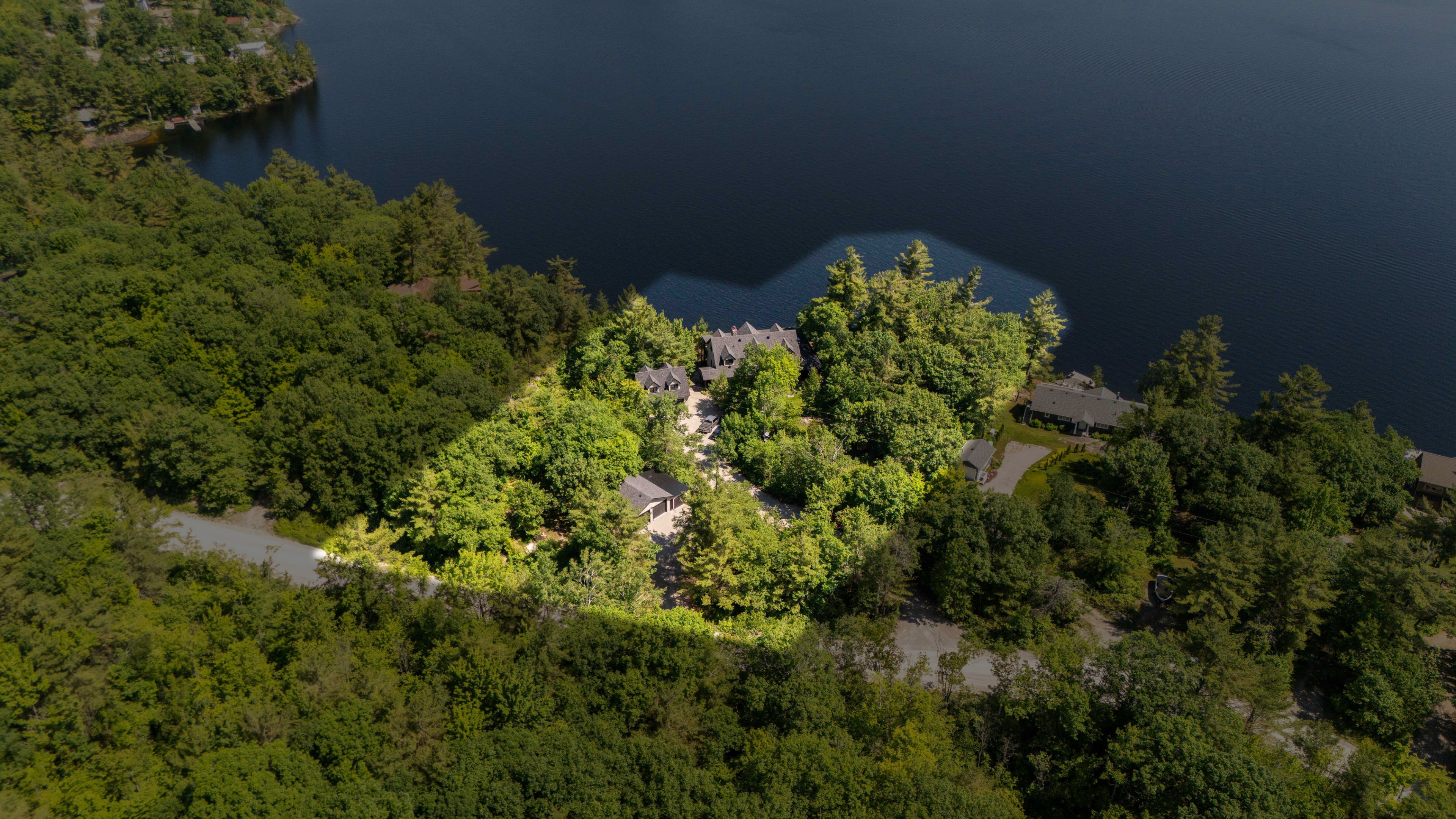 Remarkable Muskoka lakeside retreat on Six Mile Lake, on year-round municipal road, only 90 minutes from GTA. Impressive custom-build w/stunning lake views may be most prestigious property on "the mile." Expansive 333ft of prime, deep waterfront, 1.66 acres w/mature trees & privacy, & absolute show-stopper 6000 sqft, 6 bedrm lake house w/gorgeous pine detail T/O. Open-concept main lvl overlooks lake & accesses the 68x12 covered deck, & includes the kitchen w/quartz CTs & 11ft centre island w/breakfast bar, great rm w/granite stone F/P & 22ft vaulted ceiling, spacious dining rm, main floor primary bedrm w/6pce ensuite, Muskoka rm,2pce bath, & mud rm/laundry rm. 2nd lvl has a den/office, & 2 very large bedrms that could be converted to 4 if desired. Walk-out lower lvl offers a family rm w/granite stone F/P, bar area w/seating for 6, 3 more large bedrms, 8pce bath, & sliding doors to patio & lake. Red Pine &slate floors T/O, 10ft ceilings & in-floor heating on main & lower lvl, pine ceilings, & post &beam construction & ICF foundation, all display the care in this magnificent homes design. Exterior offers an oversized double garage w/600sqft man cave/loft w/heat & AC, triple garage w/2 insulated & heated, & another single garage at side of property, plus parking for 20 more on driveways. Clear & pristine waterfront 6-12ft deep off docks, + bonus shallow wading area at side. 1500sqft of decks & docks along water, including U-shaped boat slip engineered to support a boathouse, plus 1400 sqft of covered deck & patio overlooking the water, & 450 sqft of deck at back of home, totalling over 3350 sqft of decking & patio. NE exposure at waterfront provides beautiful sunrises &sunsets. 280 sqft bunkie at water's edge. Systems include geothermal heating/cooling, drilled well w/complete water system, bio-filter septic system, on-demand water heater, & generator. Contact listing Realtor or any Realtor for floor plans, boathouse drawings, & for full write-up & details of property.