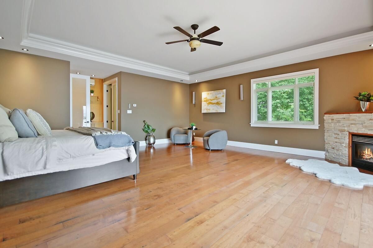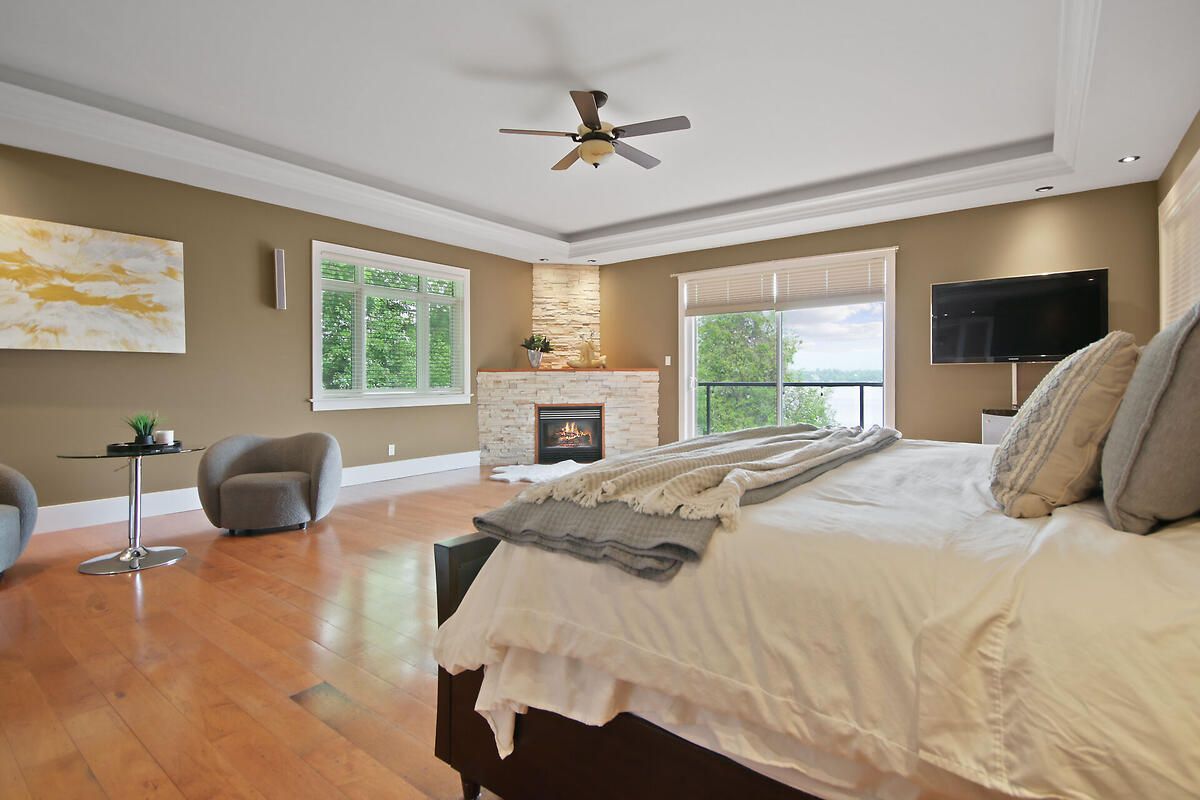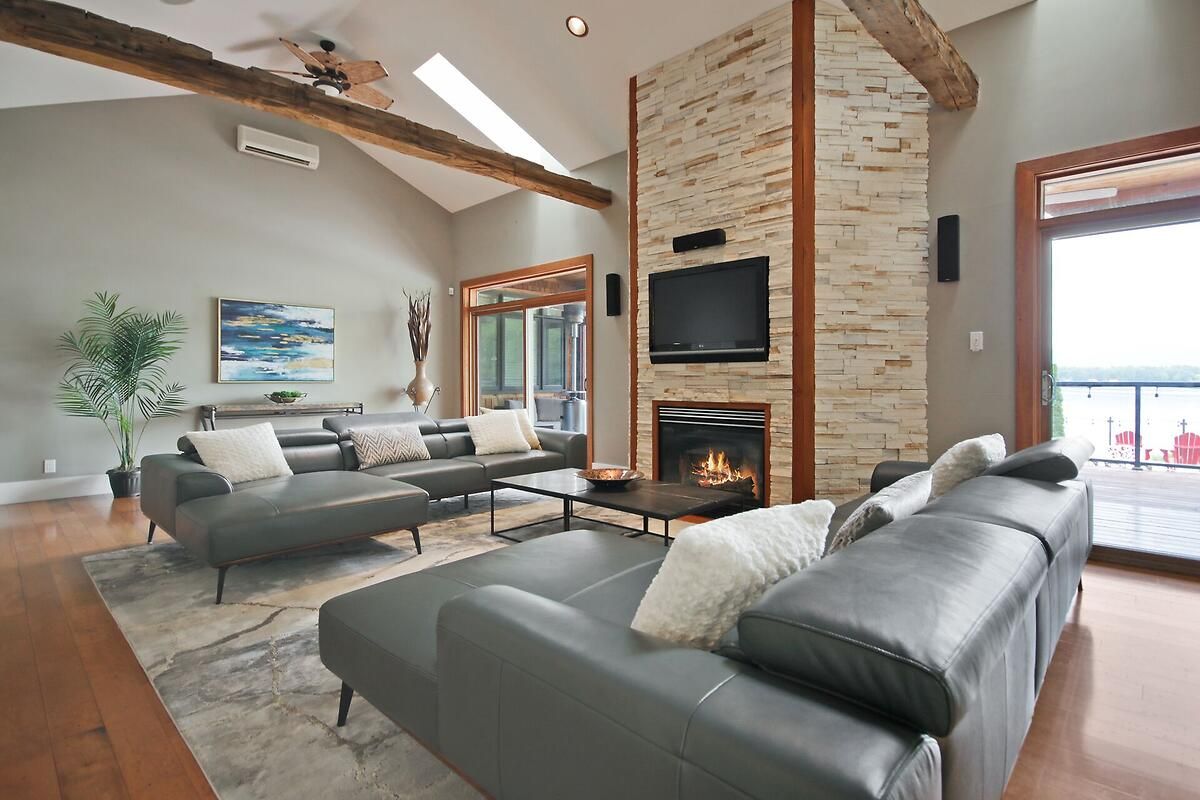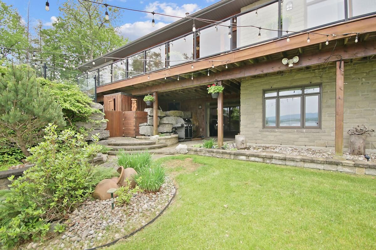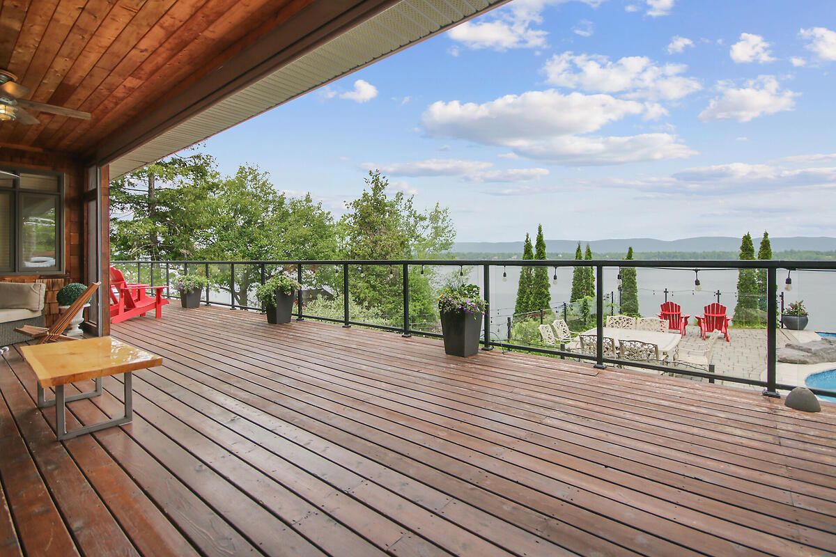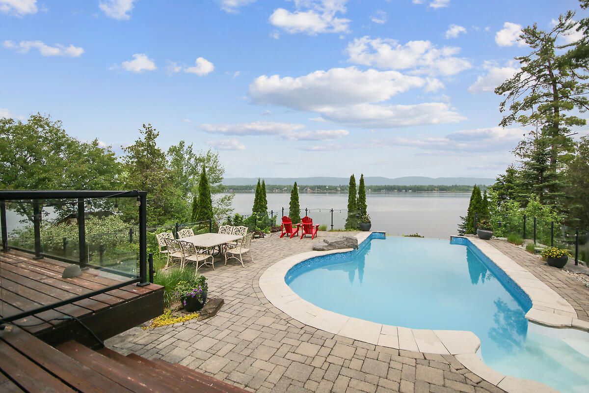 This gorgeous 5 bedroom, 3 bathroom waterfront home is truly one of a kind. Enter into the foyer and immediately be taken away by the breath taking views of the hills across the stunning waterfront. The foyer opens up to the spectacular living room featuring a fireplace, 2 skylights and 2 large sliding doors leading out to the screened in deck. This grand living room is open to the eat-in kitchen featuring stainless steel appliance, built in wine racks, ample cupboard space and an addition sliding door leading out to the massive deck. On the main level you will also find the incredibly spacious primary bedroom featuring a walk-in closet, 4 piece ensuite, fireplace and additional sliding doors leading out to the deck. This is the perfect couples retreat in your very own home. On the lower level you will find a centrally built wet bar and home theatre, perfect for entertaining, along with addition sitting space, 4 bright bedrooms and a 6 piece bathroom. The 1800 sqft heated garage with high ceilings offers ample storage space and opportunity for car lifts. The most notable part of this one of a kind home is by far the outdoor space. Not only is the screened in deck, massive uncovered deck, and large yard a wonderful space to enjoy all to yourselves or host guests, but the in-ground infinity pool and sandy shore line is every outdoor lovers dream. Enjoy a day of boating on the Ottawa River from your very own private dock. The spectacular waterfront offers prime views of sunrise and sunset all summer long and year round sunsets that are truly remarkable. No detail was missed inside or out in the design of this stunning property. NEW IN 2025 : NEW ULTRA VOILET SYSTEM, REVERSE OSMOSIS SYSTEM, FRIDGE, MICROWAVE, WASHER, DISHWASHER,HEAT PUMPS, POOL COMPUTER, POWDER ROOM TOILET, 3 WATER SOFTENERS , new 17k BOILER & JET PUMP - ALL NEW THIS YEAR.