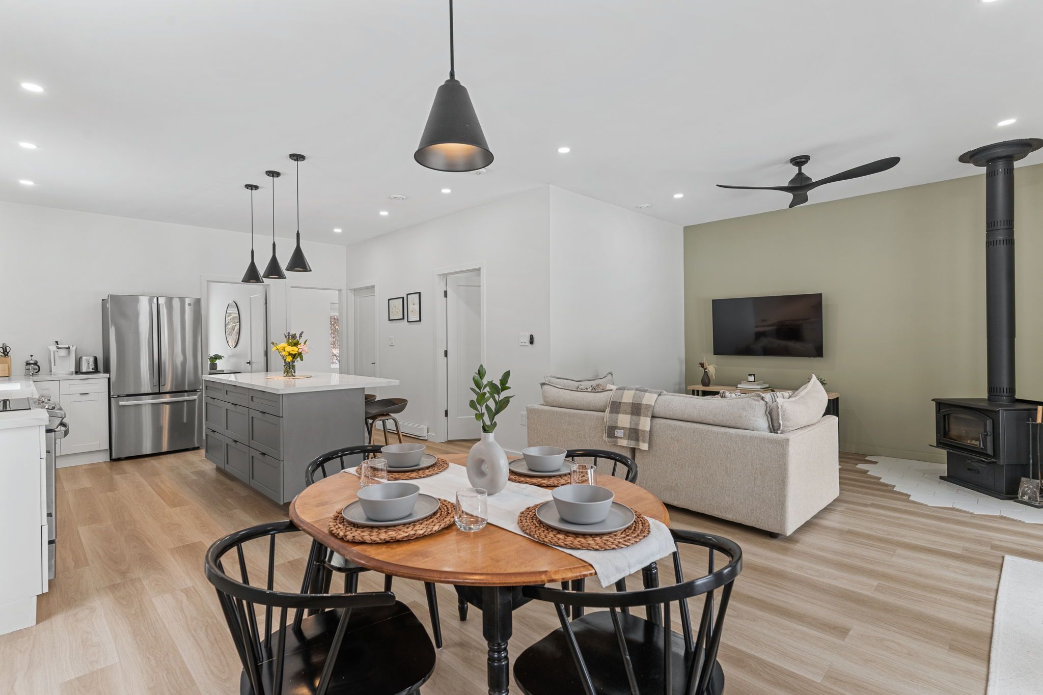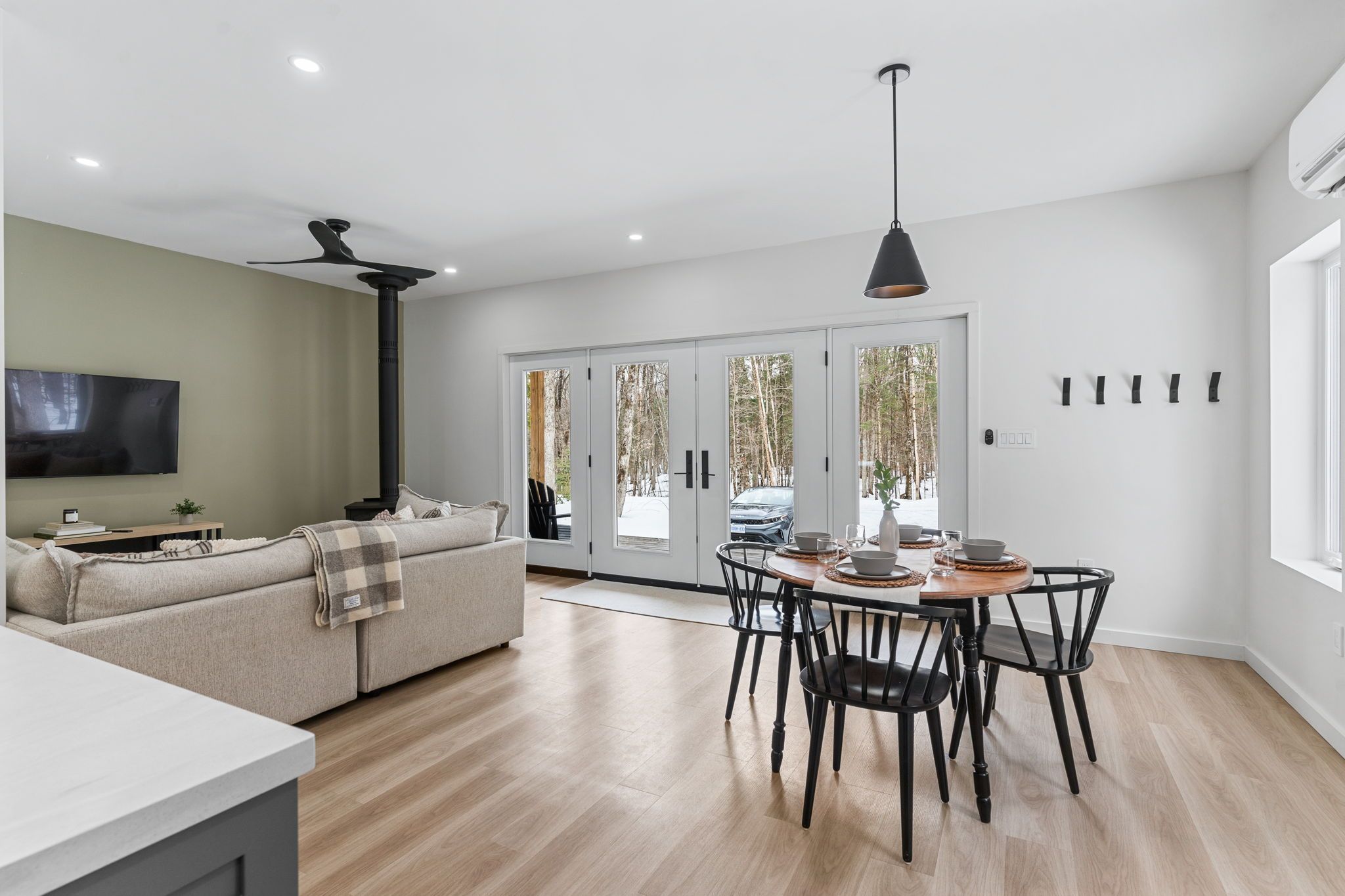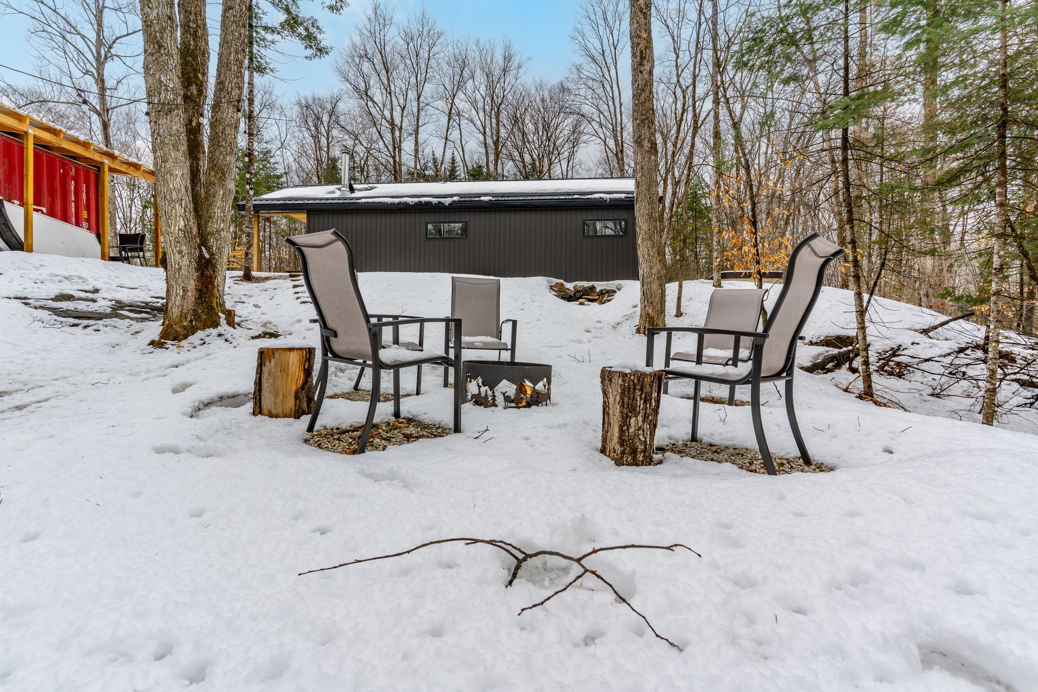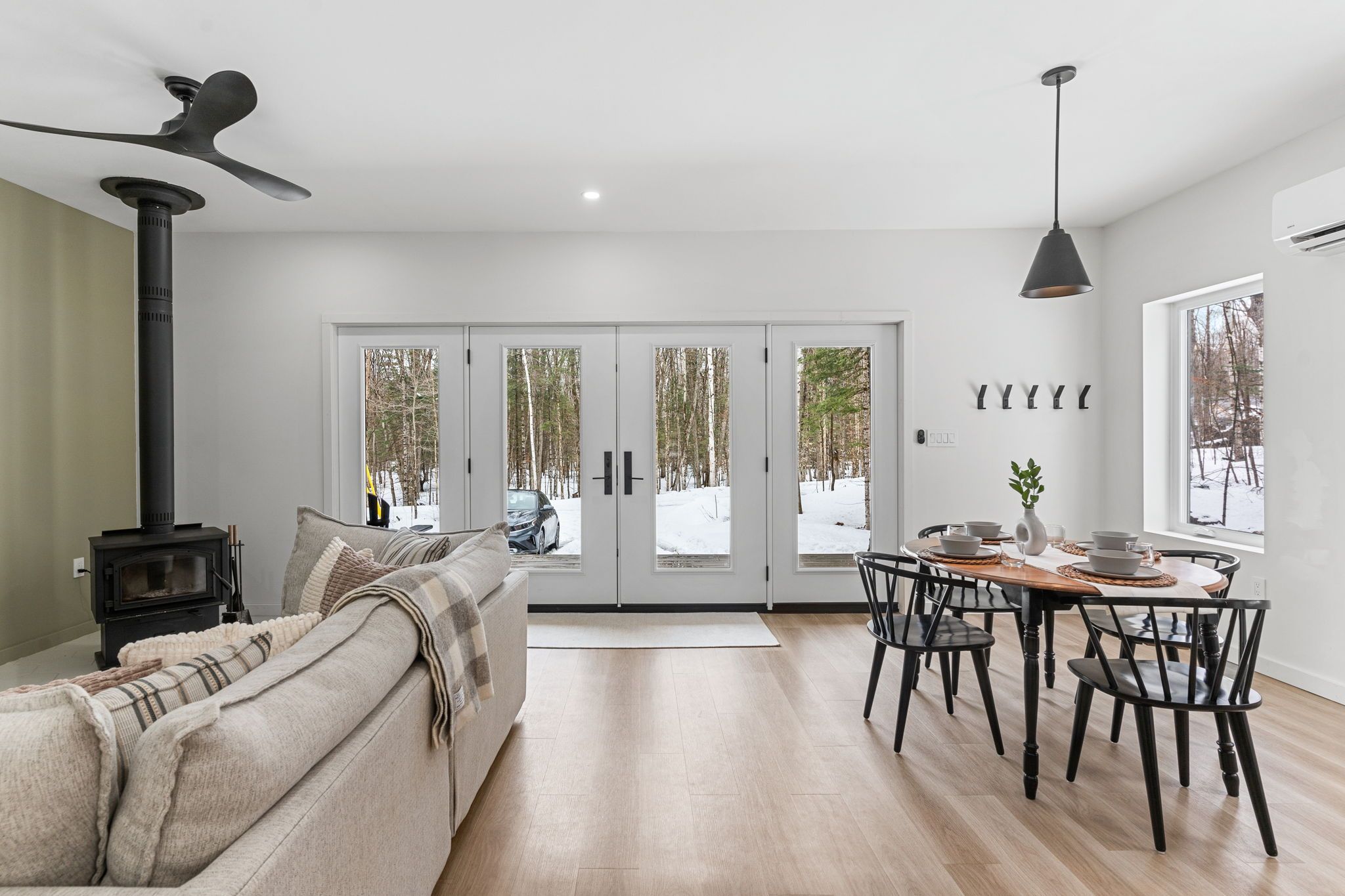 Experience the ultimate 4-season Eagle Lake retreat at 1366 Basshaunt Lake Road, a stunning modern bungalow completed in 2023. Nestled on a private, well-treed lot, this home welcomes you with a spacious covered front veranda - the perfect spot to enjoy your morning coffee while surrounded by the quiet of the forest. Inside, the bright and airy open-concept living space is defined by natural light and a cozy woodstove that provides a warm, central hearth for winter gatherings. The sleek, contemporary kitchen is a chef's delight, featuring Corian countertops, stainless steel appliances, and an oversized island designed for social gatherings and casual dining. The home offers two generous bedrooms, including a primary suite with a private walkout to the backyard. Outside, the level property offers plenty of usable space, a dedicated firepit area for starlit evenings, and a handy storage shed. Built for low-maintenance living, the home features a durable metal roof, efficient mini-split heating and cooling, and a sleek, modern bathroom with an integrated stackable laundry. Located in the premium Eagle Lake area, you are within walking distance of the Basshaunt Lake public access and just minutes from Eagle Lake's best amenities. Spend your days at Sir Sam's Ski & Ride, indulge in the spa and fine dining at Sir Sam's Inn, or enjoy the public sandy beach and boat launch at Eagle Lake. With an successful short-term rental history, this turn-key property is ready to serve as your private four-season retreat or a high-performing investment in Haliburton.