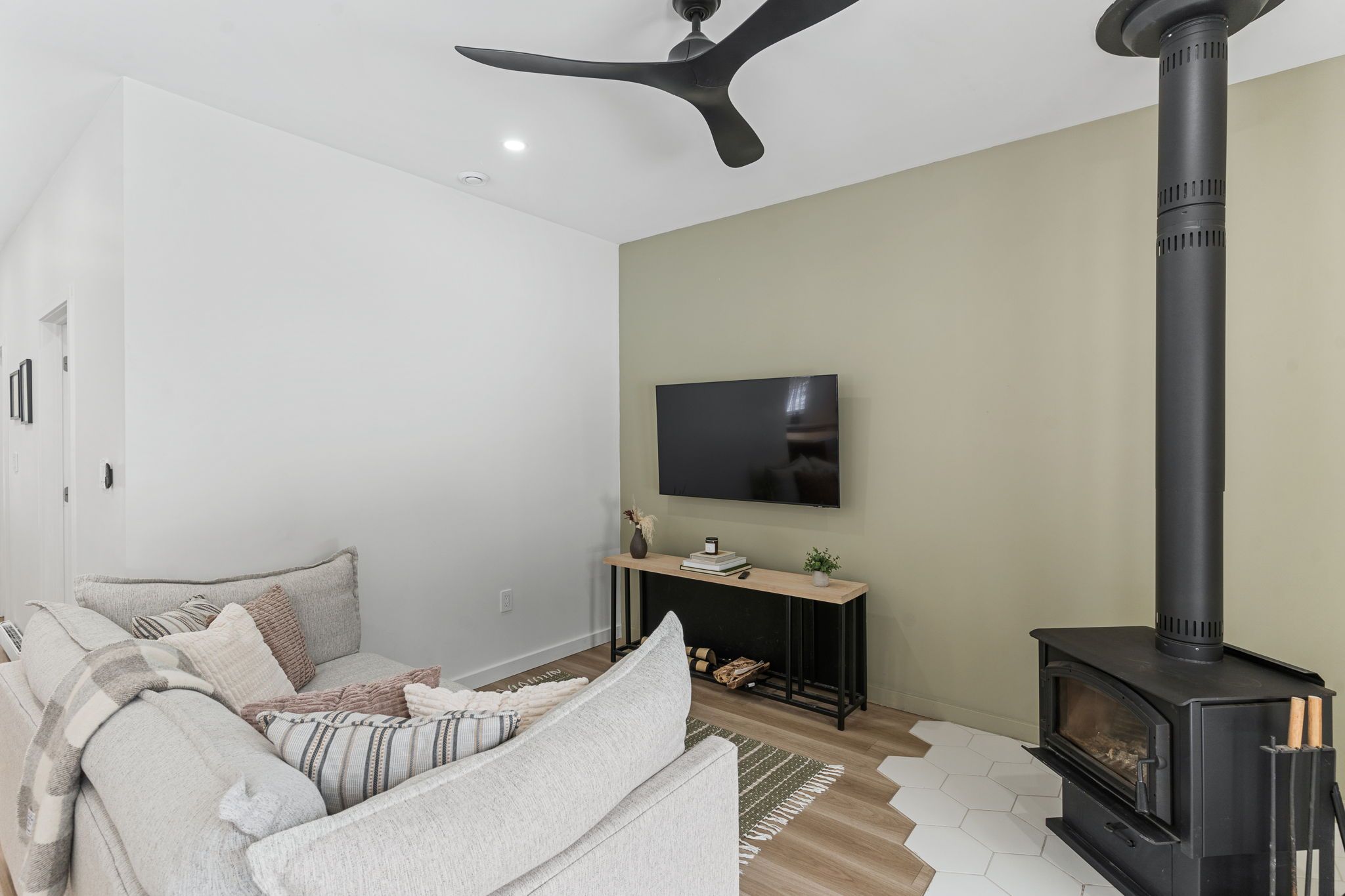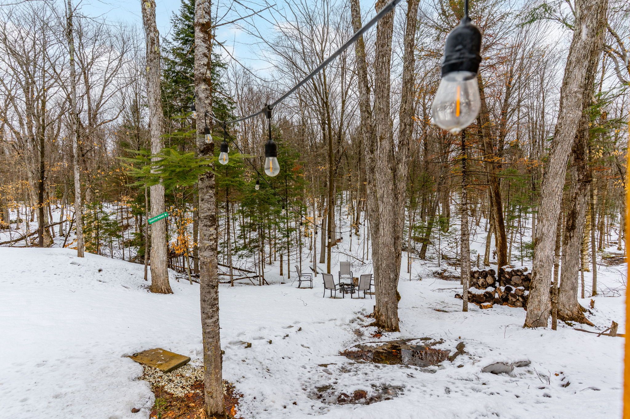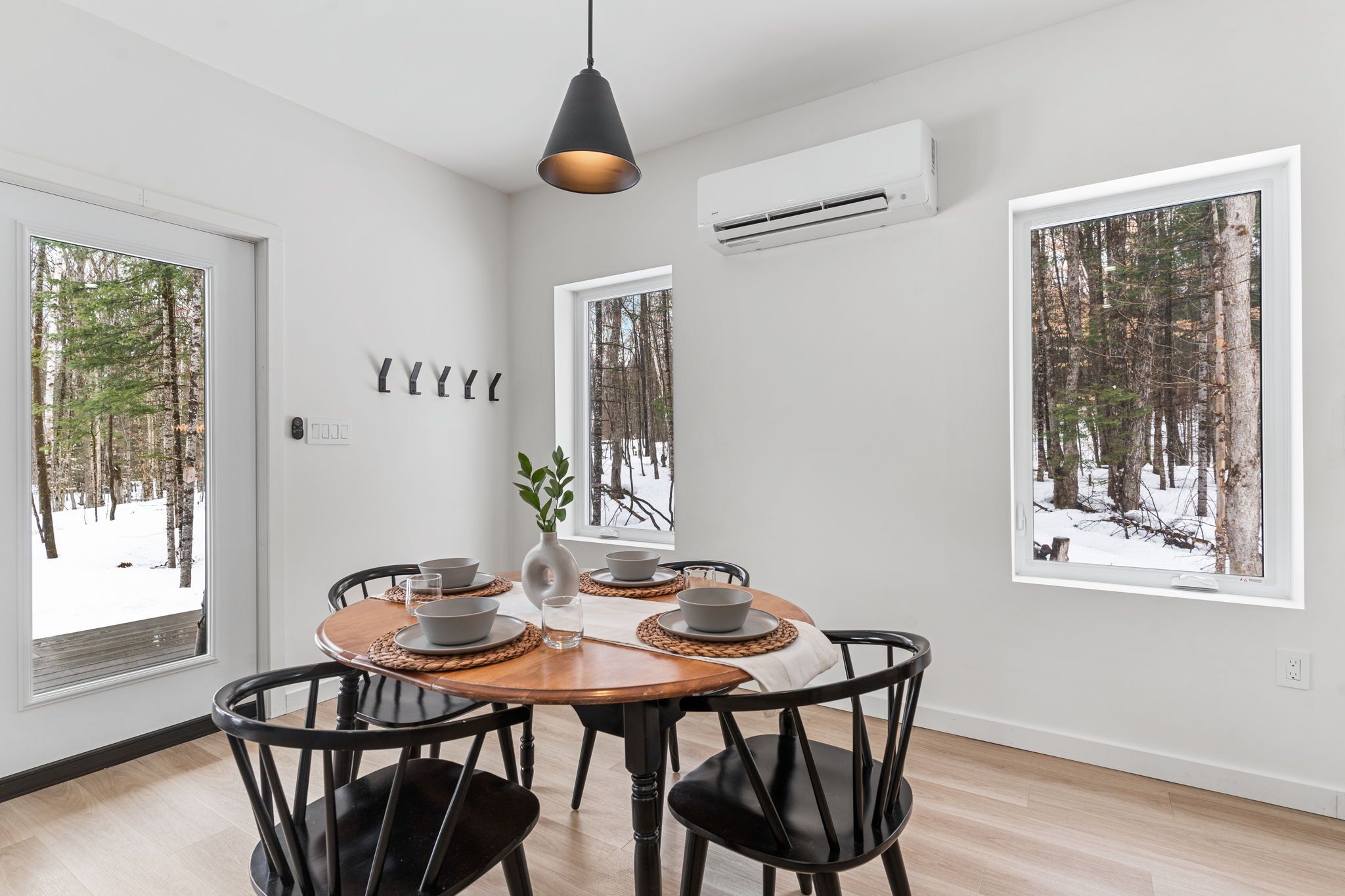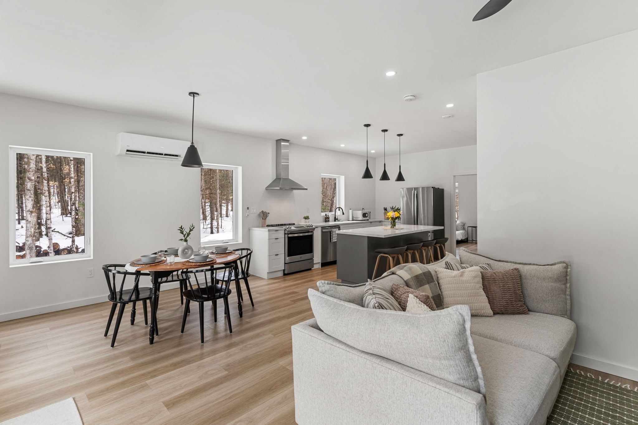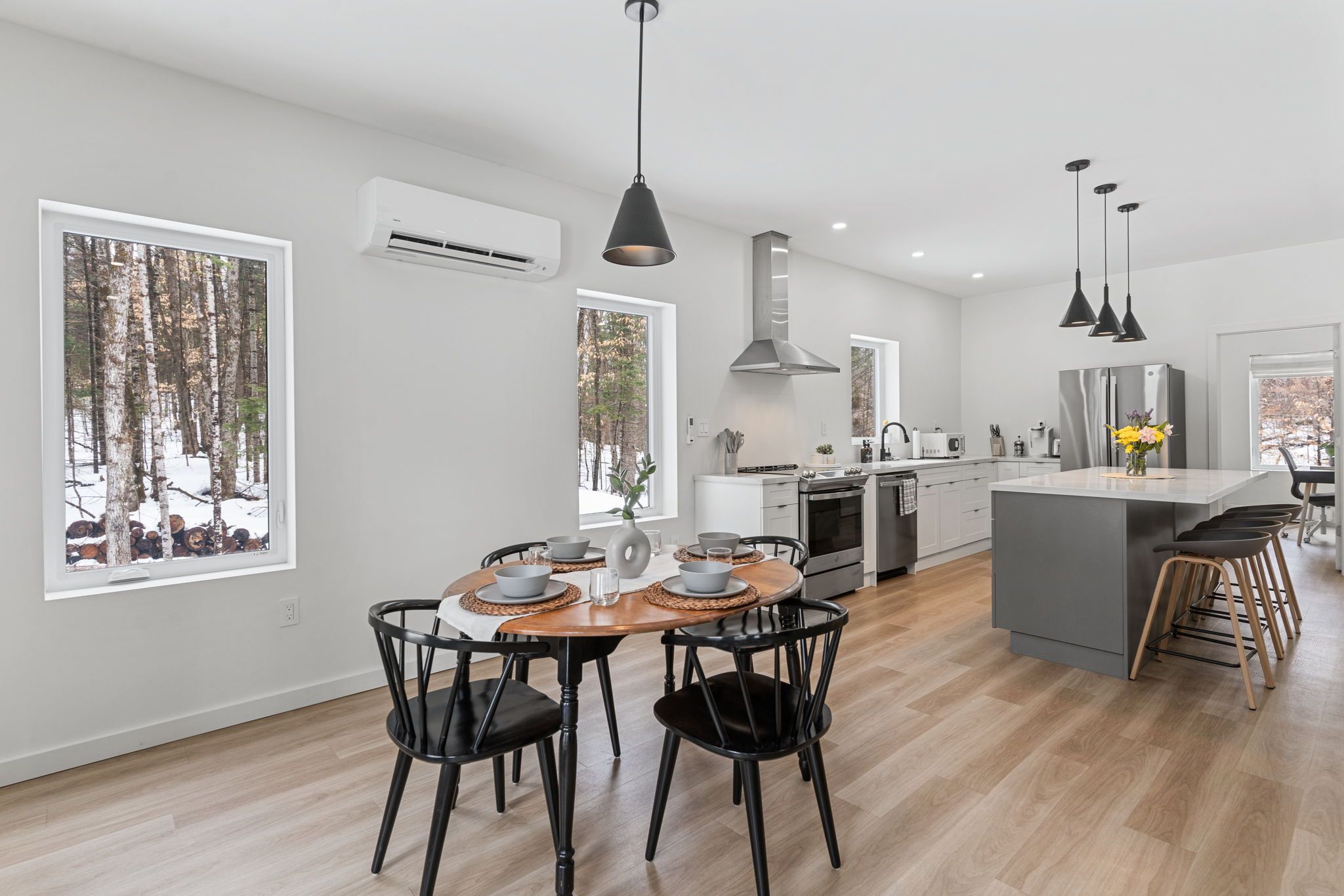 Experience the ultimate 4-season Eagle Lake retreat at 1366 Basshaunt Lake Road, a stunning modern bungalow completed in 2023. Nestled on a private, well-treed lot, this home welcomes you with a spacious covered front veranda - the perfect spot to enjoy your morning coffee while surrounded by the quiet of the forest. Inside, the bright and airy open-concept living space is defined by natural light and a cozy woodstove that provides a warm, central hearth for winter gatherings. The sleek, contemporary kitchen is a chef's delight, featuring Corian countertops, stainless steel appliances, and an oversized island designed for social gatherings and casual dining. The home offers two generous bedrooms, including a primary suite with a private walkout to the backyard. Outside, the level property offers plenty of usable space, a dedicated firepit area for starlit evenings, and a handy storage shed. Built for low-maintenance living, the home features a durable metal roof, efficient mini-split heating and cooling, and a sleek, modern bathroom with an integrated stackable laundry. Located in the premium Eagle Lake area, you are within walking distance of the Basshaunt Lake public access and just minutes from Eagle Lake's best amenities. Spend your days at Sir Sam's Ski & Ride, indulge in the spa and fine dining at Sir Sam's Inn, or enjoy the public sandy beach and boat launch at Eagle Lake. With an successful short-term rental history, this turn-key property is ready to serve as your private four-season retreat or a high-performing investment in Haliburton.