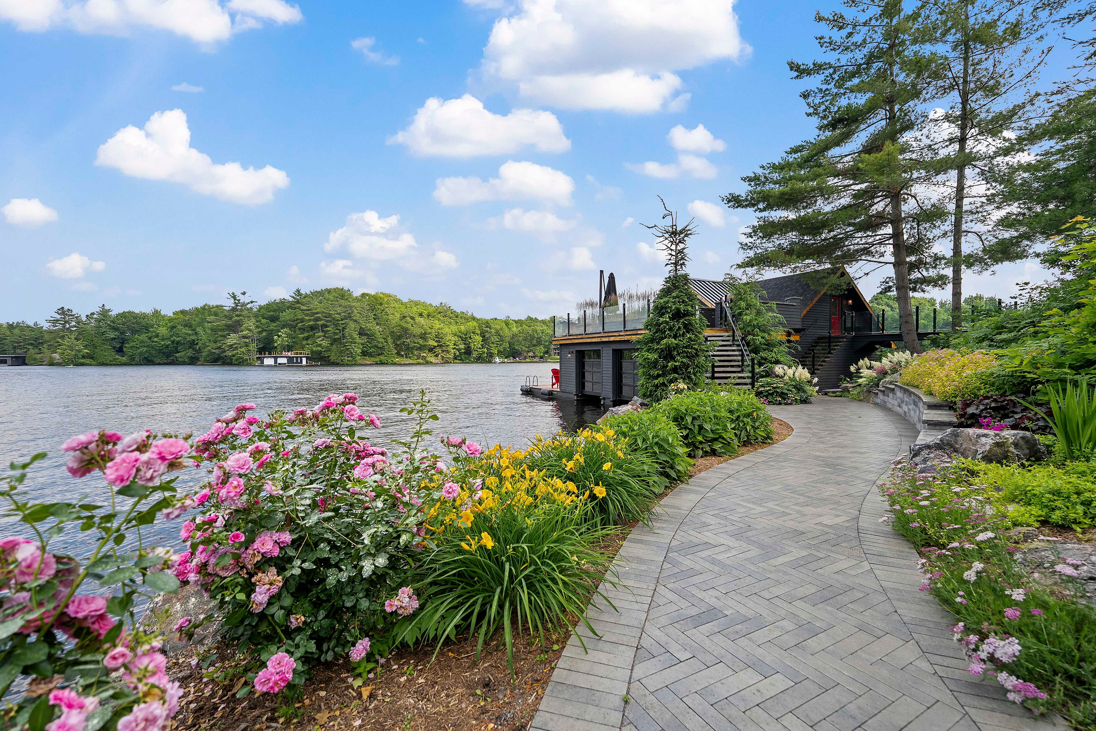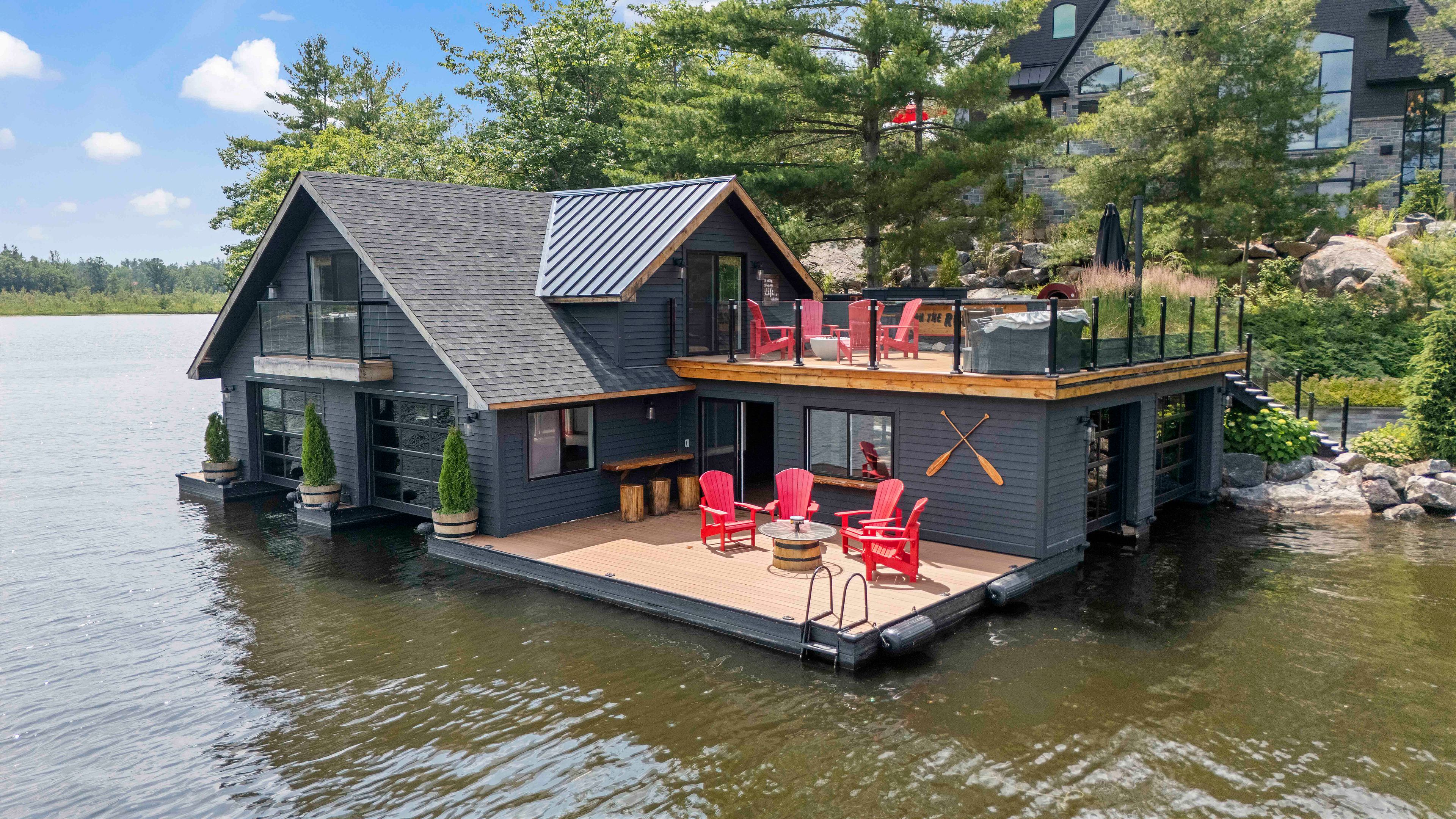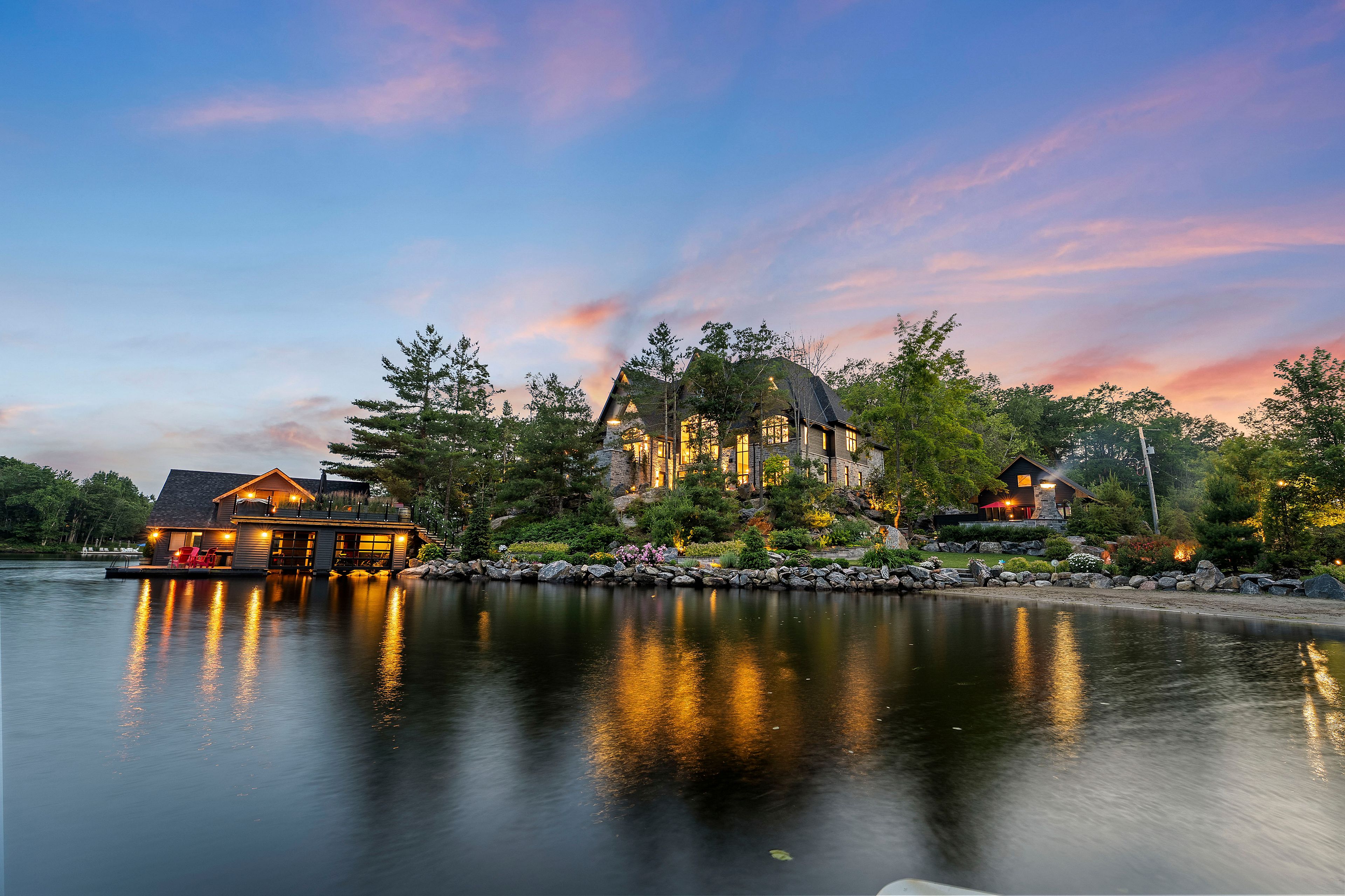 The Pinnacle of Muskoka Luxury: A Private Lakefront Estate! Discover the ultimate Muskoka lifestyle on 2.83 acres with 270 feet of pristine Lake Muskoka shoreline and an additional 420 feet of North-side waterfront. This exceptional compound features a magnificent main residence, four-slip boathouse, refined four-season bunkie and every high-end amenity imaginable, fully furnished with brand-new designer-selected pieces. The main-level great room impresses with soaring 18-foot vaulted ceilings, a dramatic stone accent wall with fireplace, and striking hardwood beam details. The chef's kitchen is a masterpiece, featuring an 11-foot island, premium appliances, walk-in pantry, hidden in-cabinet fridge, bar fridge, and ice maker. The upper level primary suite offers stunning lake views, soaring ceilings, a spa-inspired bathroom with in-floor heating, and a 200 sq ft walk-in closet. The lower level is designed for entertaining with 10-foot ceilings, full bar, wine cellar, gym, billiards room and walkout to the lake. The four-season bunkie, incl. 2 bedrooms + loft, provides an elevated guest retreat with stone patio, outdoor fireplace and 6 person hot tub. The boathouse anchors the waterfront experience with 4 boat slips, three hydraulic lifts, and two Sea-Doo lifts. Its rooftop deck is an entertainer's paradise with a bar, pizza oven and TV on an elevator lift, perfect for gatherings and sunsets. Additional highlights include a professional six-hole putting green, heated three-car garage, flagstone steps to the water, paved parking for up to 20 vehicles, a motorcoach pad with hookups, outdoor fireplaces and meticulously landscaped grounds with irrigation and over 100 exterior lights. This rare and magnificent estate represents the essence of Muskoka luxury: a private sanctuary, a premier entertaining destination and an incomparable retreat just a short drive from the city, where every detail has been thoughtfully designed for elegance, comfort and year-round enjoyment.