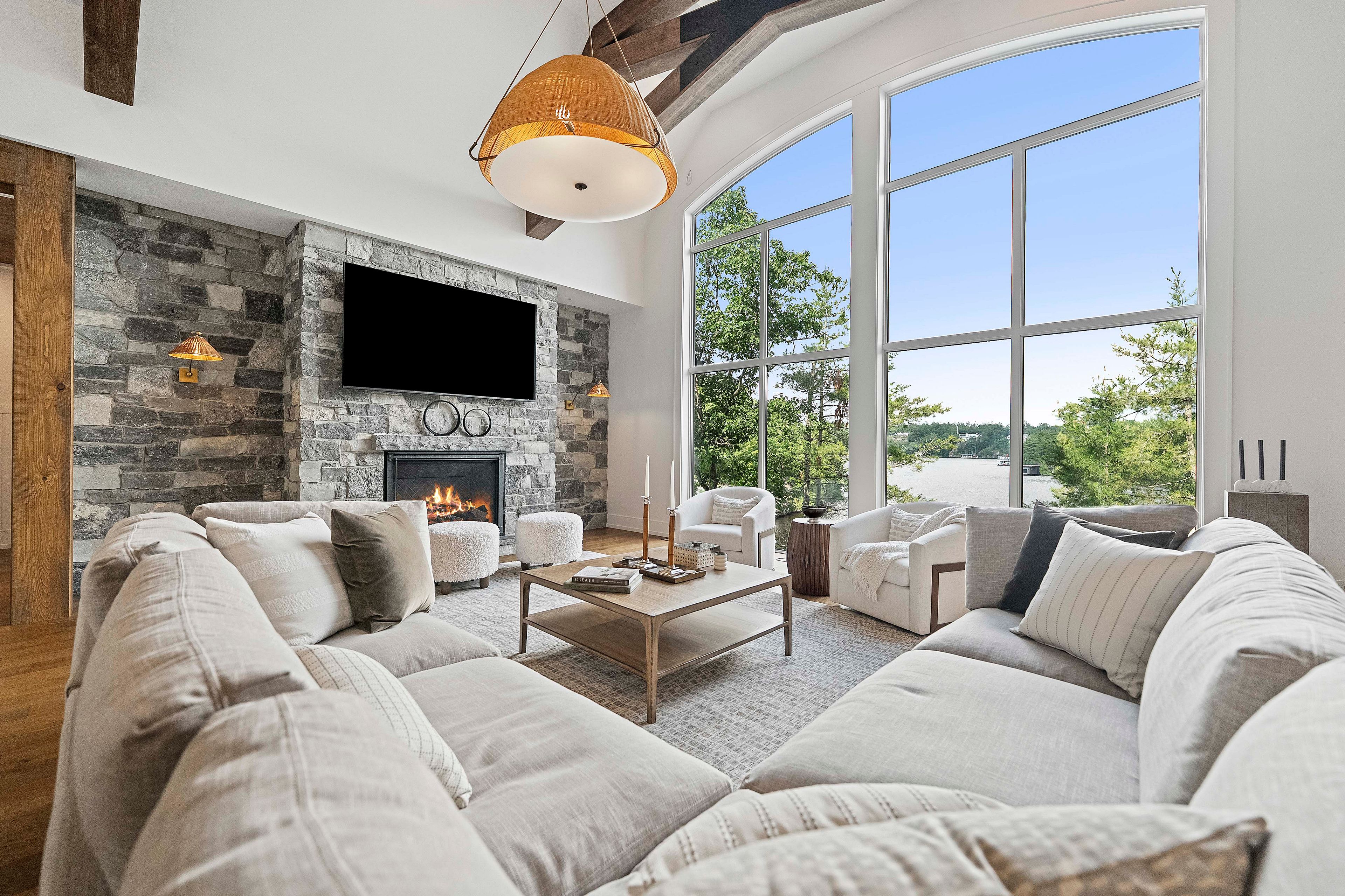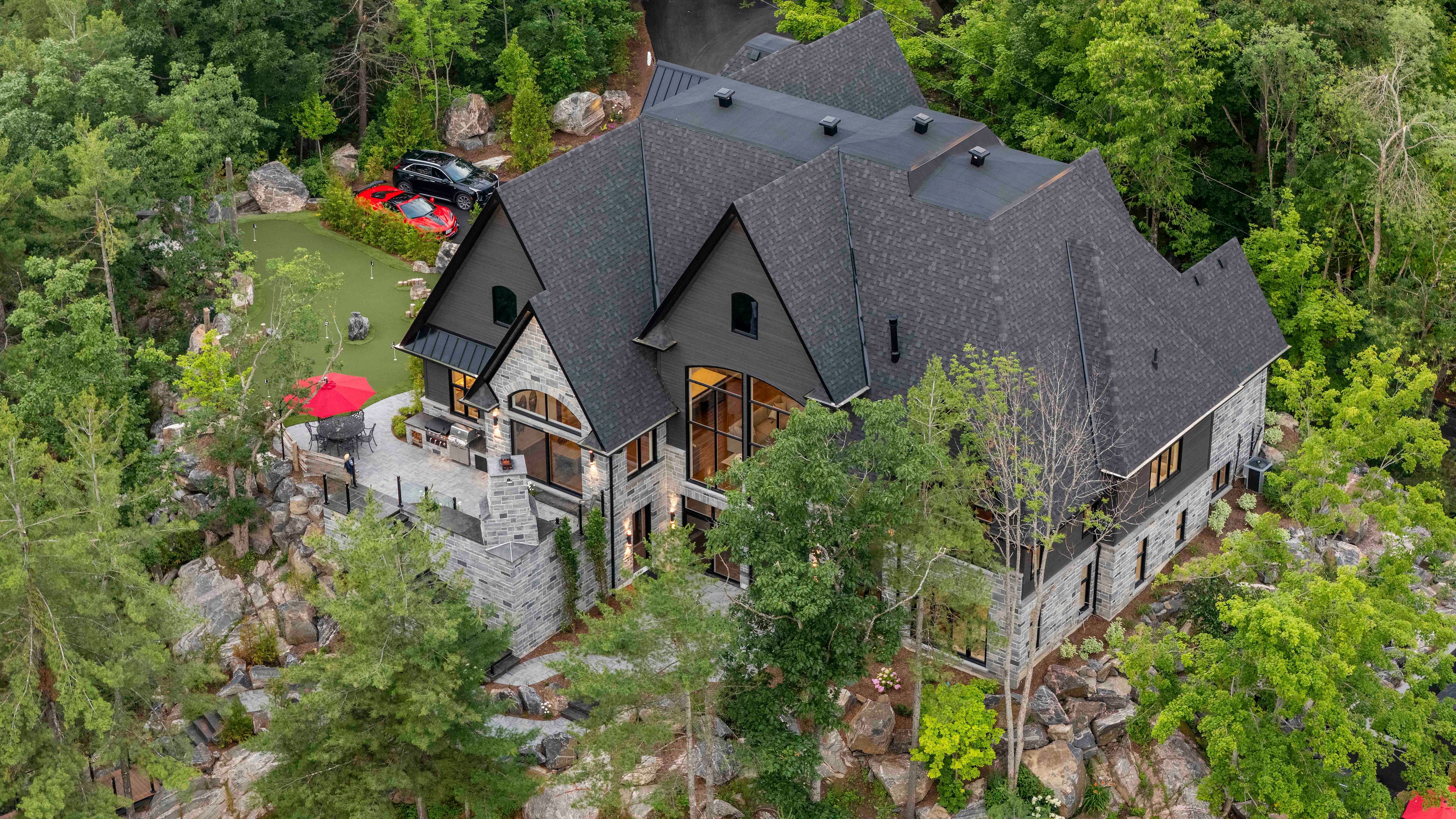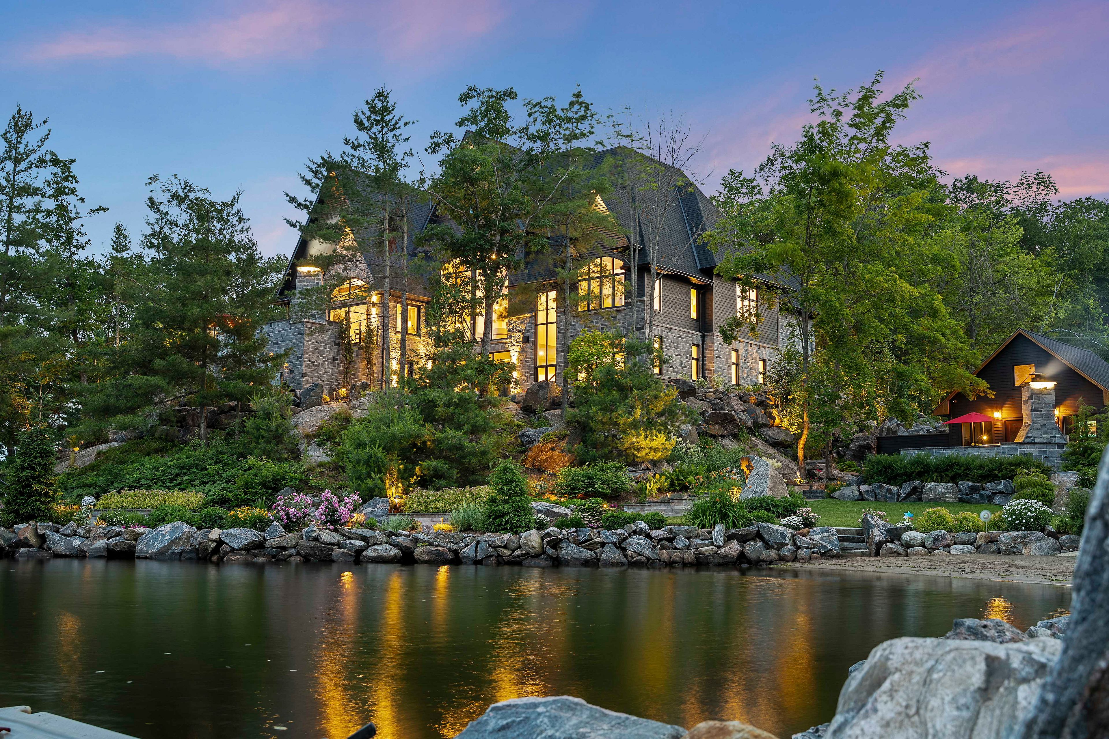 The Pinnacle of Muskoka Luxury: A Private Lakefront Estate! Discover the ultimate Muskoka lifestyle on 2.83 acres with 270 feet of pristine Lake Muskoka shoreline and an additional 420 feet of North-side waterfront. This exceptional compound features a magnificent main residence, four-slip boathouse, refined four-season bunkie and every high-end amenity imaginable, fully furnished with brand-new designer-selected pieces. The main-level great room impresses with soaring 18-foot vaulted ceilings, a dramatic stone accent wall with fireplace, and striking hardwood beam details. The chef's kitchen is a masterpiece, featuring an 11-foot island, premium appliances, walk-in pantry, hidden in-cabinet fridge, bar fridge, and ice maker. The upper level primary suite offers stunning lake views, soaring ceilings, a spa-inspired bathroom with in-floor heating, and a 200 sq ft walk-in closet. The lower level is designed for entertaining with 10-foot ceilings, full bar, wine cellar, gym, billiards room and walkout to the lake. The four-season bunkie, incl. 2 bedrooms + loft, provides an elevated guest retreat with stone patio, outdoor fireplace and 6 person hot tub. The boathouse anchors the waterfront experience with 4 boat slips, three hydraulic lifts, and two Sea-Doo lifts. Its rooftop deck is an entertainer's paradise with a bar, pizza oven and TV on an elevator lift, perfect for gatherings and sunsets. Additional highlights include a professional six-hole putting green, heated three-car garage, flagstone steps to the water, paved parking for up to 20 vehicles, a motorcoach pad with hookups, outdoor fireplaces and meticulously landscaped grounds with irrigation and over 100 exterior lights. This rare and magnificent estate represents the essence of Muskoka luxury: a private sanctuary, a premier entertaining destination and an incomparable retreat just a short drive from the city, where every detail has been thoughtfully designed for elegance, comfort and year-round enjoyment.